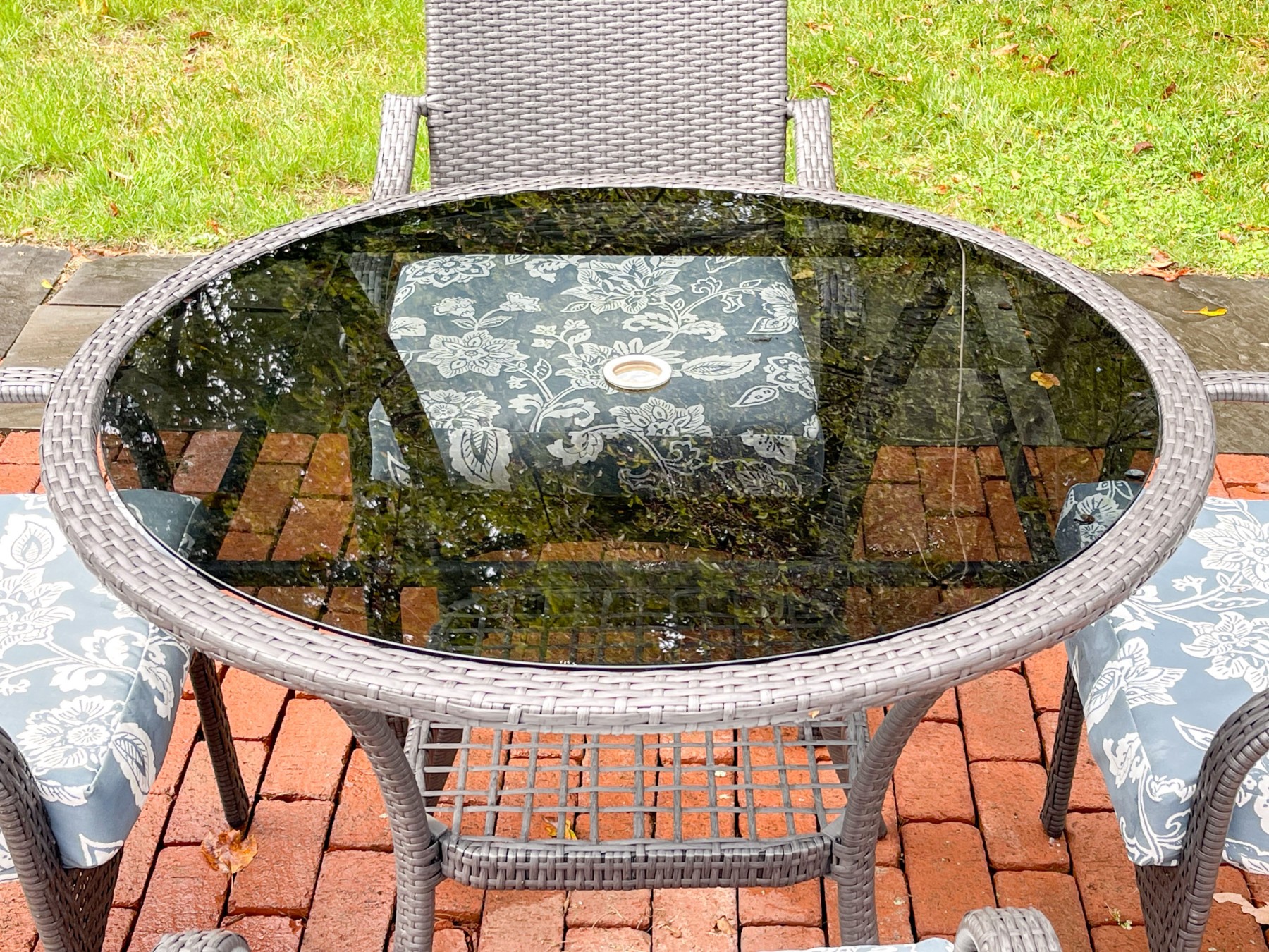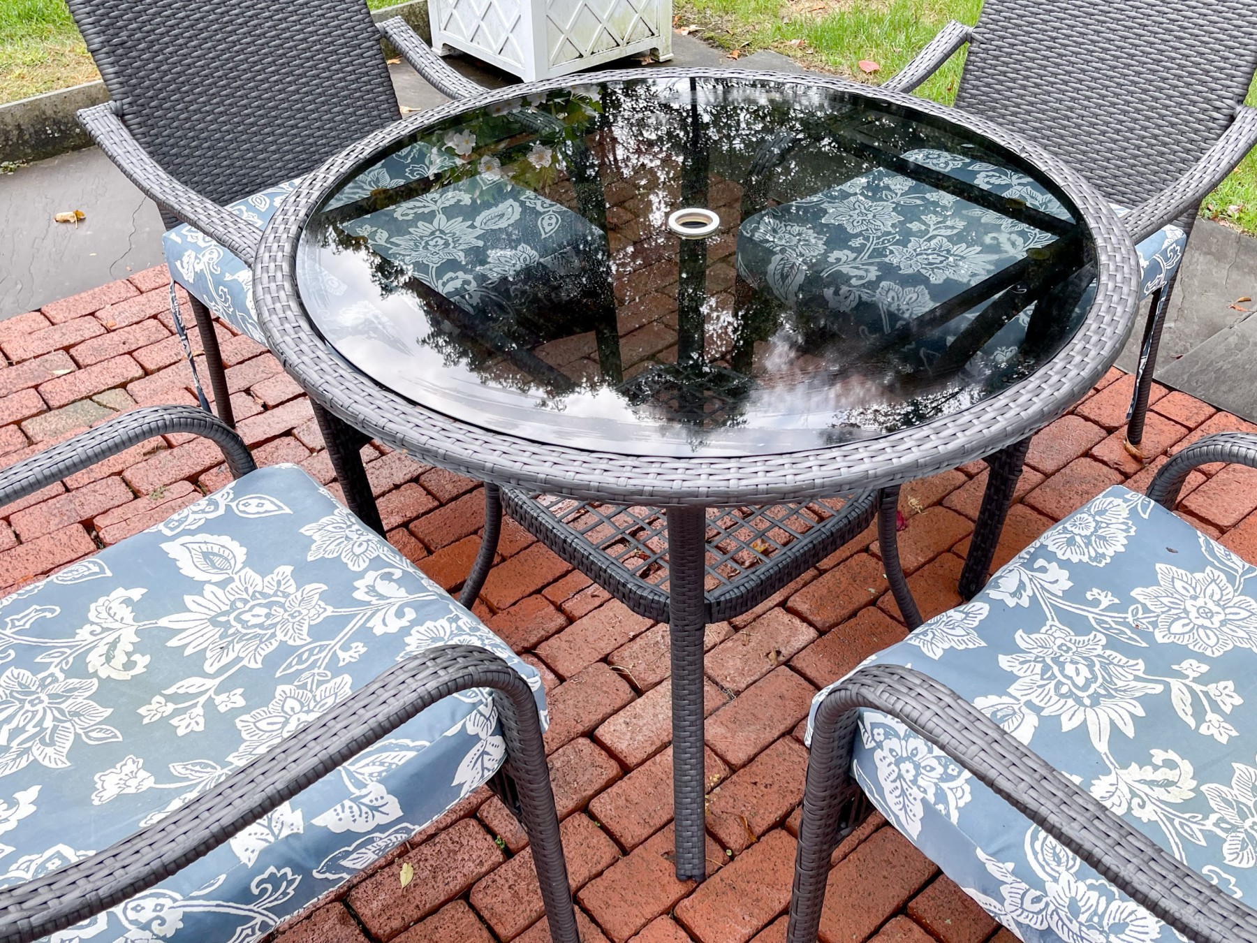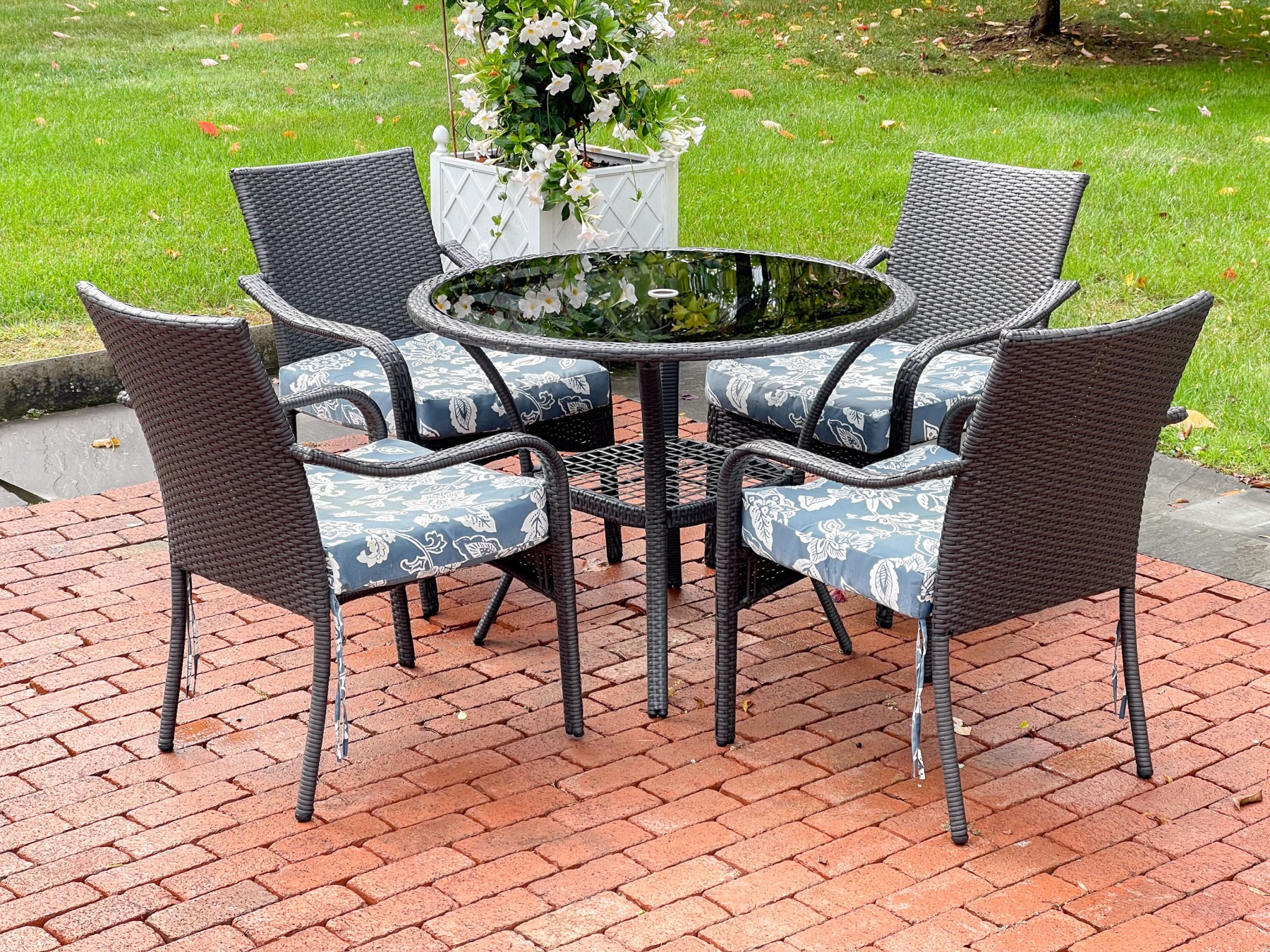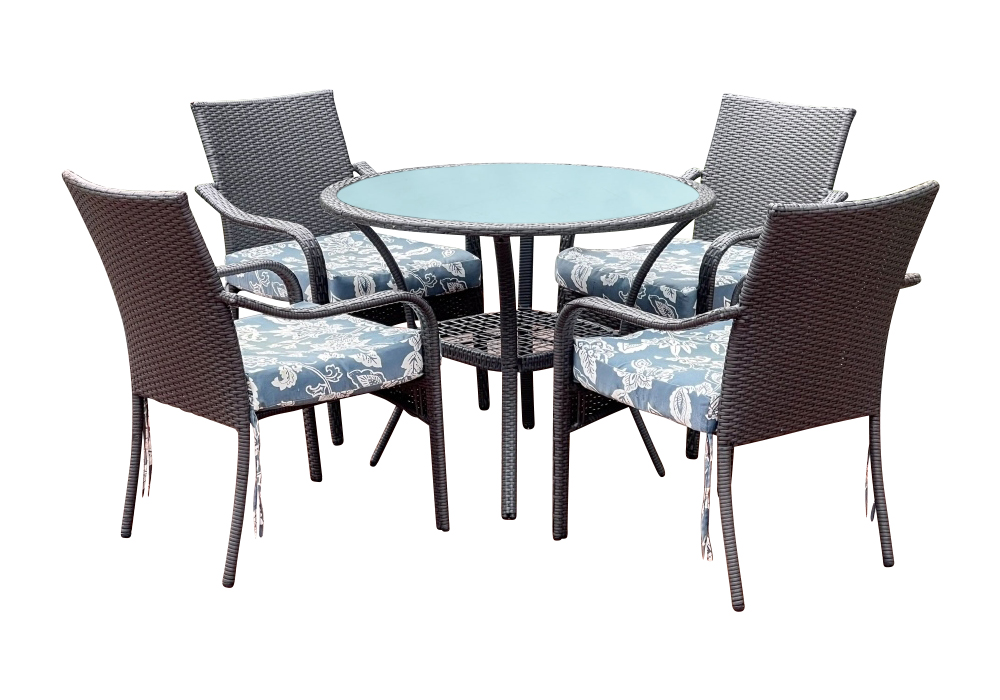 Metal and resin wicker 5 piece outdoor dining set comprised of a table and four arm-chairs. The round table with inset smokey glass having an umbrella hole, mesh lower tier with conforming hole and resting on saber resin covered legs. The table is accompanied by four armchairs having a good form with gently splayed back. The chairs with blue patterned seat cushions.