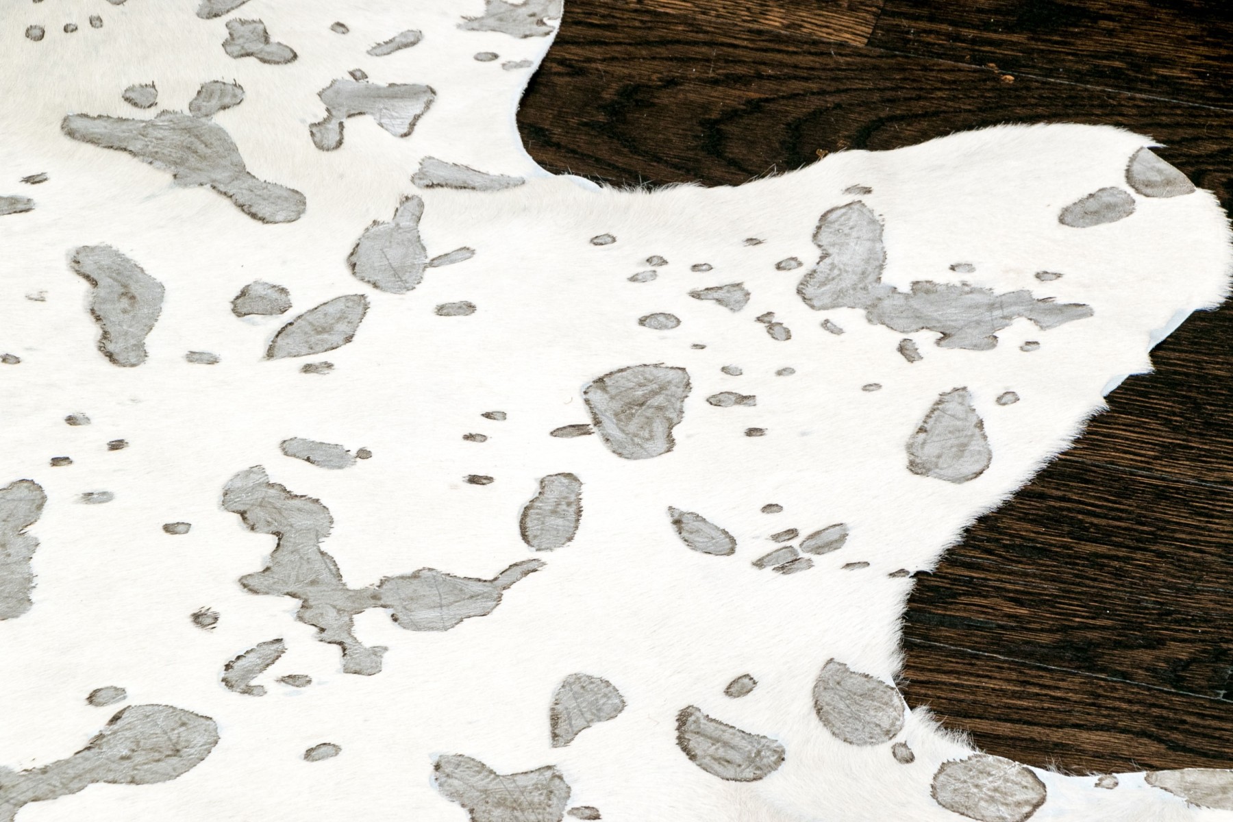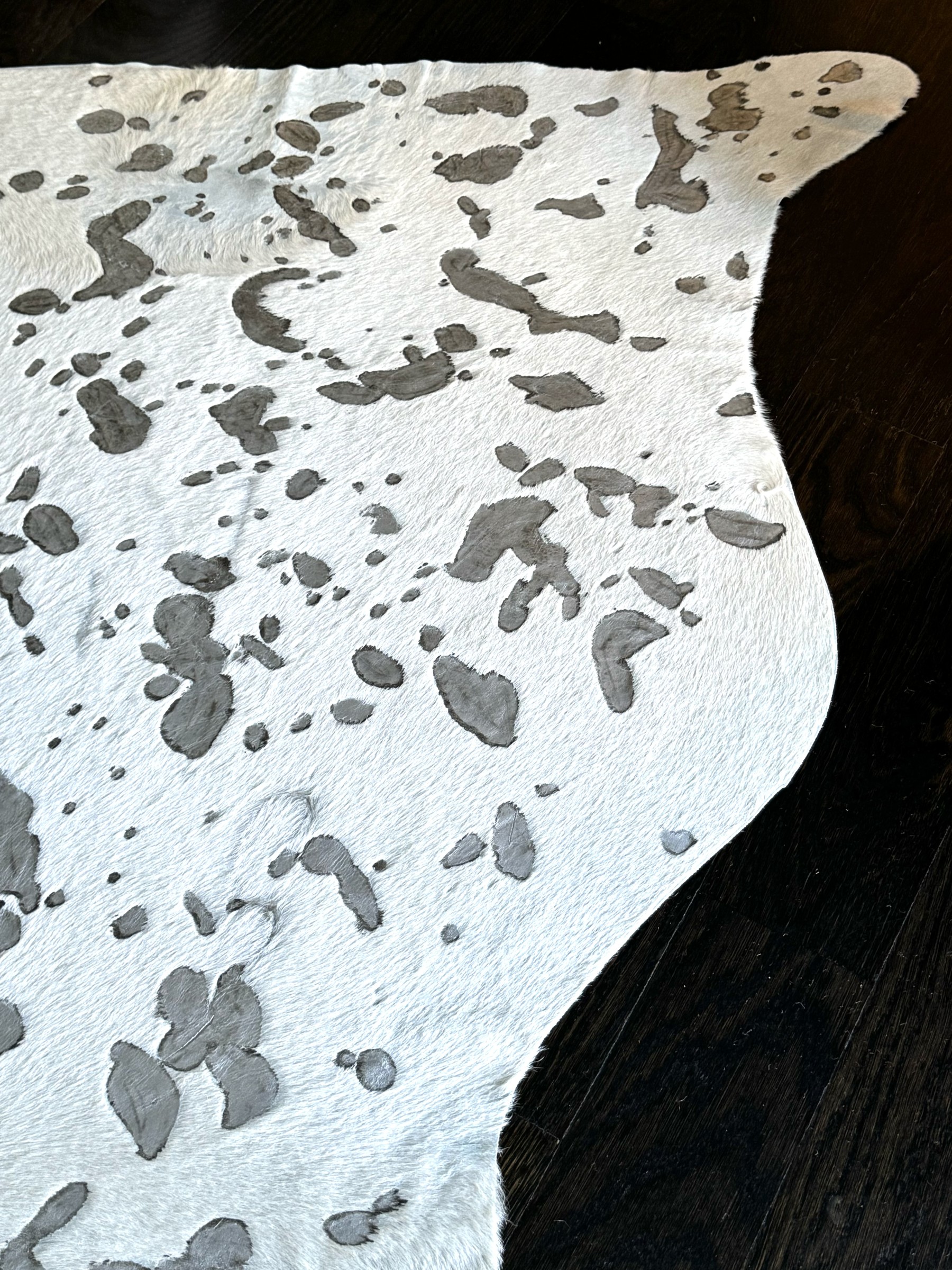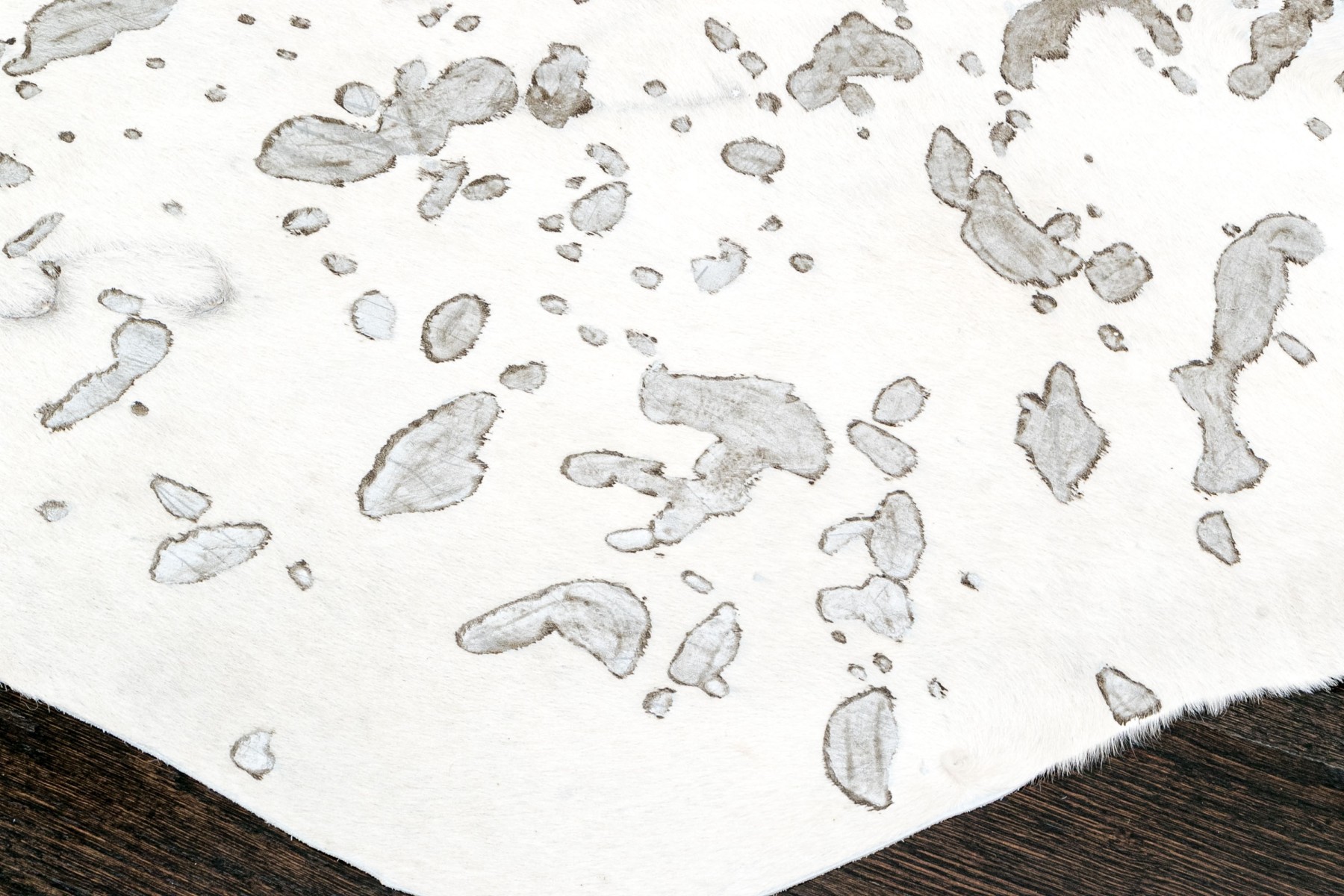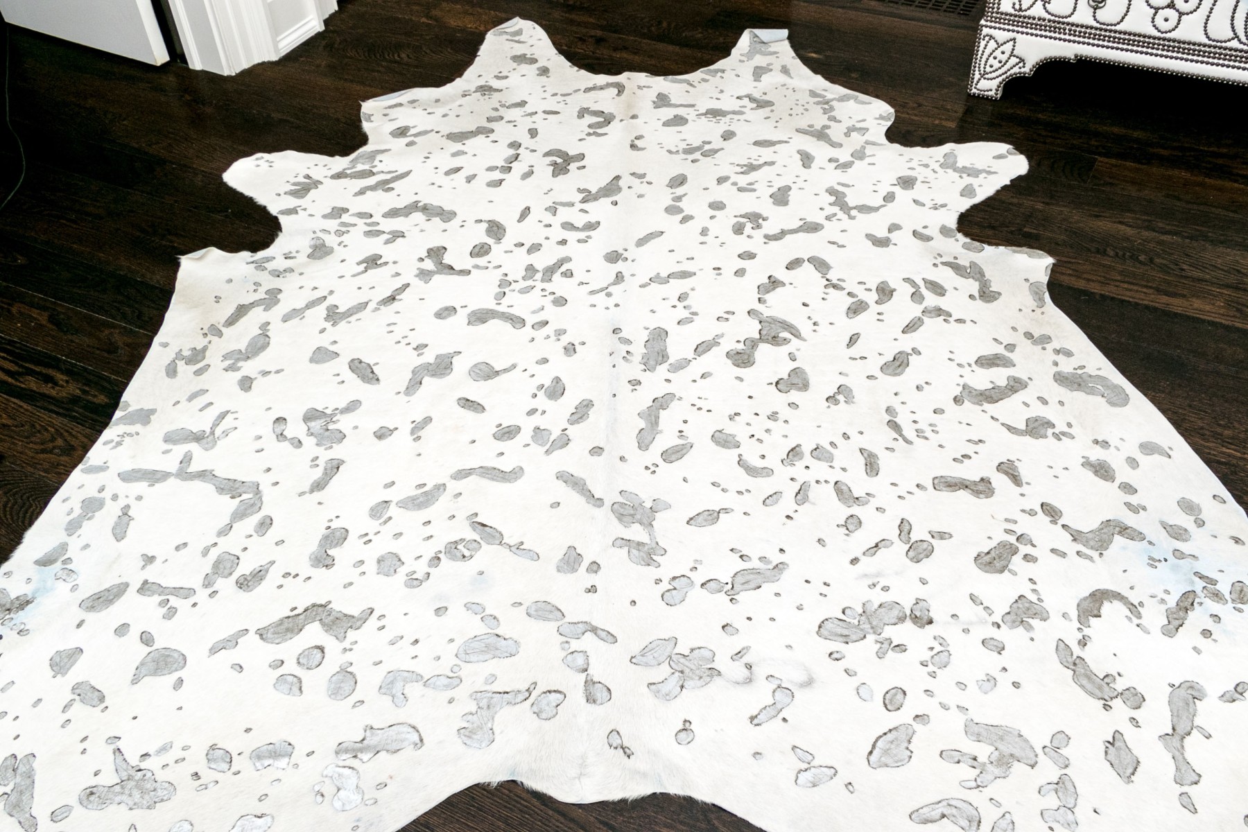 A fashionable hyde carpet with recessed, mottled spots of metallic speckling against a sleek white field, creating a chic, modern twist on the traditional cowhide form perfect for a variety of interiors.