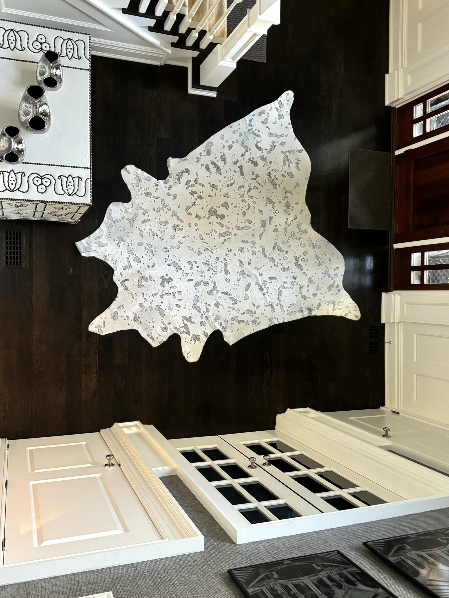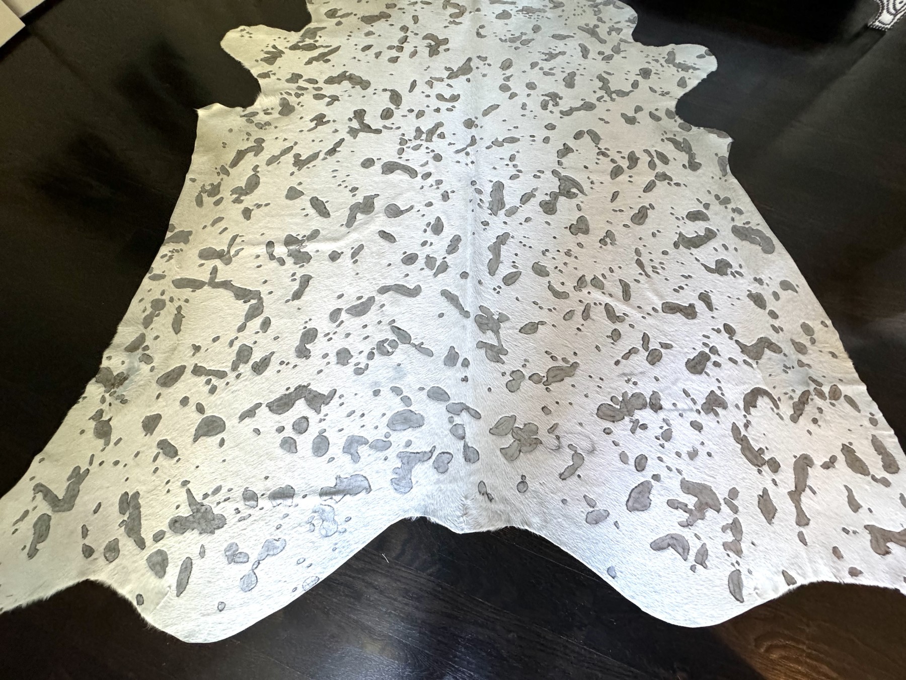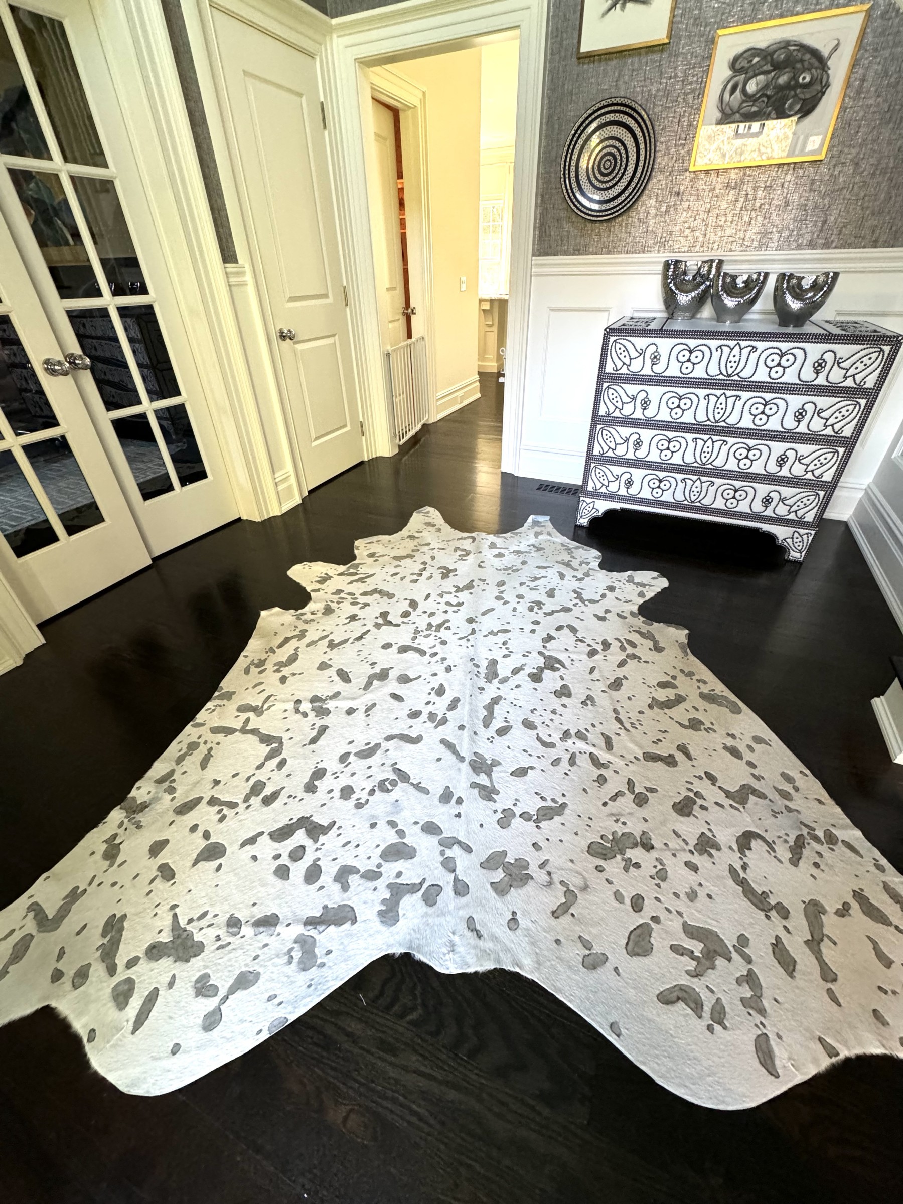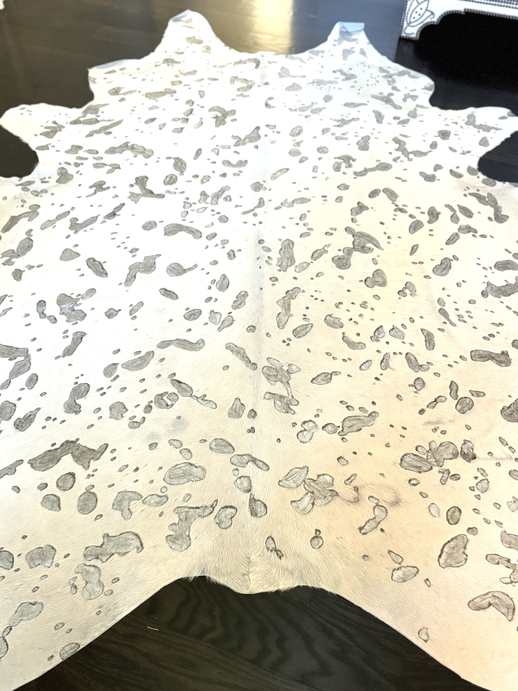 A fashionable hyde carpet with recessed, mottled spots of metallic speckling against a sleek white field, creating a chic, modern twist on the traditional cowhide form perfect for a variety of interiors.