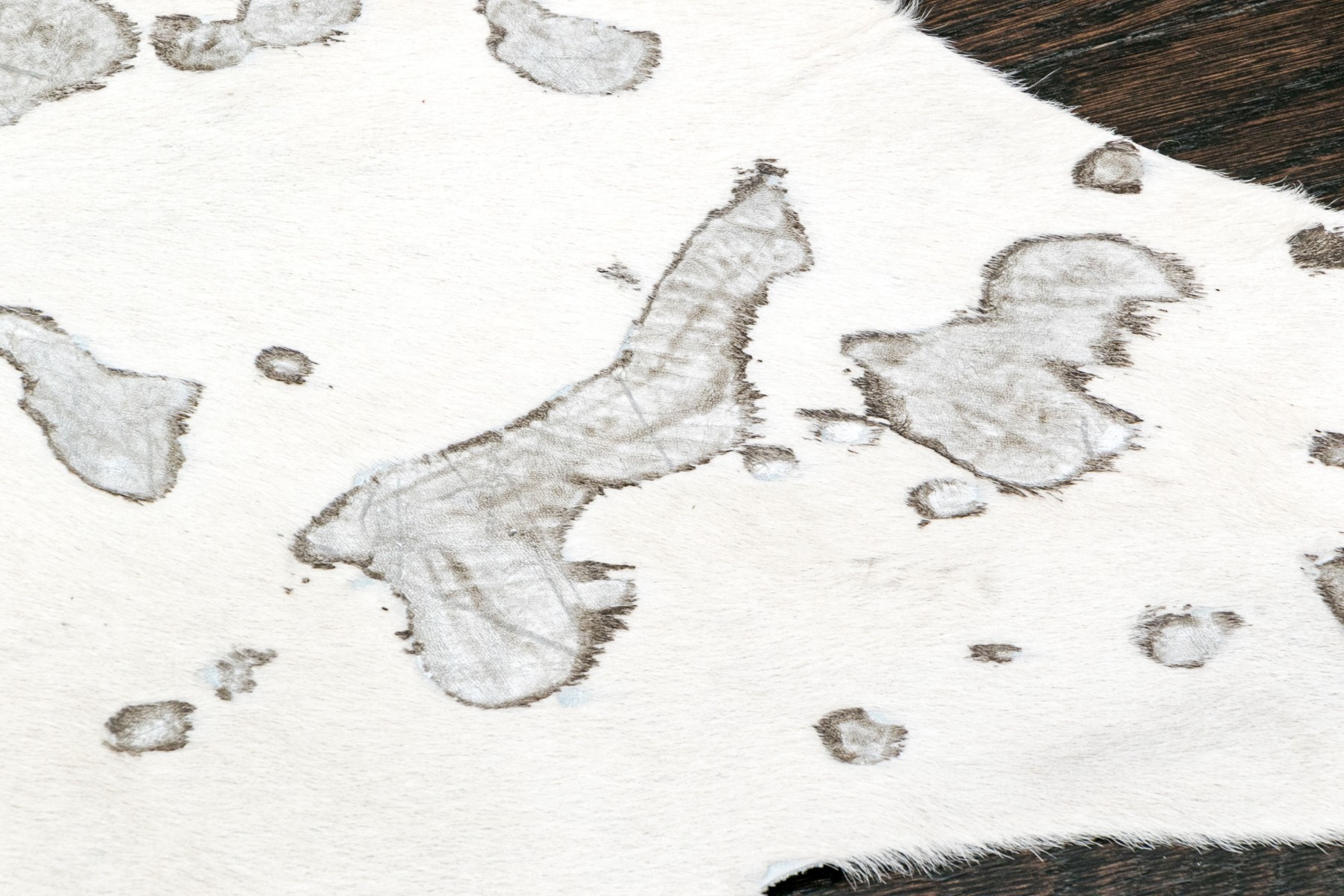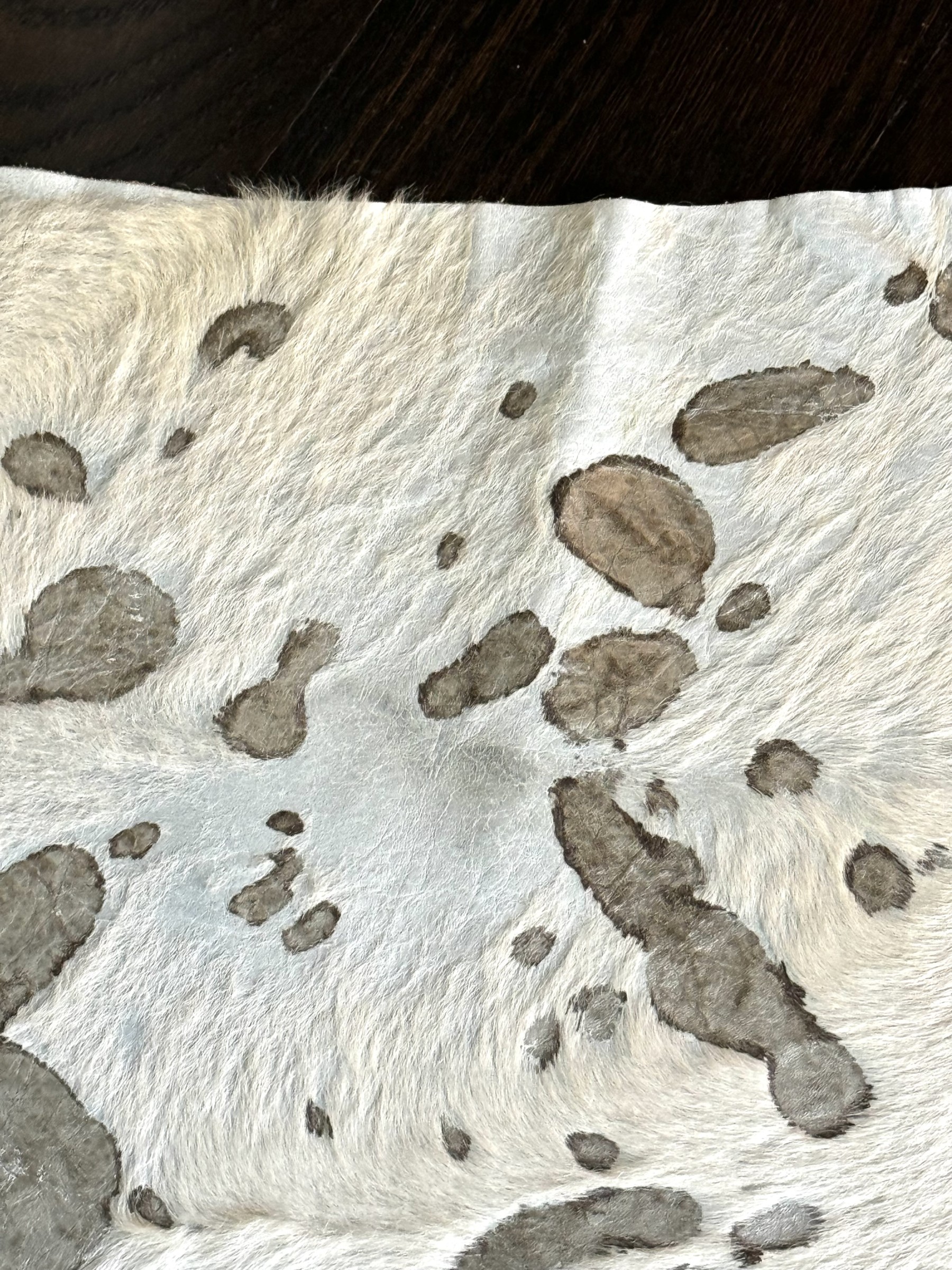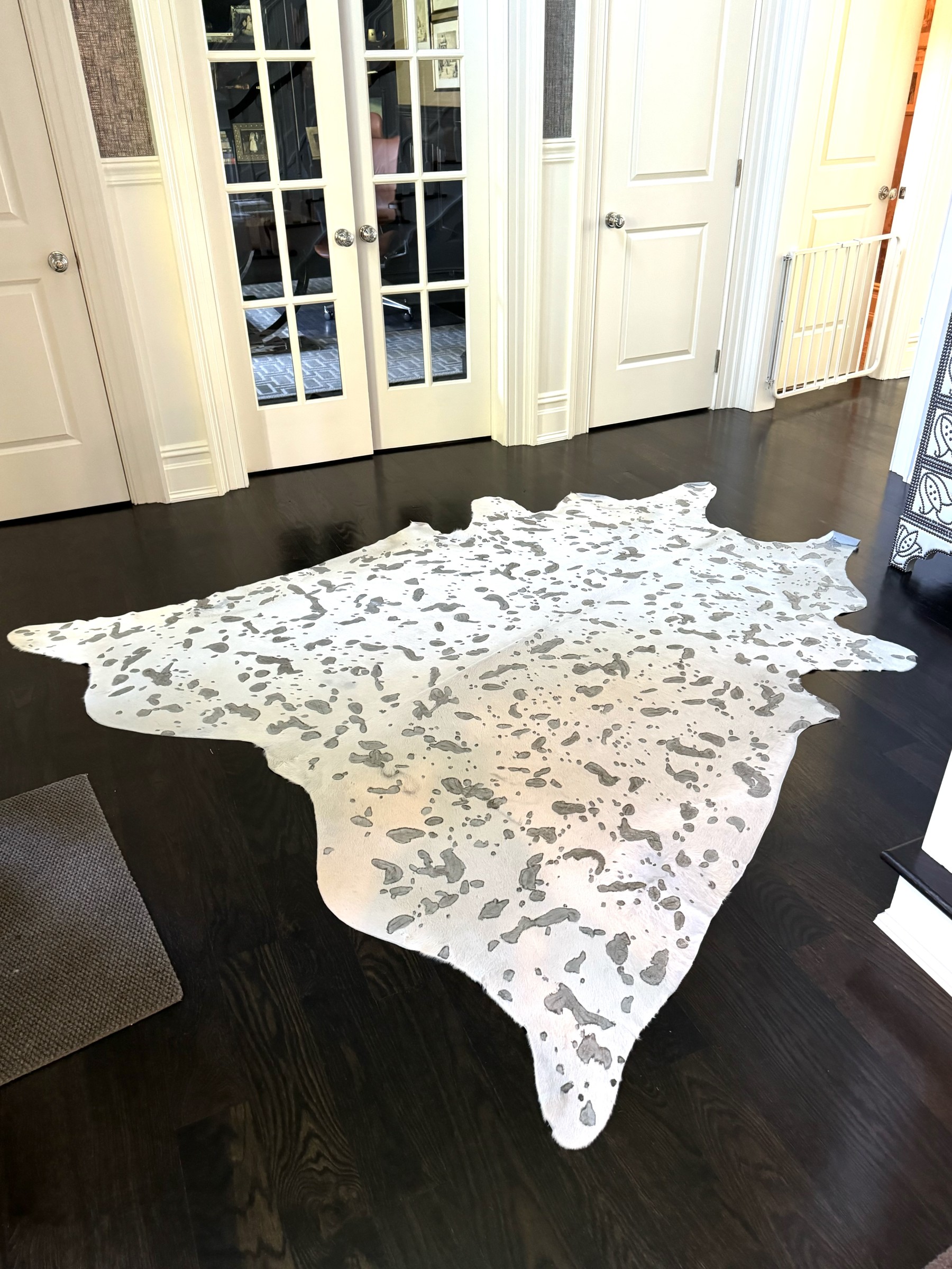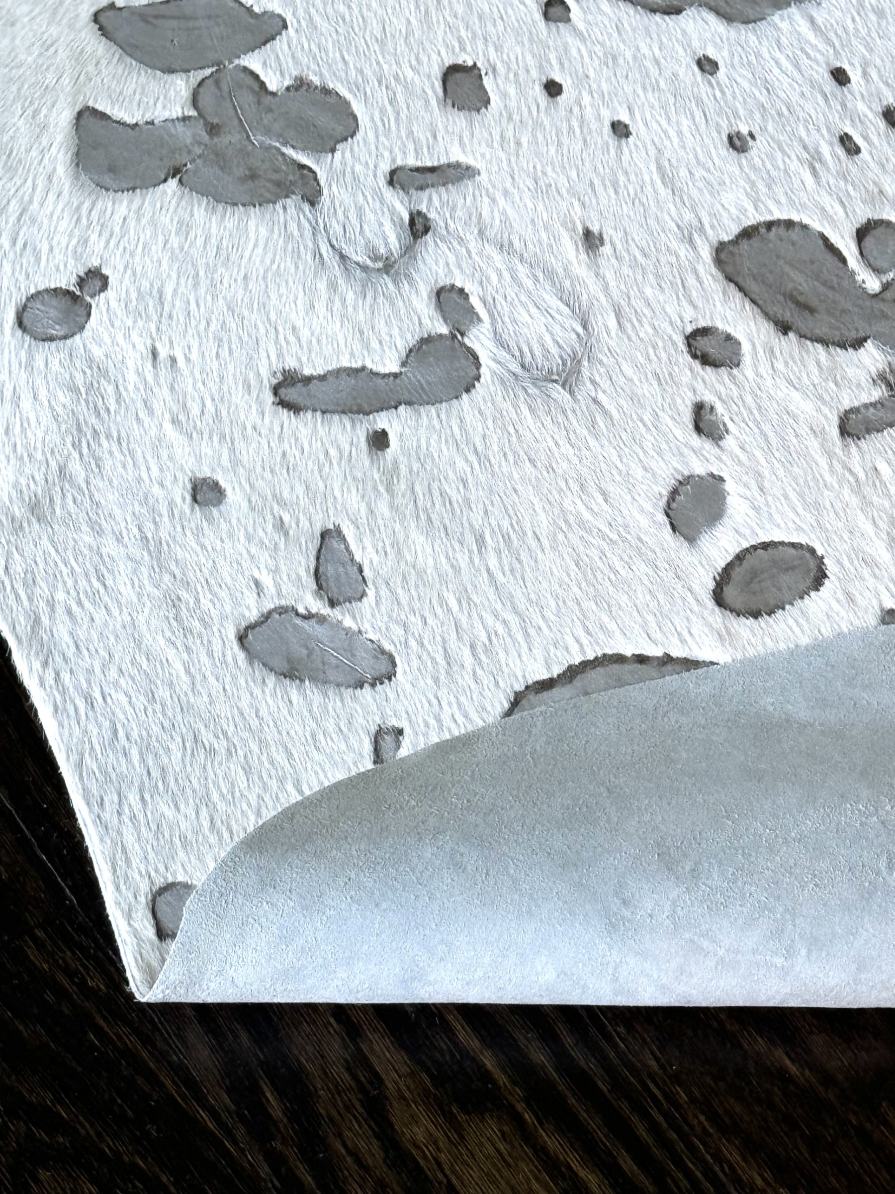 A fashionable hyde carpet with recessed, mottled spots of metallic speckling against a sleek white field, creating a chic, modern twist on the traditional cowhide form perfect for a variety of interiors.