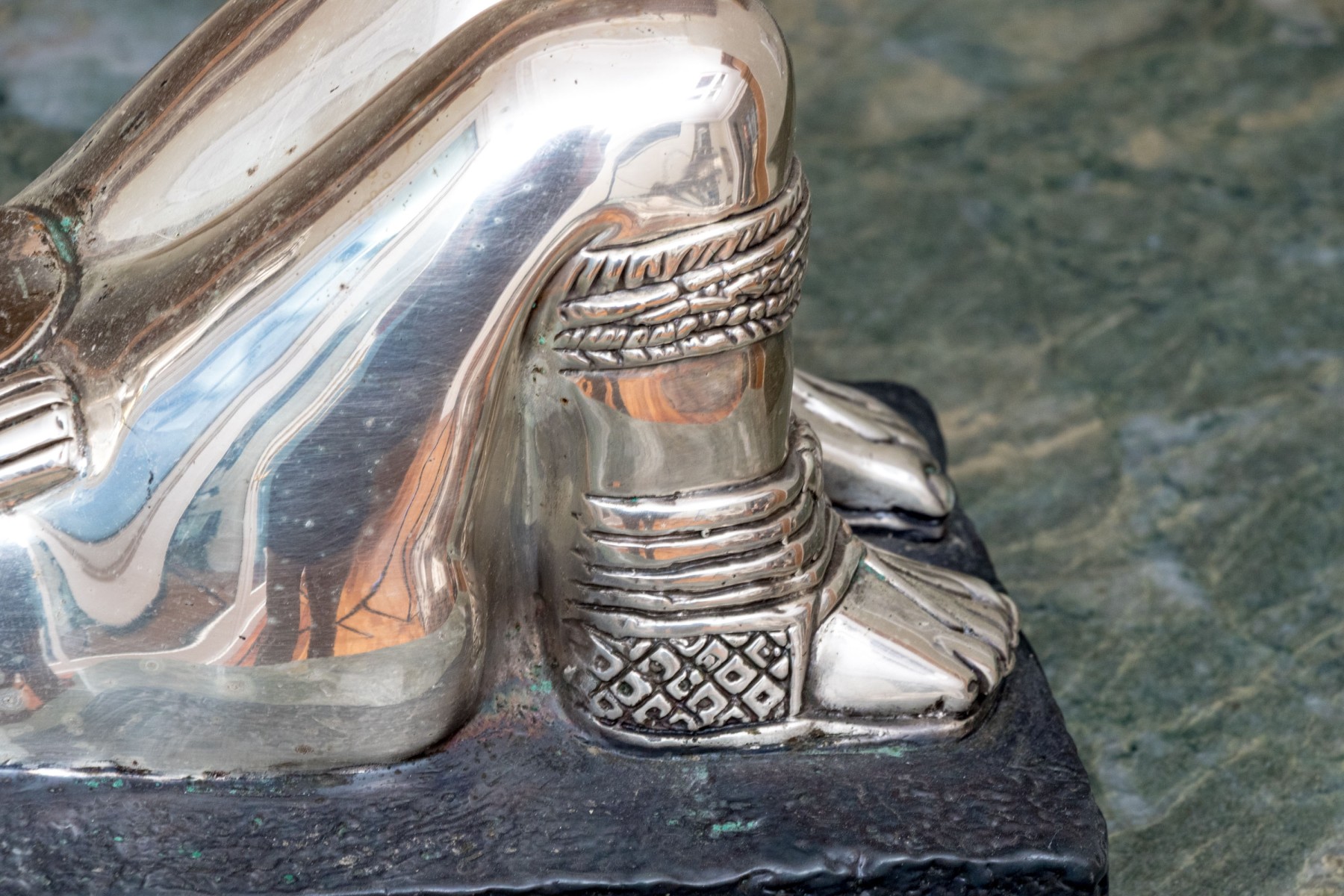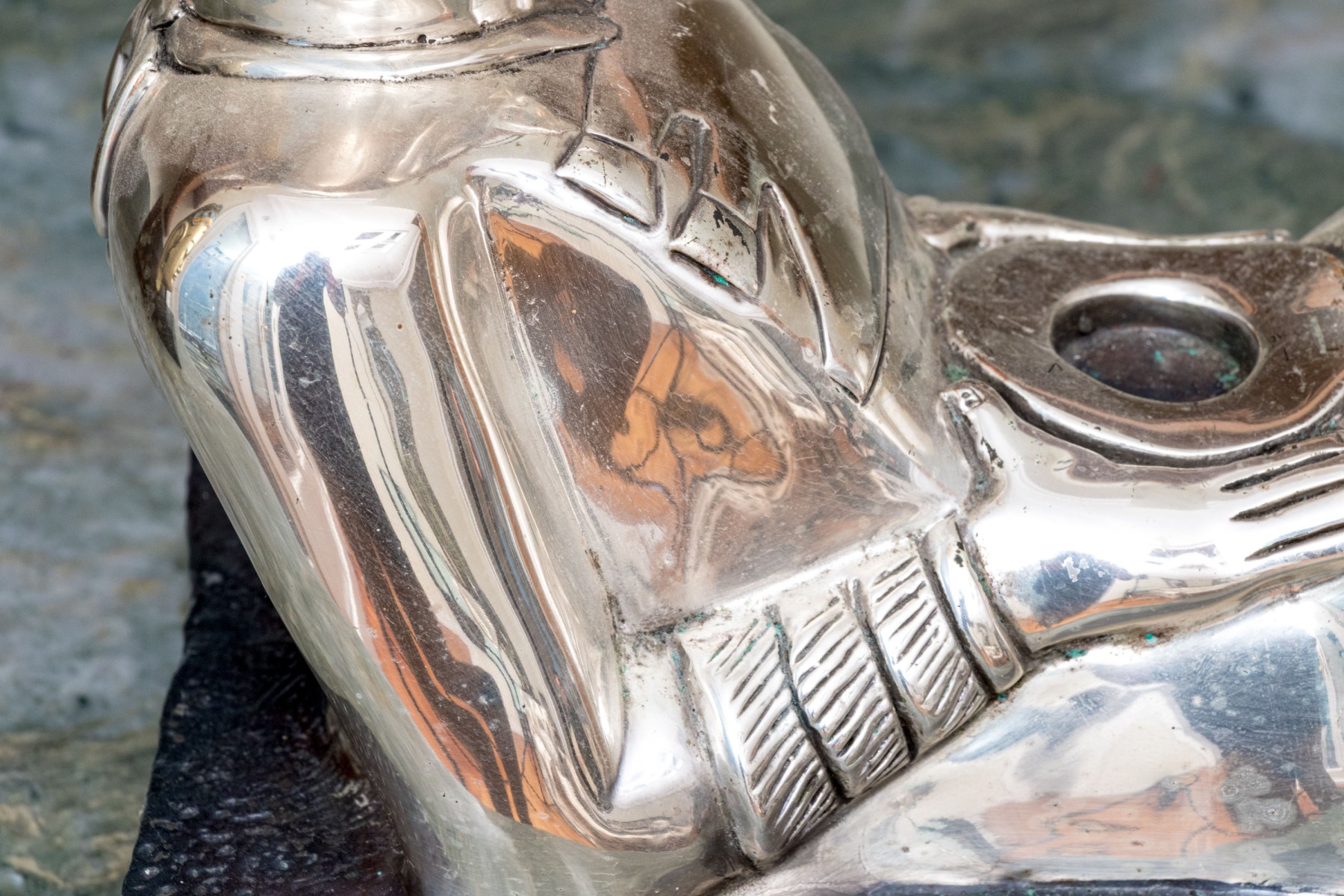 An eye-catching D'Argenta silverplated candlestick of a Mayan figure posed recumbent with a textural headdress, bracelets, and shoes, holding a bowl-shaped capital over a black stone-textured base.