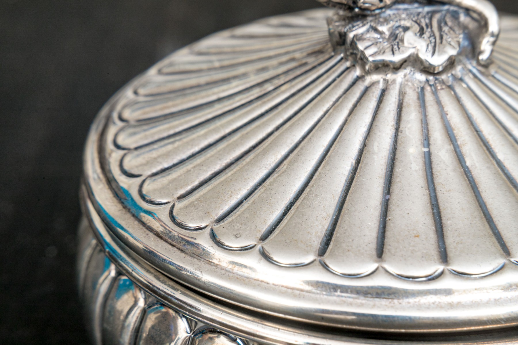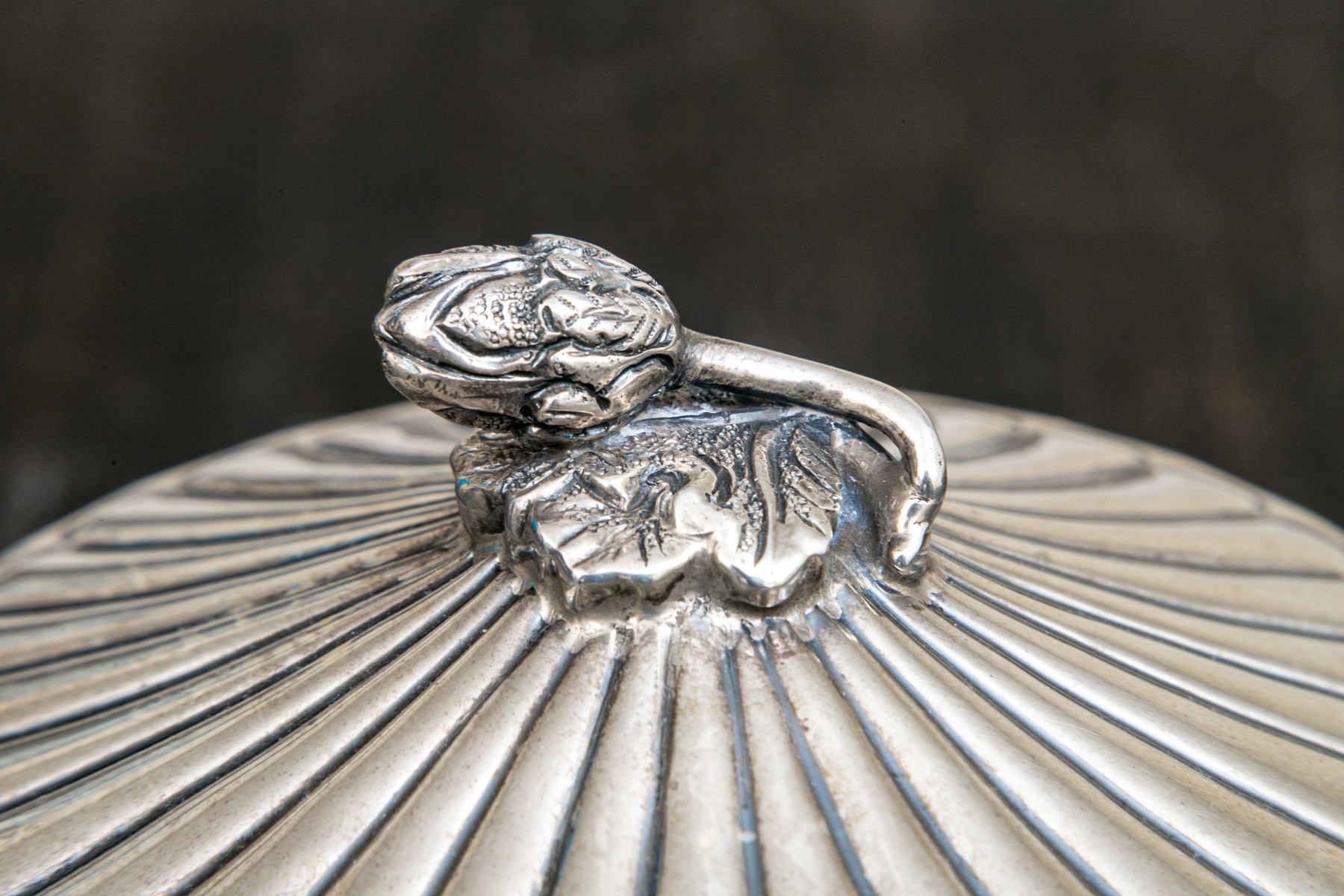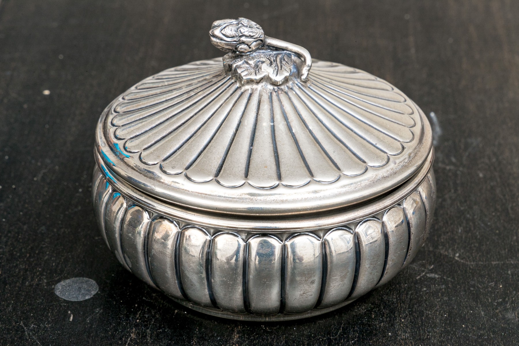 Mexican sterling silver marked lidded box. The box is raised on a circular foot with wonderful gadroon motif to the box and its lid.