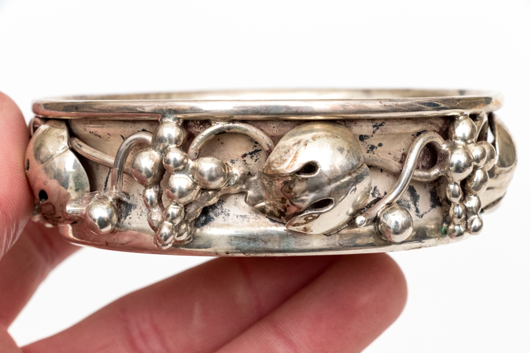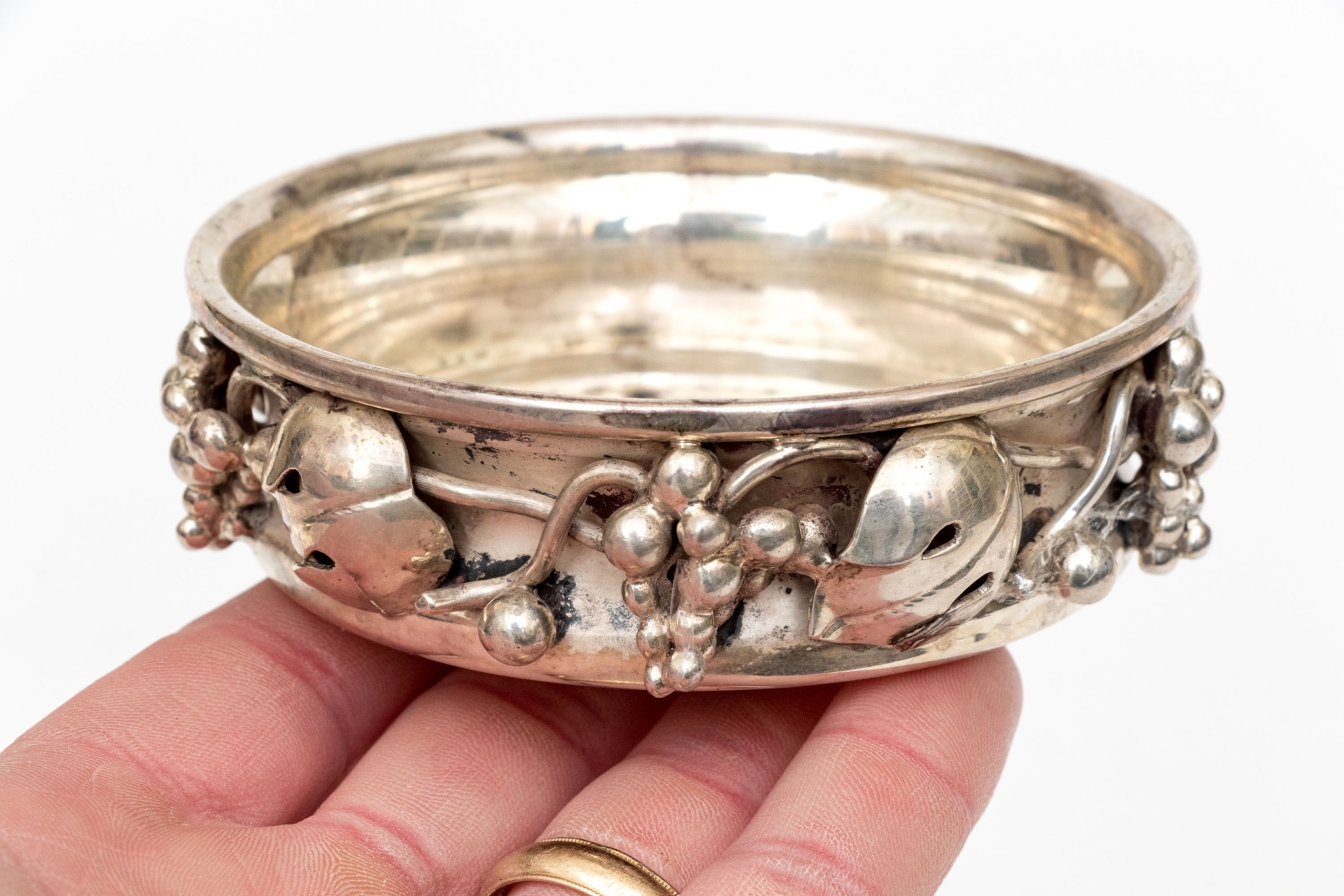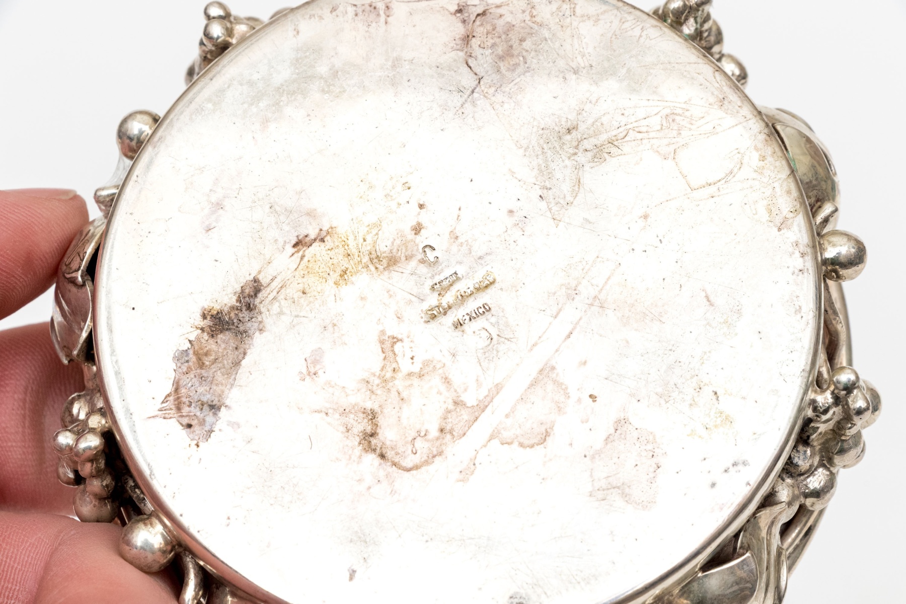 A fabulous Mexican sterling silver coaster lavishly designed with applied grape, leaf, and vine motifs around the exterior of a bun form bowl. Marked underfoot.