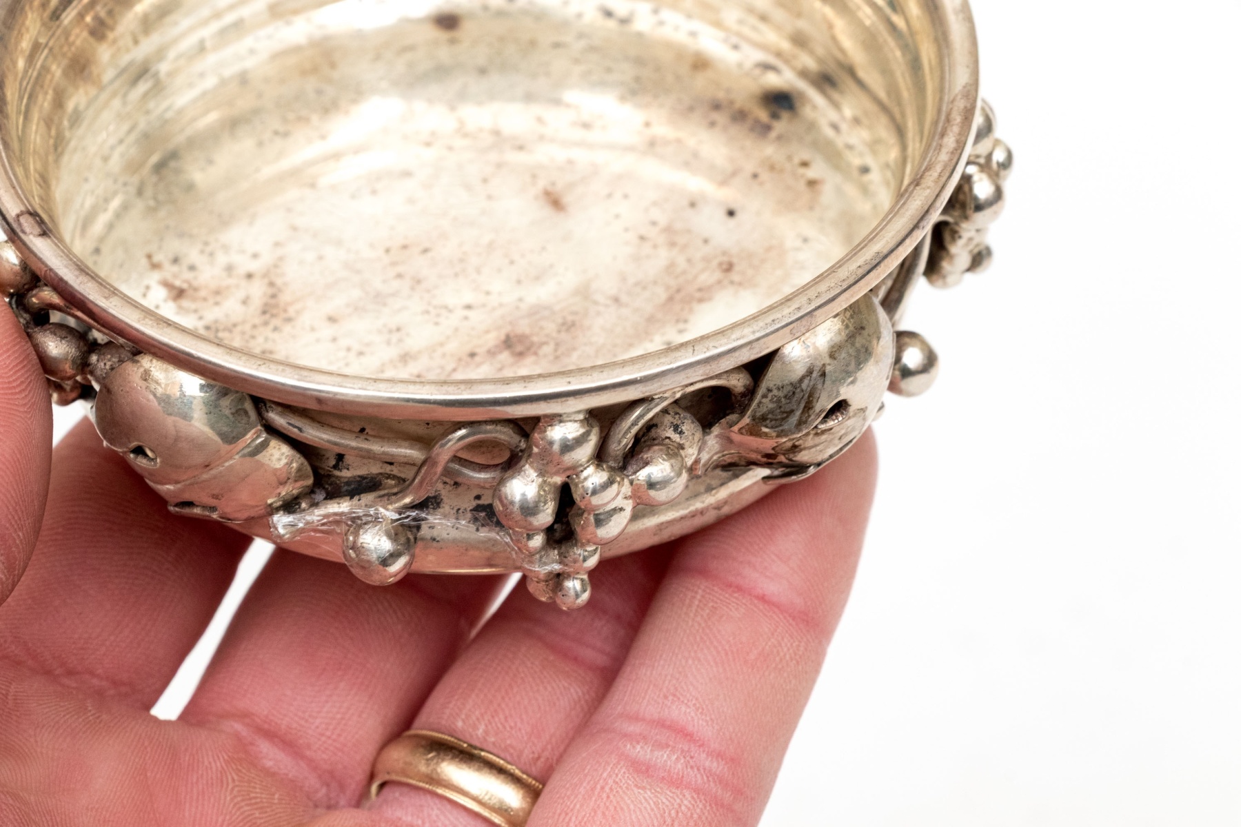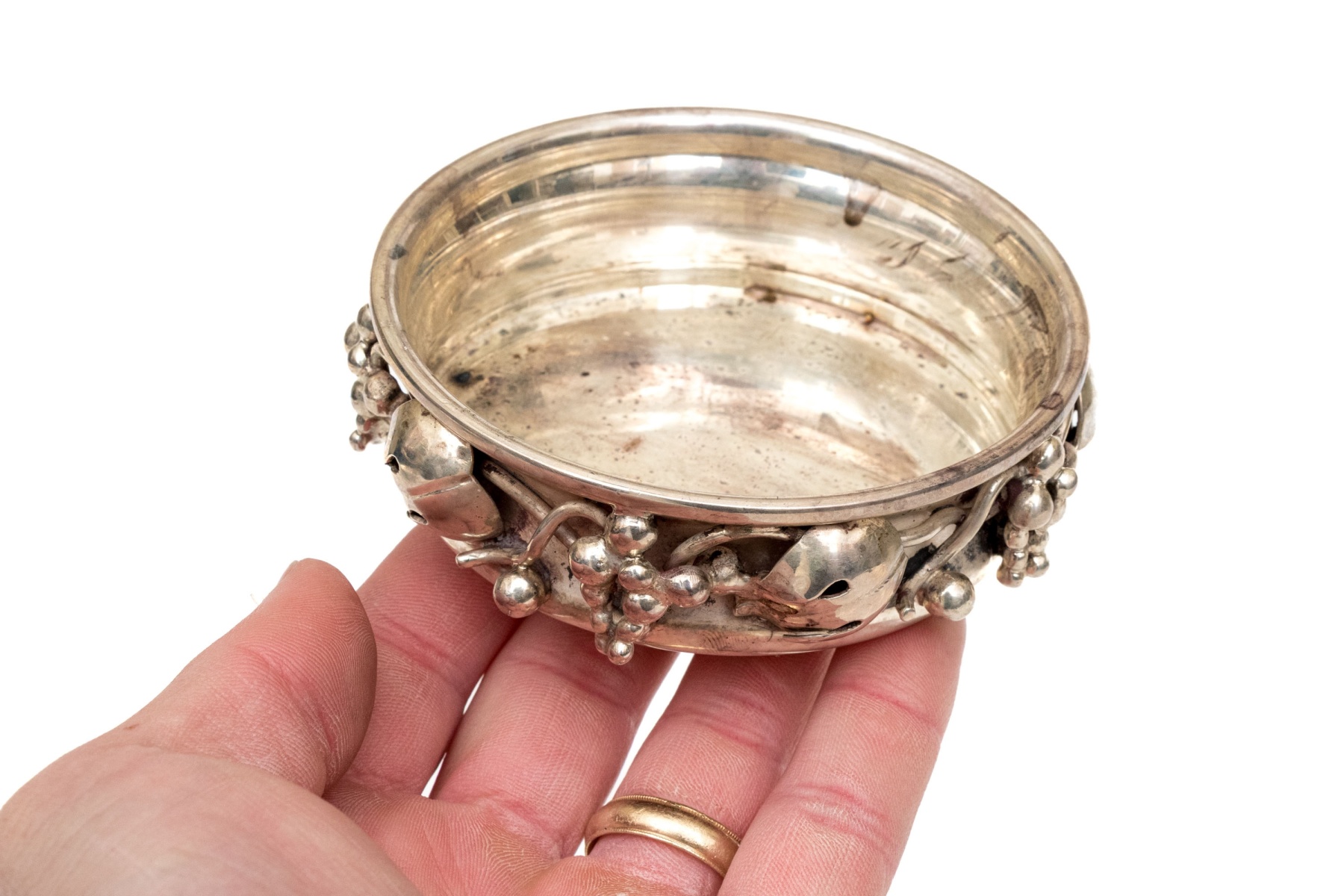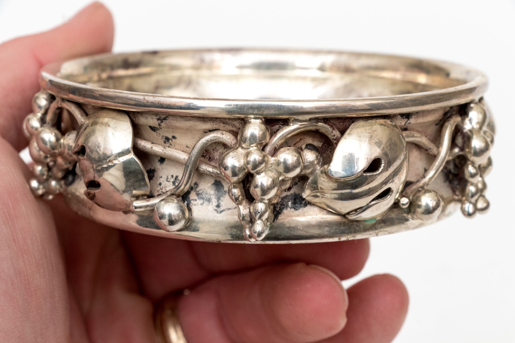 A fabulous Mexican sterling silver coaster lavishly designed with applied grape, leaf, and vine motifs around the exterior of a bun form bowl. Marked underfoot.