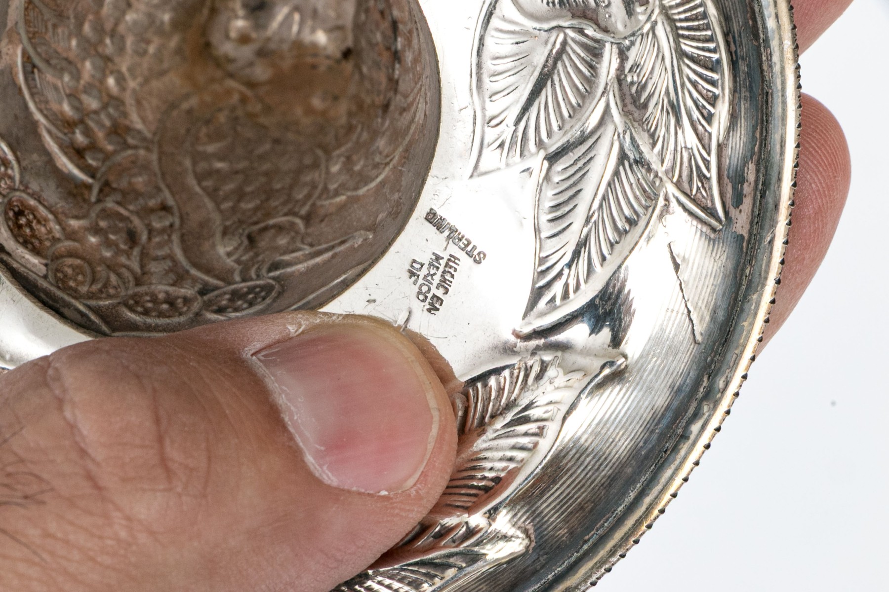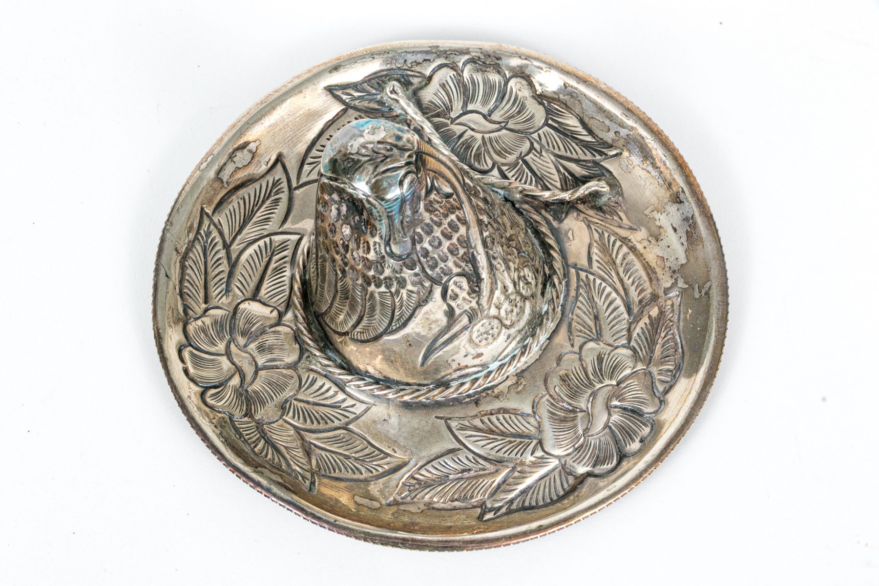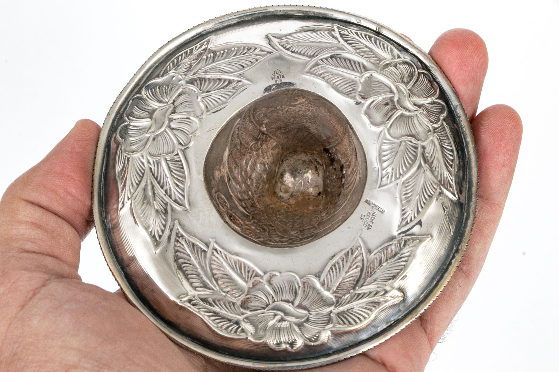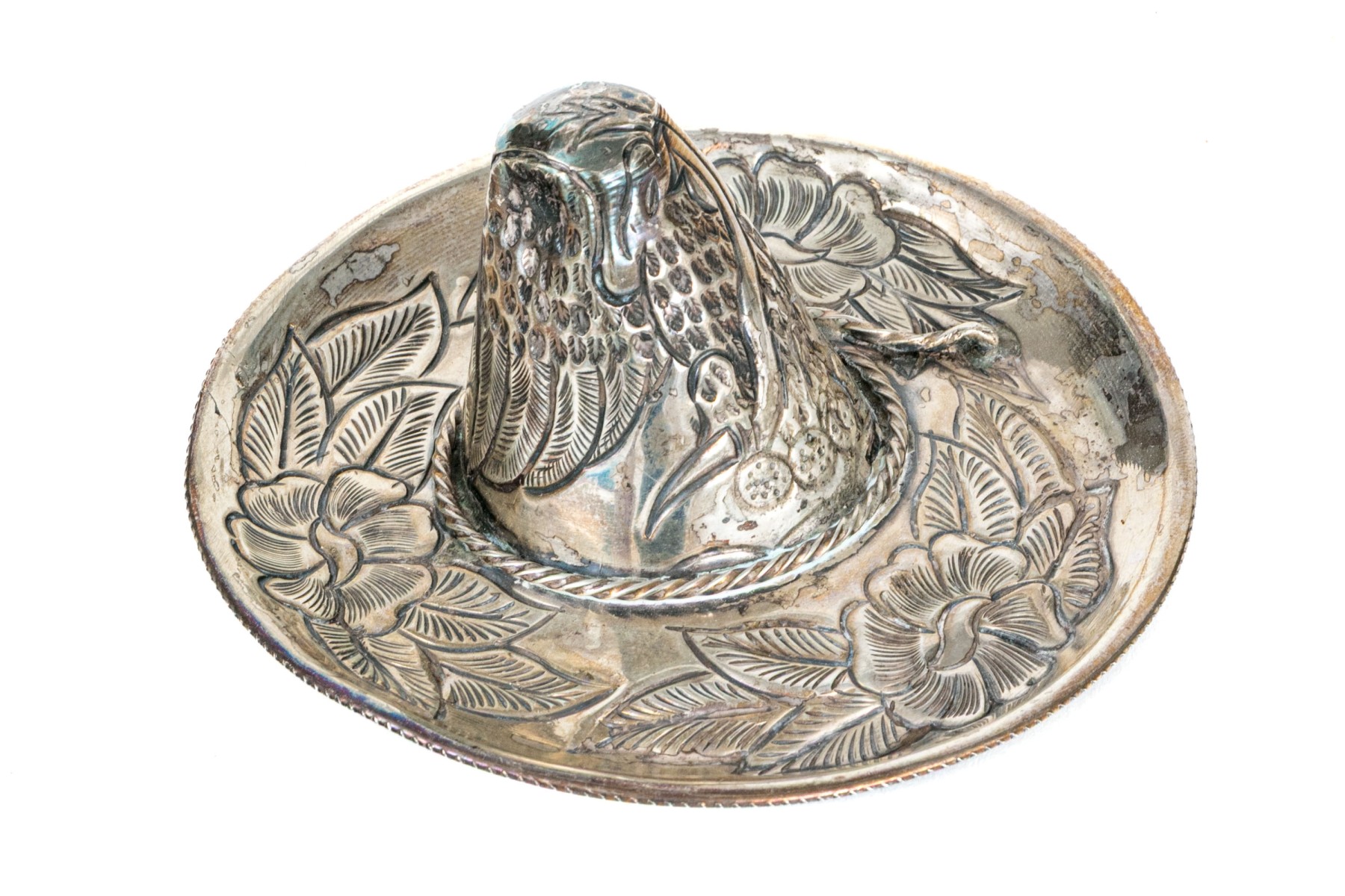 A charming Mexican sterling figure of a diminutive sombrero, perfect for use as an ashtray, catchall, or decorative piece. The sombrero is designed with an asymmetrical tapered crown and a wide brim that gently curls up at the end, detailed throughout with elegant repousse including a an eagle and snake on the crown and large foliate flourishes on the rim. Marked underneath.