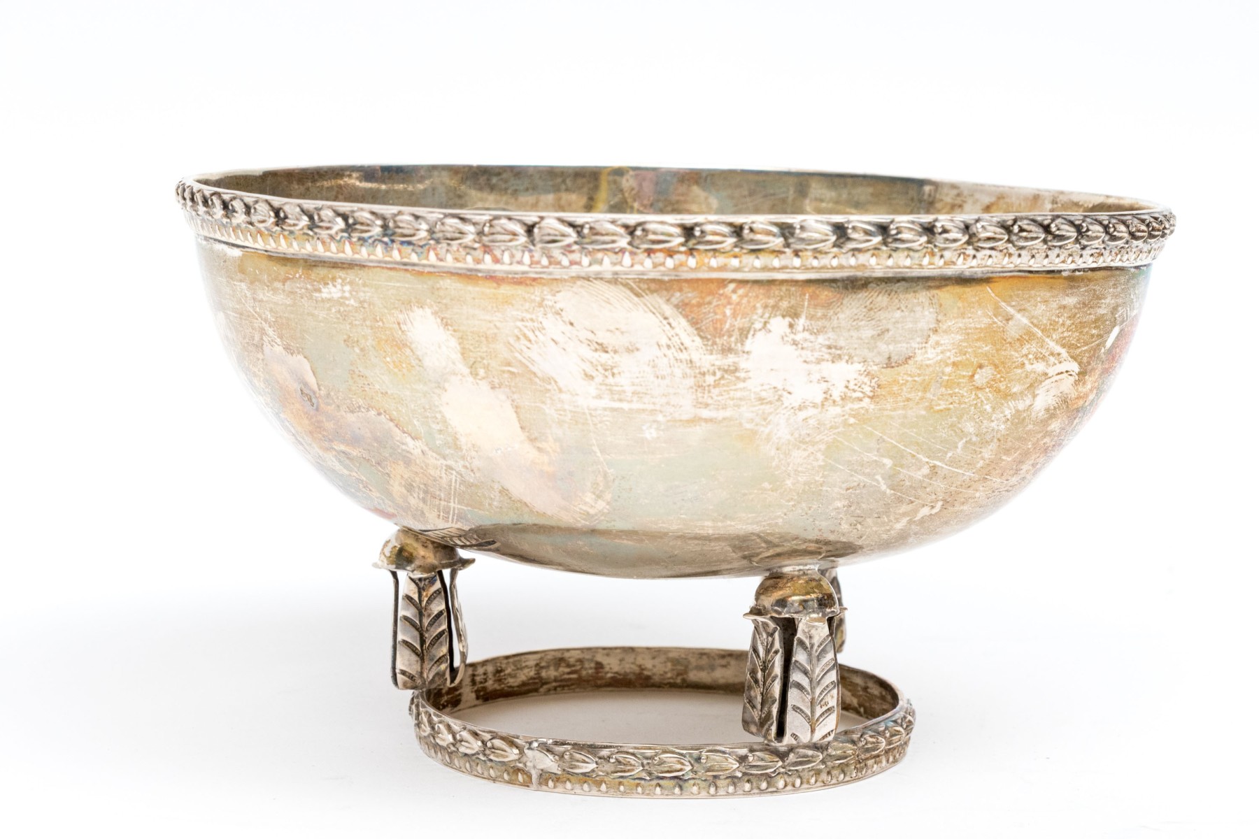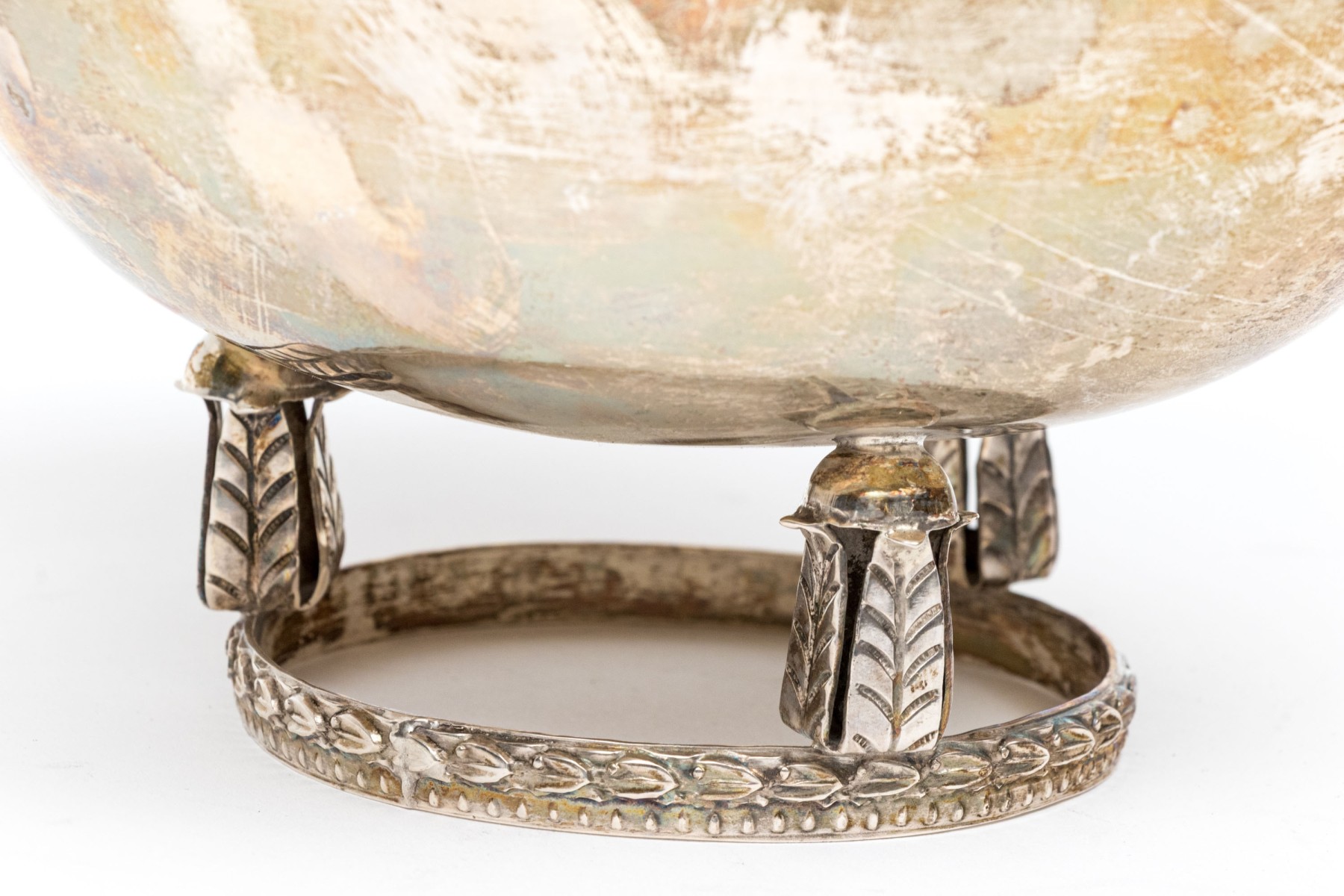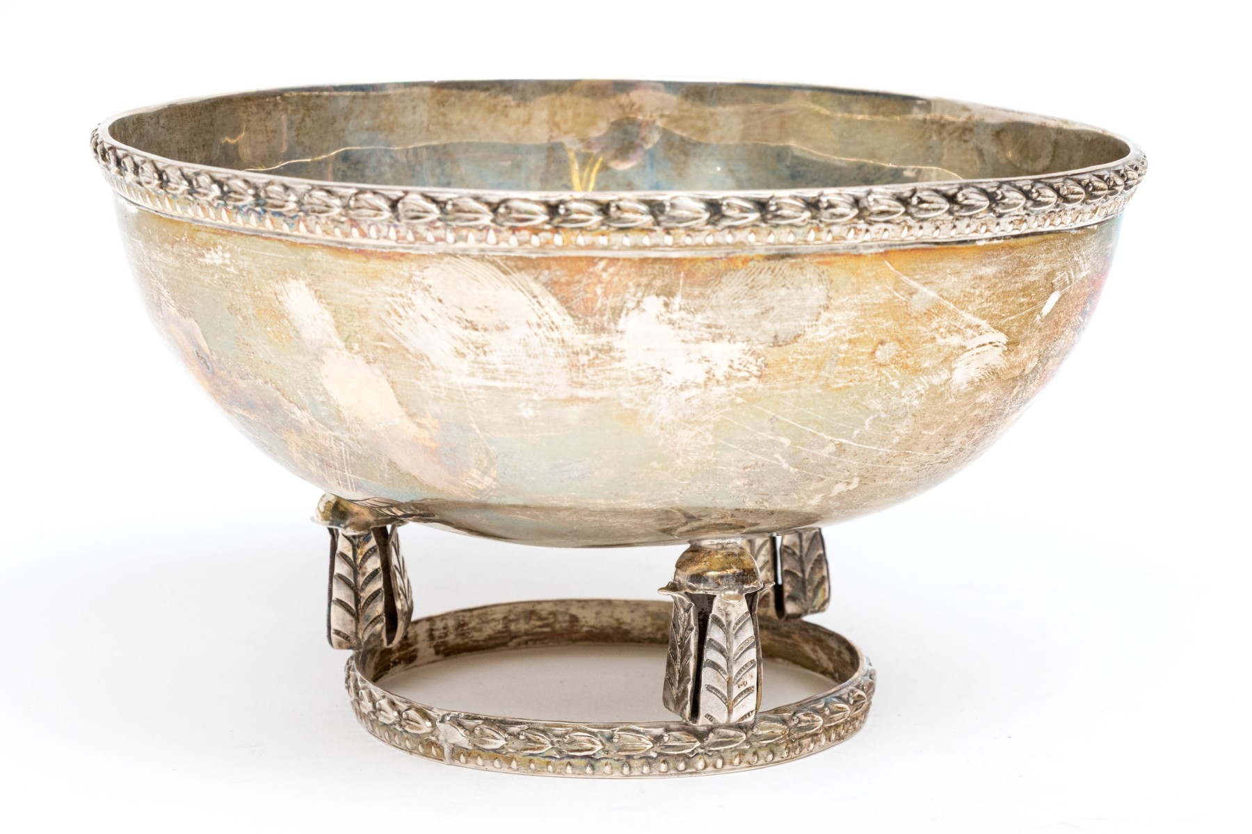 Marked Hecho en Mexico and Sterling underfoot. The bowl stands on a highly decorative foot with circular base and three short pedestals supporting the bowl.