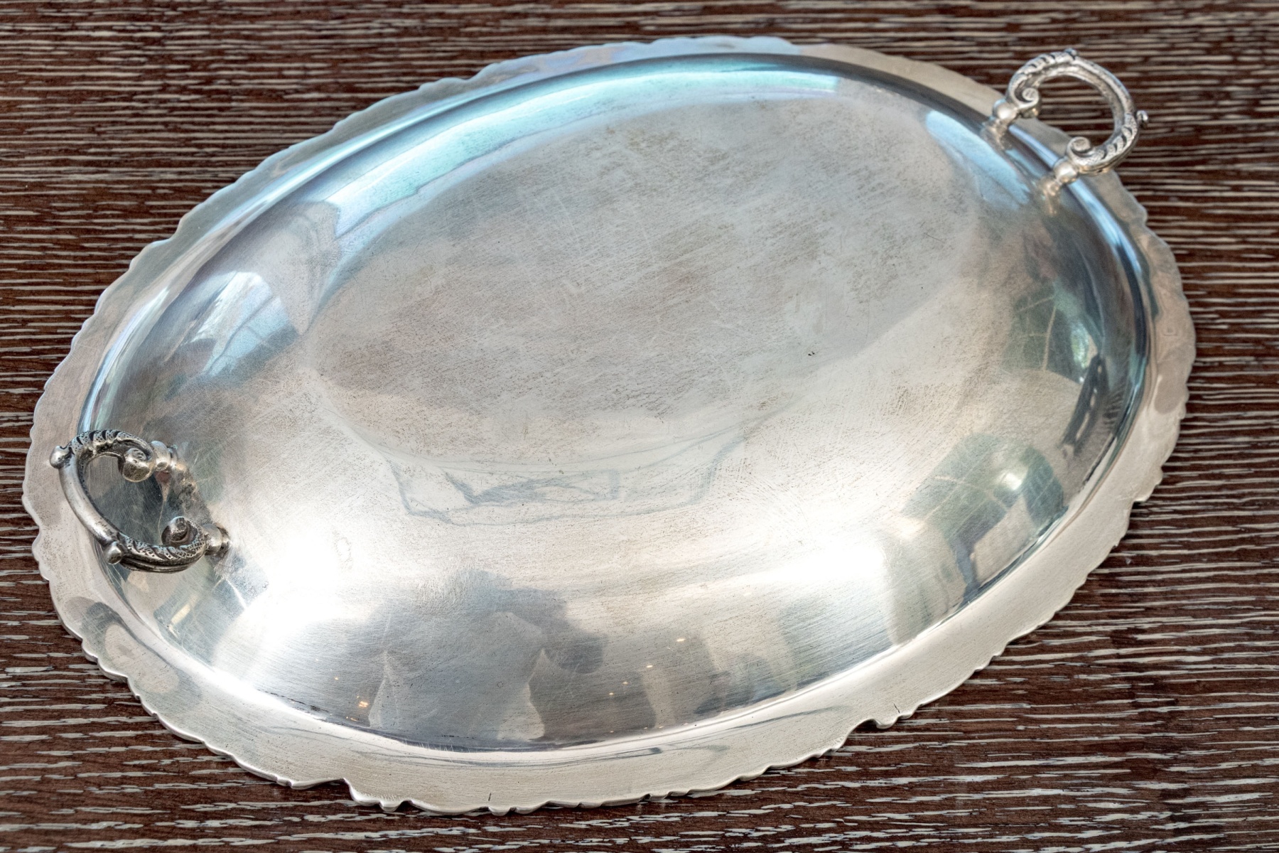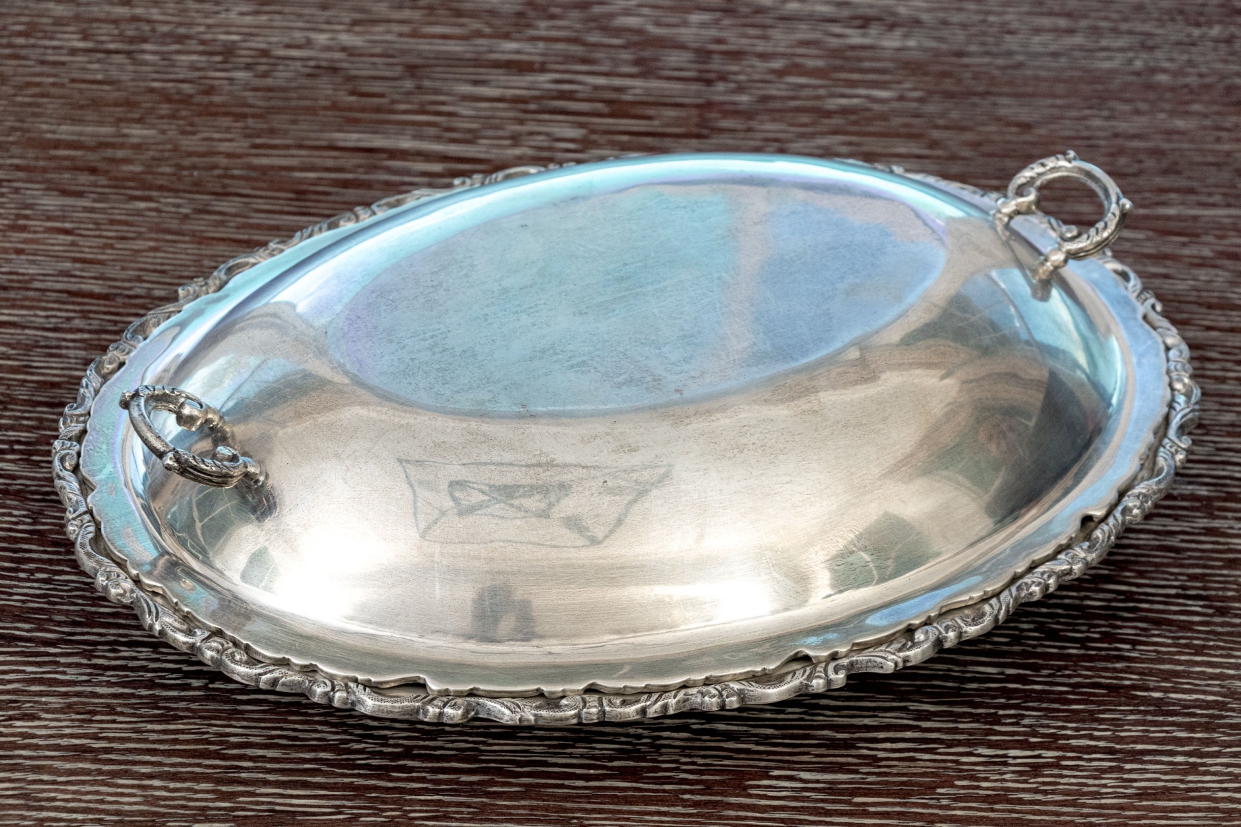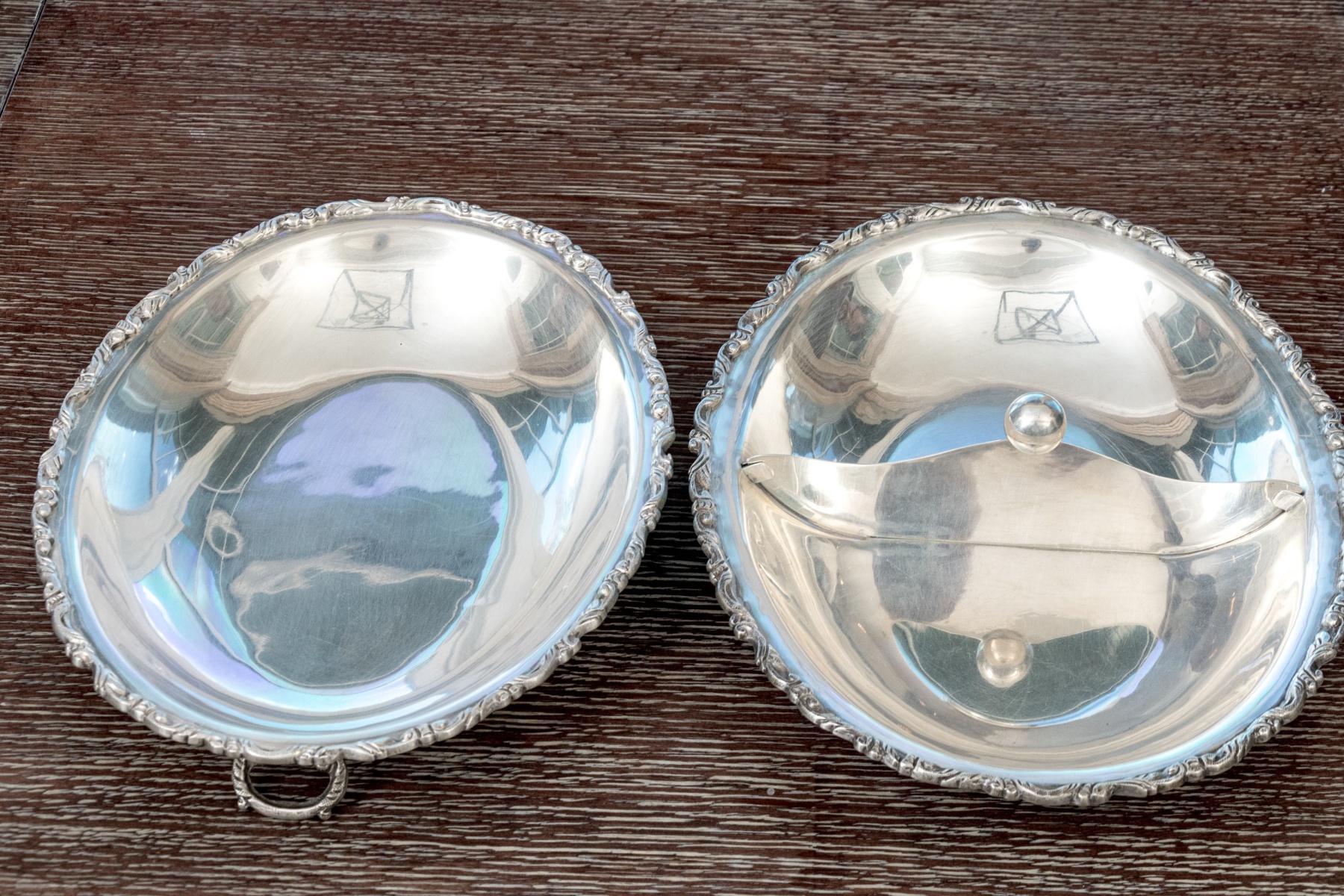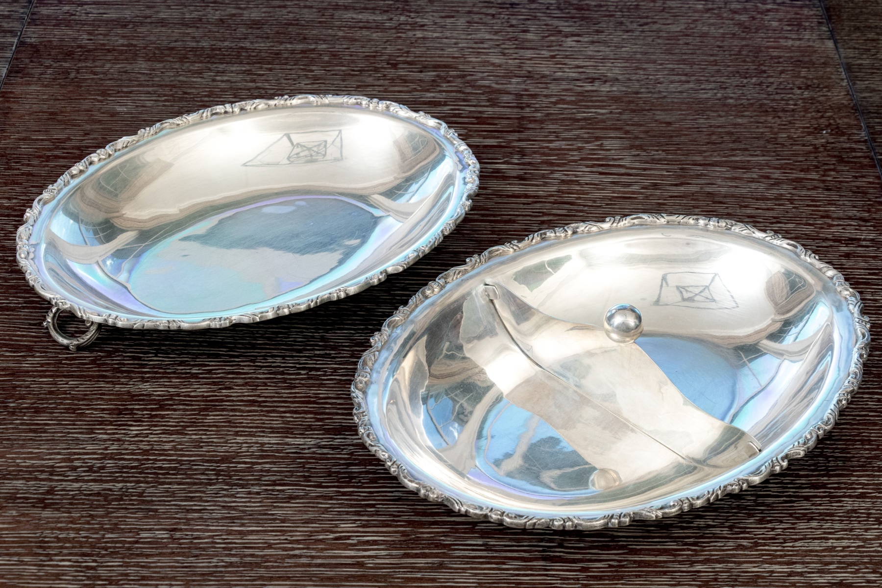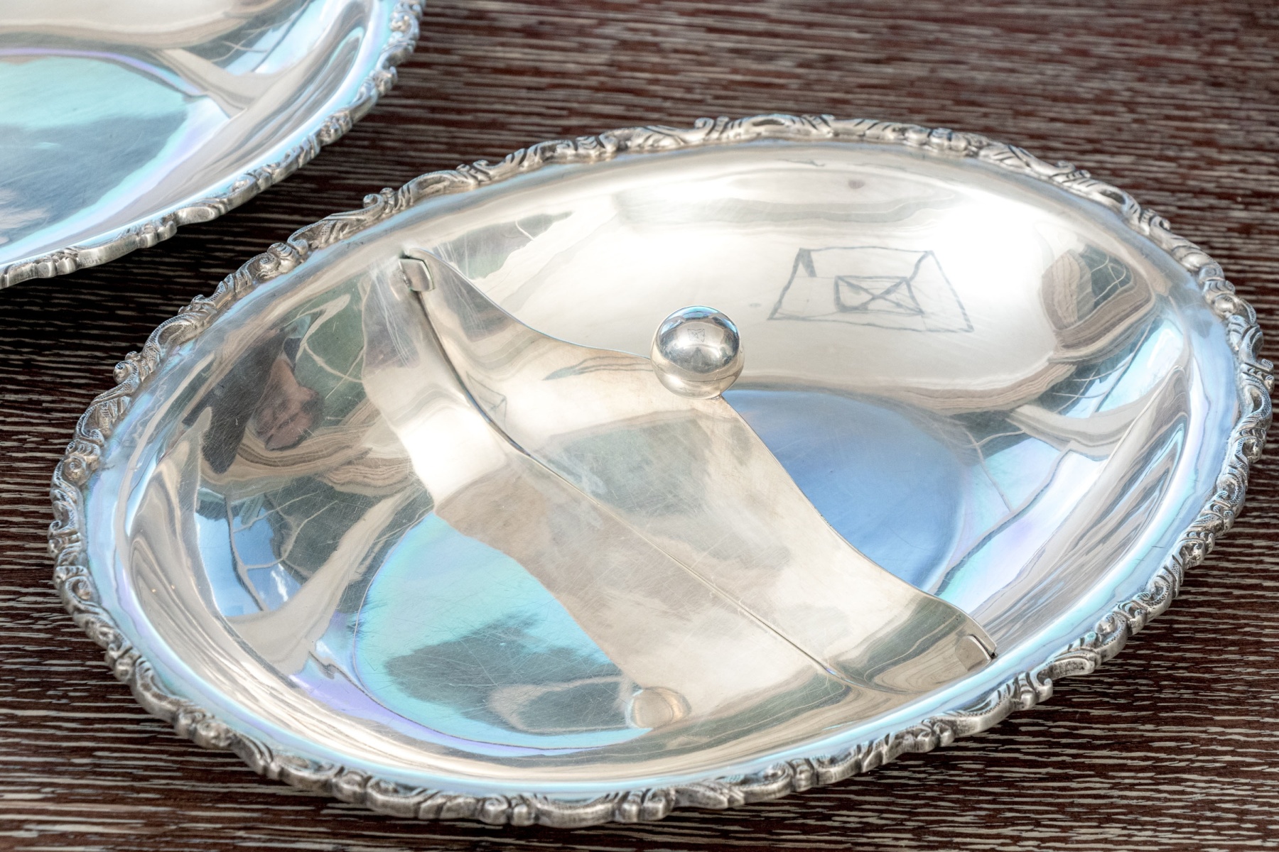 A quality Mexican sterling silver serving bowl in oval form featuring a domed lid with a flattened top flanked by palmier form twin handles and detailed with a scalloped rim echoing the scrolled foliate relief encircling the oval bowl below, raise on small bun feet. The bowl features a divider at the center with a sphere handle. Marked underneath.