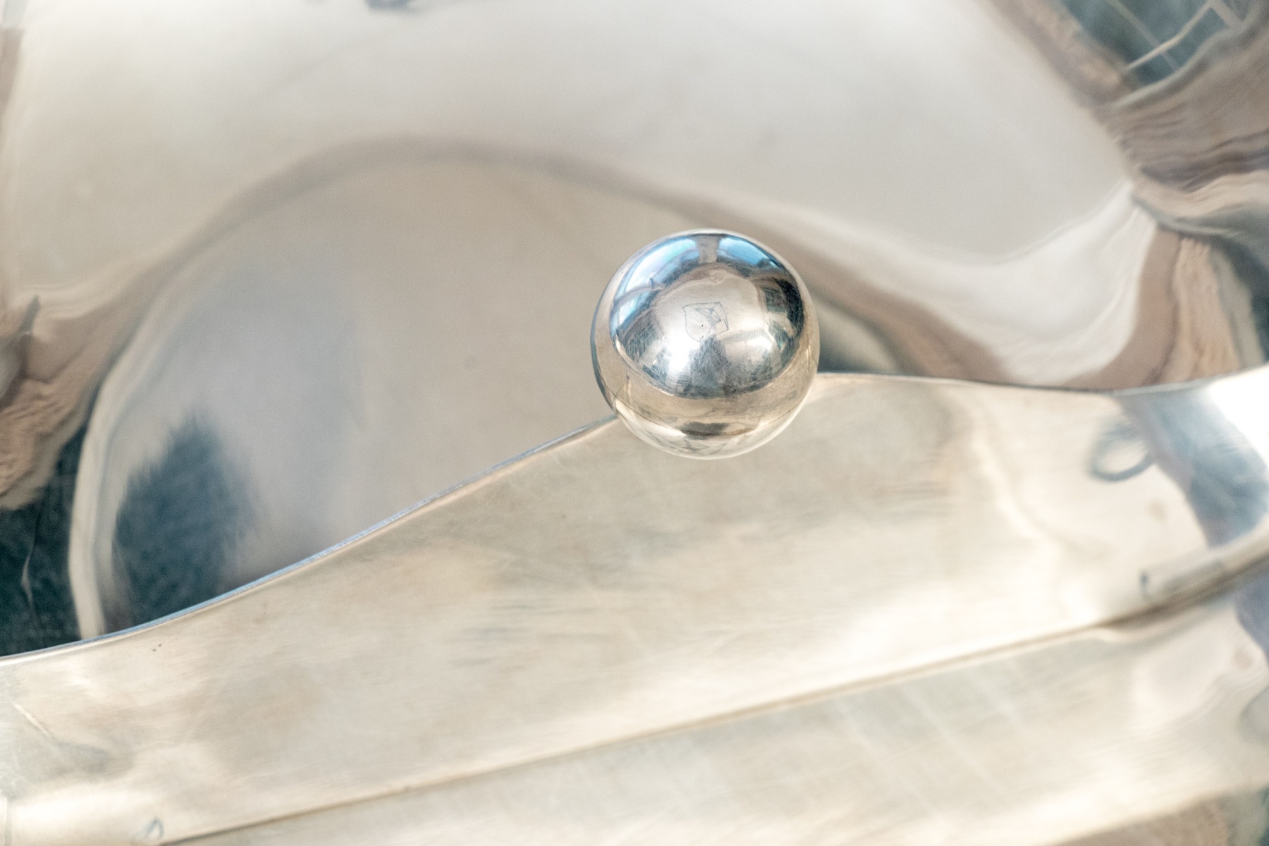 A quality Mexican sterling silver serving bowl in oval form featuring a domed lid with a flattened top flanked by palmier form twin handles and detailed with a scalloped rim echoing the scrolled foliate relief encircling the oval bowl below, raise on small bun feet. The bowl features a divider at the center with a sphere handle. Marked underneath.