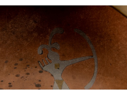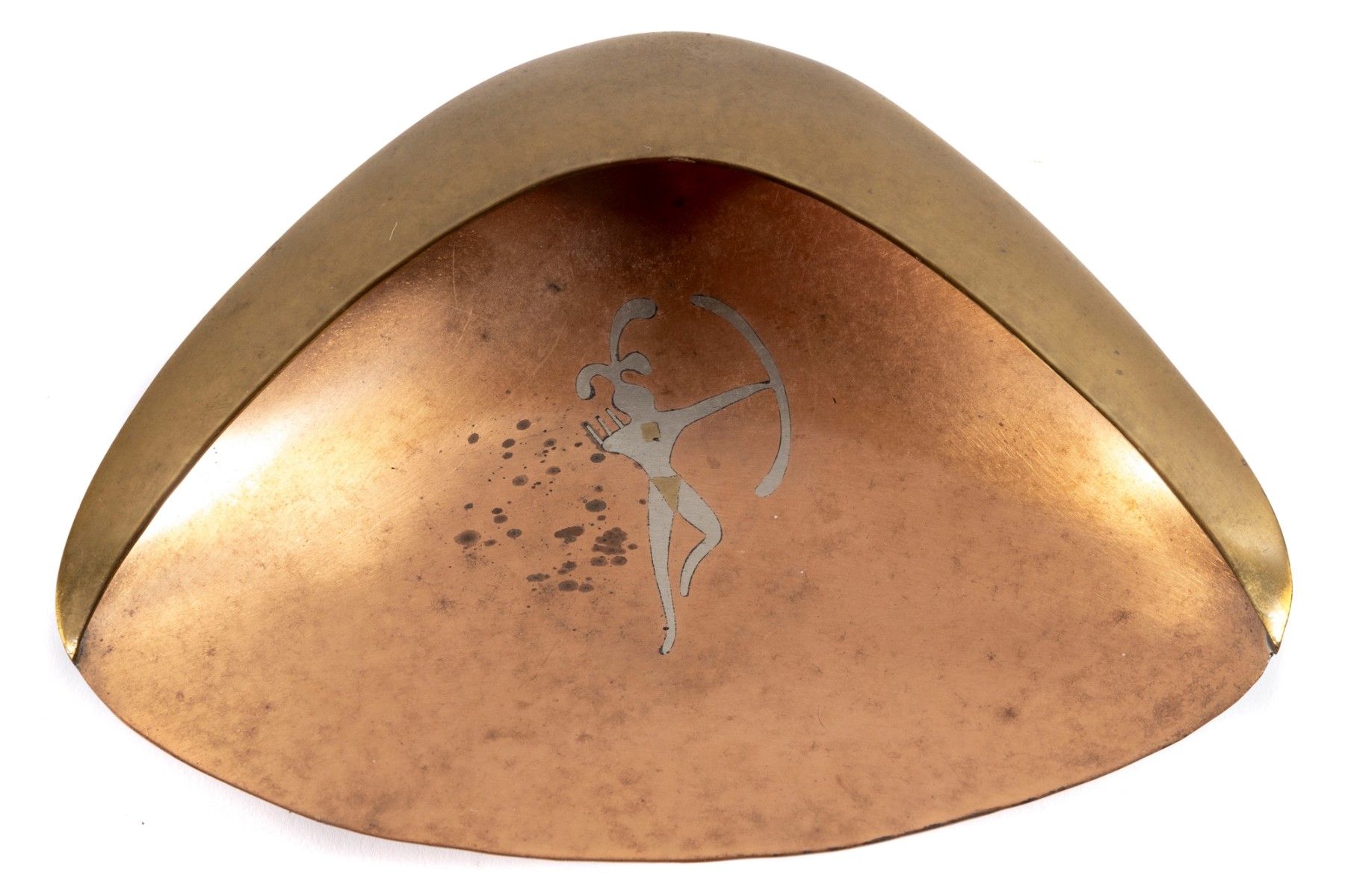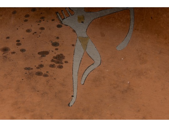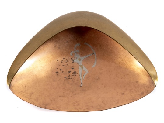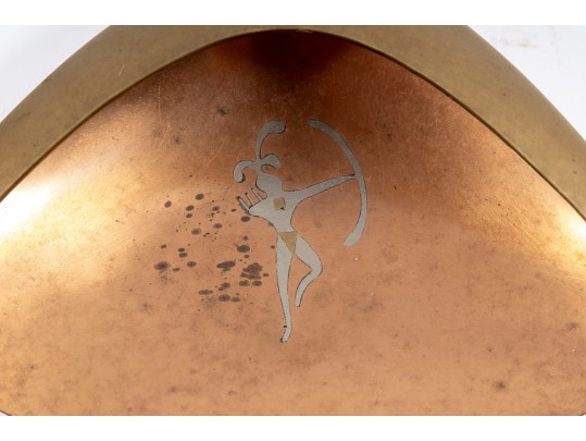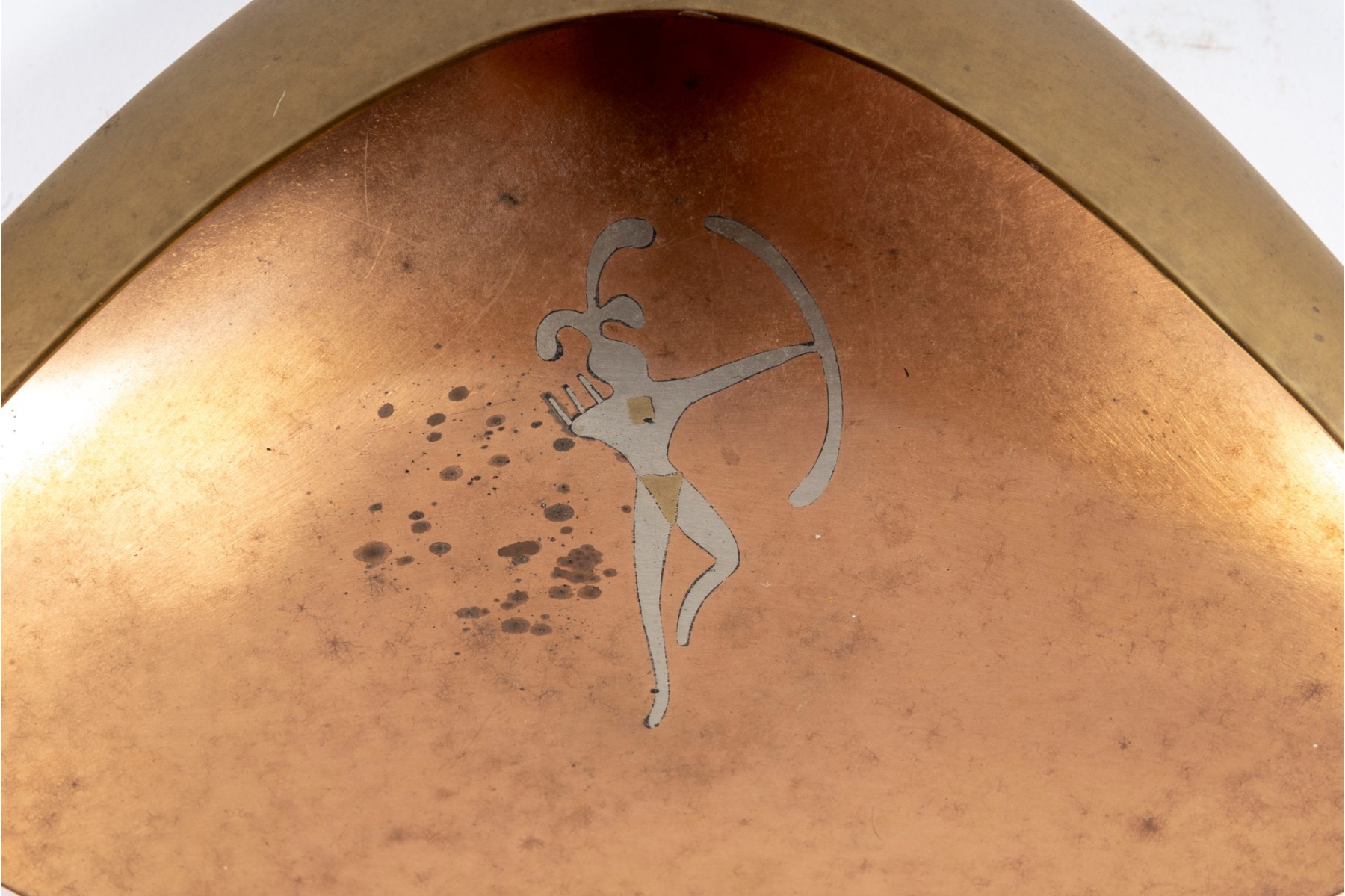 Taxco is a small town located in the mountains of Mexico with a rich history in the jewelry-making industry, primarily specializing in married metals like this silver, brass and copper ashtray fabricated by Los Castillo. The base is composed of copper embellished with brass trim. At the center features a silver inlay taking the form of an primitive Indian, native or tribesman