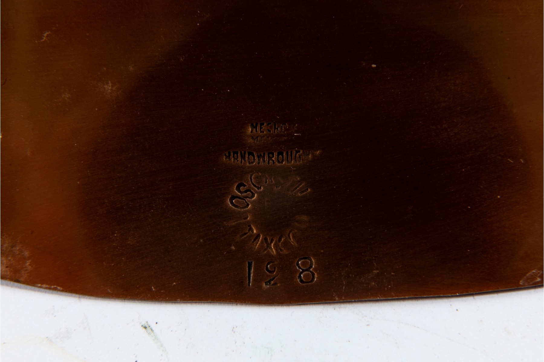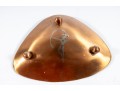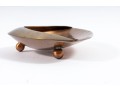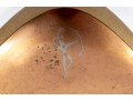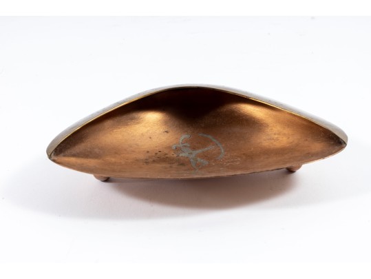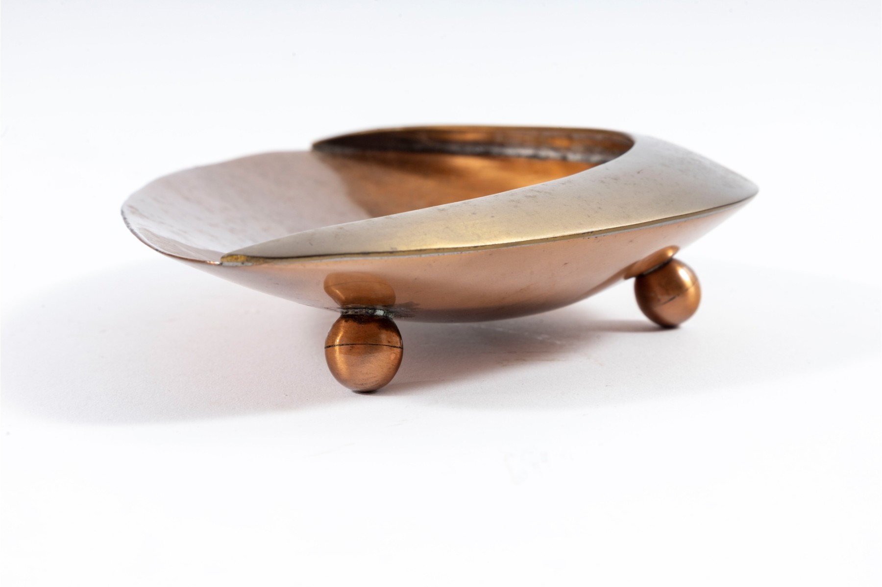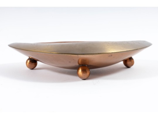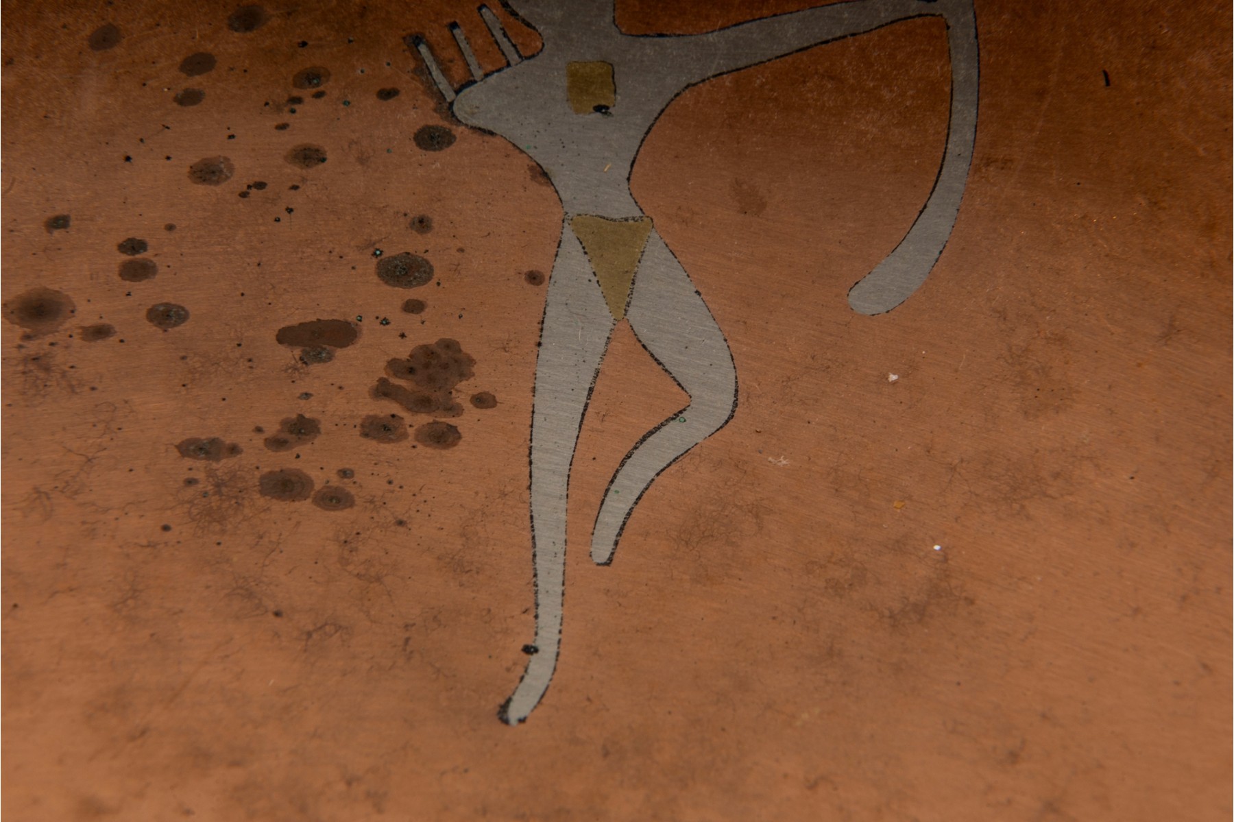 Taxco is a small town located in the mountains of Mexico with a rich history in the jewelry-making industry, primarily specializing in married metals like this silver, brass and copper ashtray fabricated by Los Castillo. The base is composed of copper embellished with brass trim. At the center features a silver inlay taking the form of an primitive Indian, native or tribesman