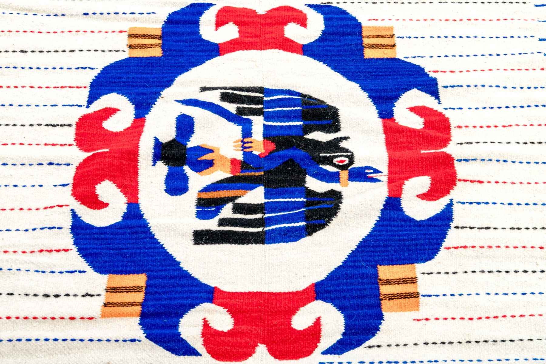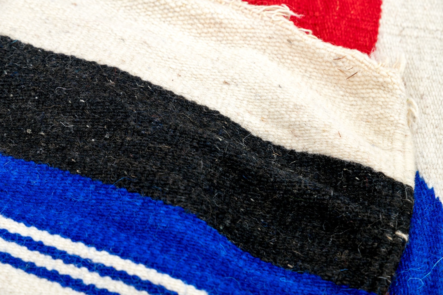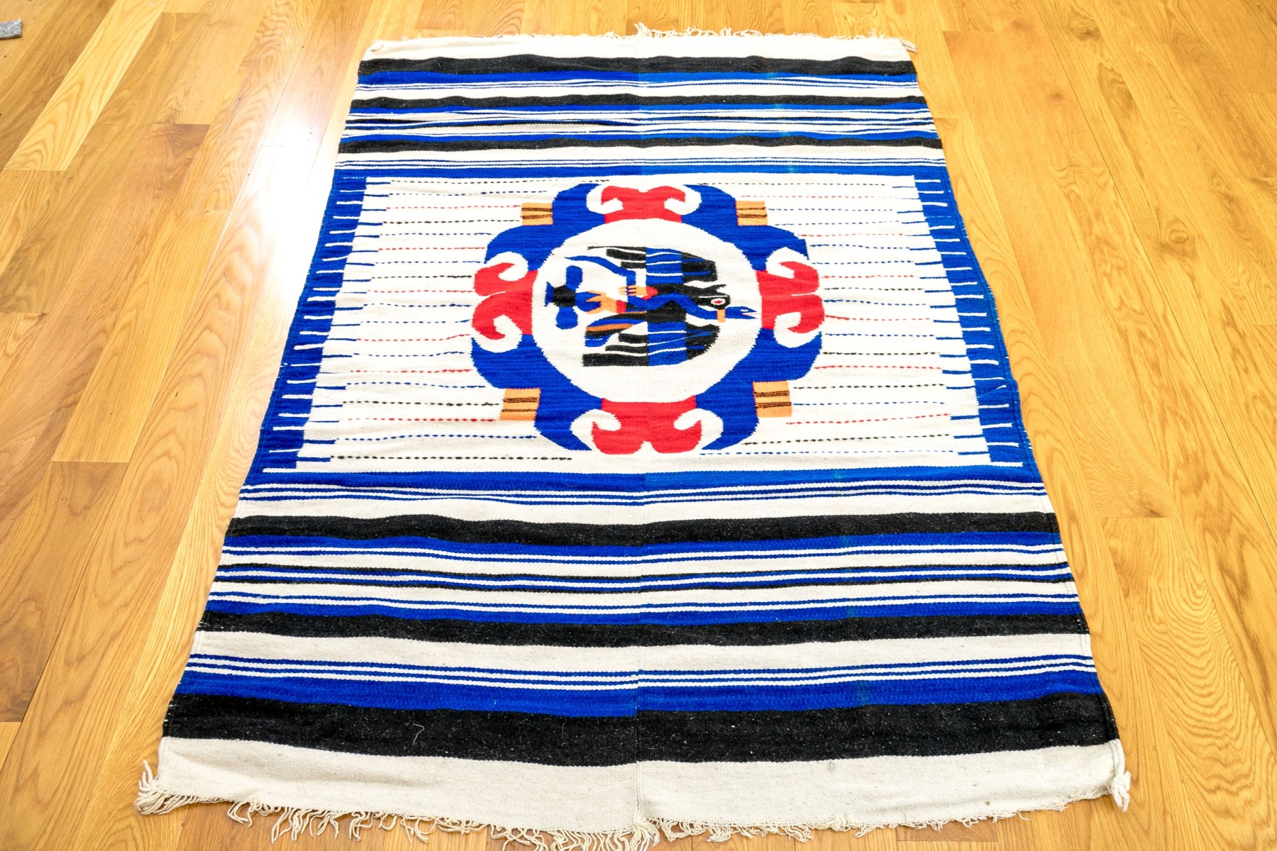 A wonderful Mexican woven wool serape constructed of two joined panels, showcasing striped black, blue, and white borders around a center with a stylized eagle, snake, and prickly pear coat of arms in an oval flourished red, blue, and brown border.