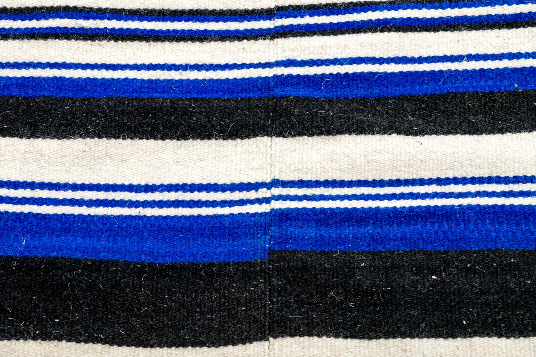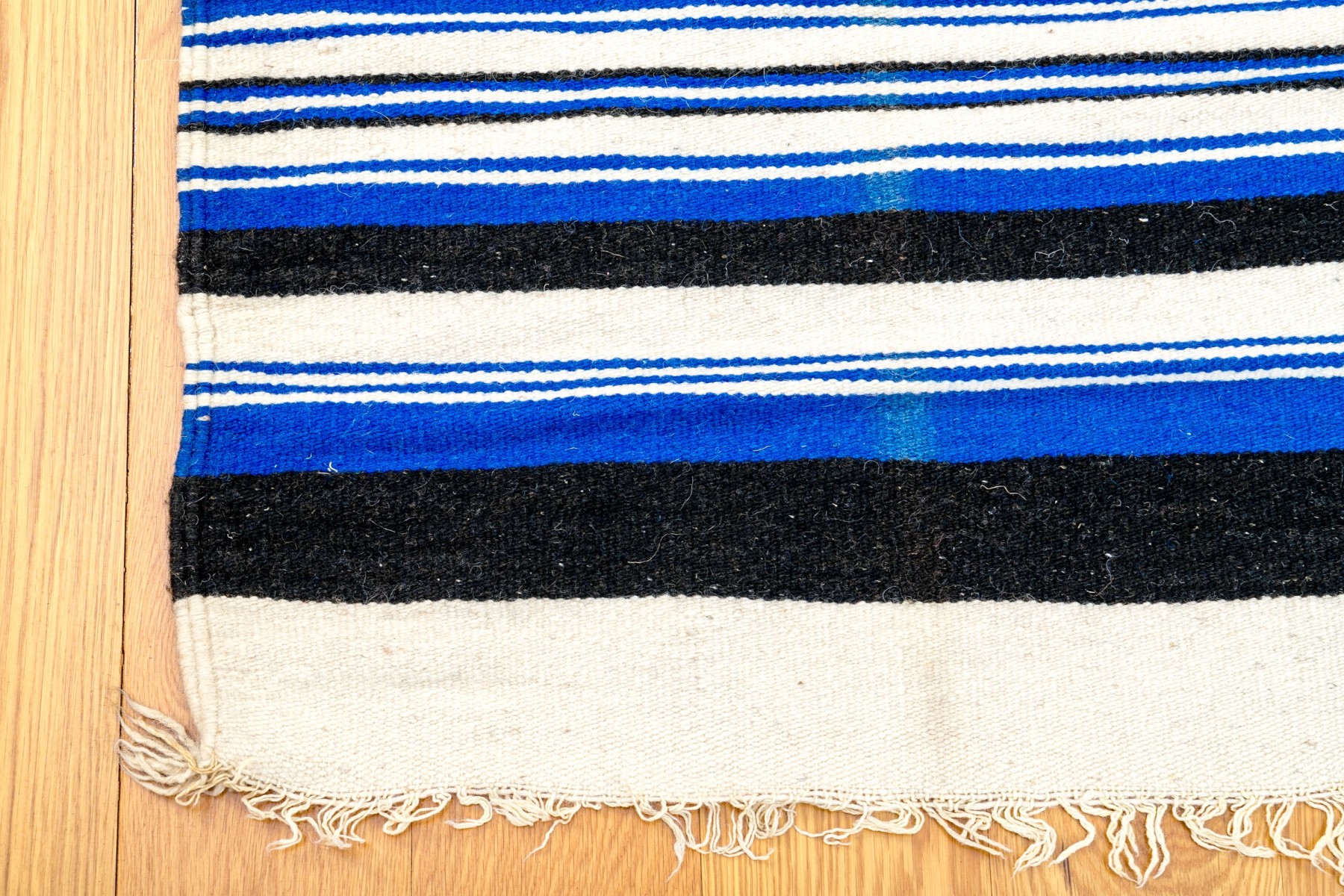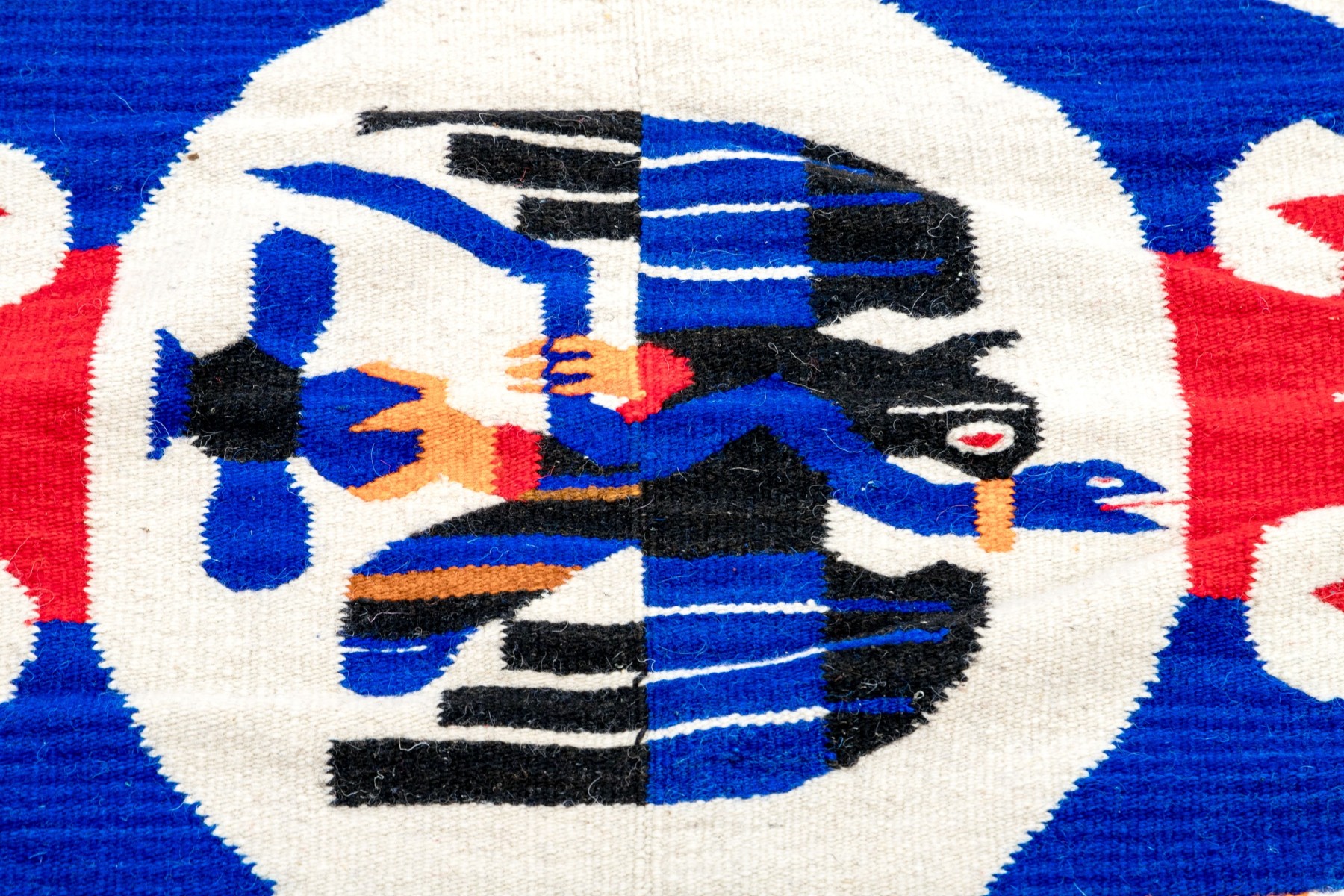 A wonderful Mexican woven wool serape constructed of two joined panels, showcasing striped black, blue, and white borders around a center with a stylized eagle, snake, and prickly pear coat of arms in an oval flourished red, blue, and brown border.