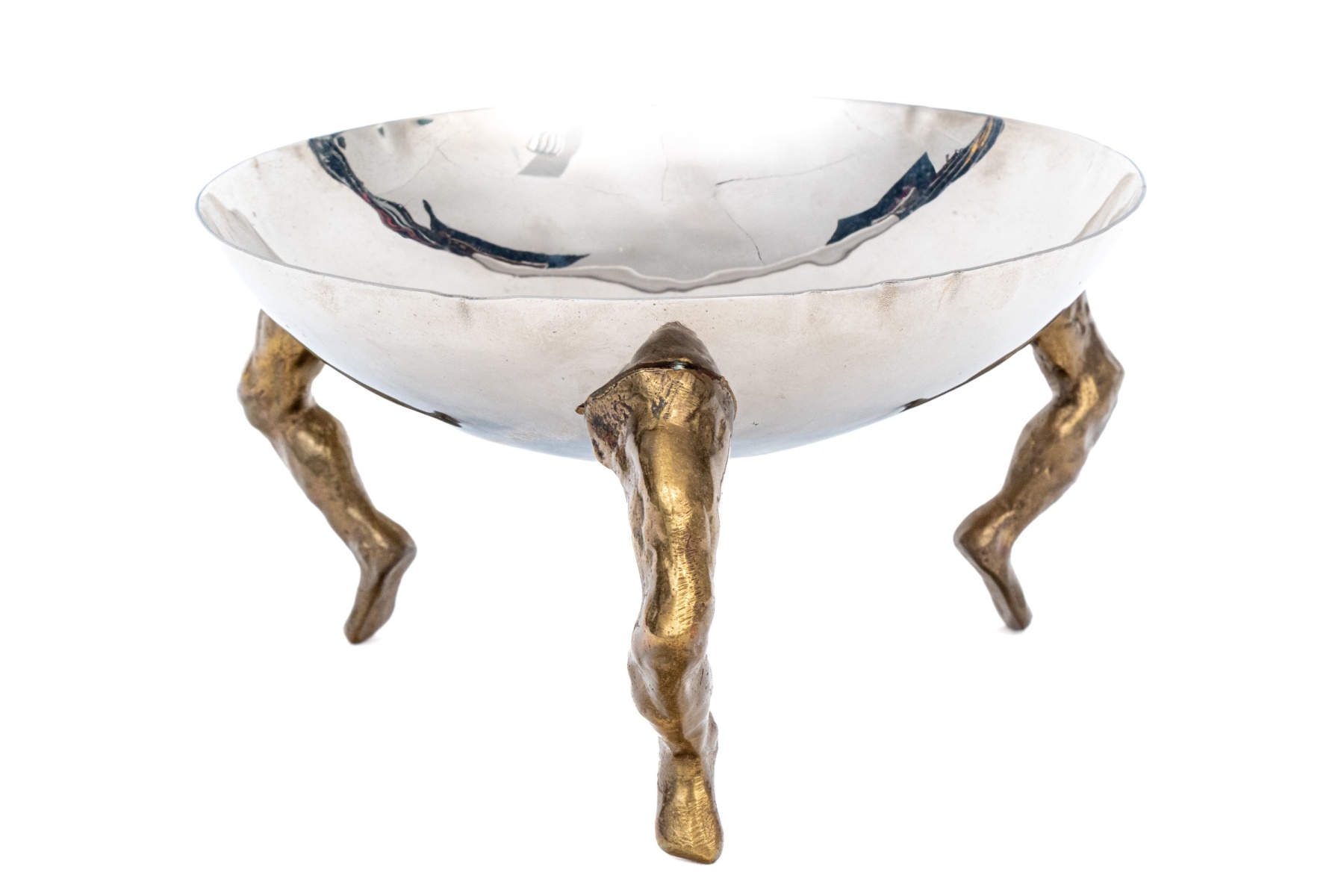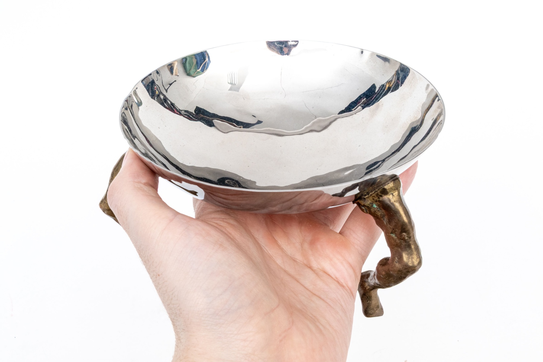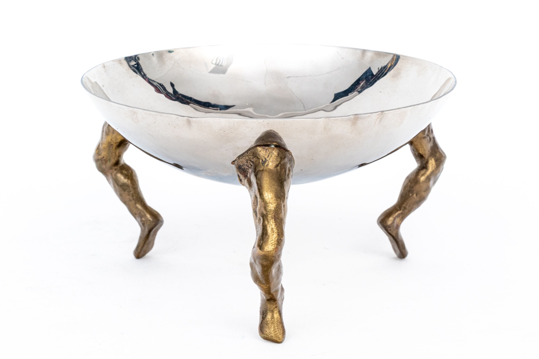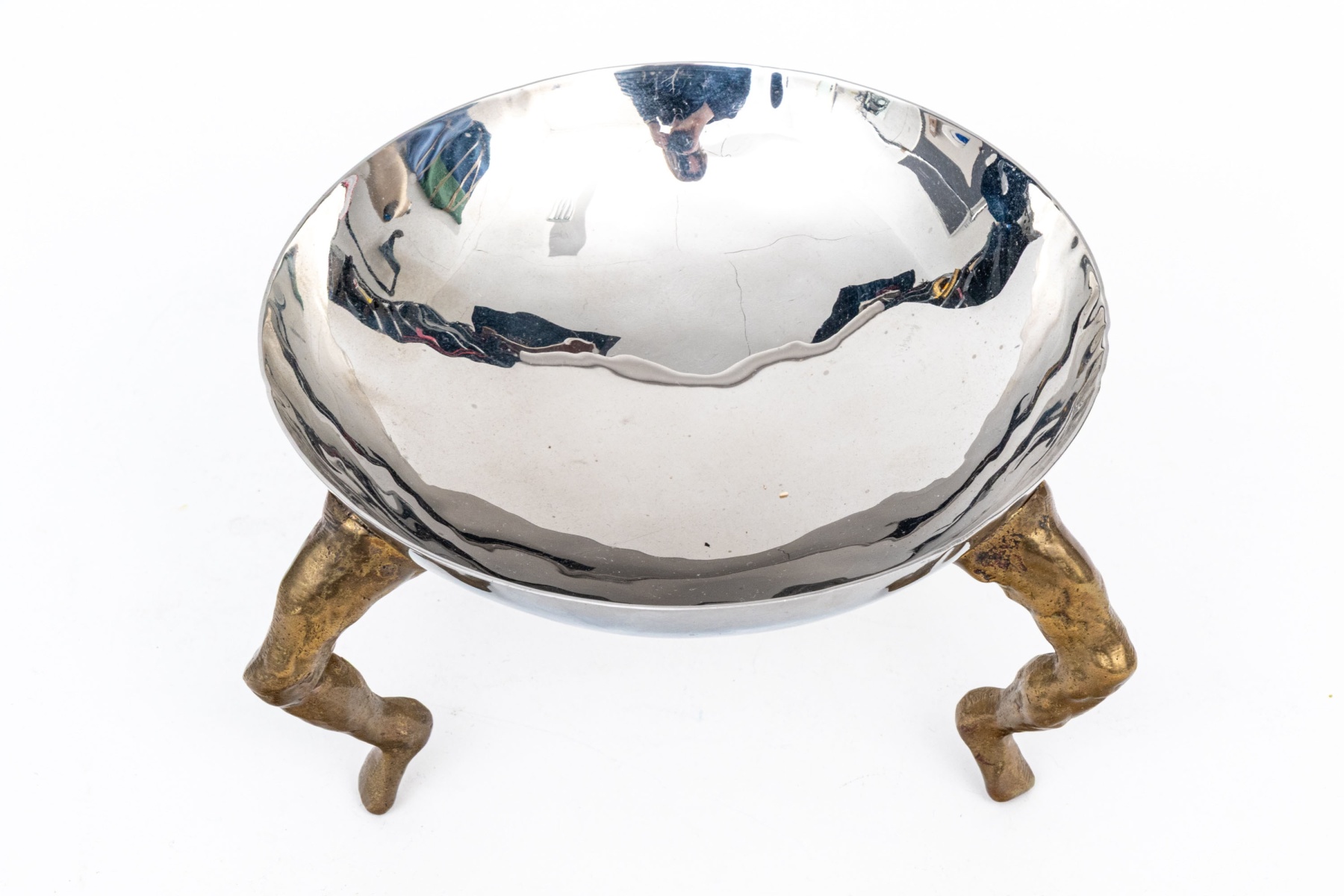 An amusing stainless round shallow bowl mounted on three bronze tone metal human form legs. The bowl rim is slightly hammered by design.
