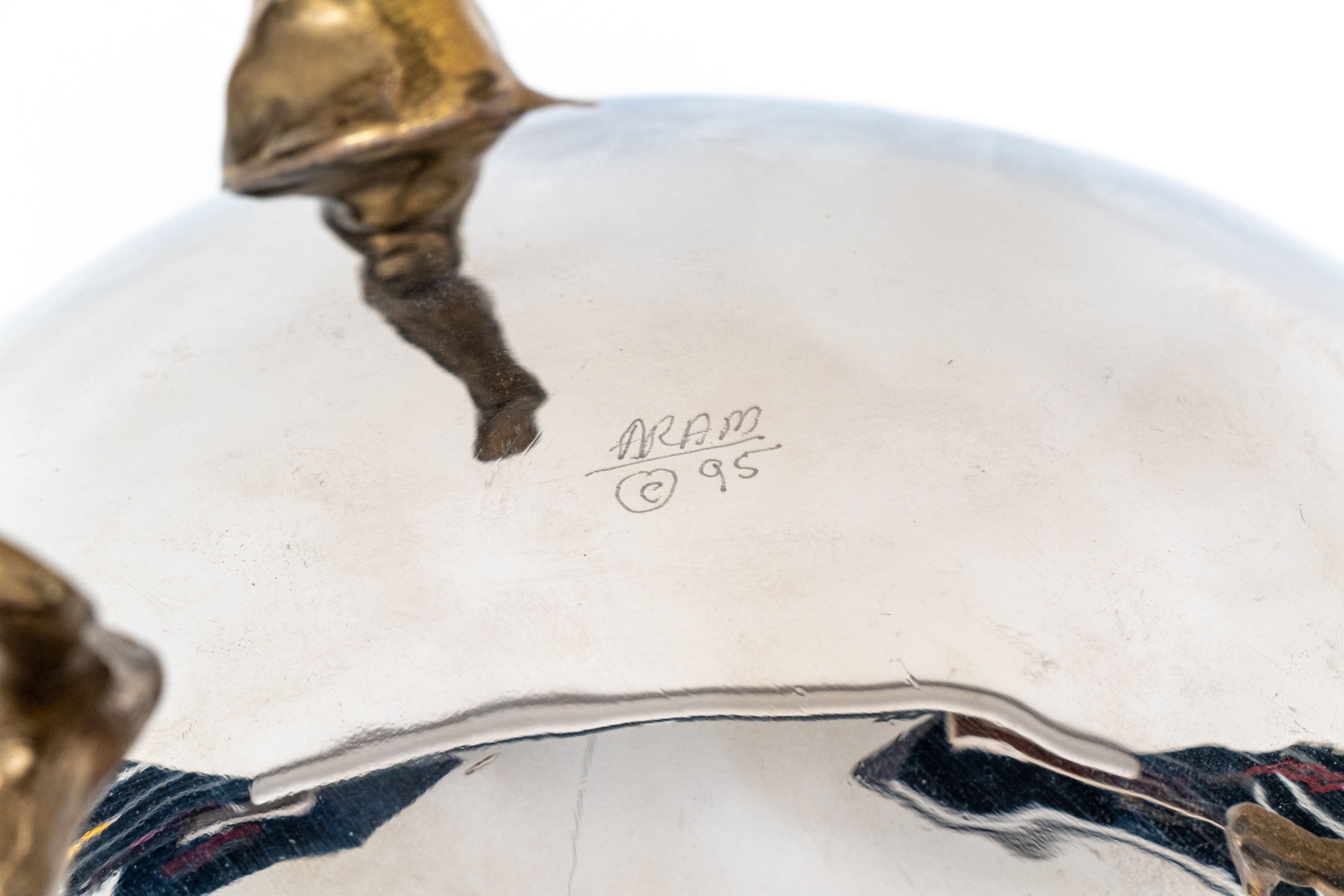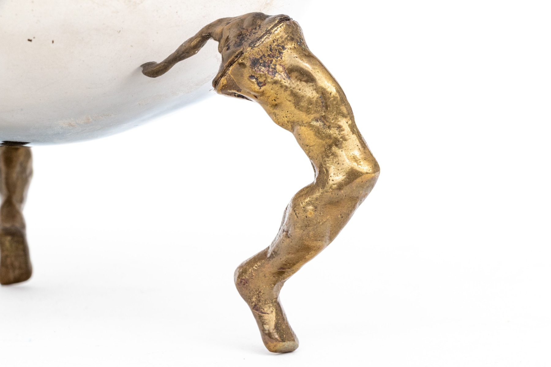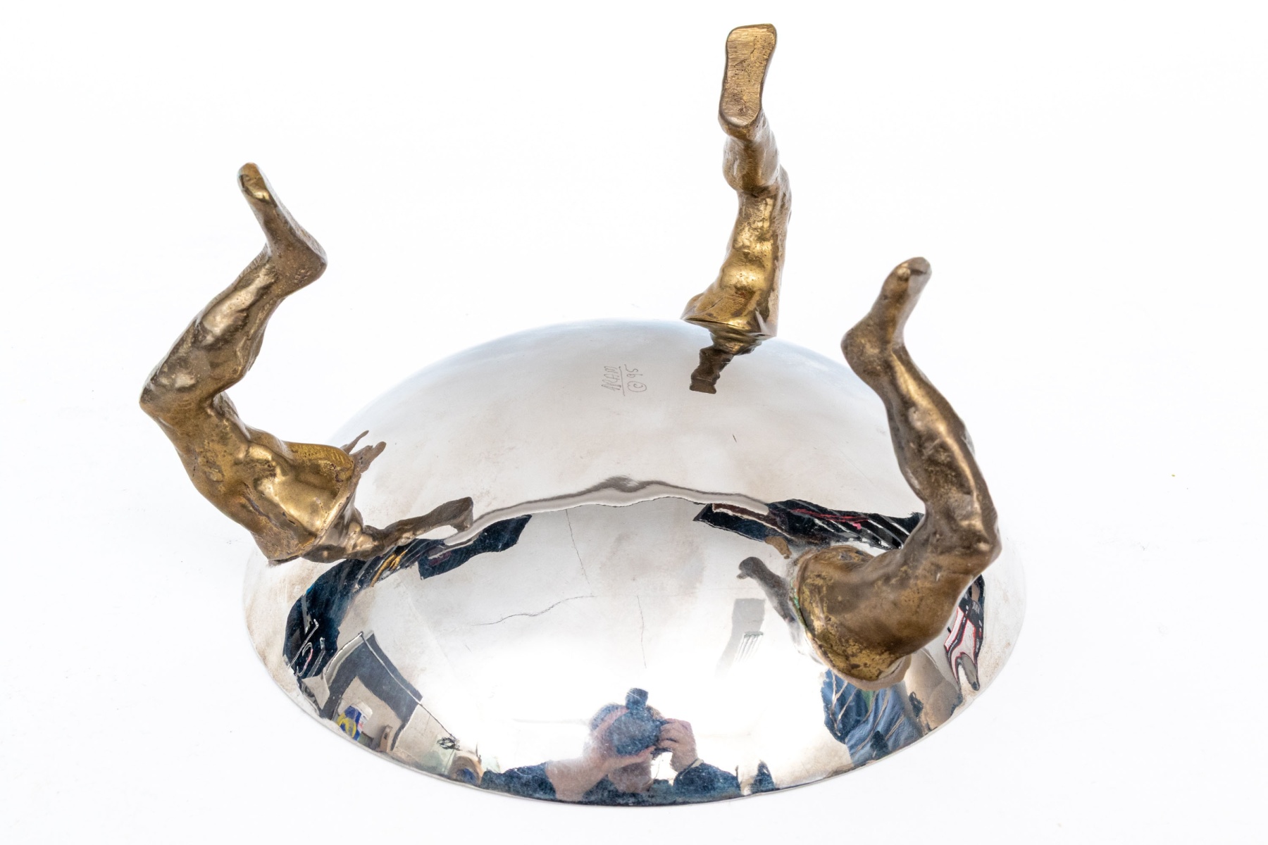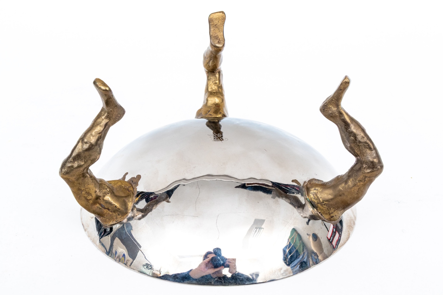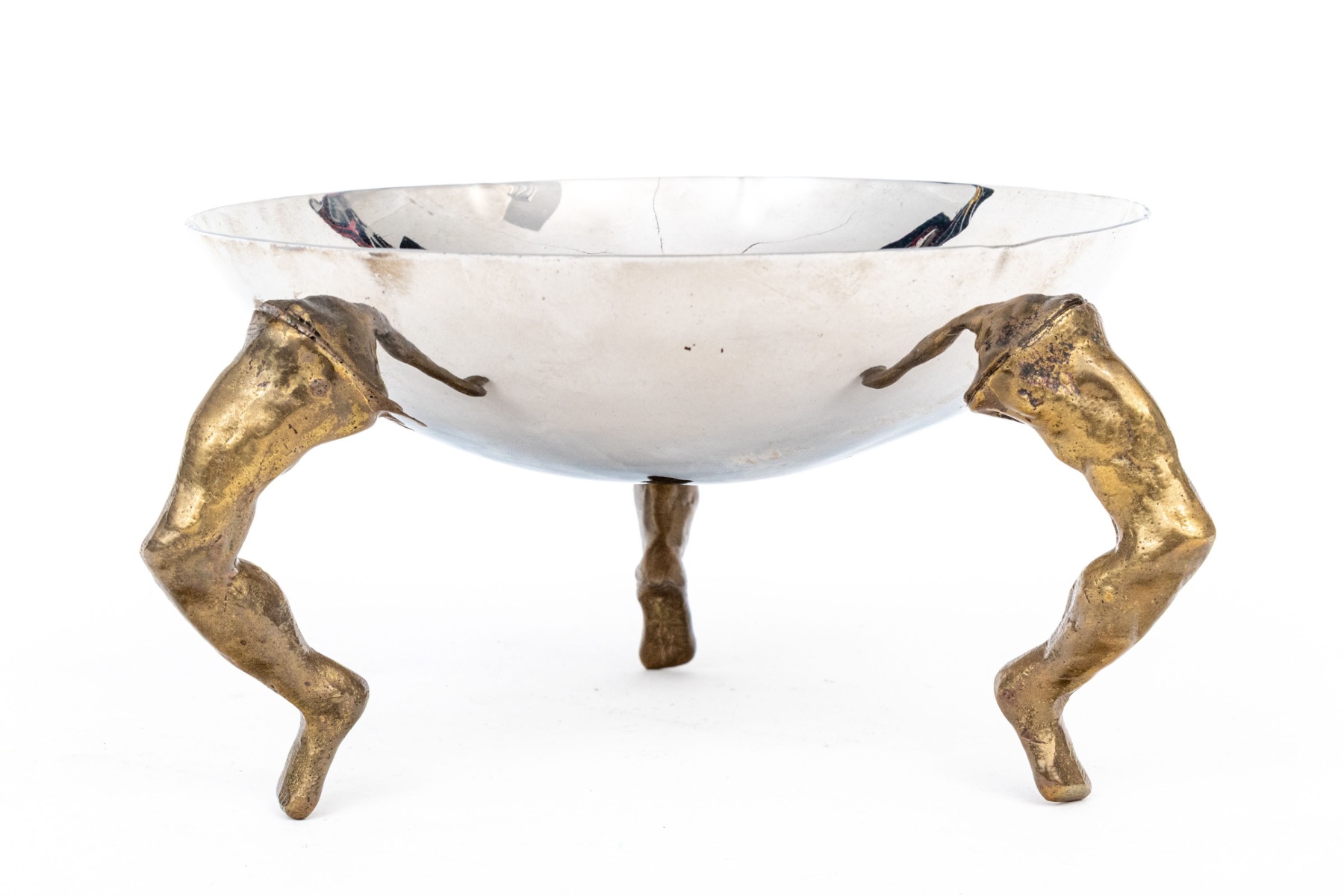 An amusing stainless round shallow bowl mounted on three bronze tone metal human form legs. The bowl rim is slightly hammered by design.