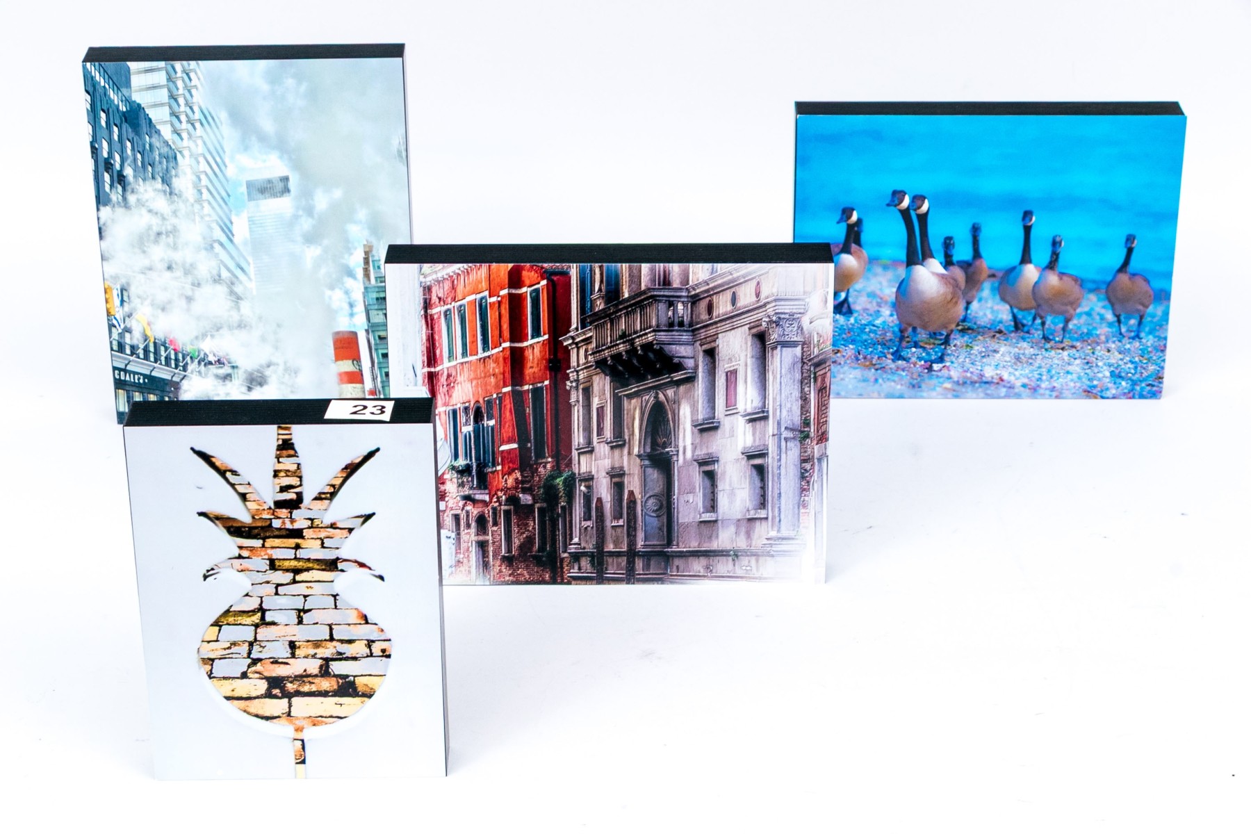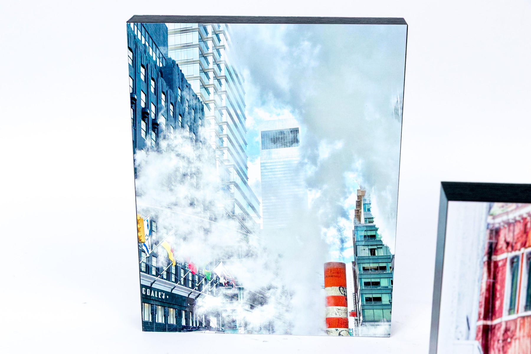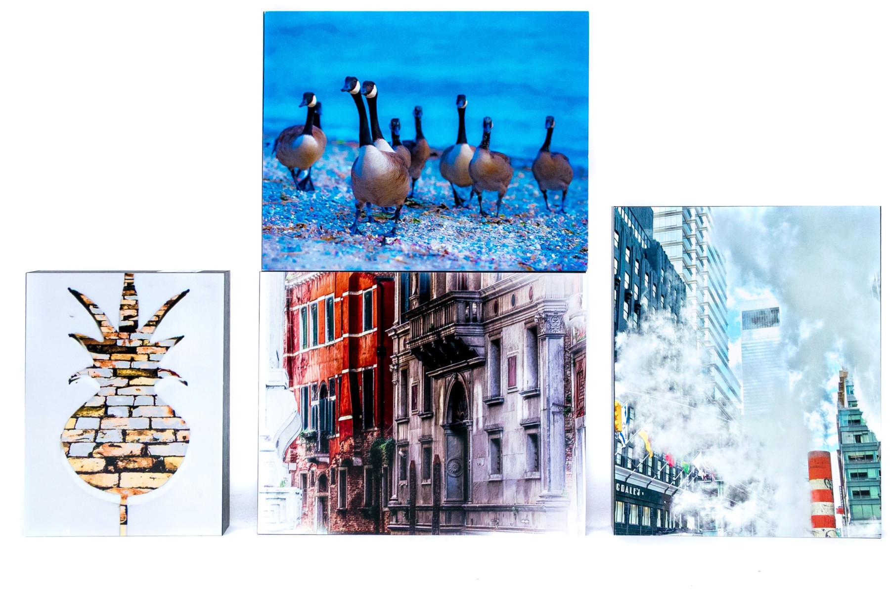A small one with a pineapple curt out over a brick wall, and three others with a flock of Canada geese, building facades, and Lexington Av.e New York in the Con Ed mist. All mounted on black plastic,