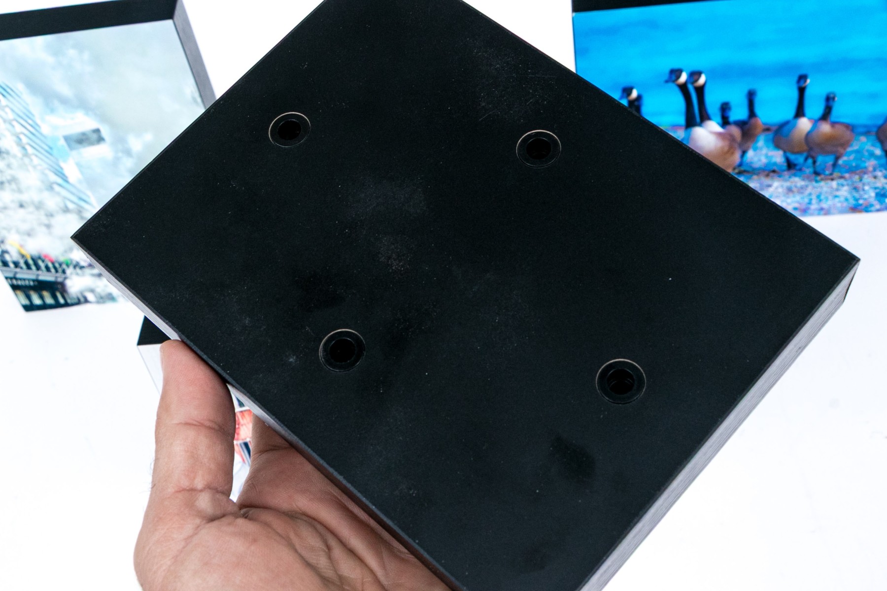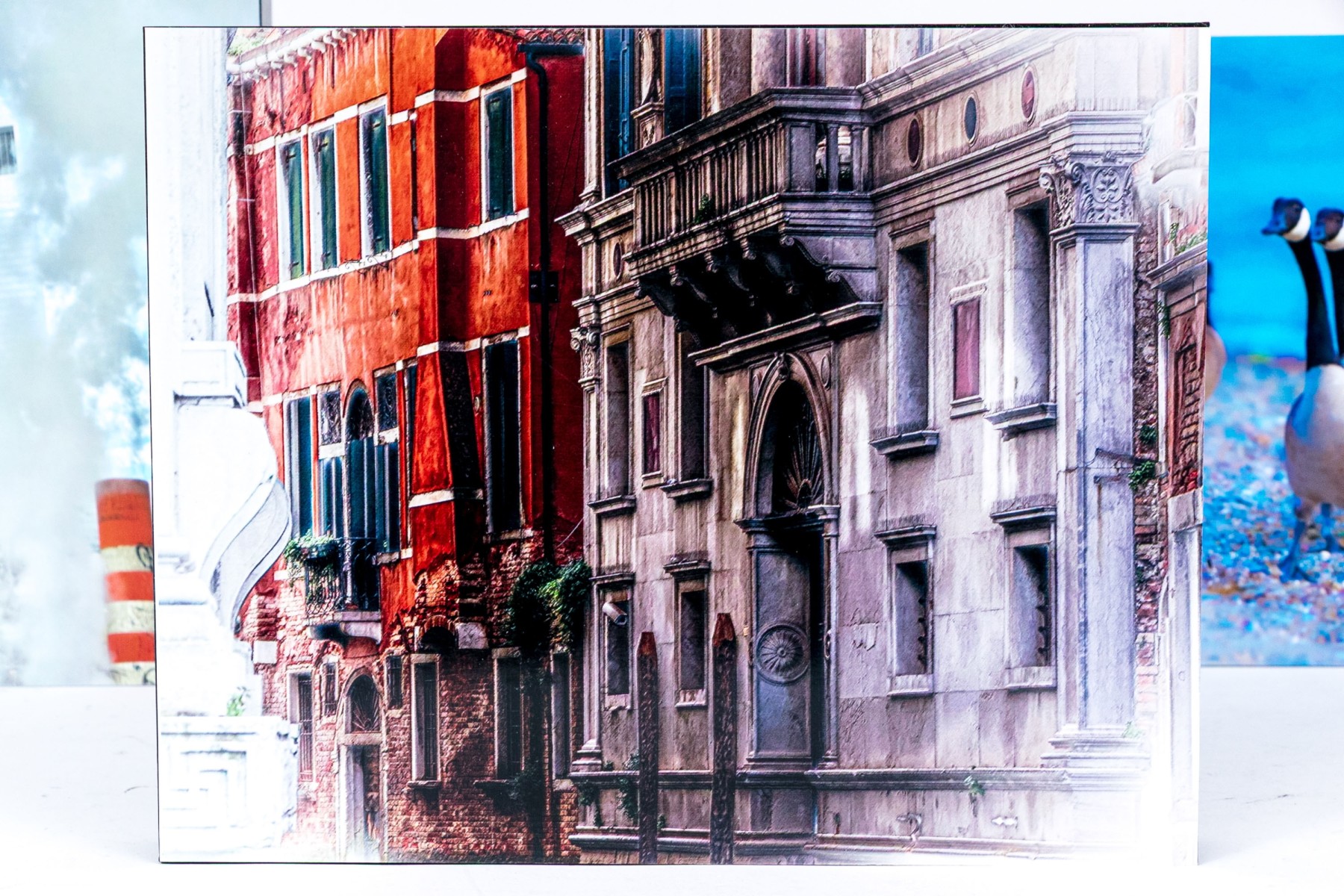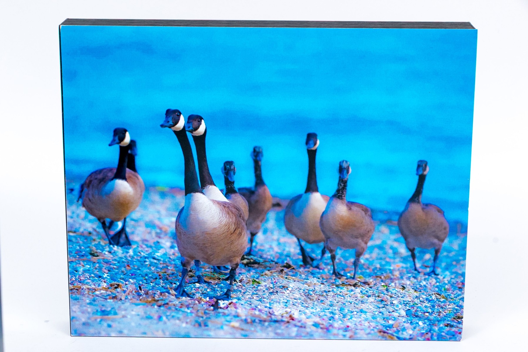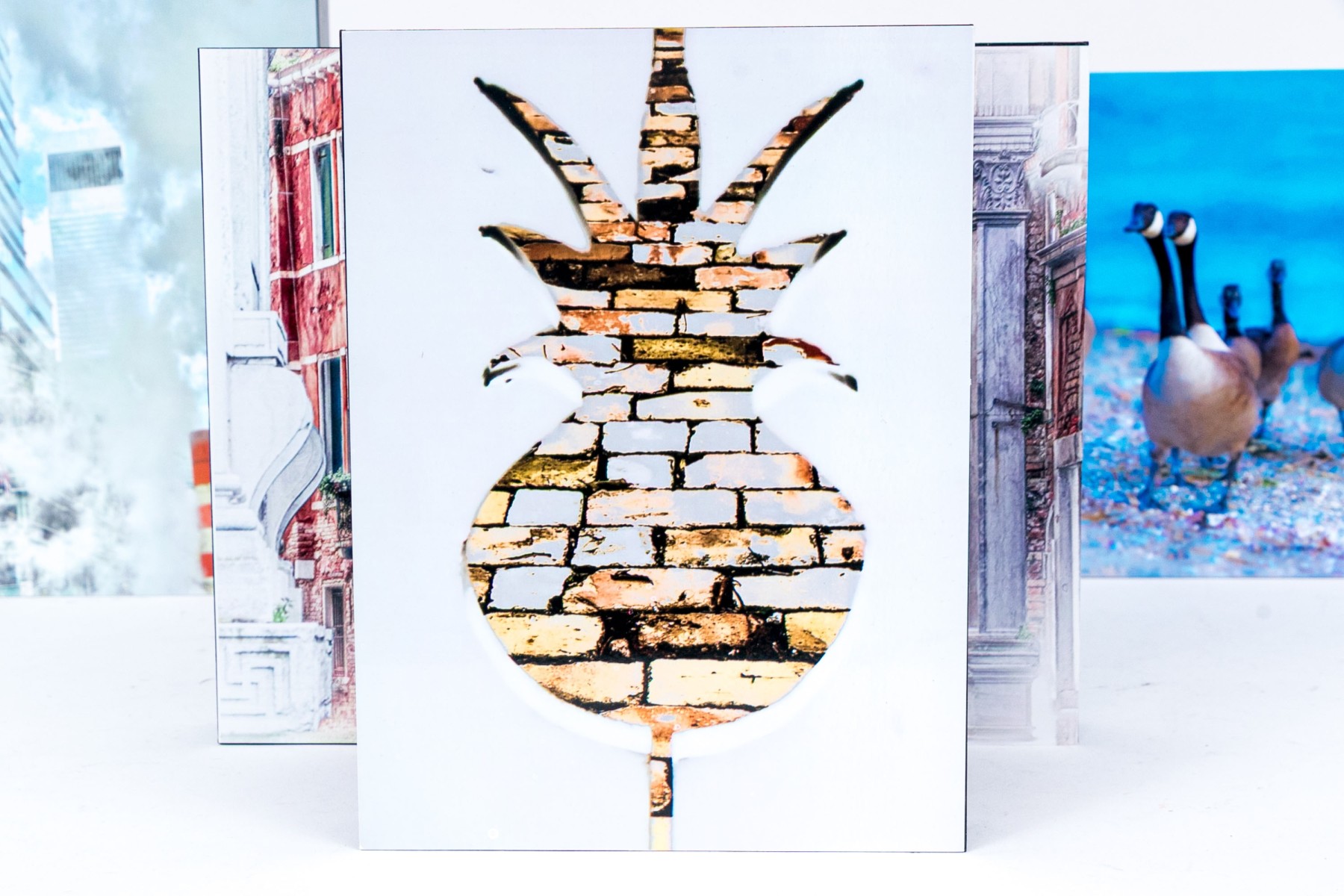 A small one with a pineapple curt out over a brick wall, and three others with a flock of Canada geese, building facades, and Lexington Av.e New York in the Con Ed mist. All mounted on black plastic,