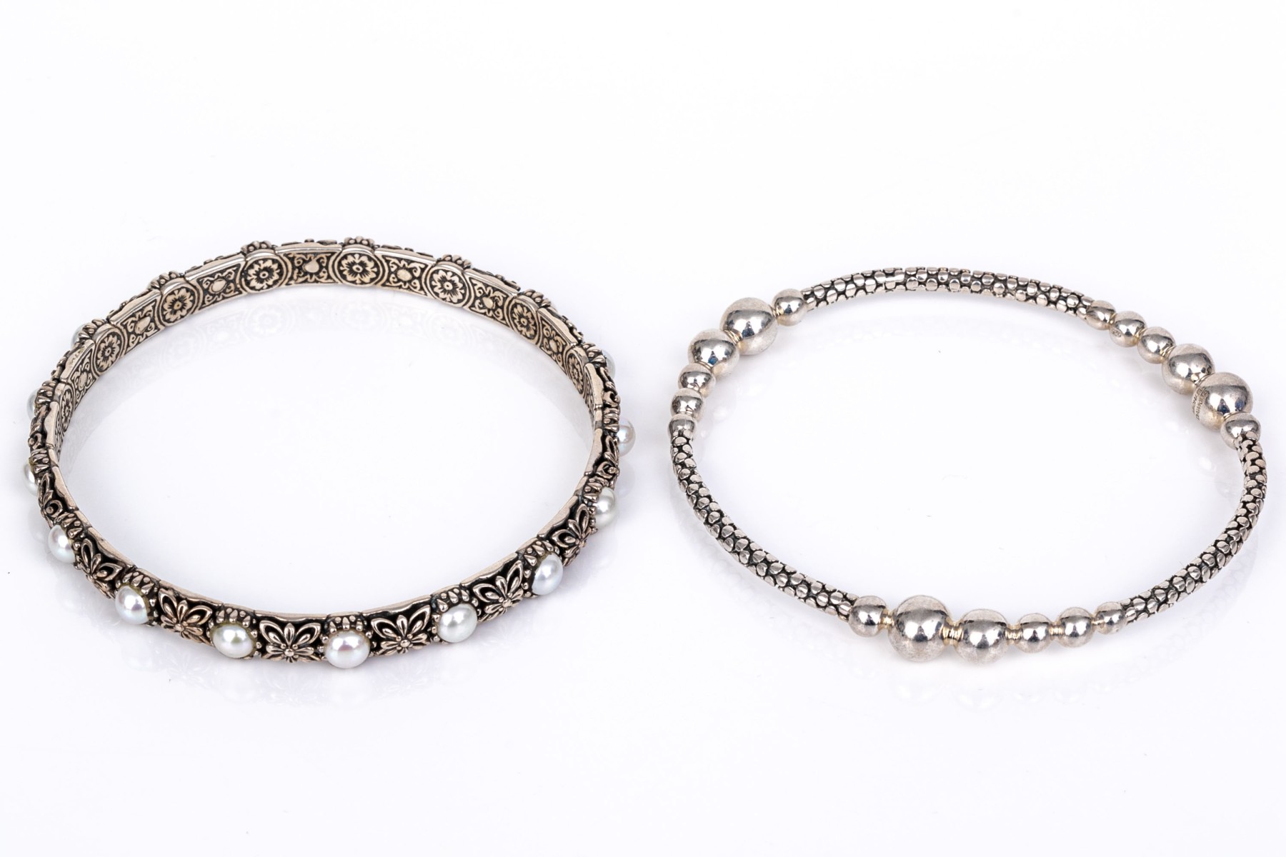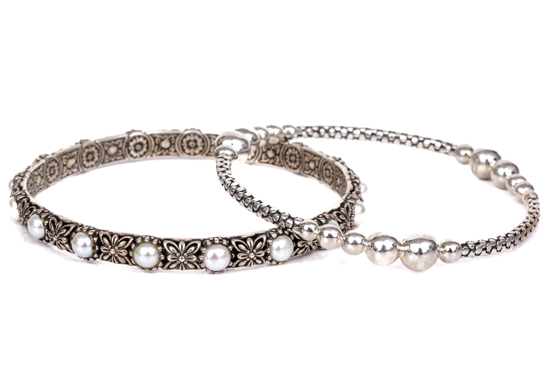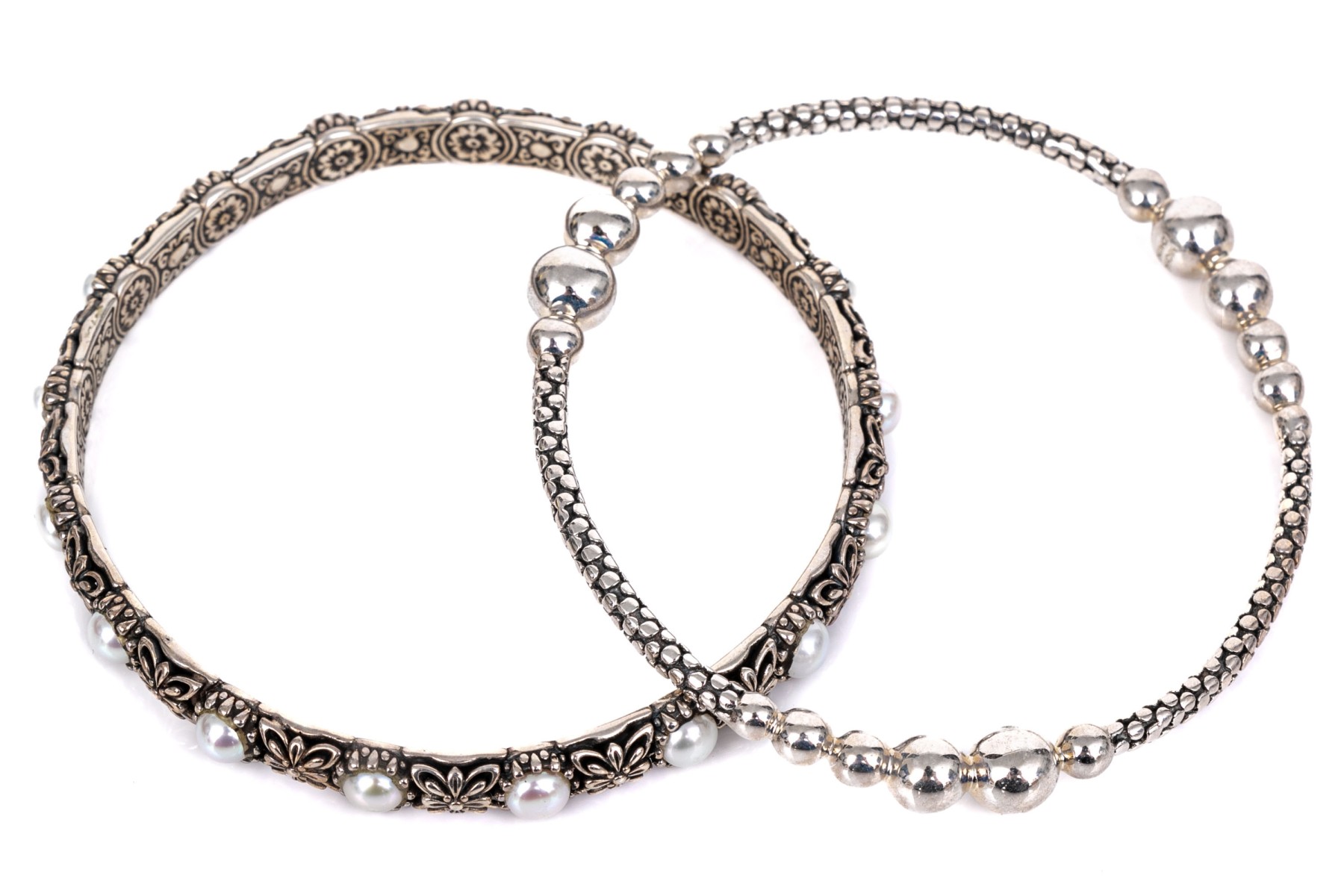 Michael Dawkins and Konstantino sterling silver pair of Balinese patterning slip on bangle bracelets, complementary styles