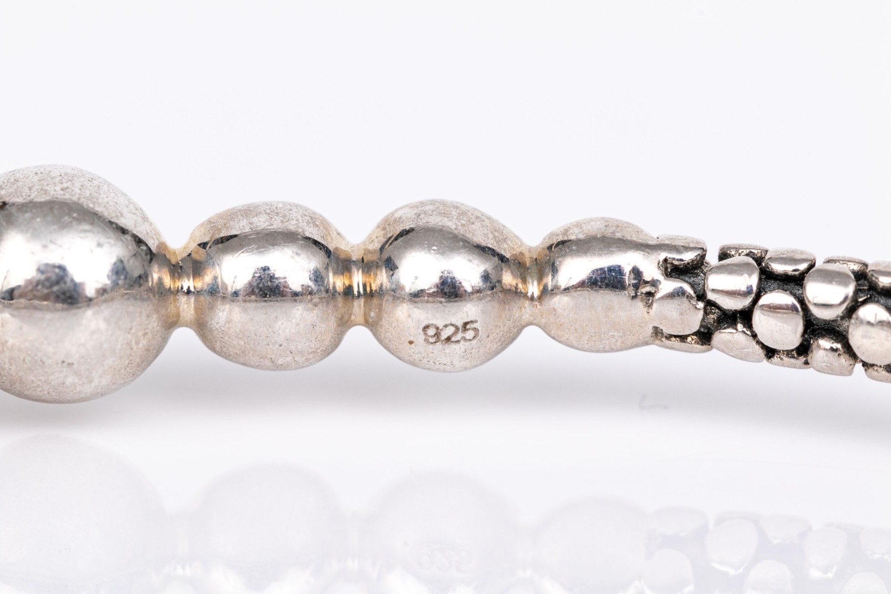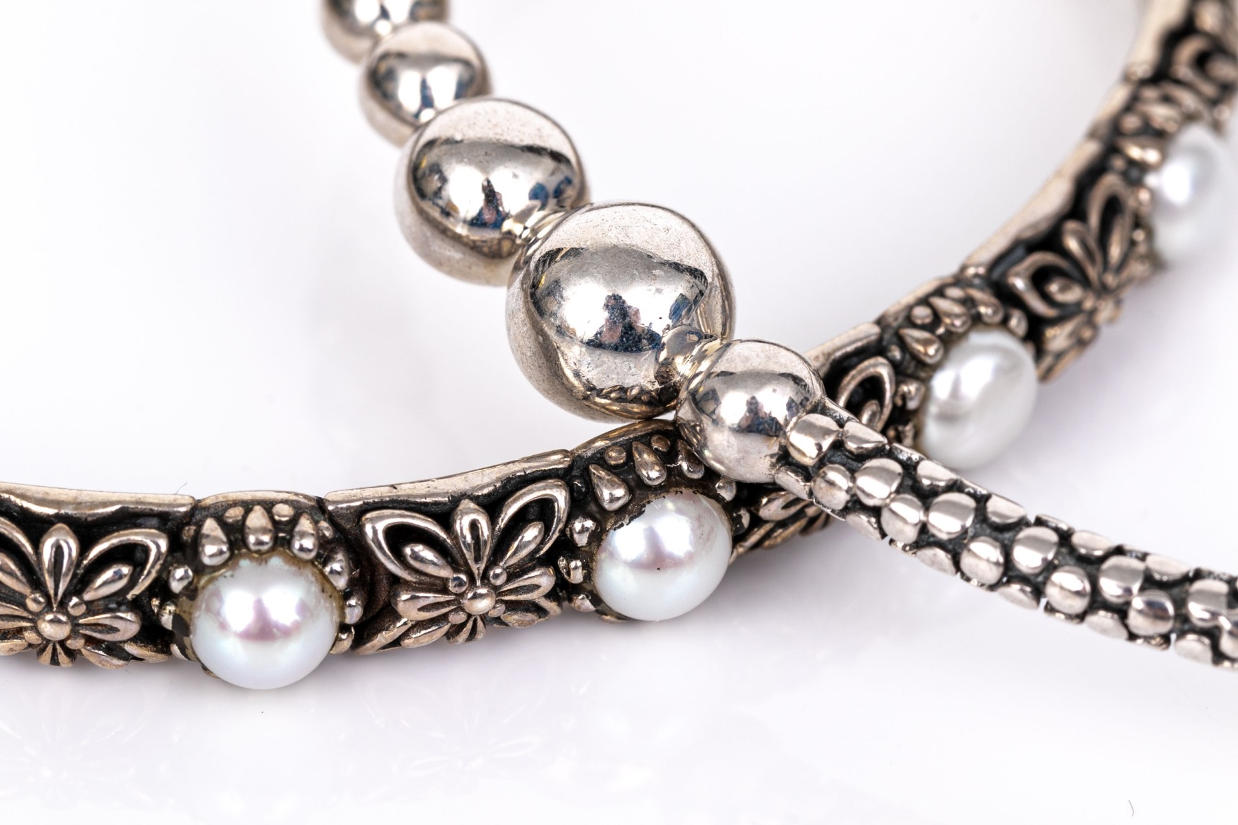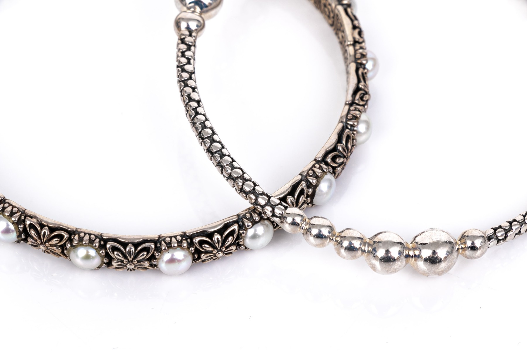 Michael Dawkins and Konstantino sterling silver pair of Balinese patterning slip on bangle bracelets, complementary styles