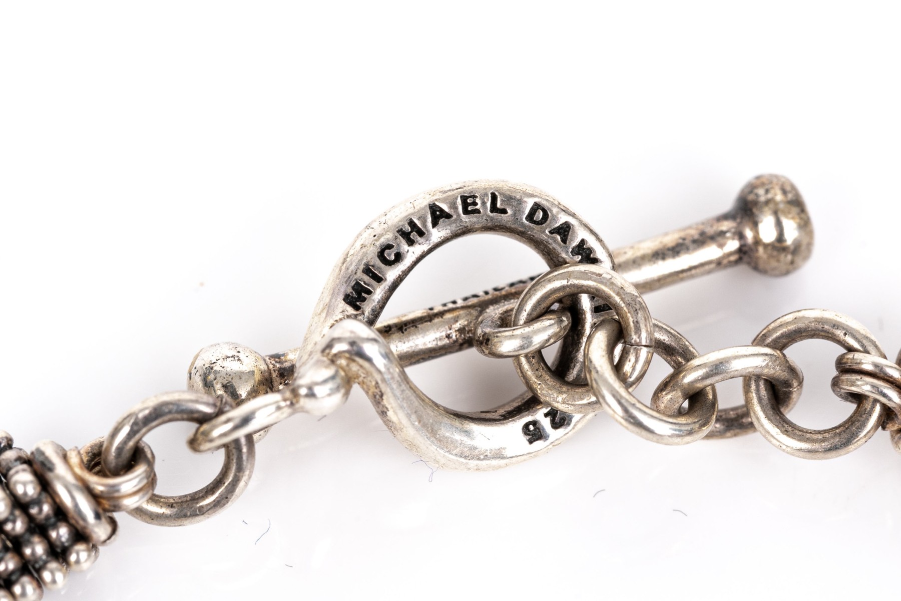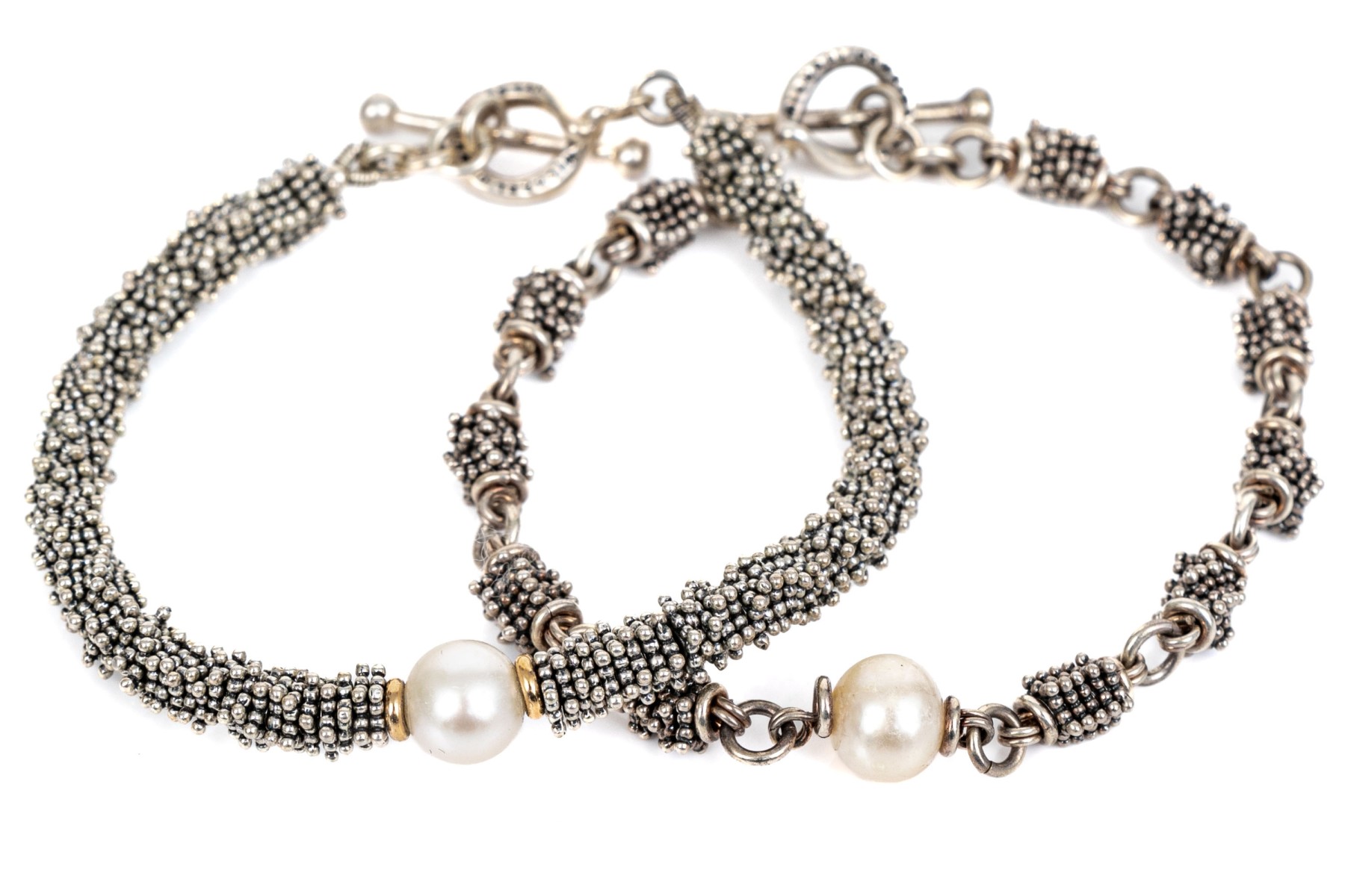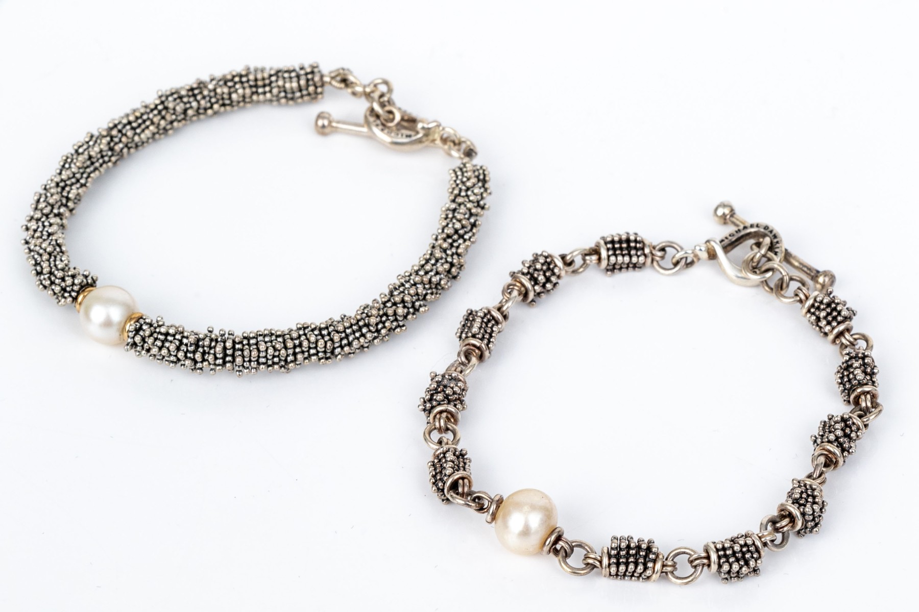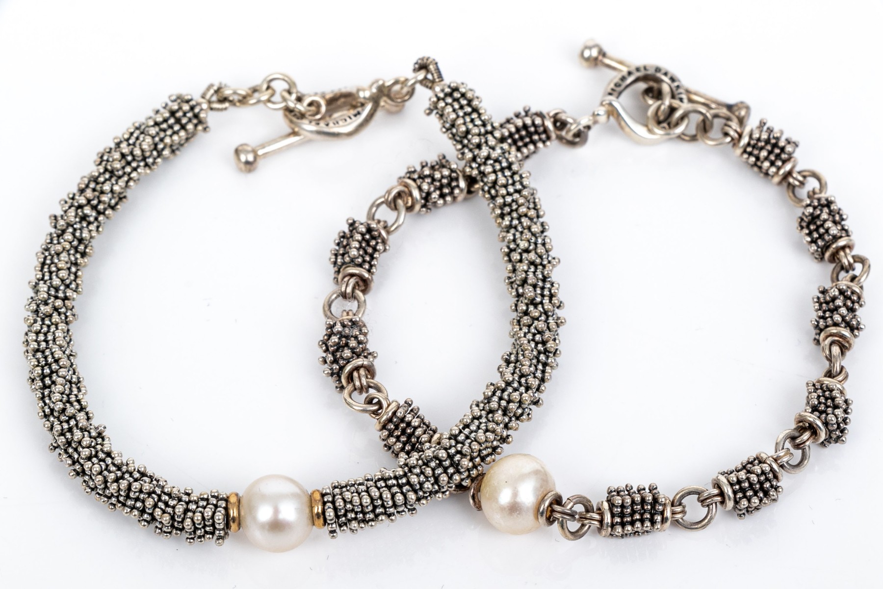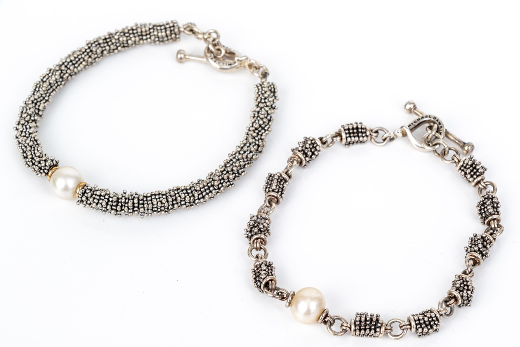 Michael Dawkins sterling silver fun complementary pair of stacked rondelle motif bracelets, finished with a toggle style clasps