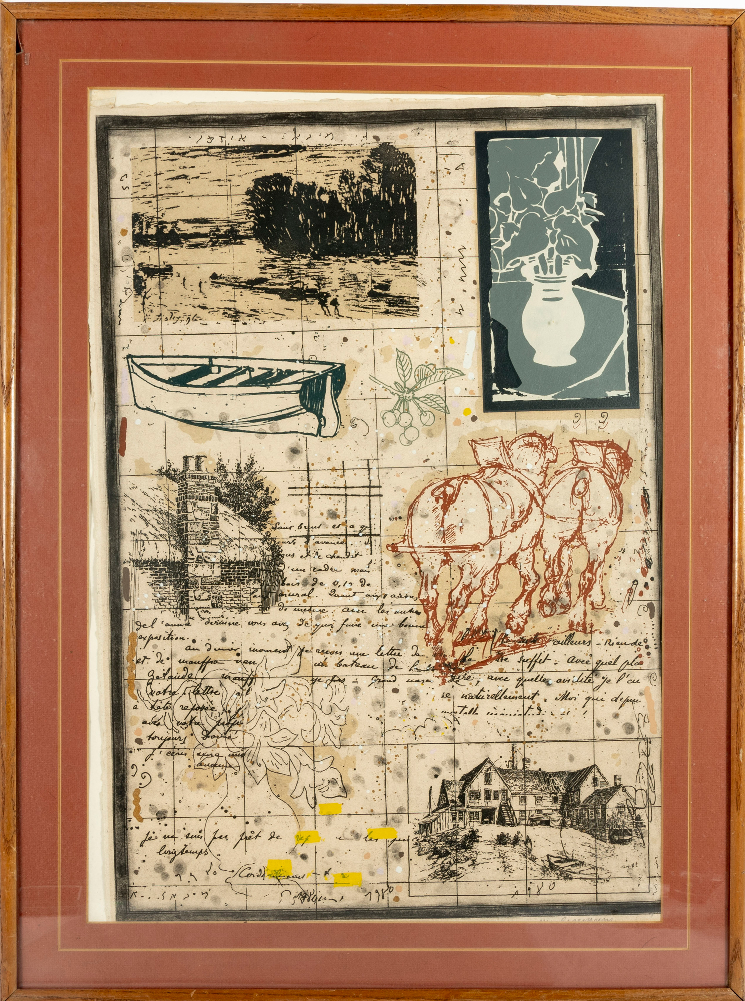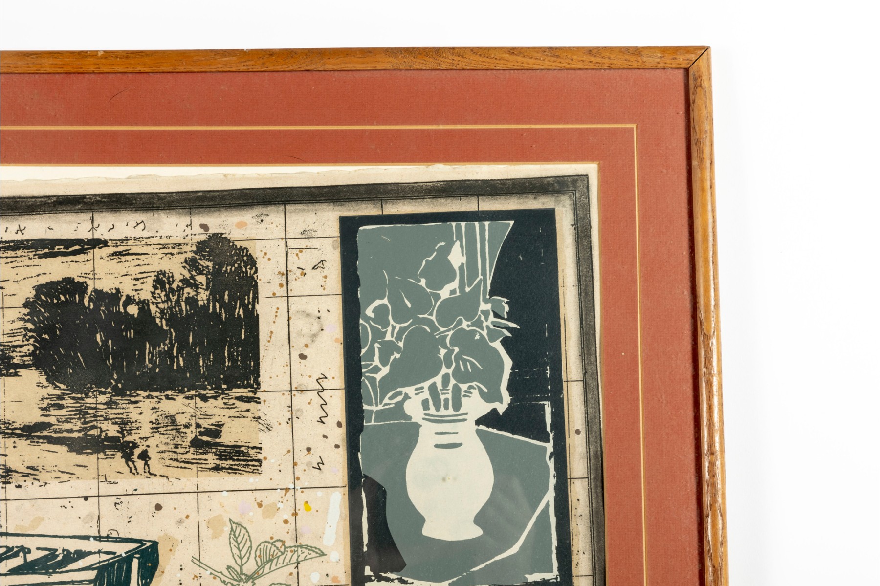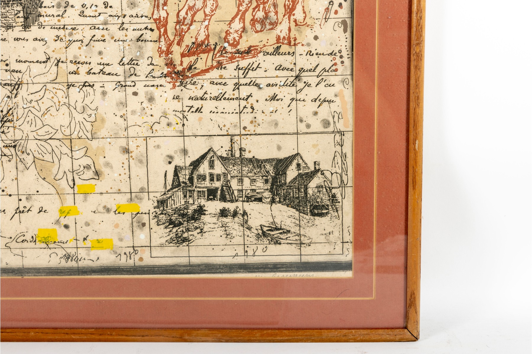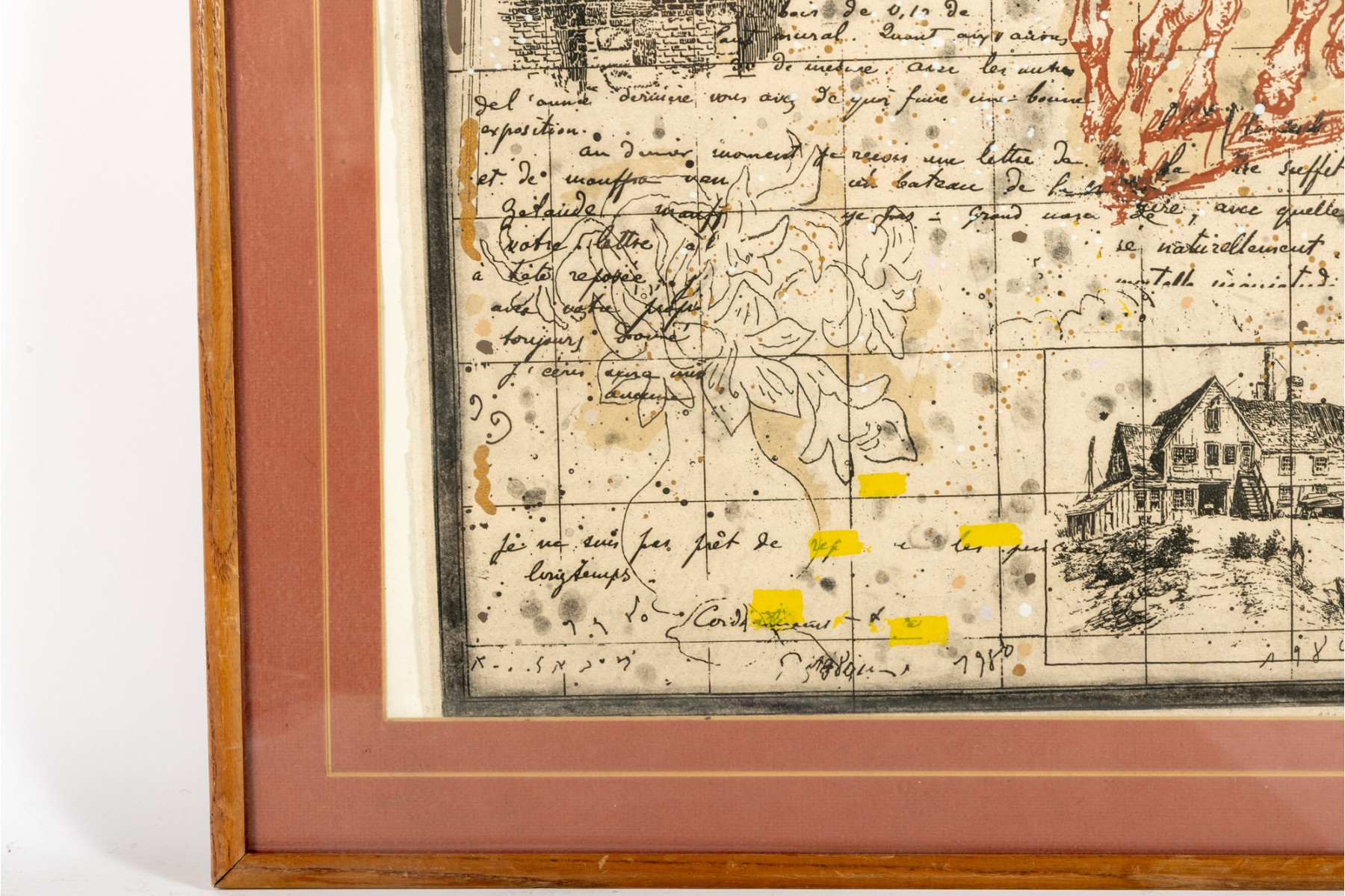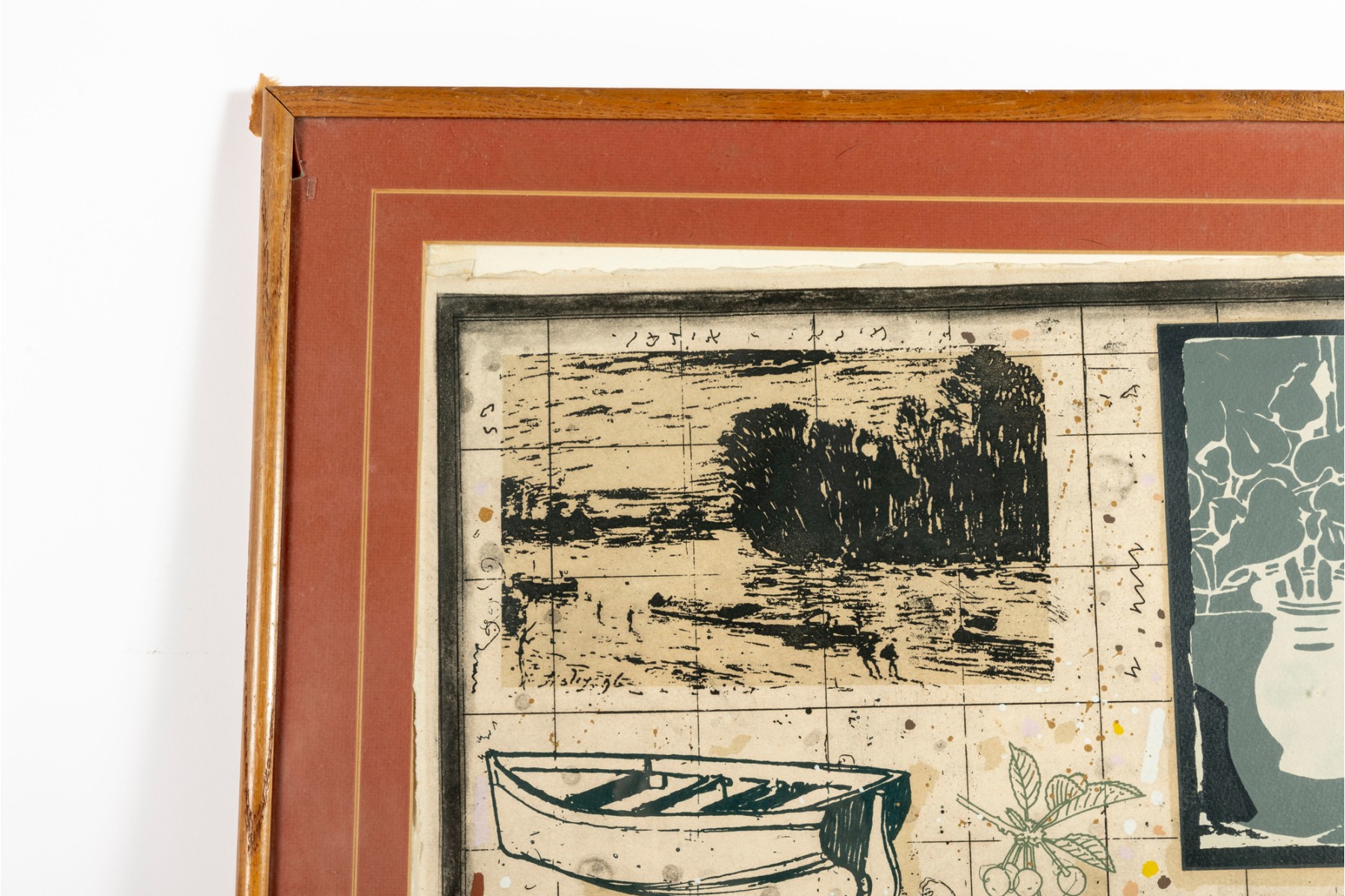 A lithograph print attributed to Jewish artist Michael Eizemann (Israel, B. 1934). Composed of sketched graphical collages, Micheal Eizemann's works have visual depth in simplicity, often blending handwriting with detailed illustrations. The painting is displayed in a simple wood frame faced with glass.