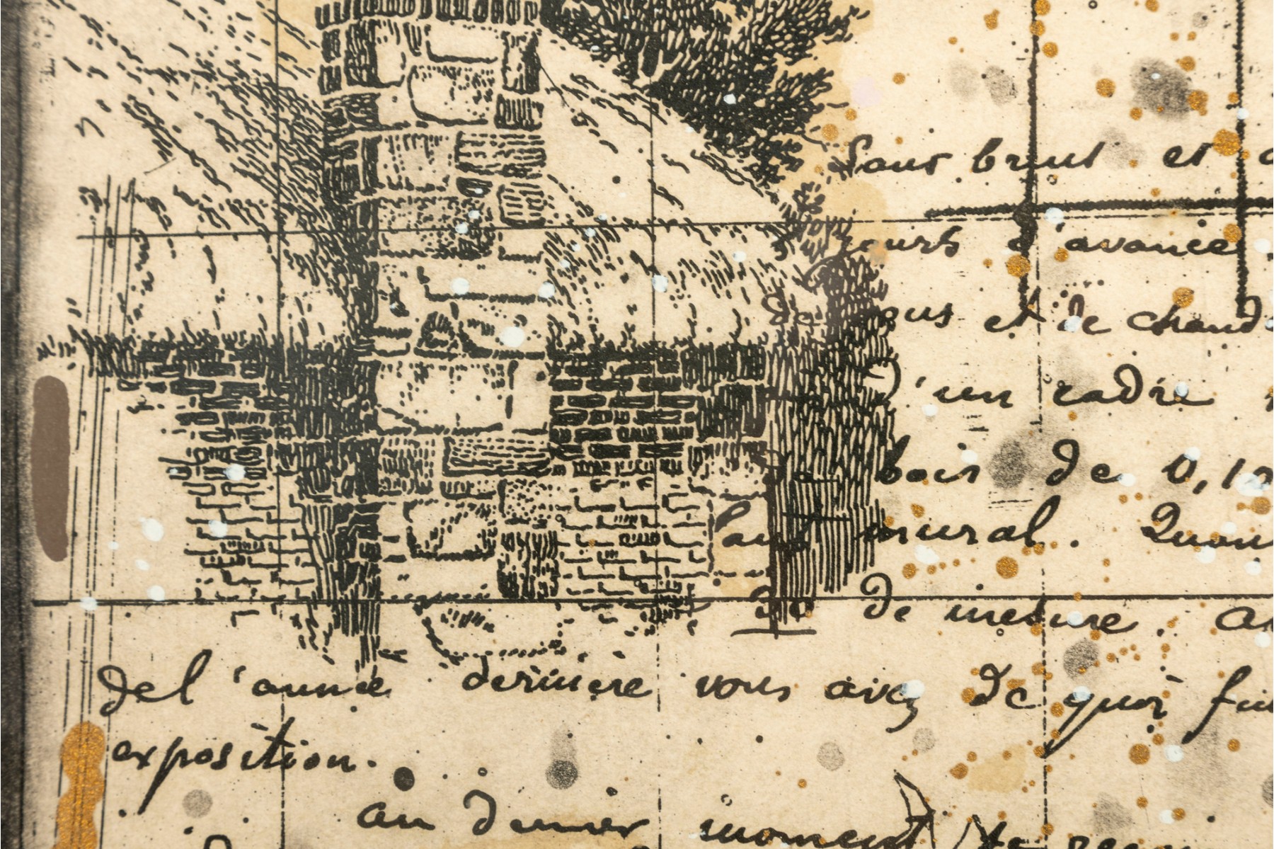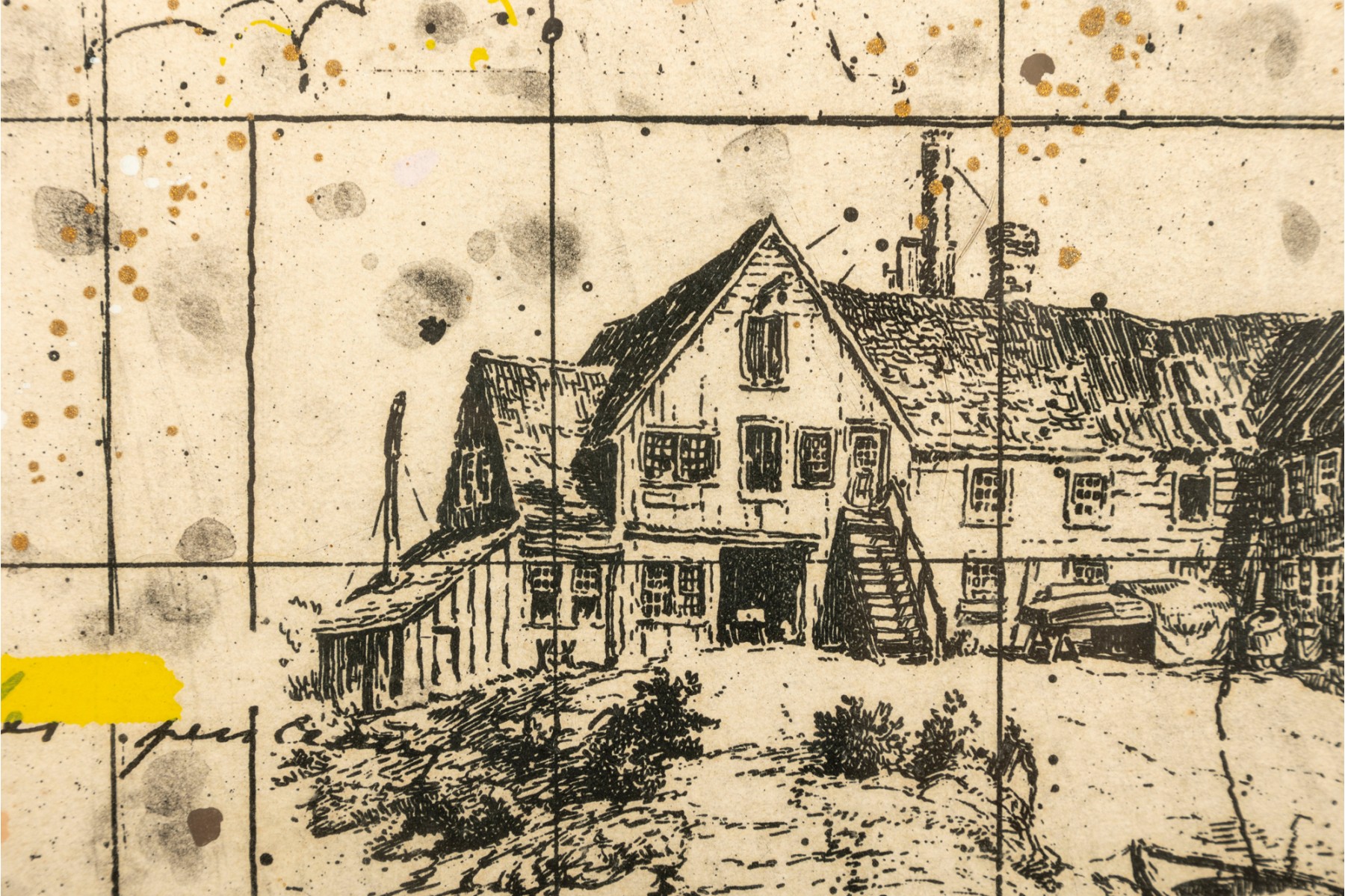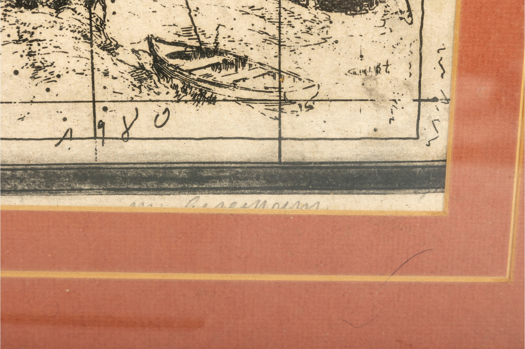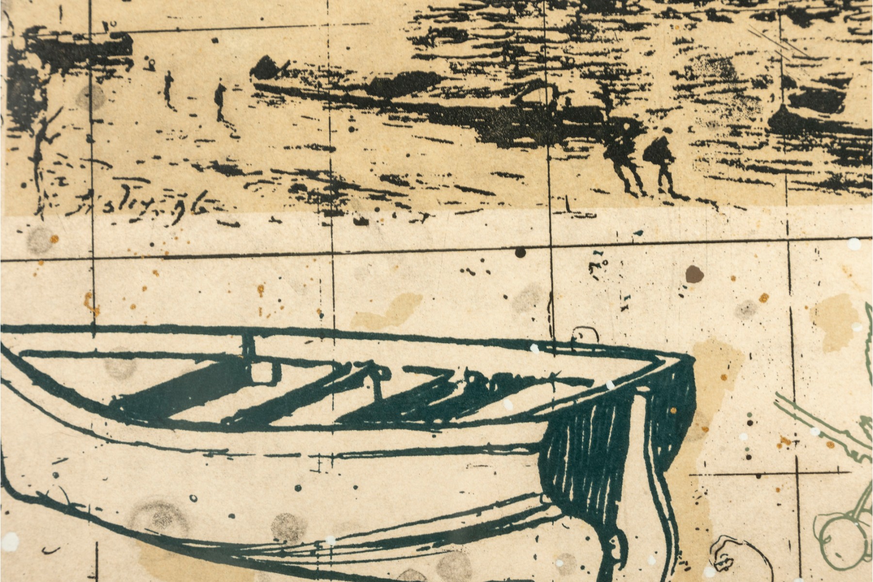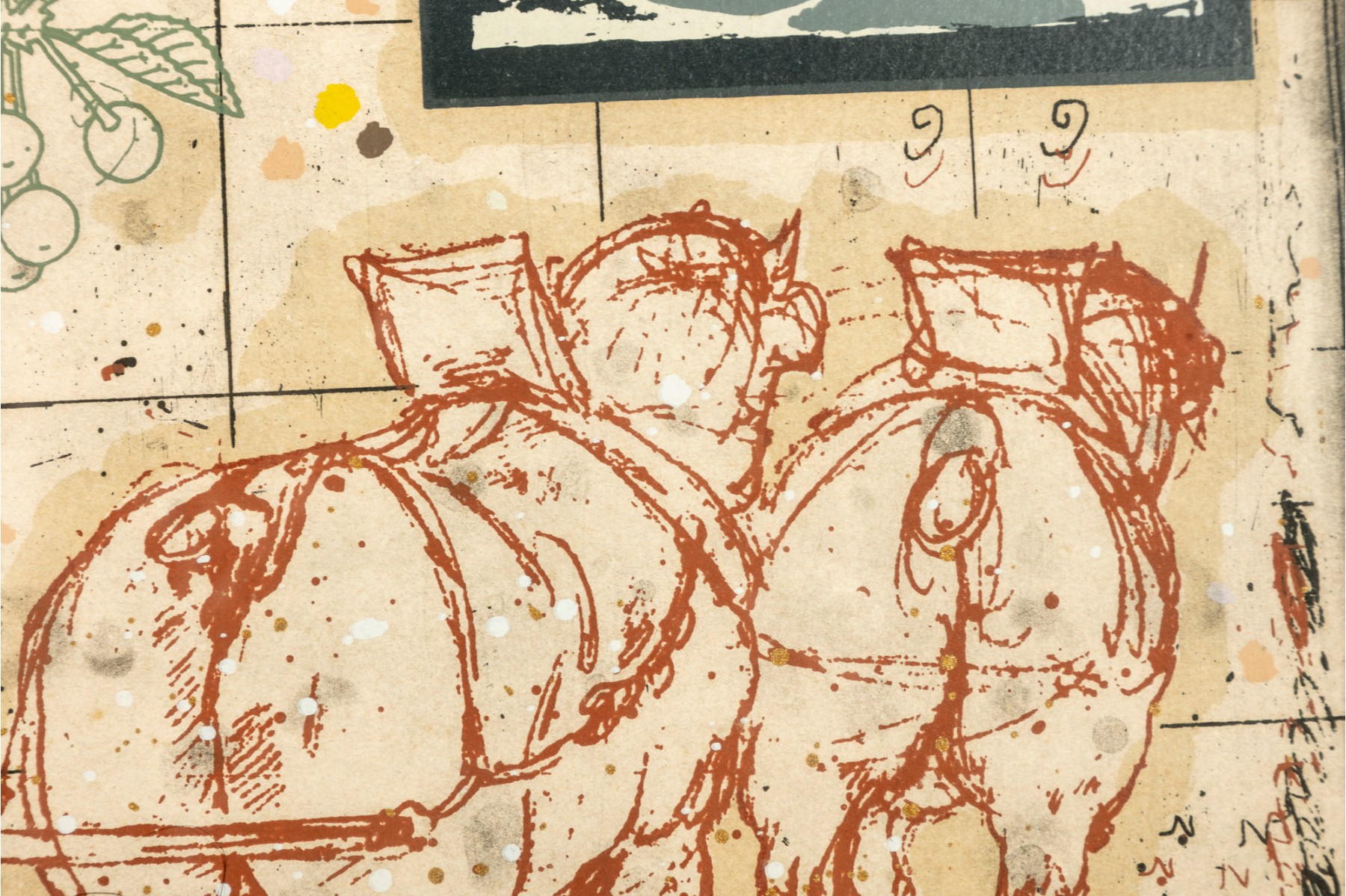 A lithograph print attributed to Jewish artist Michael Eizemann (Israel, B. 1934). Composed of sketched graphical collages, Micheal Eizemann's works have visual depth in simplicity, often blending handwriting with detailed illustrations. The painting is displayed in a simple wood frame faced with glass.