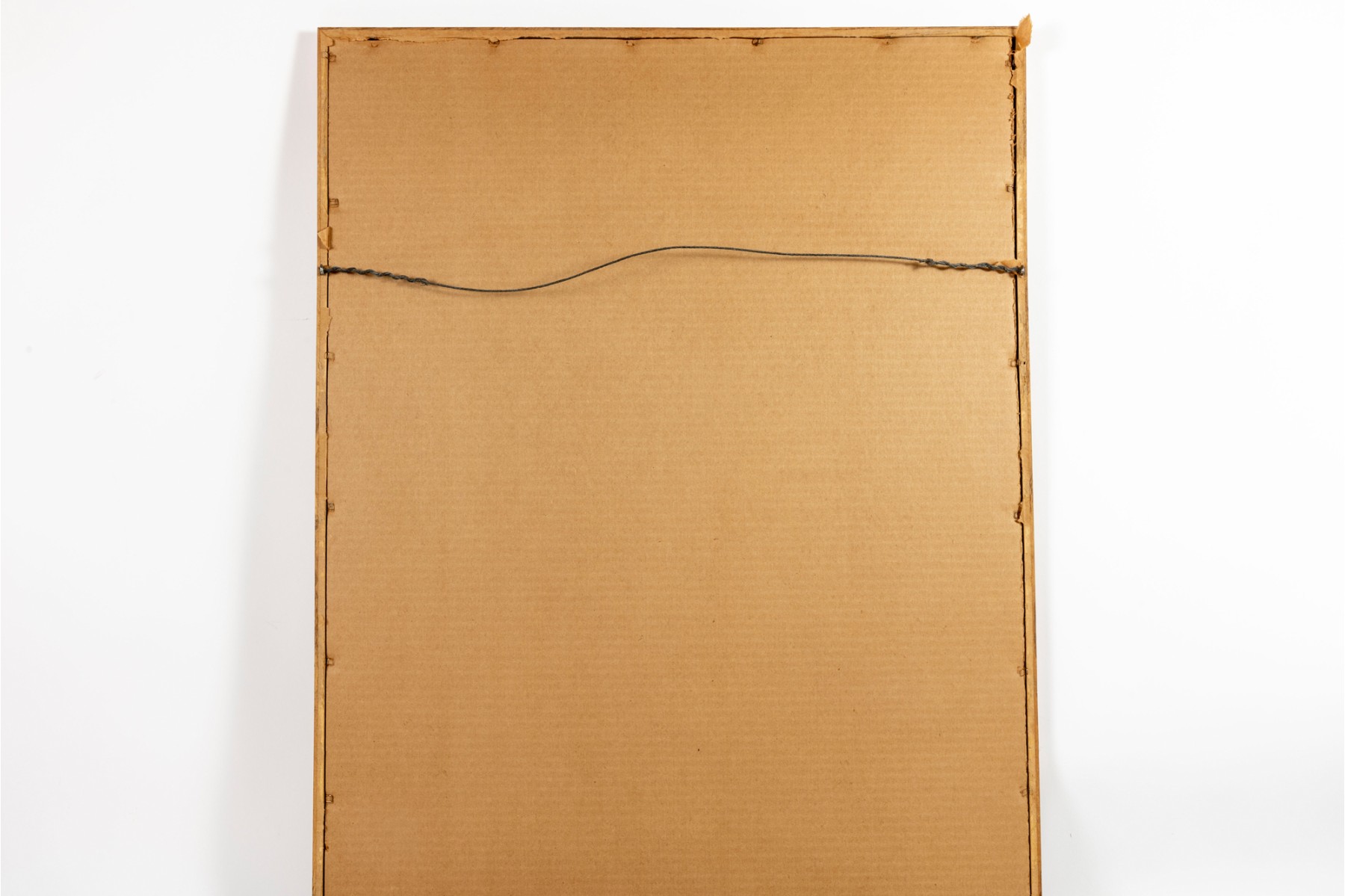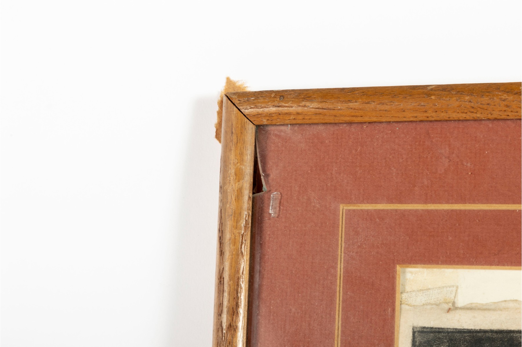 Glass is chipped to one edge. Frame is loose and presents excess wear. Print is in good condition.