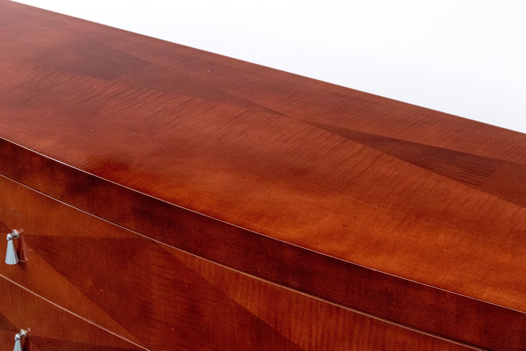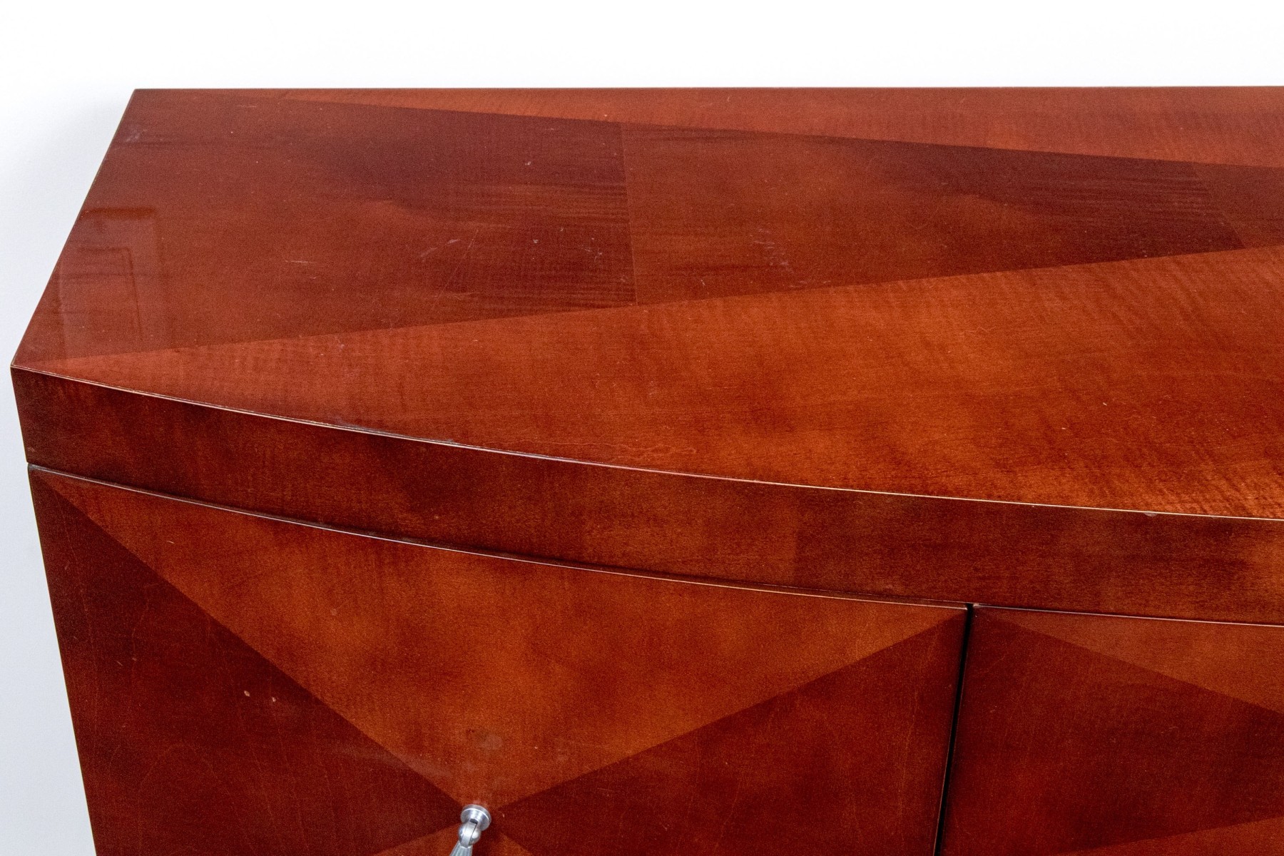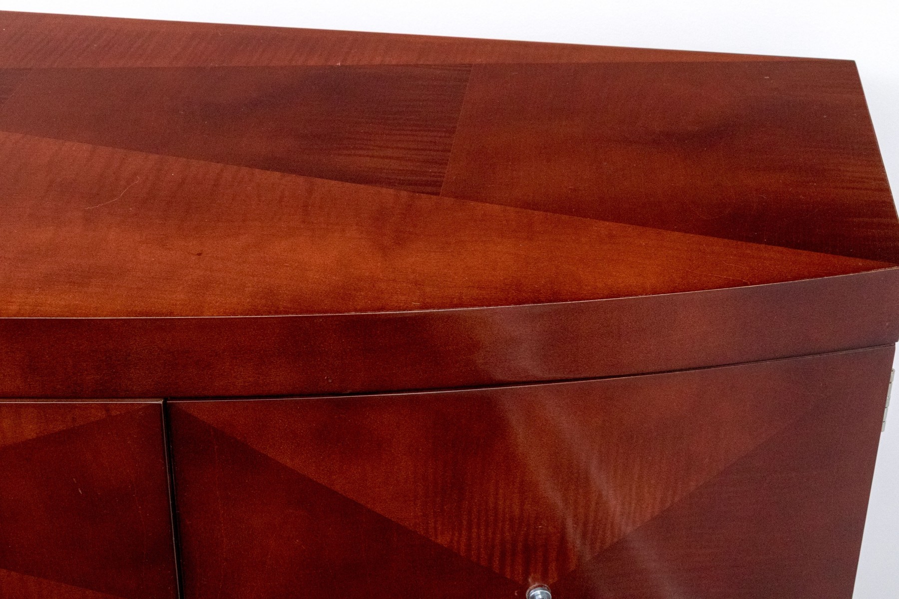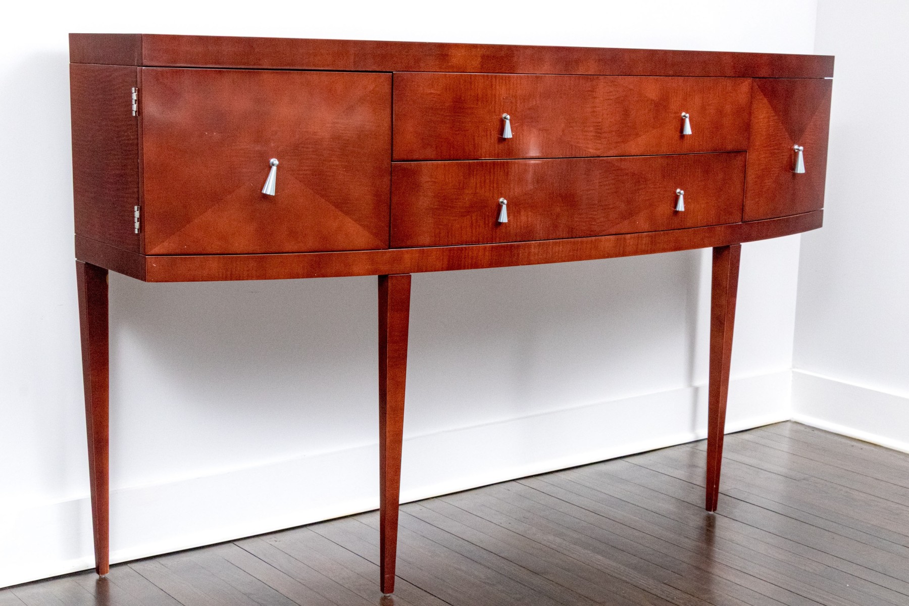 Designed in the early 1990's, the Baker furniture sideboard or credenza is constructed with woods including sycamore and features fabulous inlaid decoration. Drawers featuring nickel teardrop form pulls.