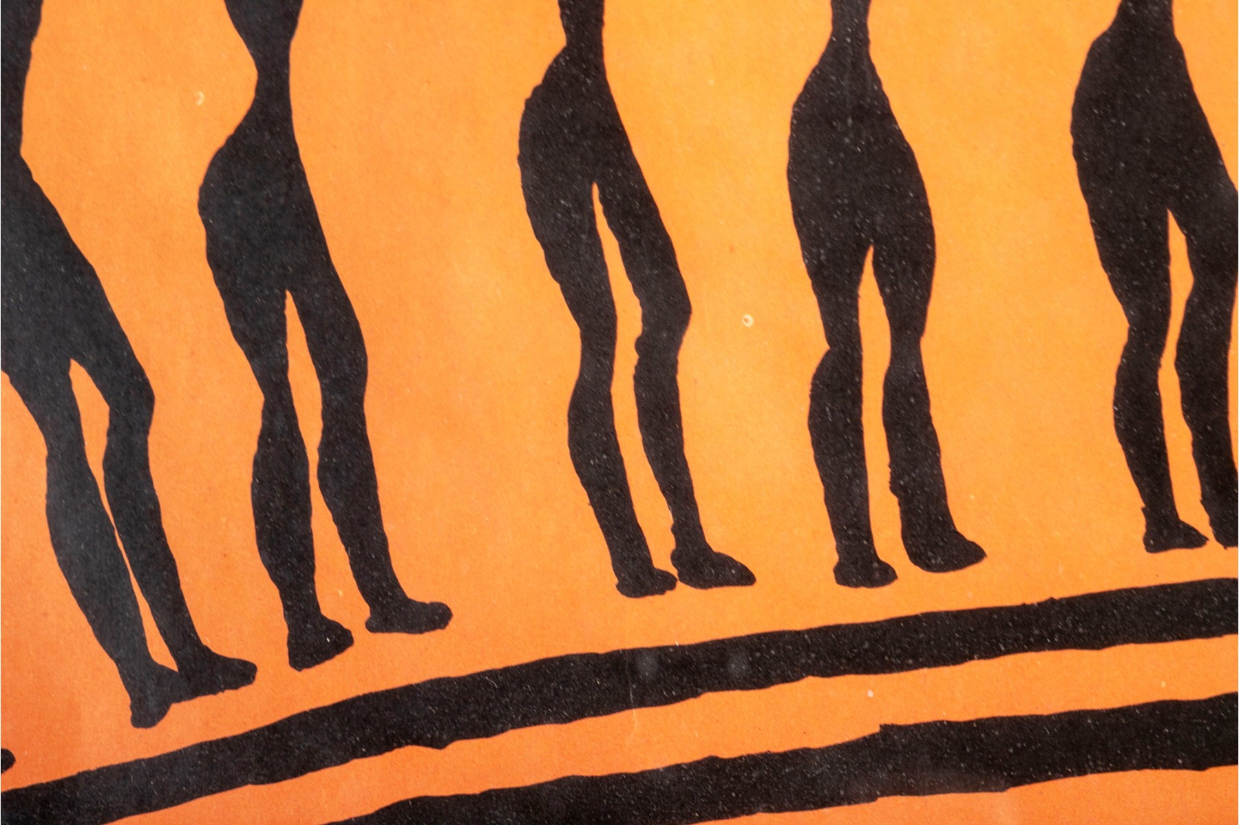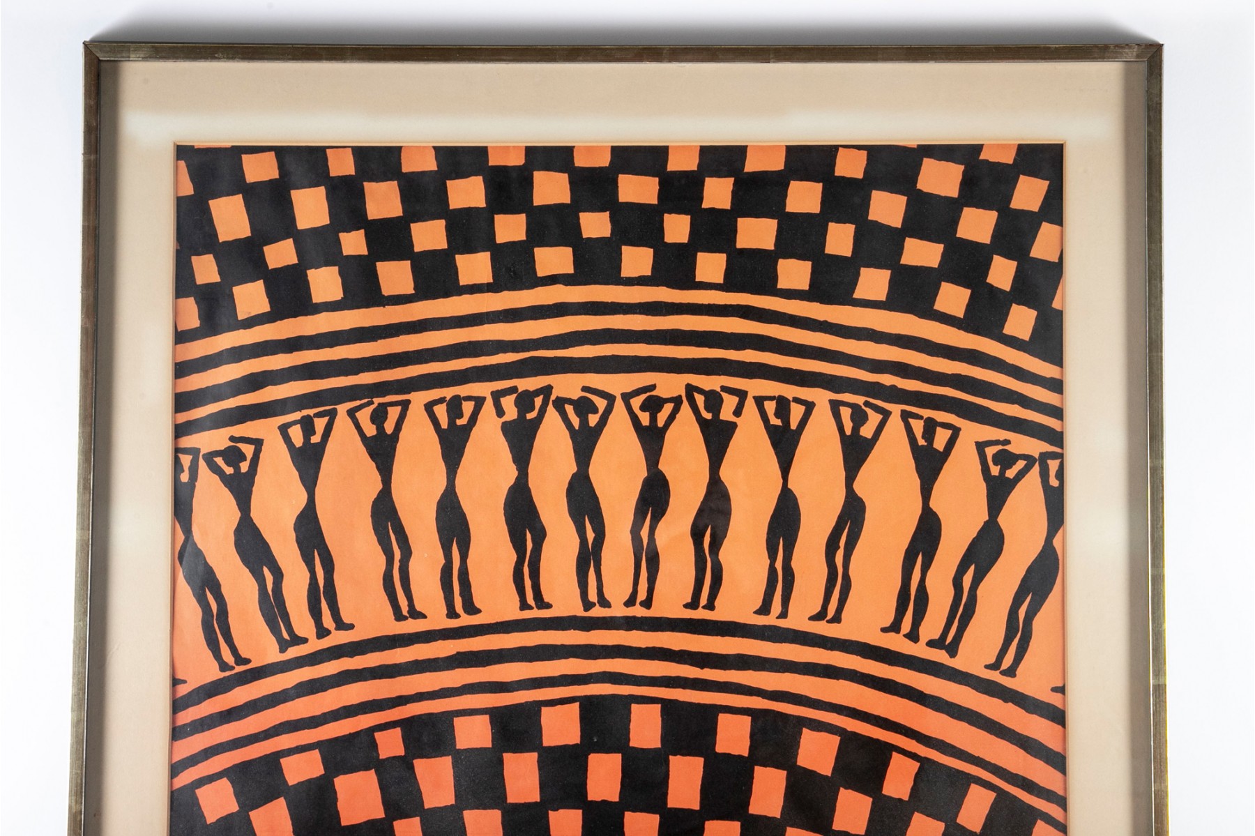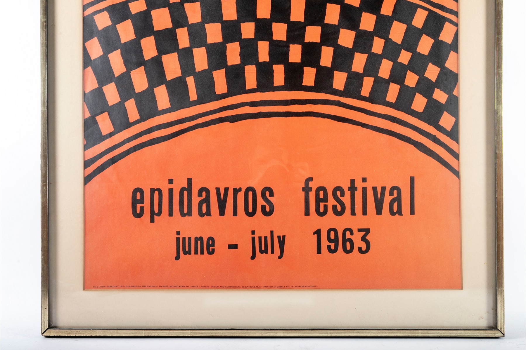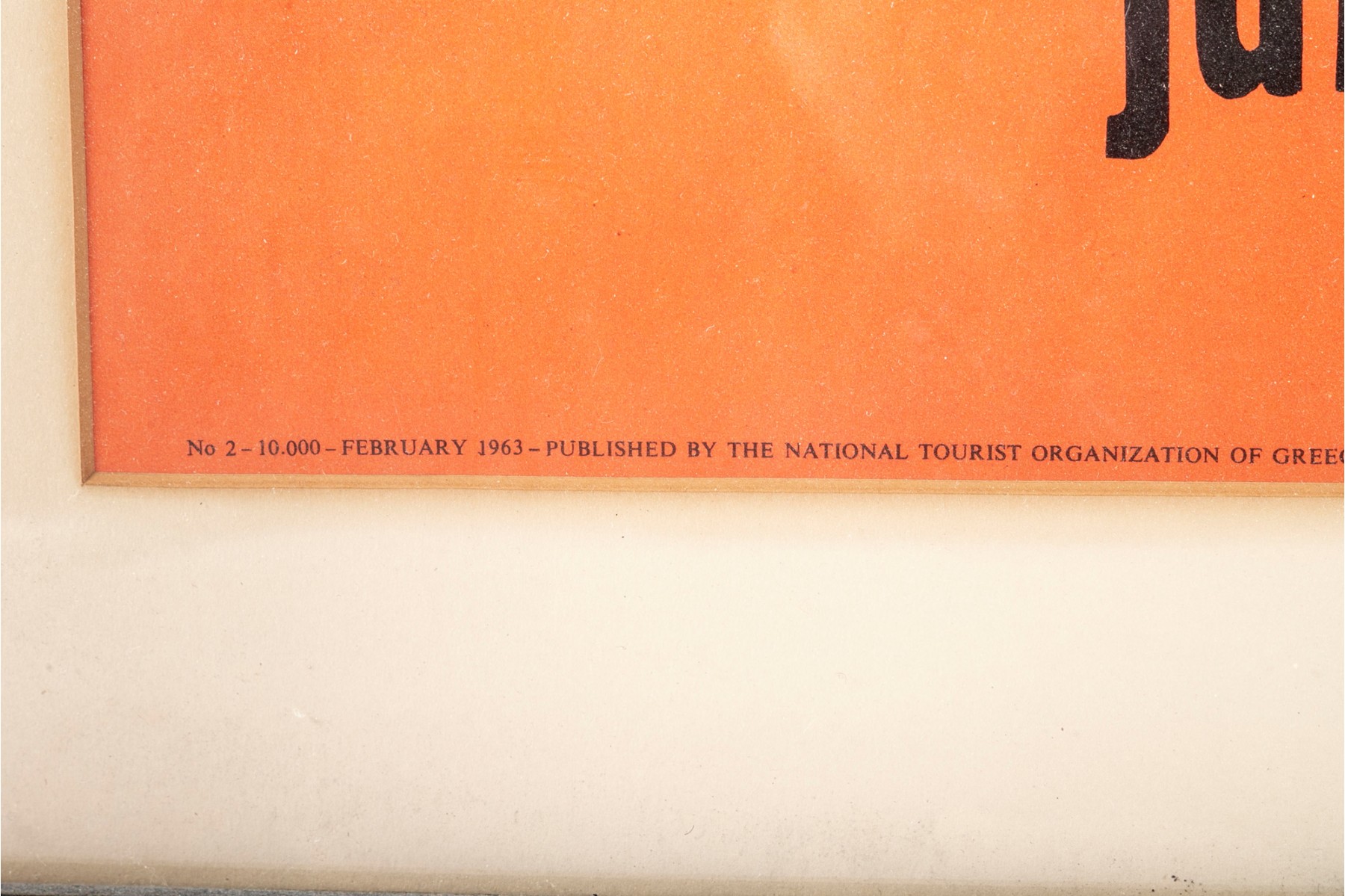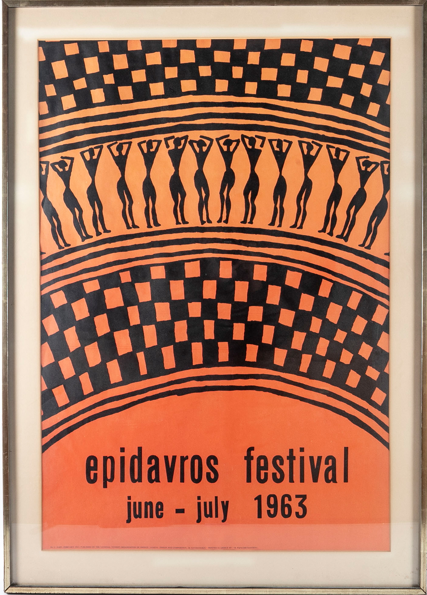 Michalis Katzourakis (Greek, b. 1933) large lithographic poster for the Epidaurus (Athens) Festival, which ran from June to July, 1963. Displays an eye-catching ombre of tangerine orange to darker coral orange, with high-contrasting borders of black checkerboards and stripes flanking a lineup of figures. Text at the lower left reads "No. 2-10.000-February 1963-published by the national tourist organization of Greece-Athens-design and composition: M Katzourakis-printed in Greece by 'B Pachrysanthou.'" Displayed behind glass with a white mat in a gilt and black frame.