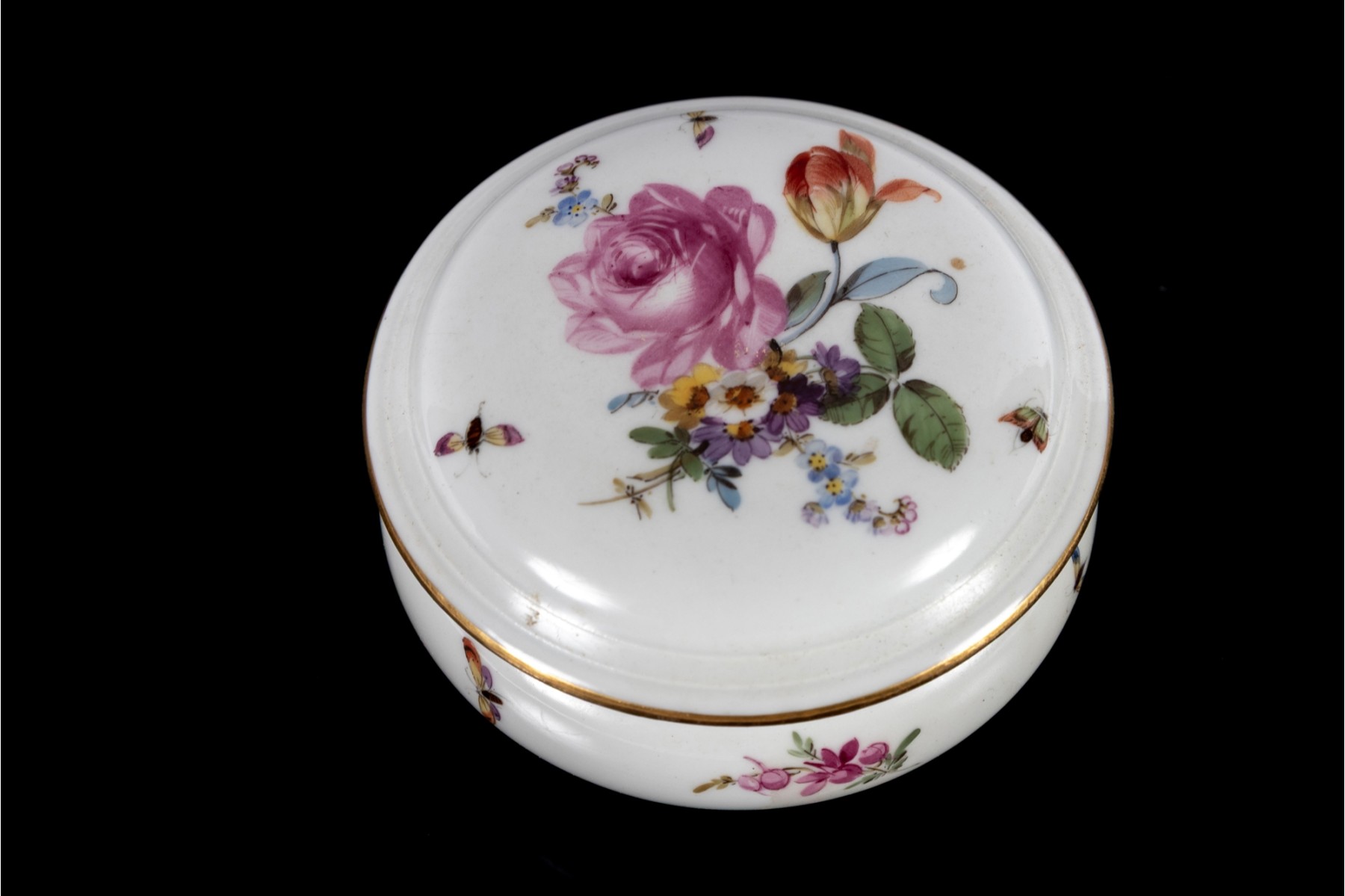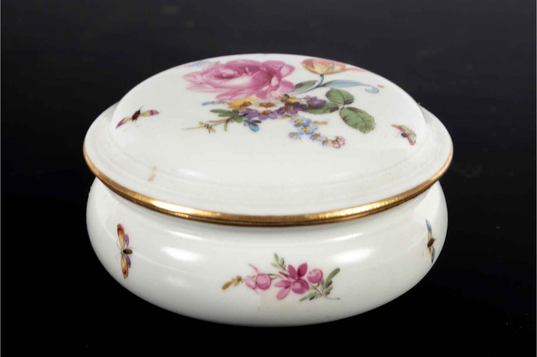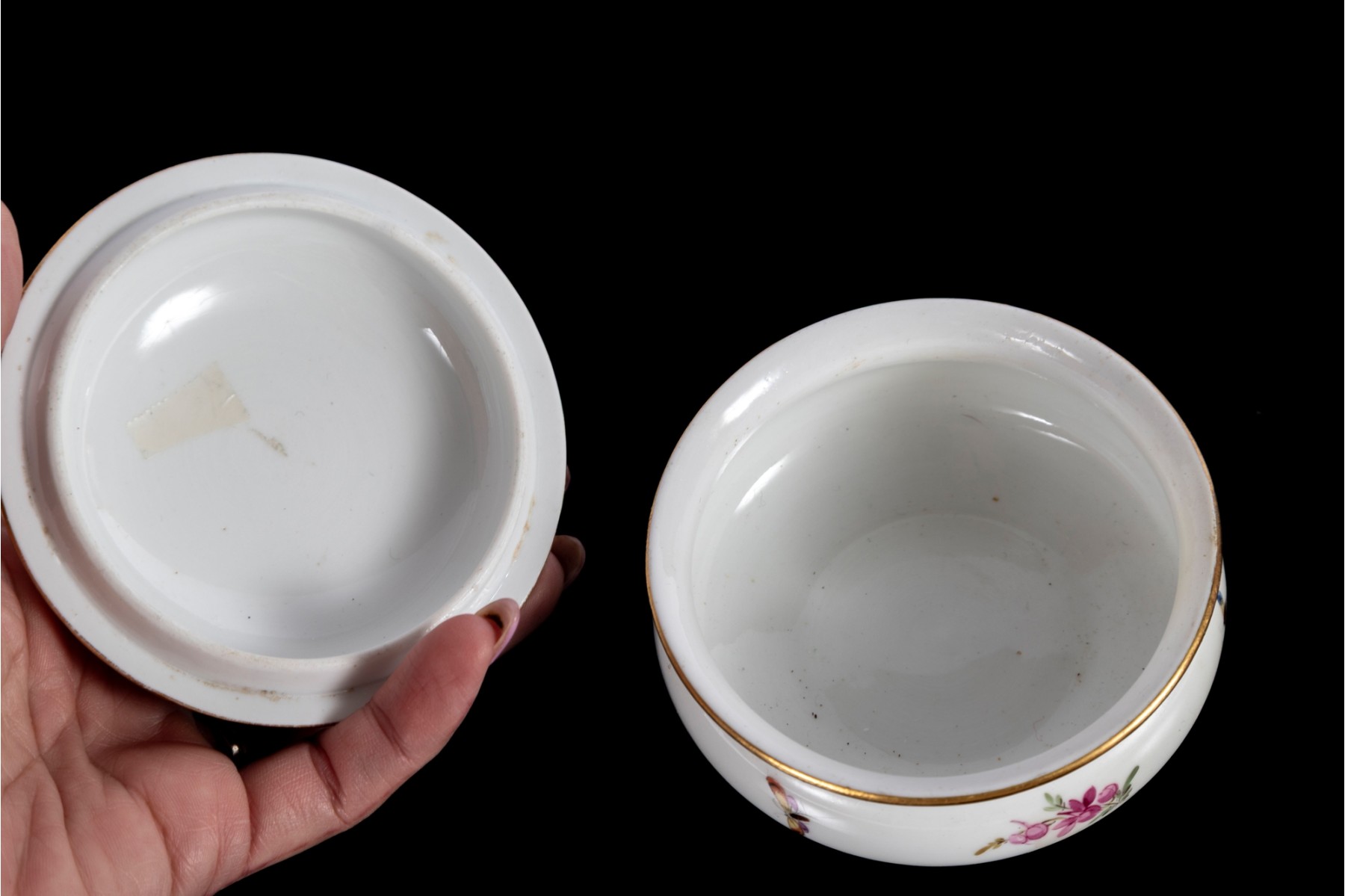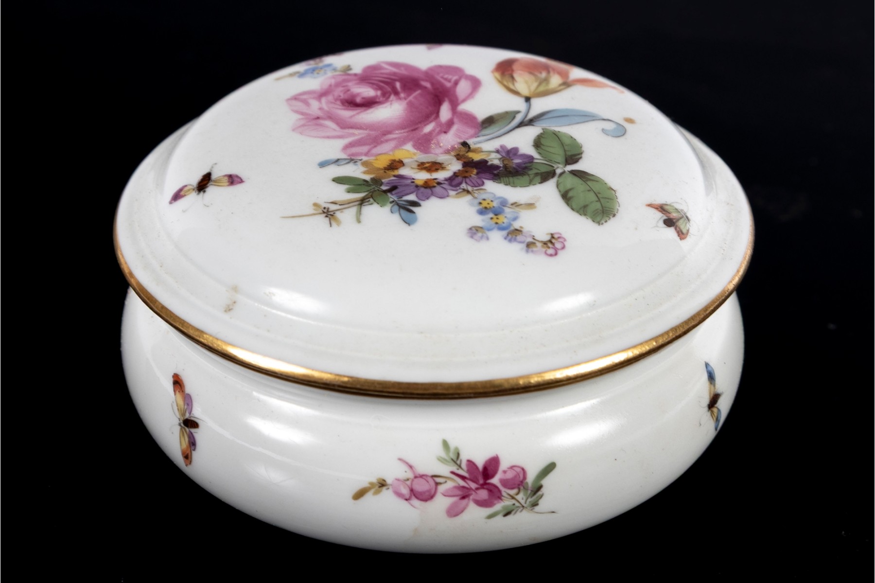 A delicate Meissen porcelain trinket box — mid-19th century, featuring finely hand-painted florals and butterflies in vibrant polychrome enamels.