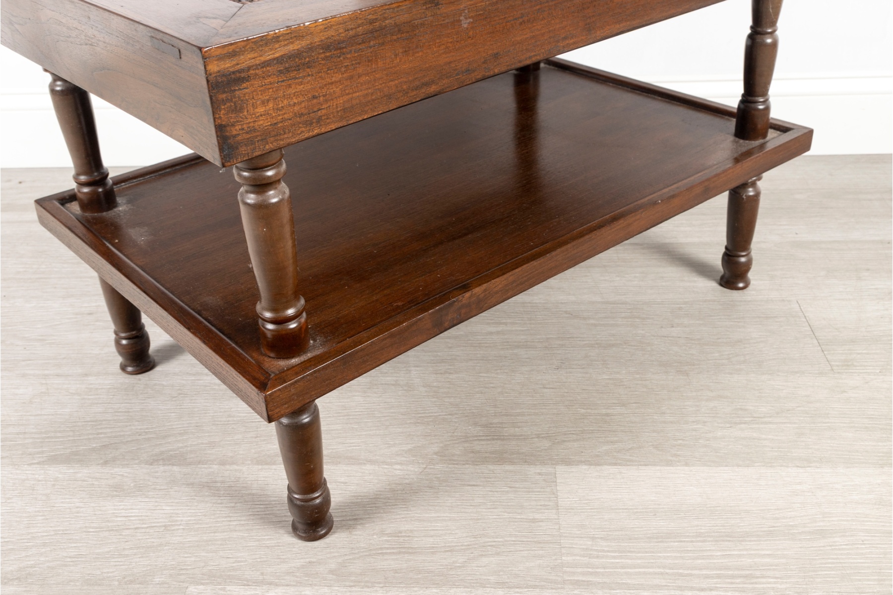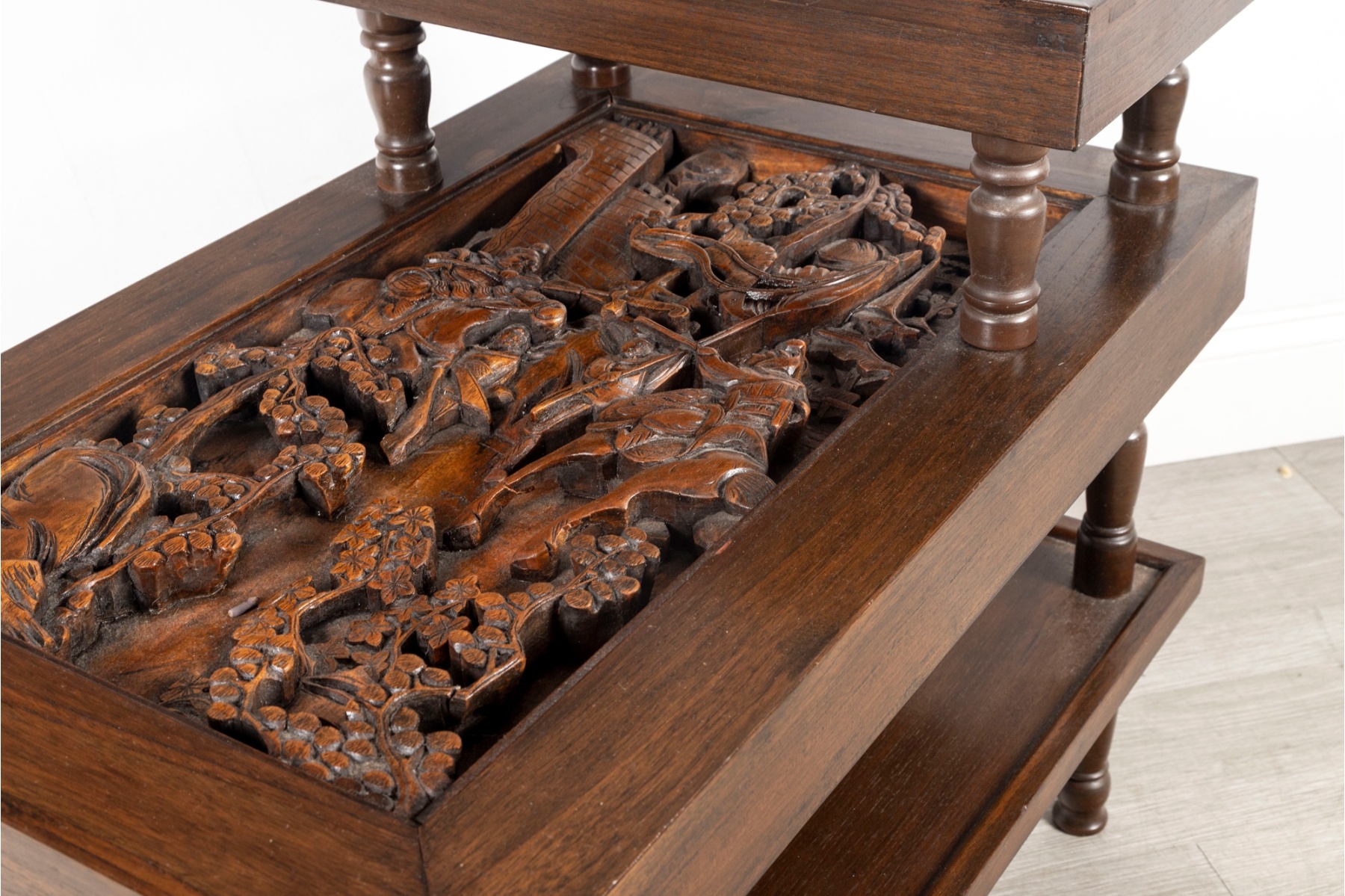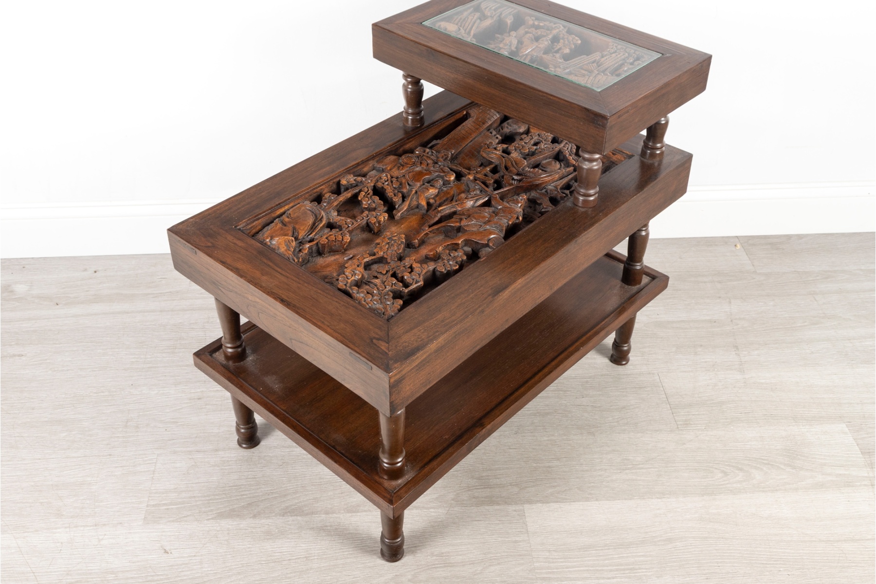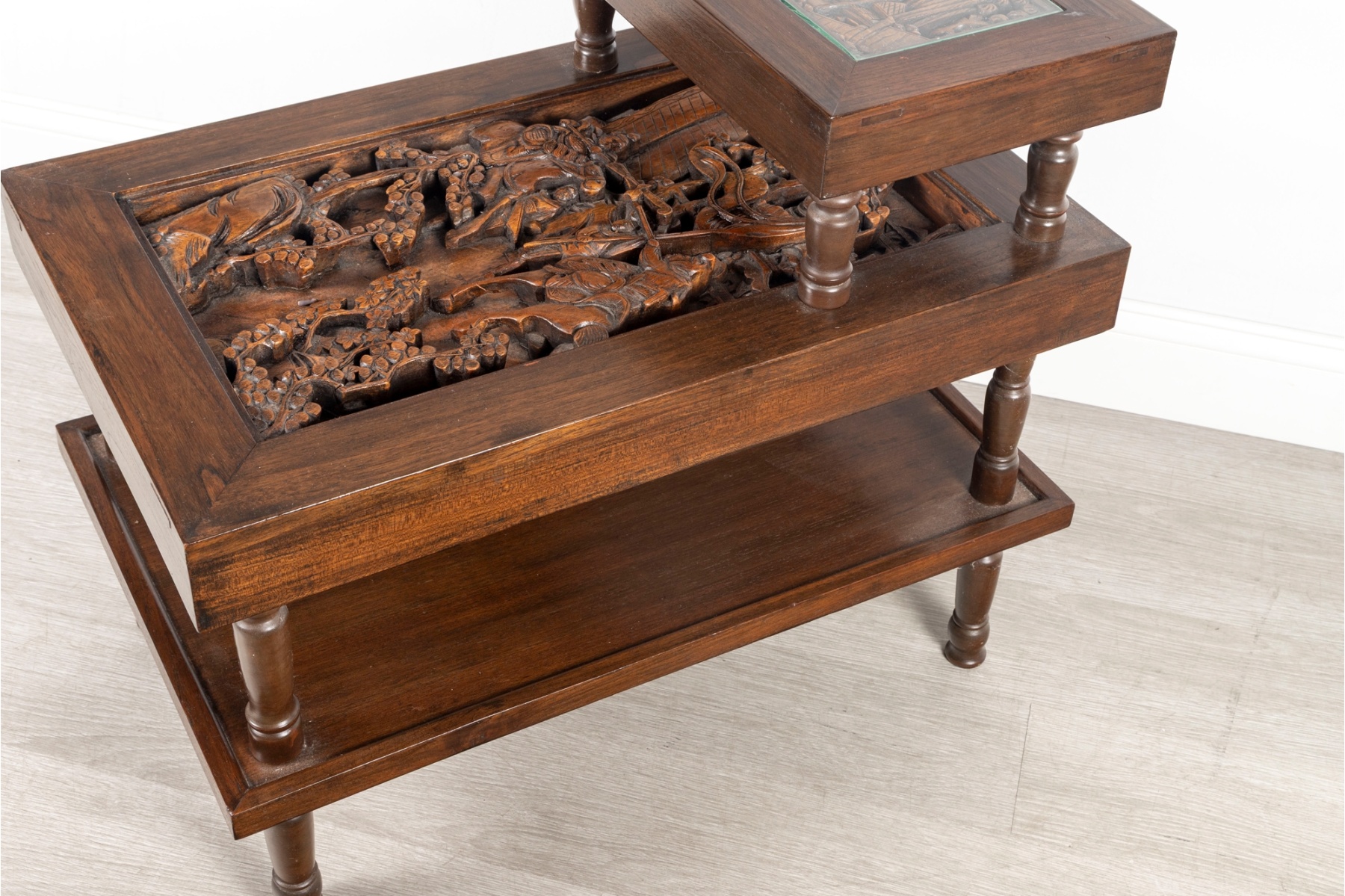 A finely crafted Chinese hardwood side table featuring two tiers with intricate hand-carved figural and floral panels framed in dark stained wood. The upper tier includes a glass-protected relief carving, while the lower showcases an openwork scene duelists in a garden setting.