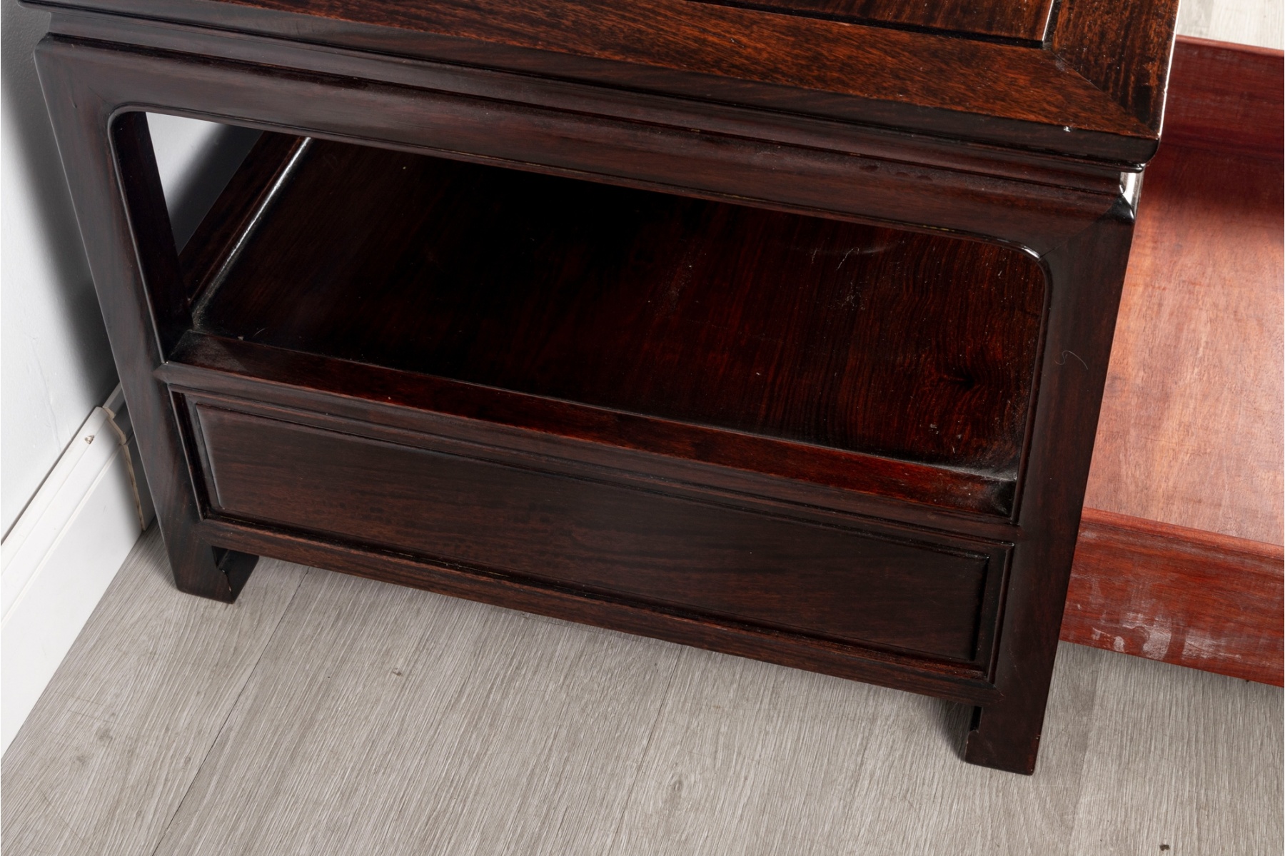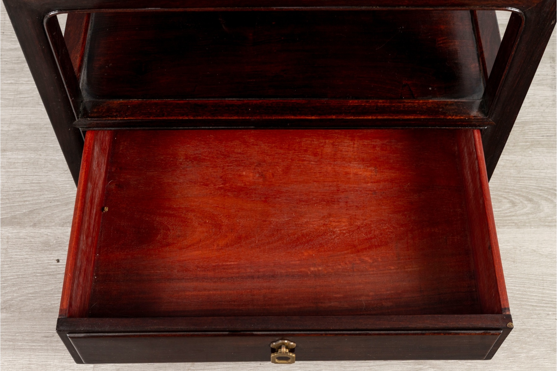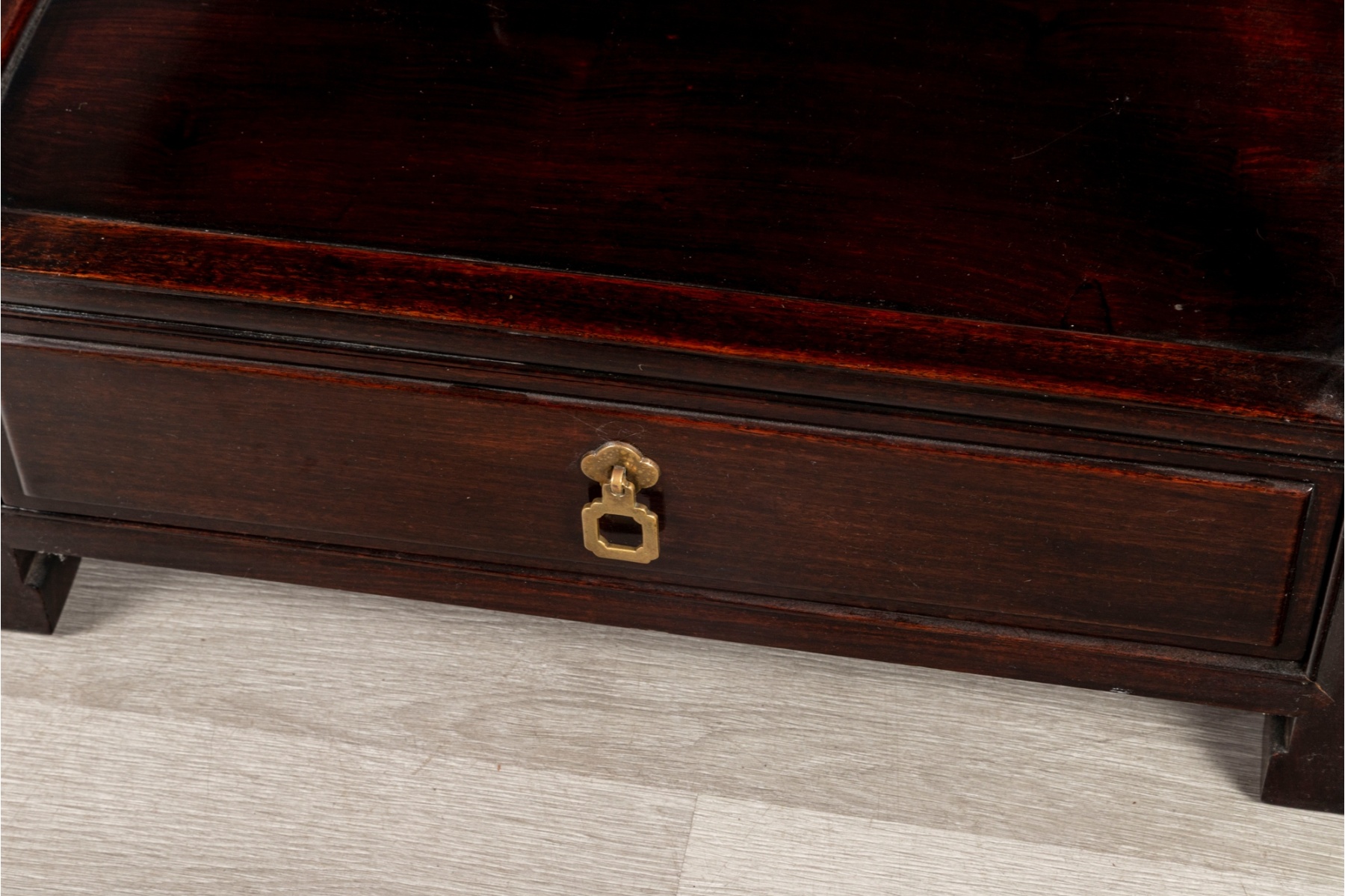 A handsome second half 20th century Chinese table designed with clean lines and subtle Ming-inspired details such as the rounded corners and recessed apron. Below is a bottom display shelf and a bottom drawer.