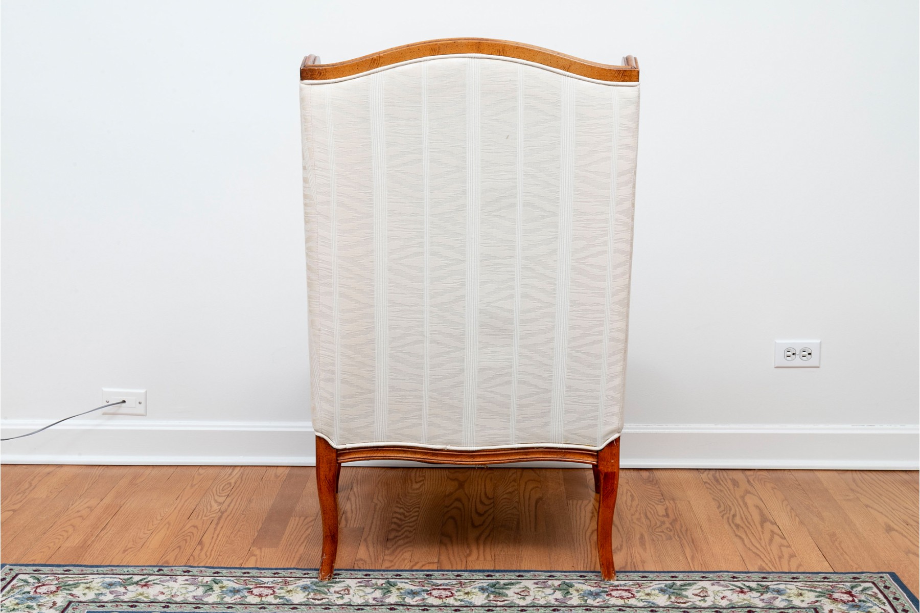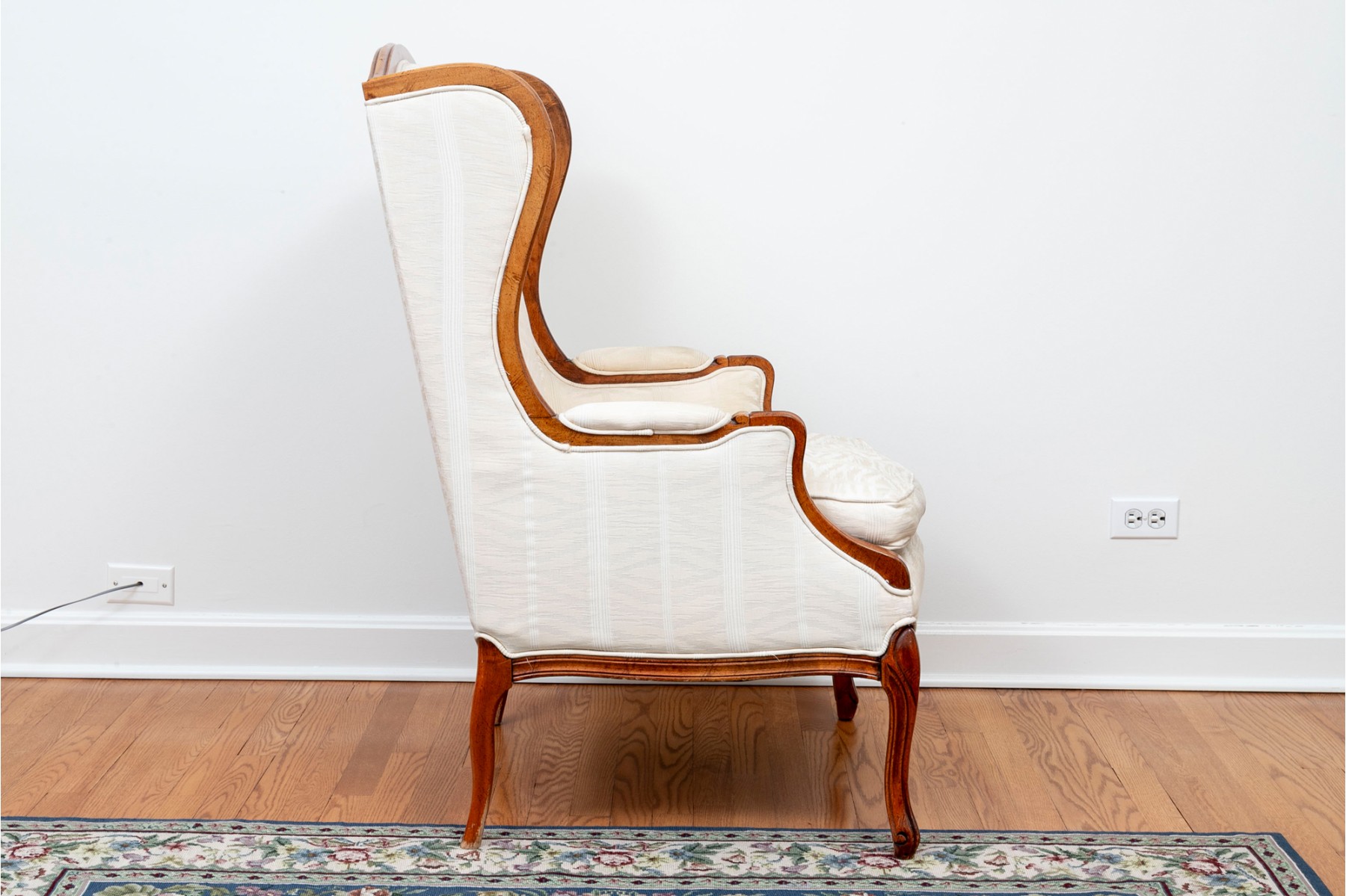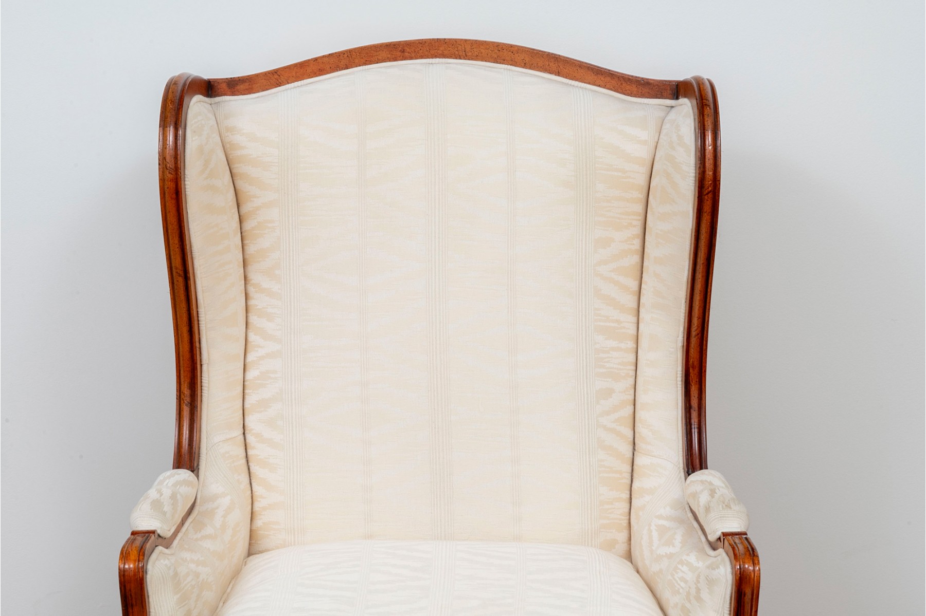 A handsome wingback chair having a stained fruitwood frame. The whole upholstered in an ivory fabric, fitted with a loose down-filled seat cushion.