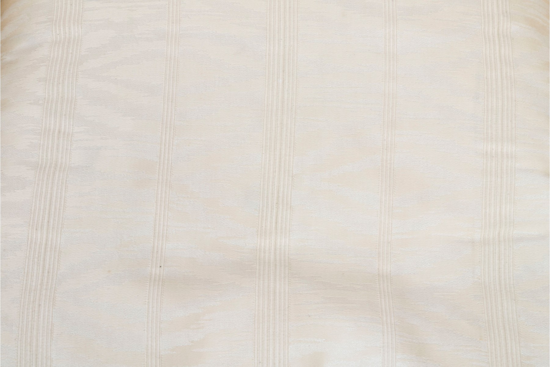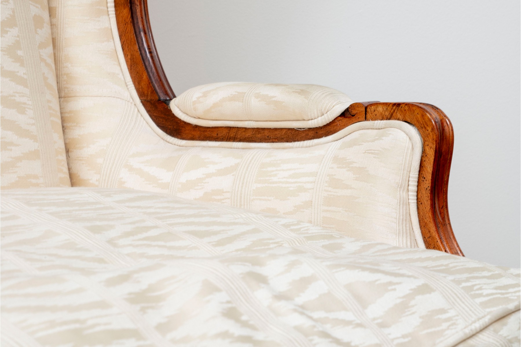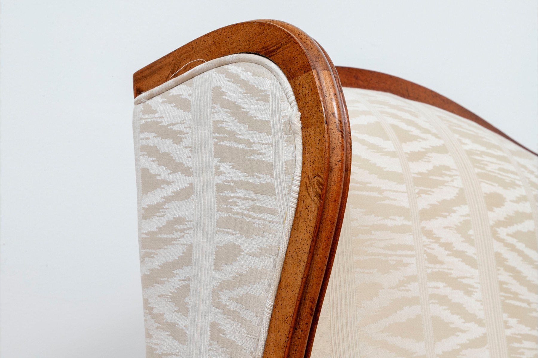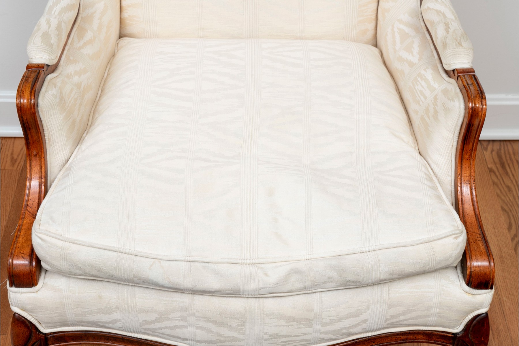 A handsome wingback chair having a stained fruitwood frame. The whole upholstered in an ivory fabric, fitted with a loose down-filled seat cushion.