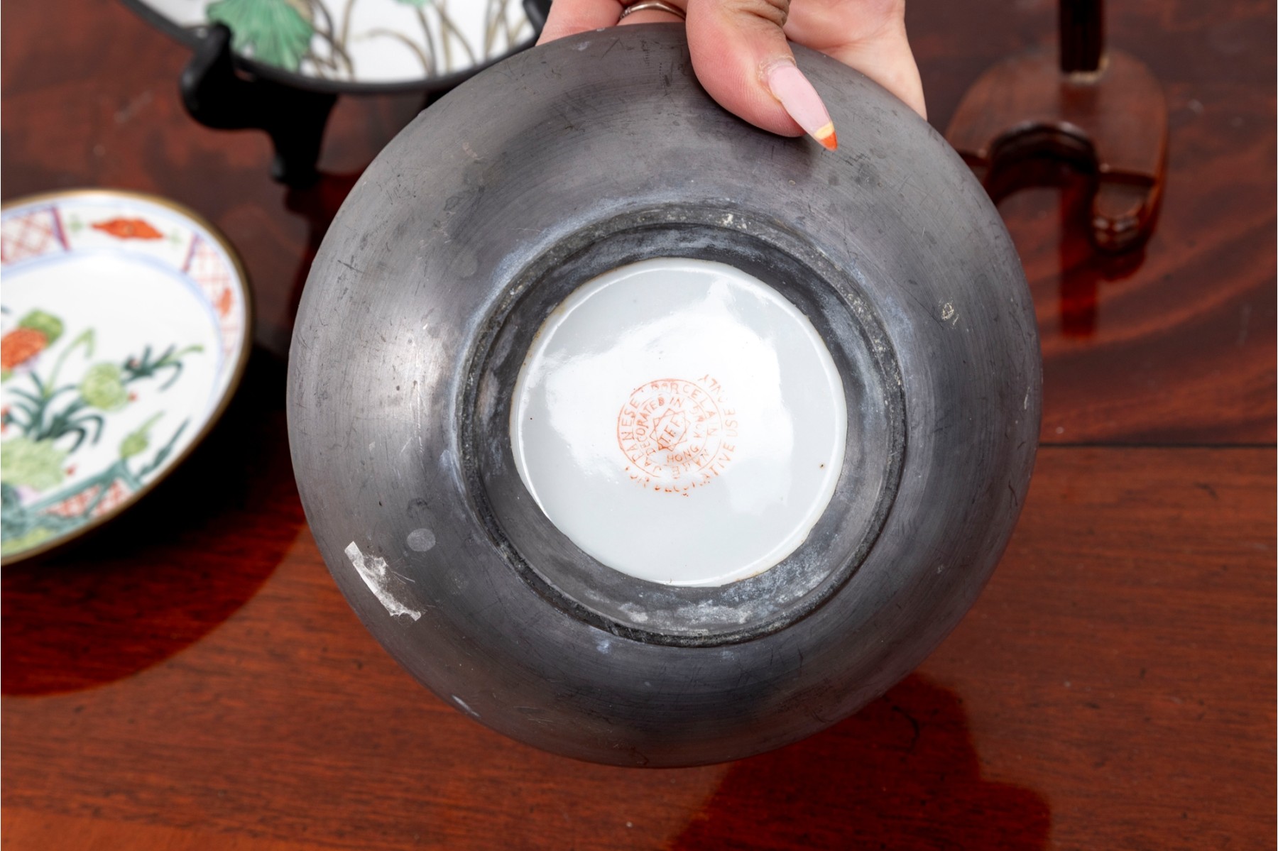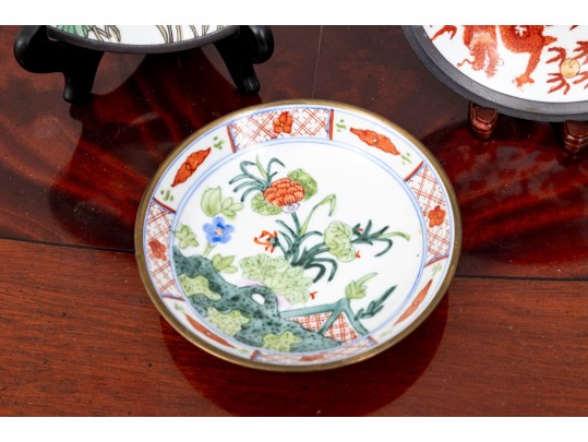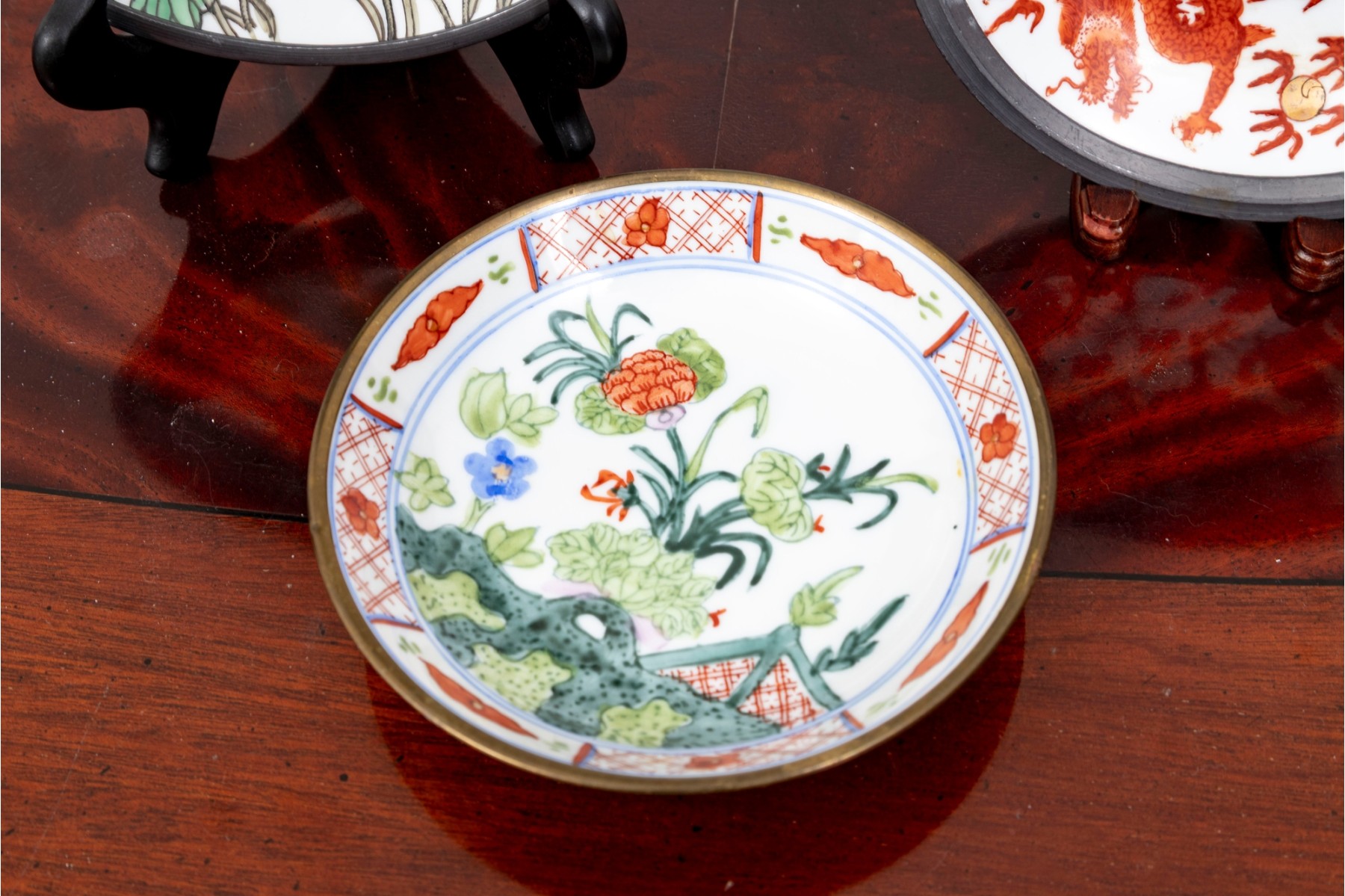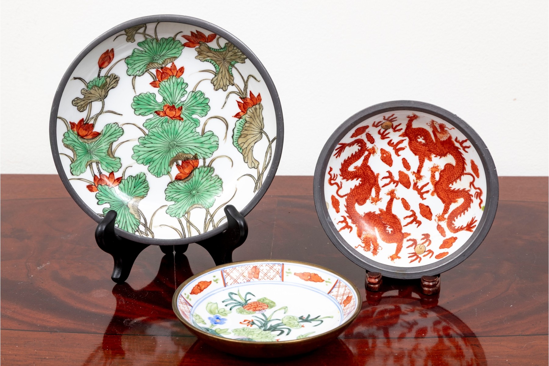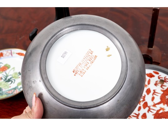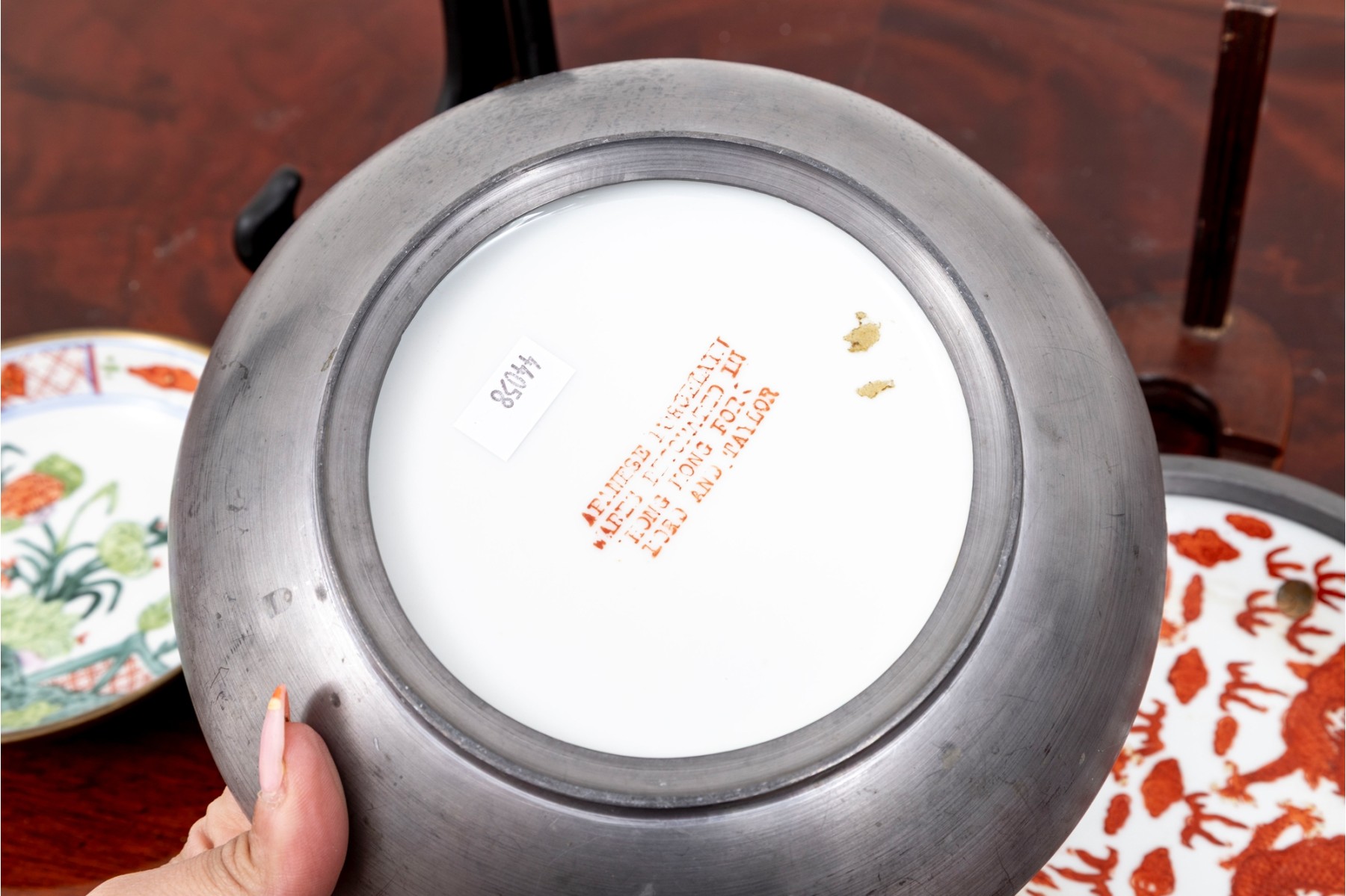 Three mid-20th century Chinese export plates with custom, hand-painted foliate designs over porcelain. Each plate is encased/backed with pewter or brass backing. See photos for markings.