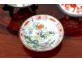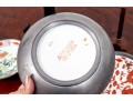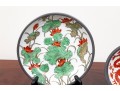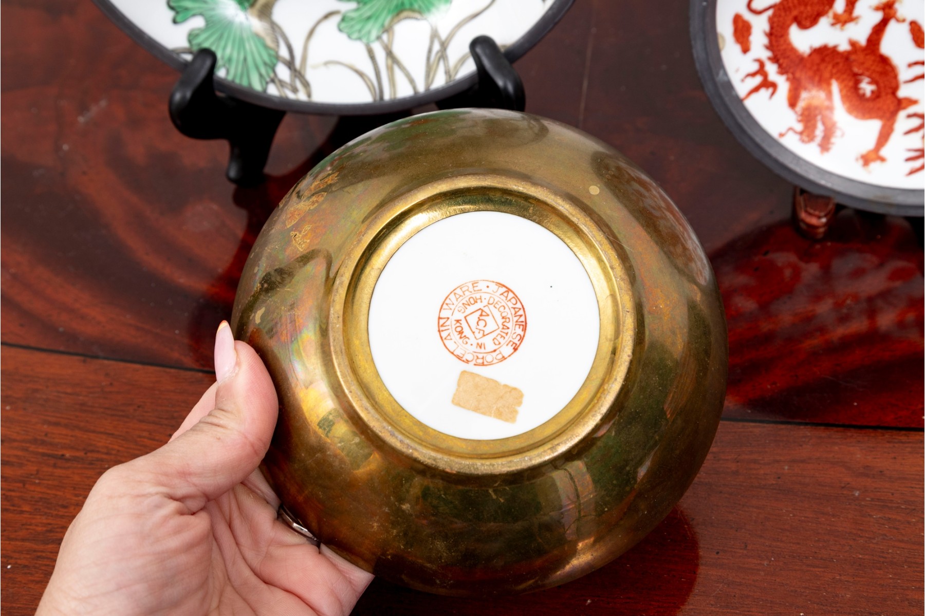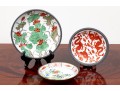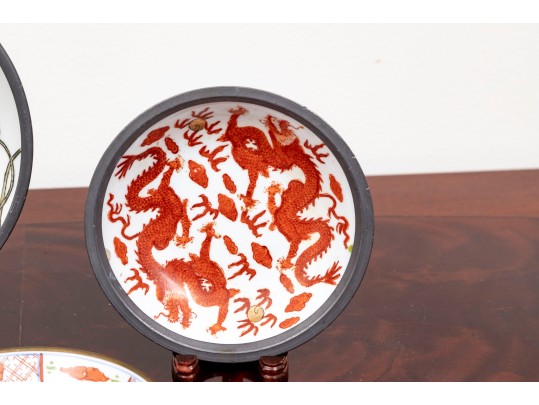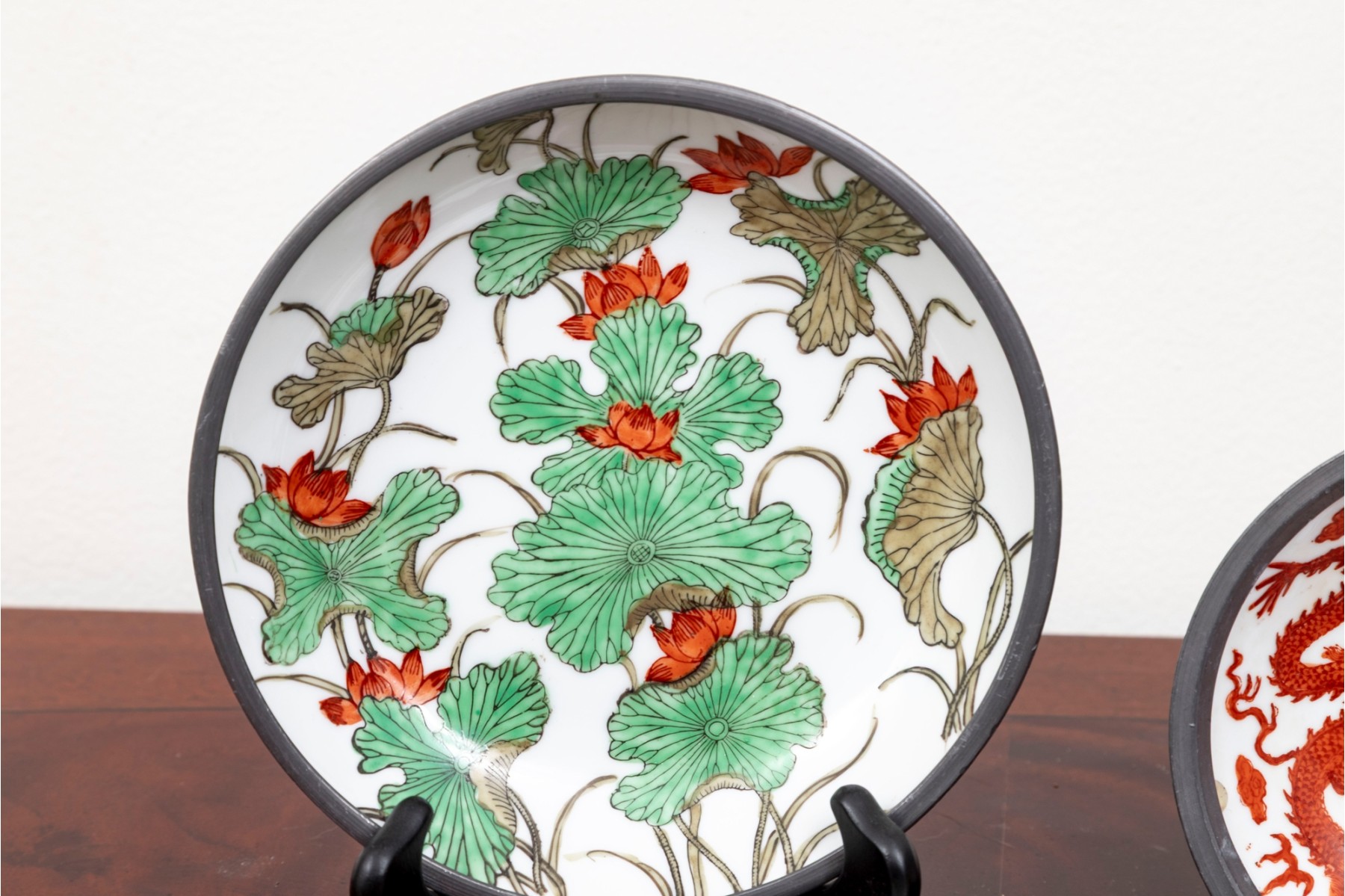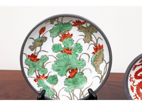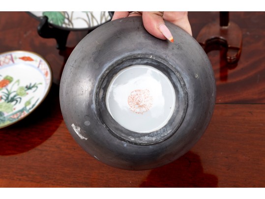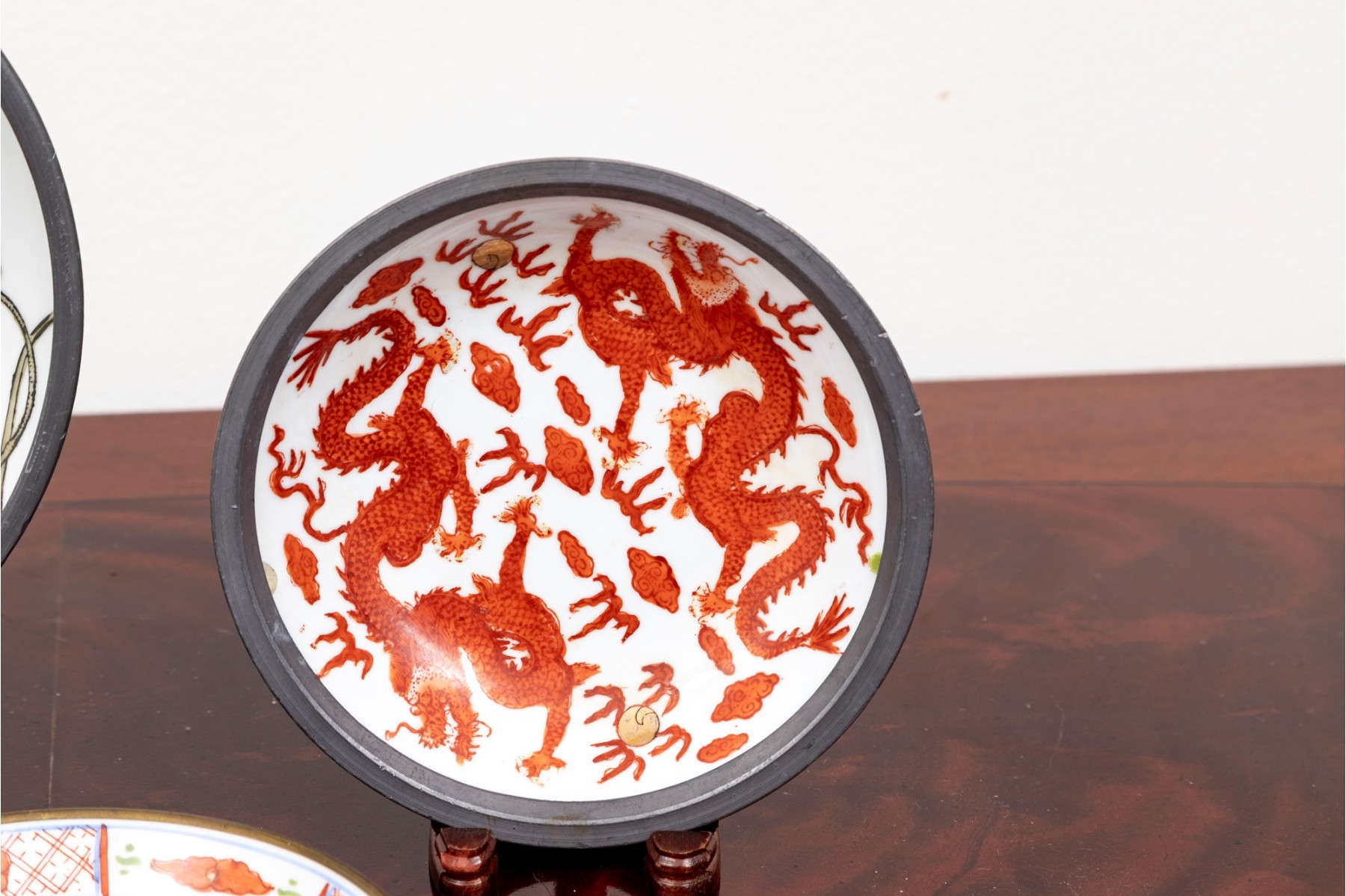 Three mid-20th century Chinese export plates with custom, hand-painted foliate designs over porcelain. Each plate is encased/backed with pewter or brass backing. See photos for markings.