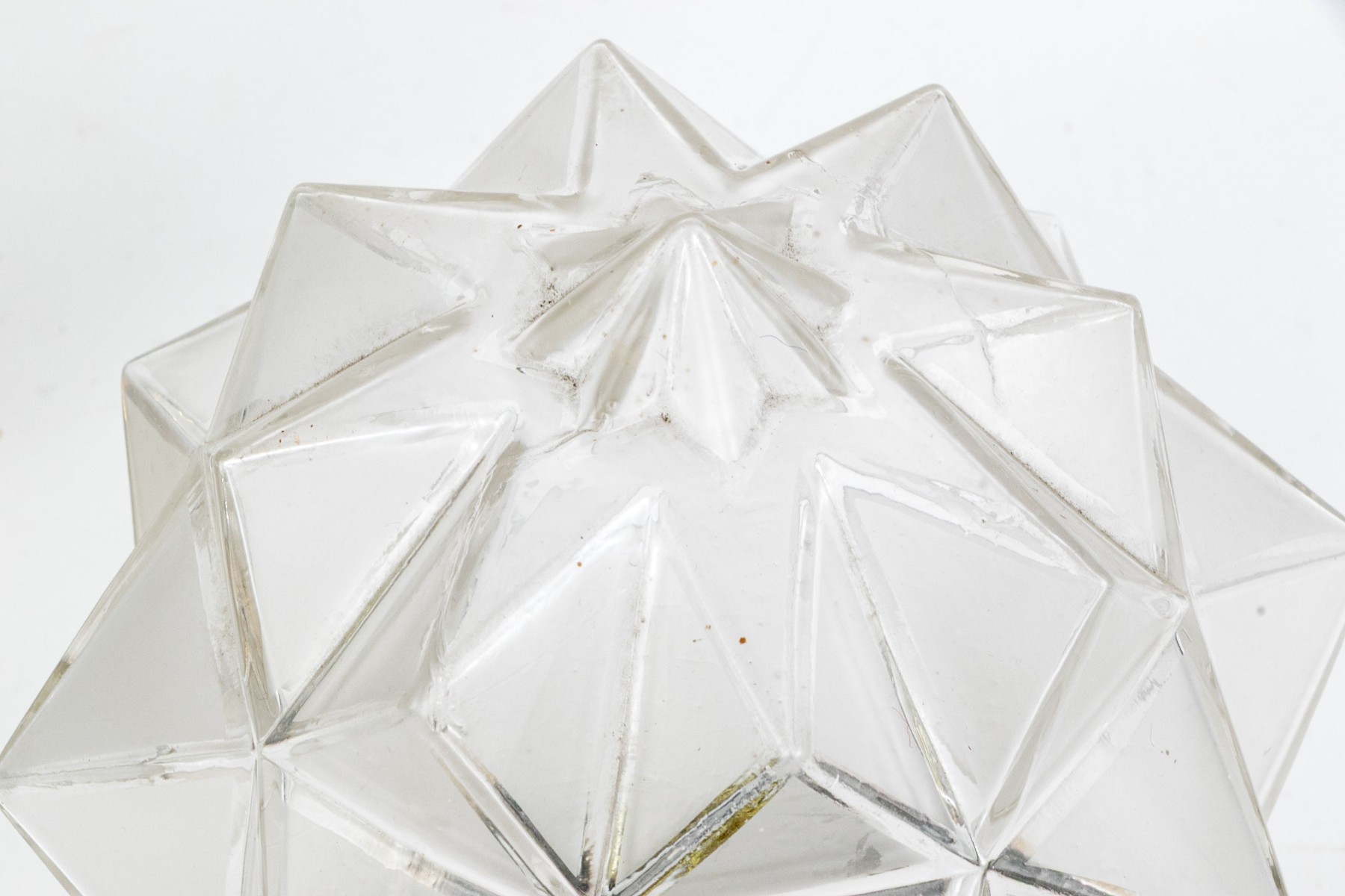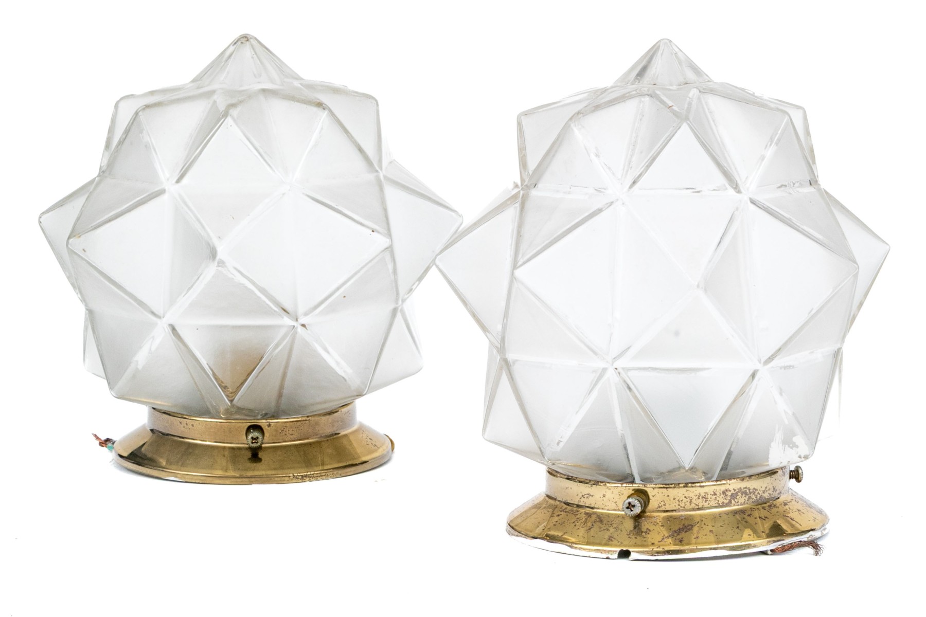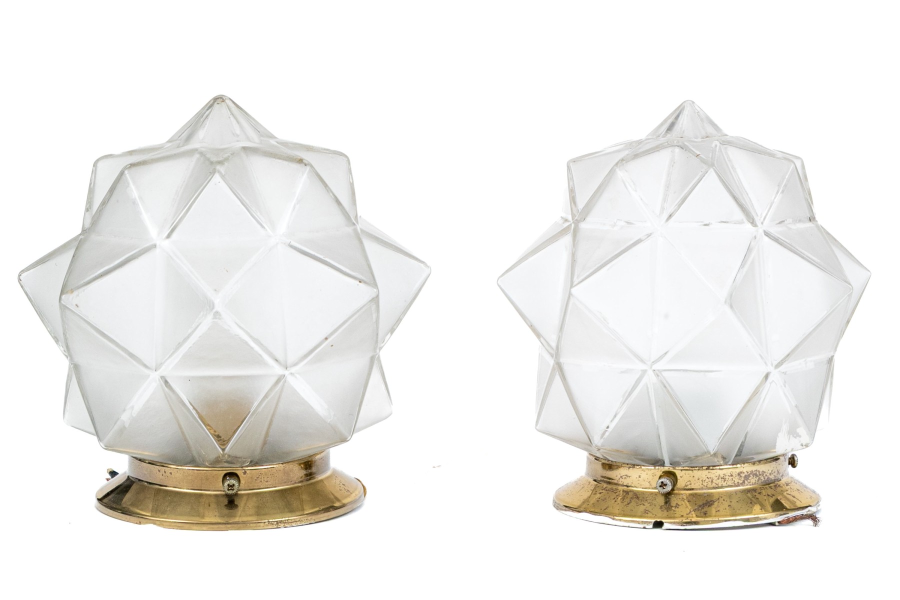 A delightful duo of mid-century ceiling lights featuring star form glass shades with brass mounts. One slightly smaller than the other.