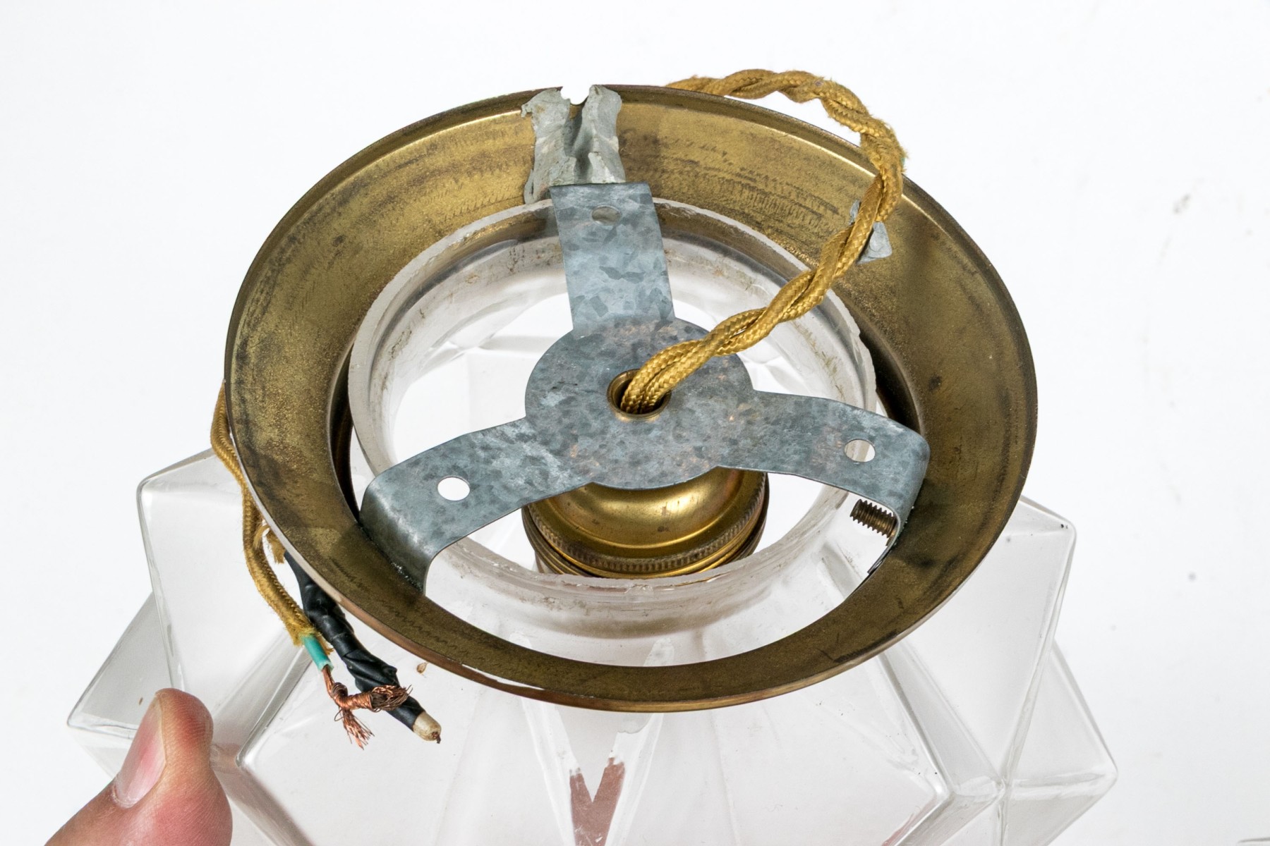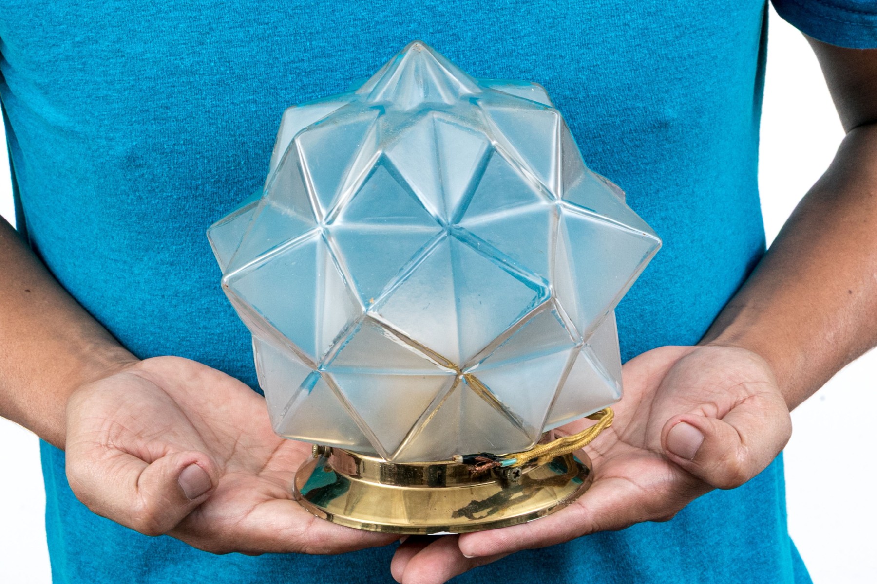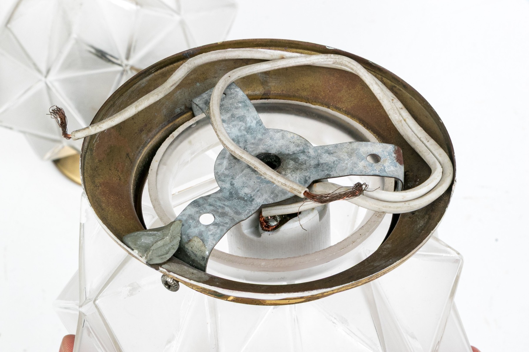 A delightful duo of mid-century ceiling lights featuring star form glass shades with brass mounts. One slightly smaller than the other.