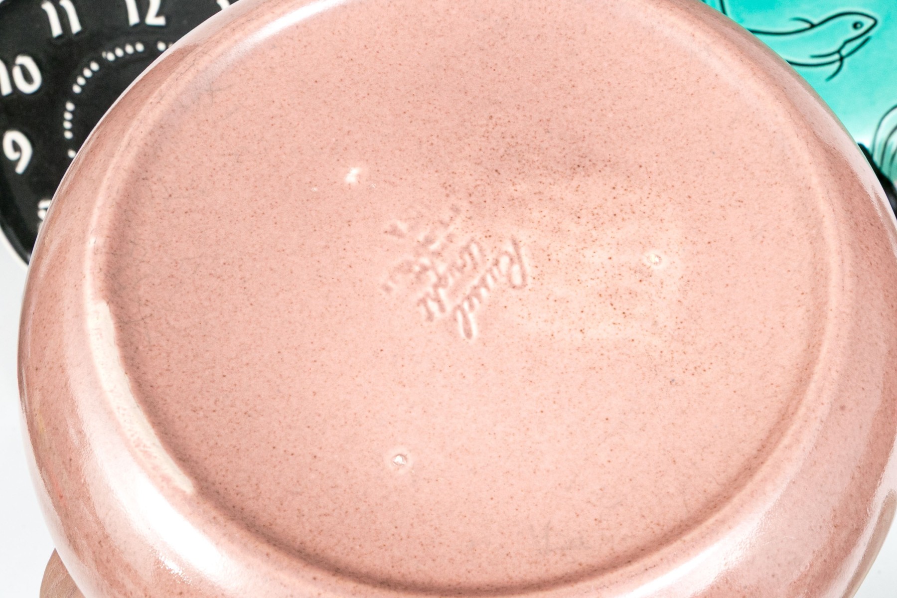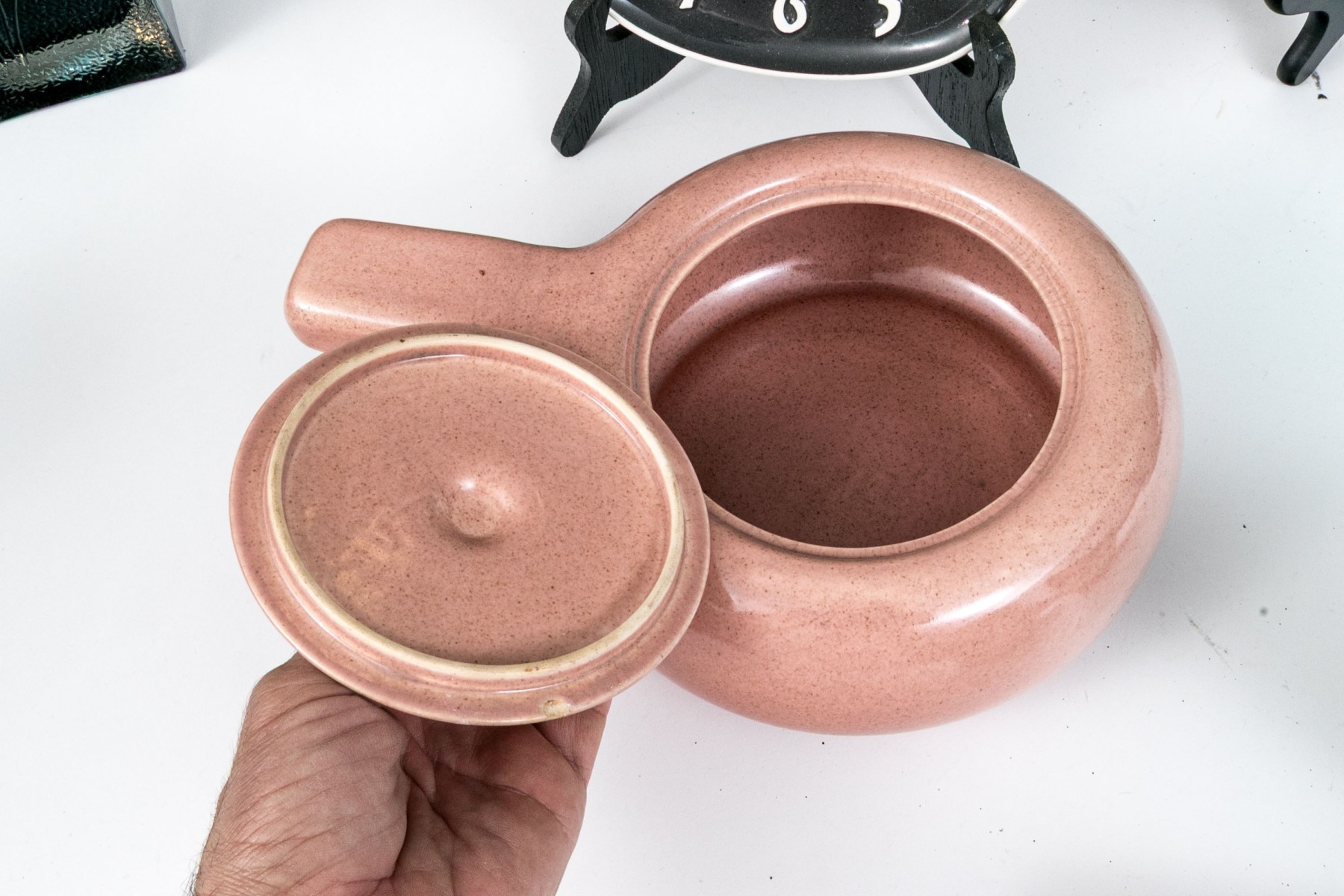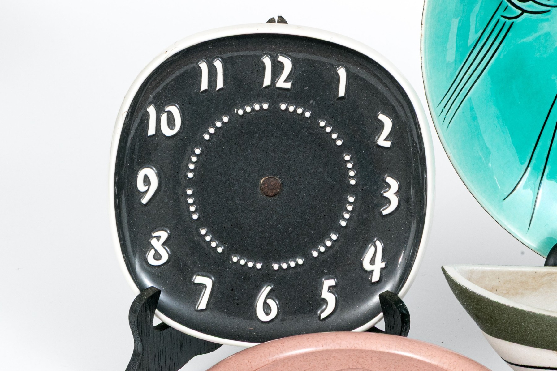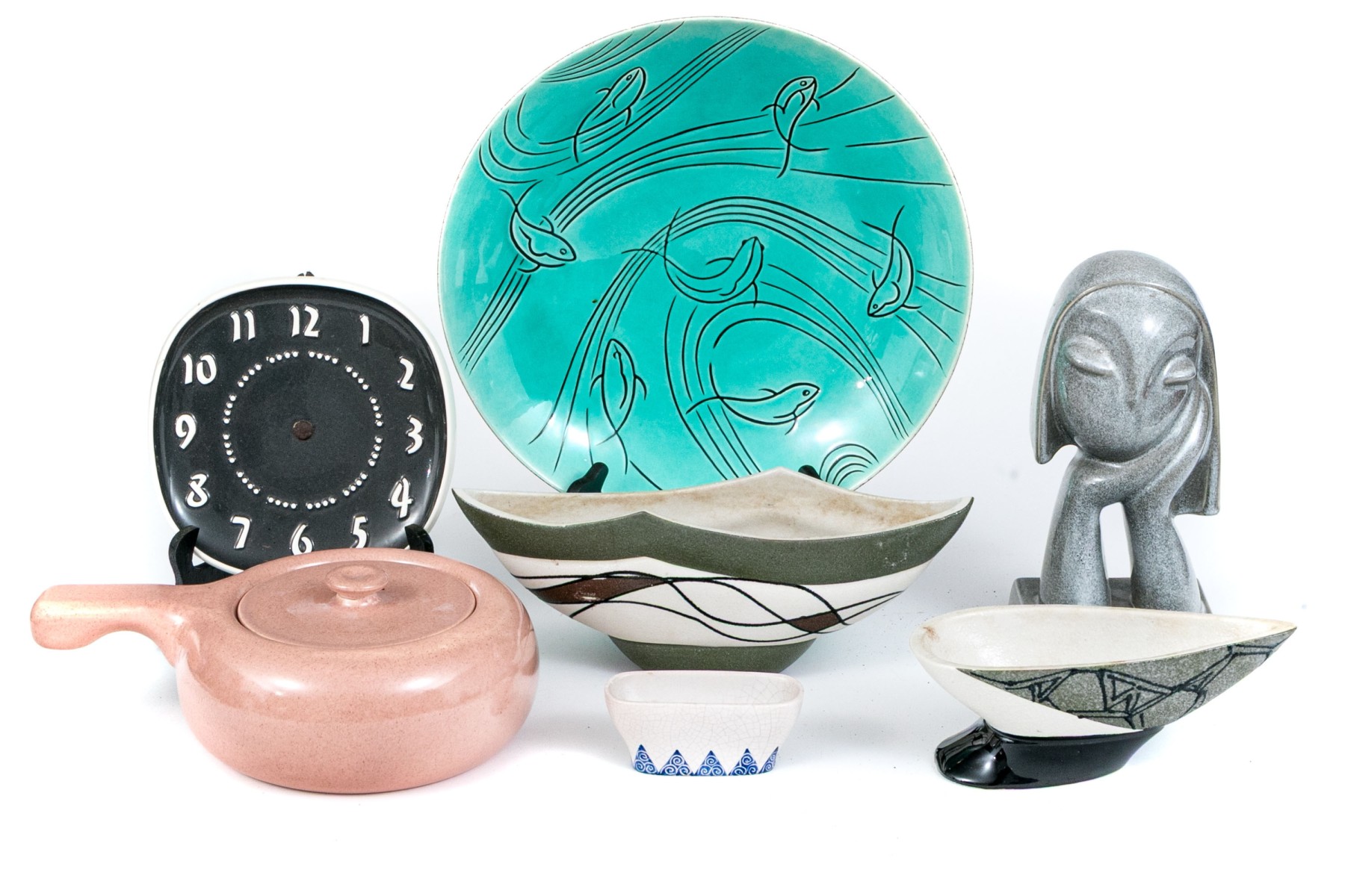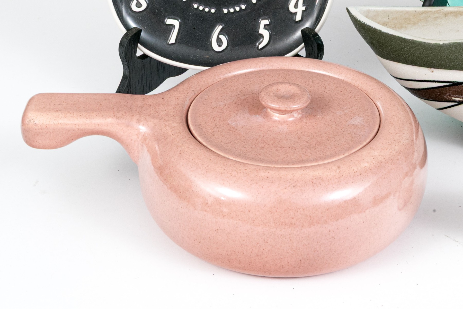 Russel Wright clock, without its moving components, lidded serving bowl with handle, and large serving bowl and three vases.