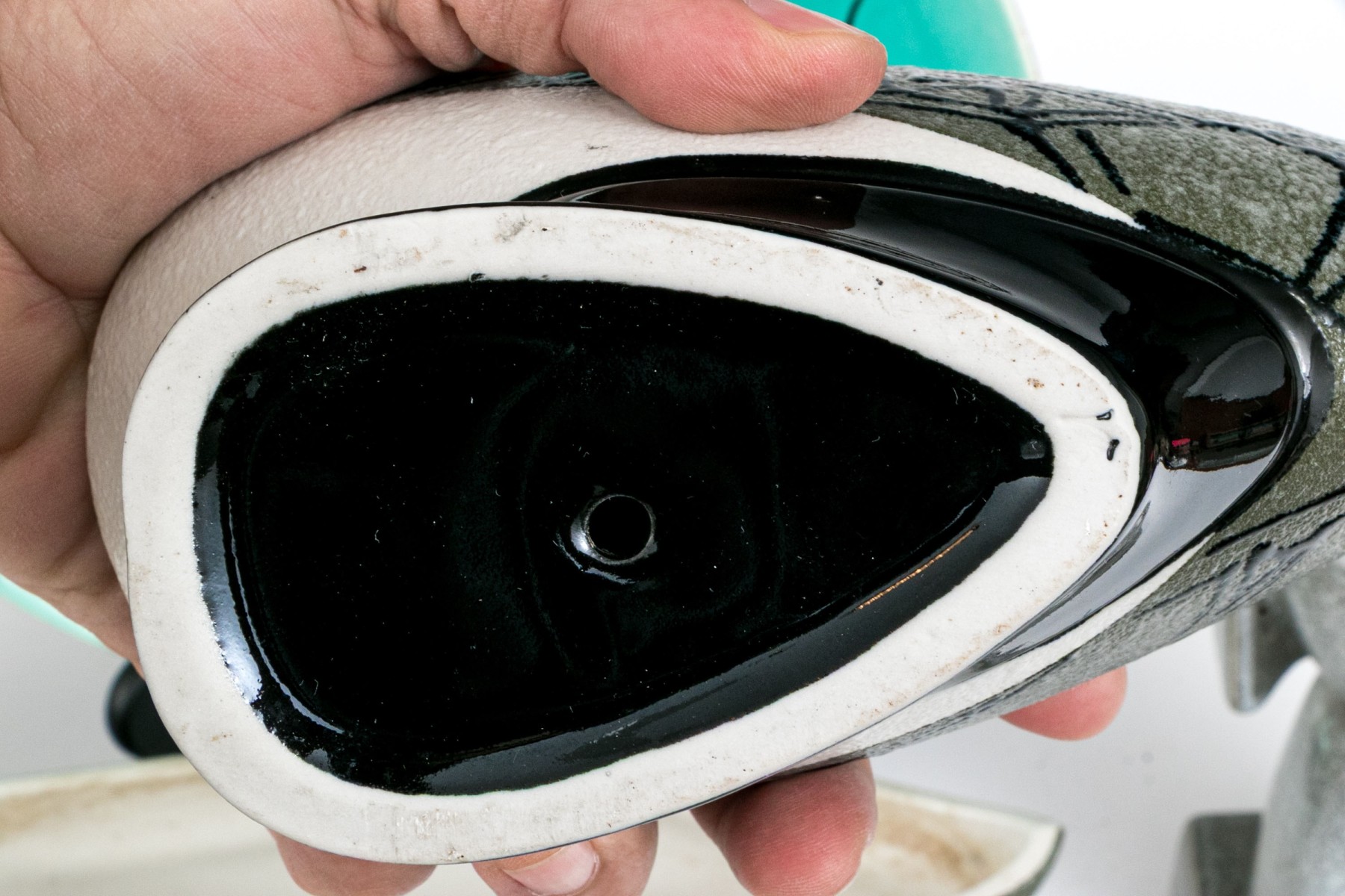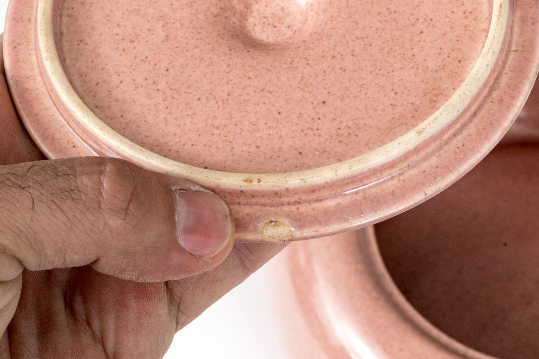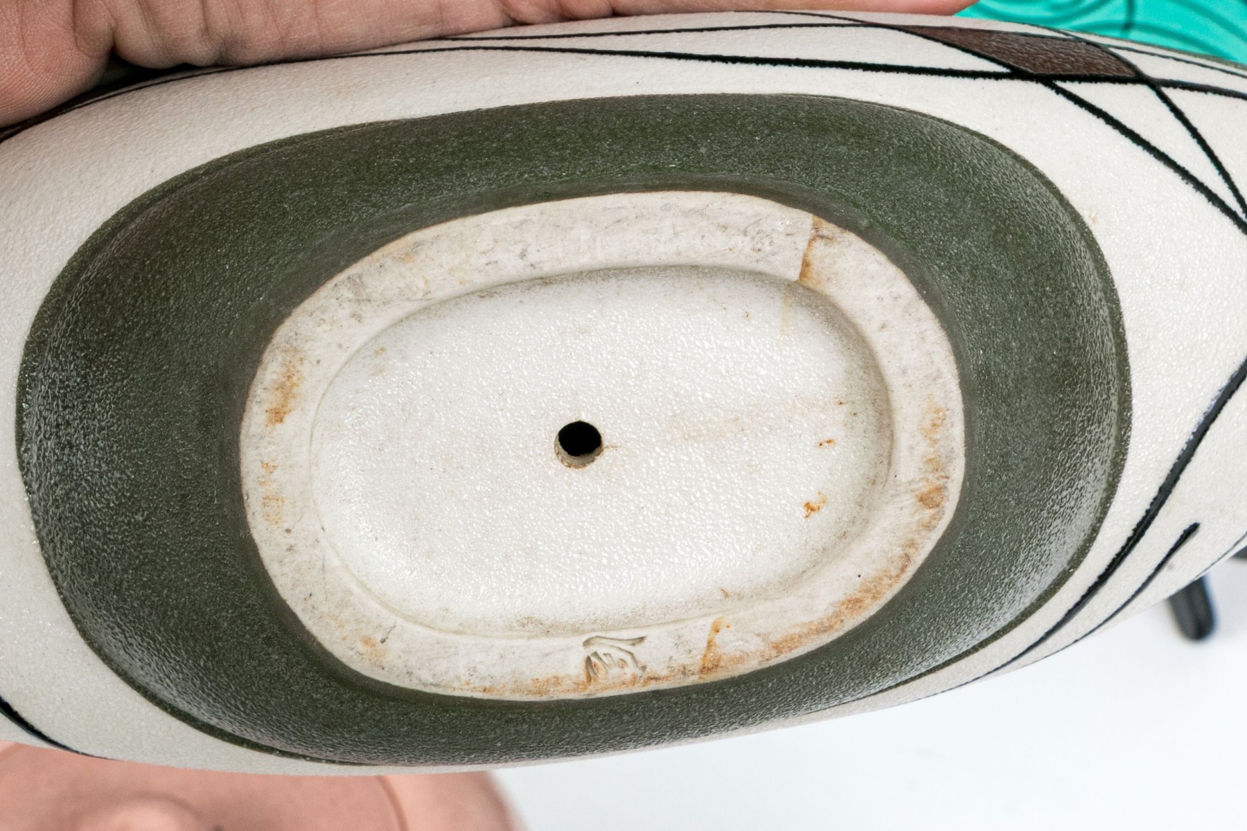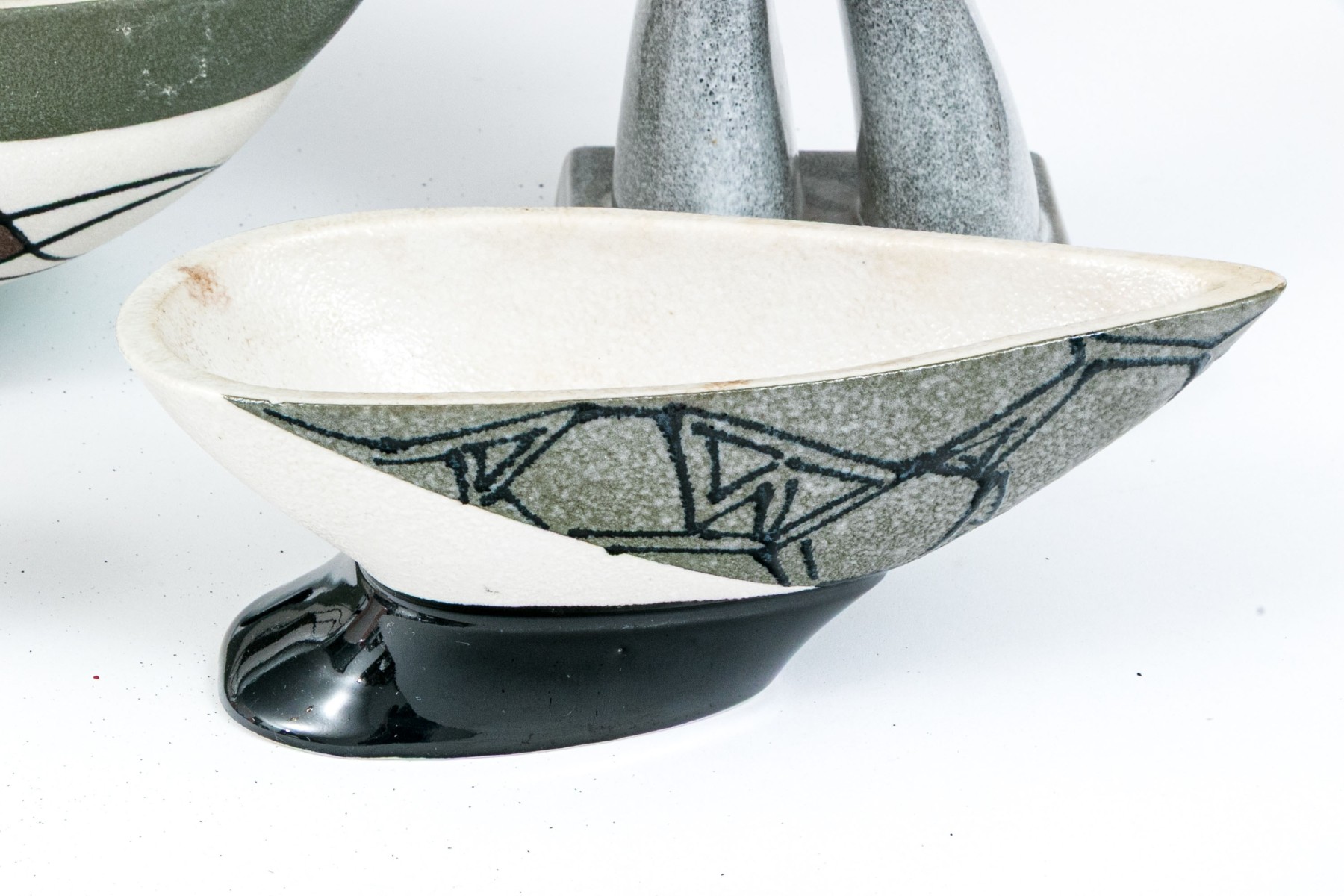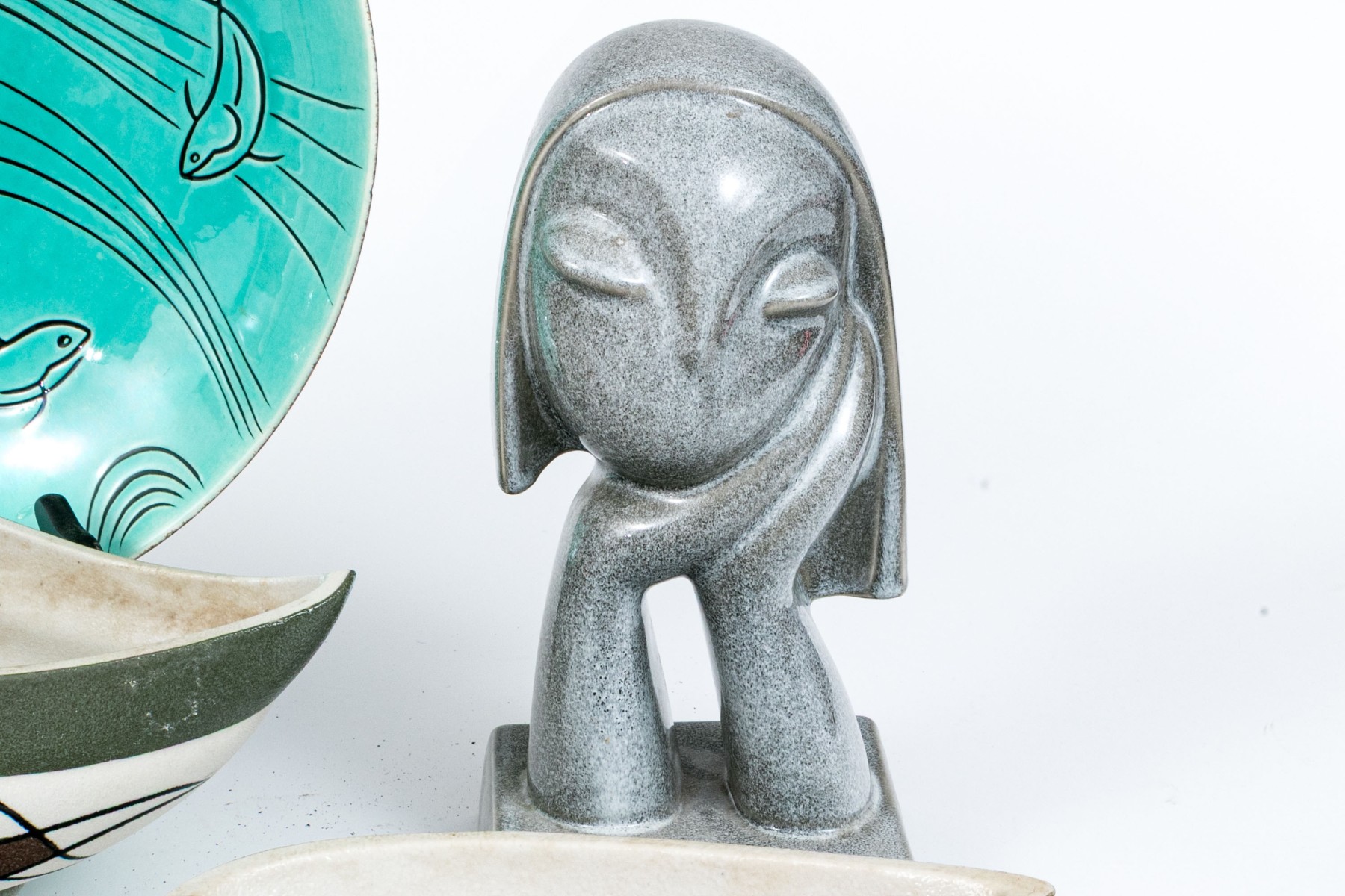Russel Wright clock, without its moving components, lidded serving bowl with handle, and large serving bowl and three vases.