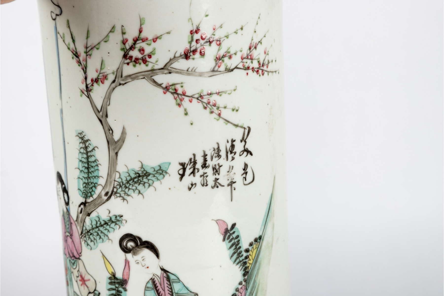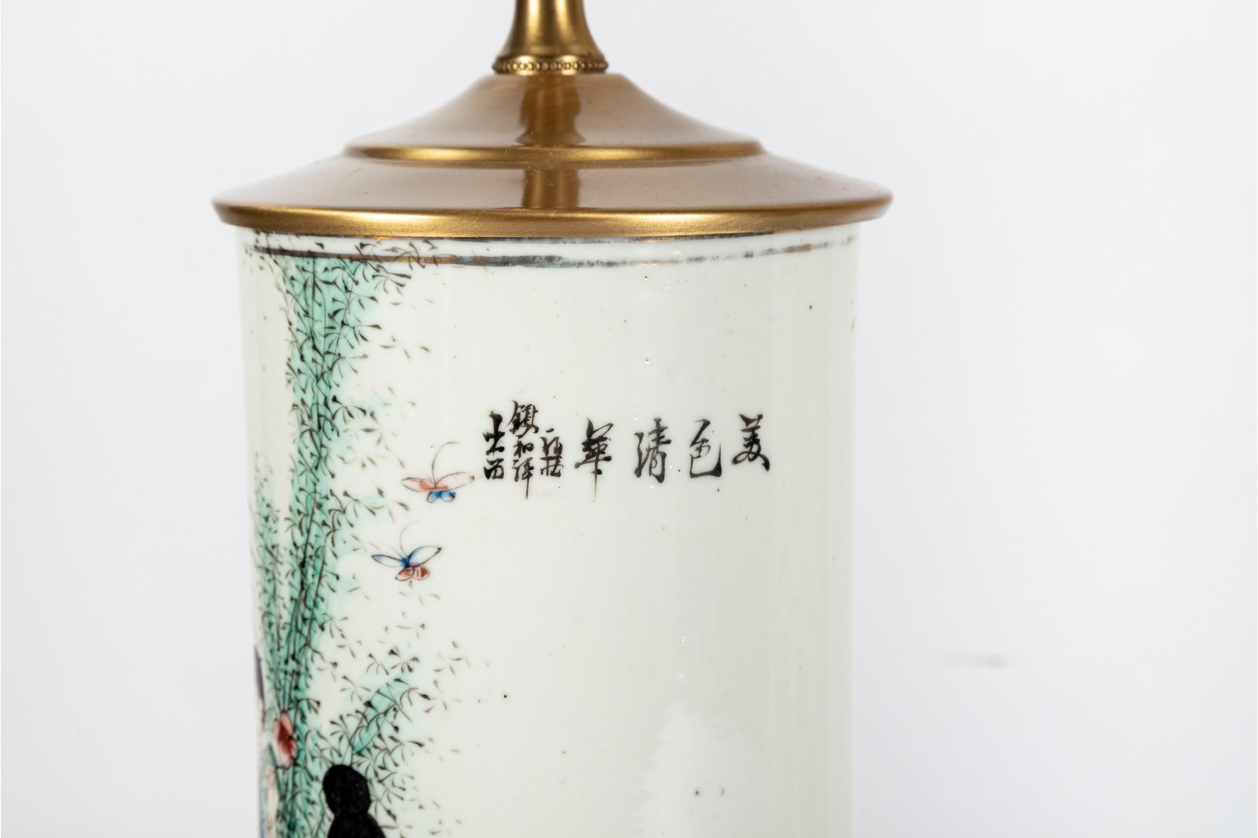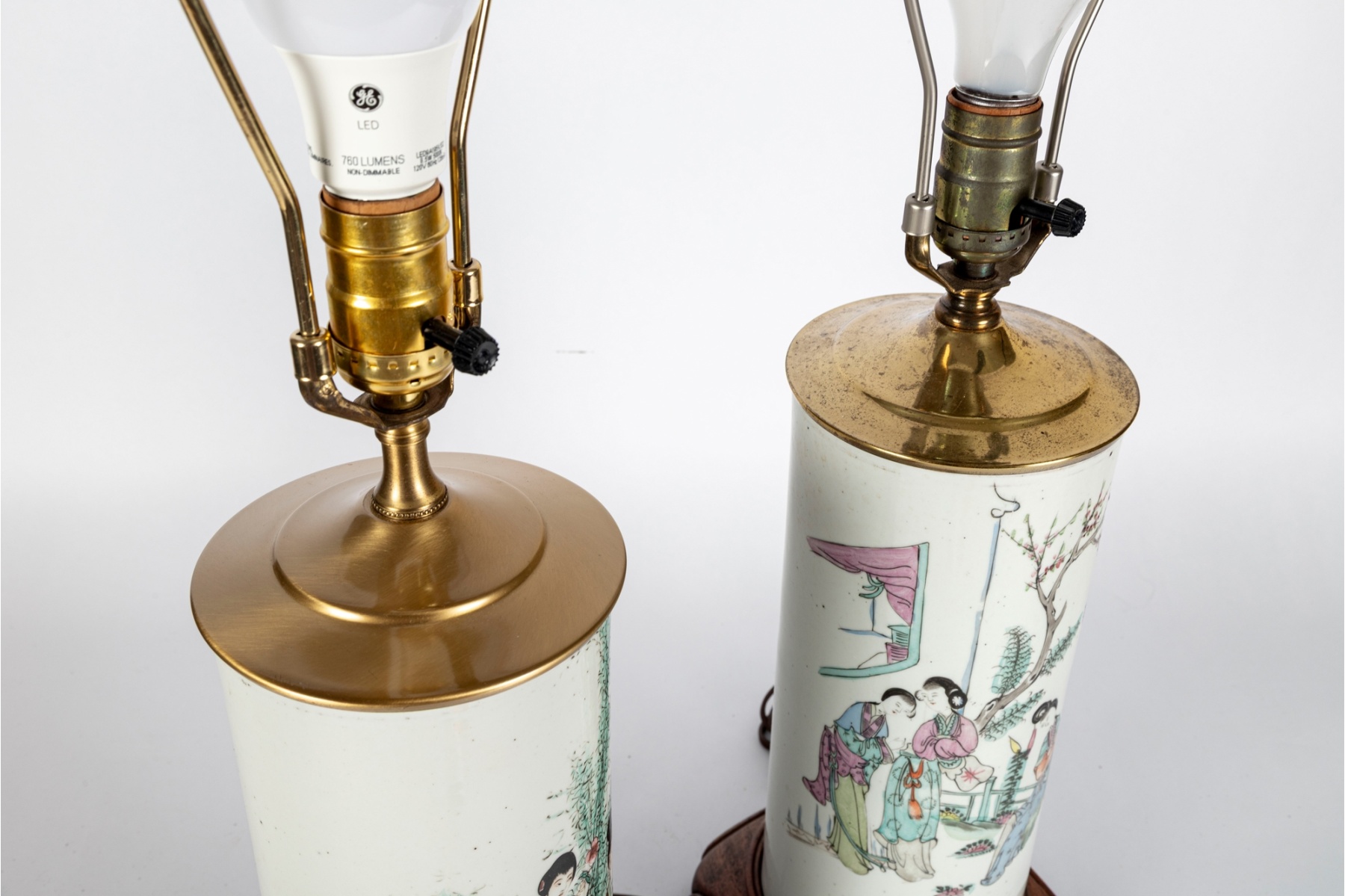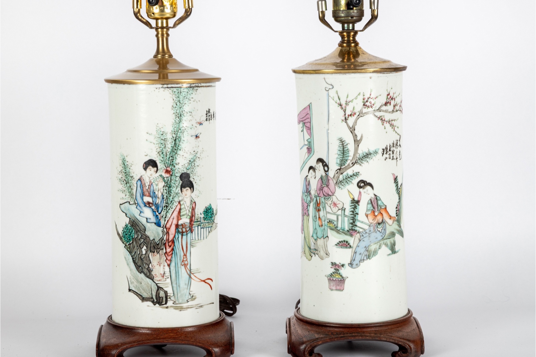 Pair of Chinese cylindrical porcelain lamps, each hand-painted with figural garden scenes featuring elegant women in colorful robes within landscape settings. Mounted on carved wood bases with brass fittings. Differing finials included. No shades.