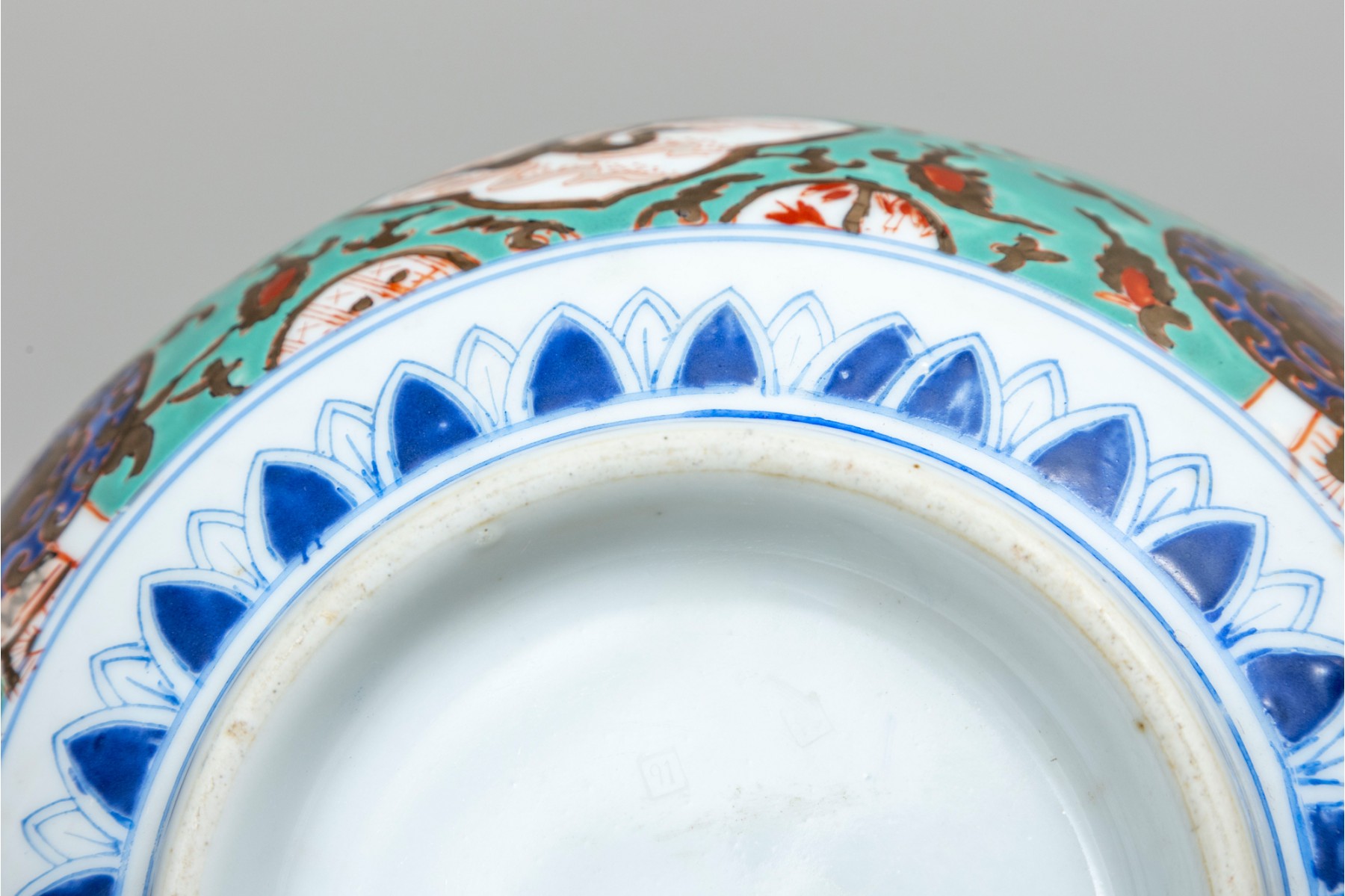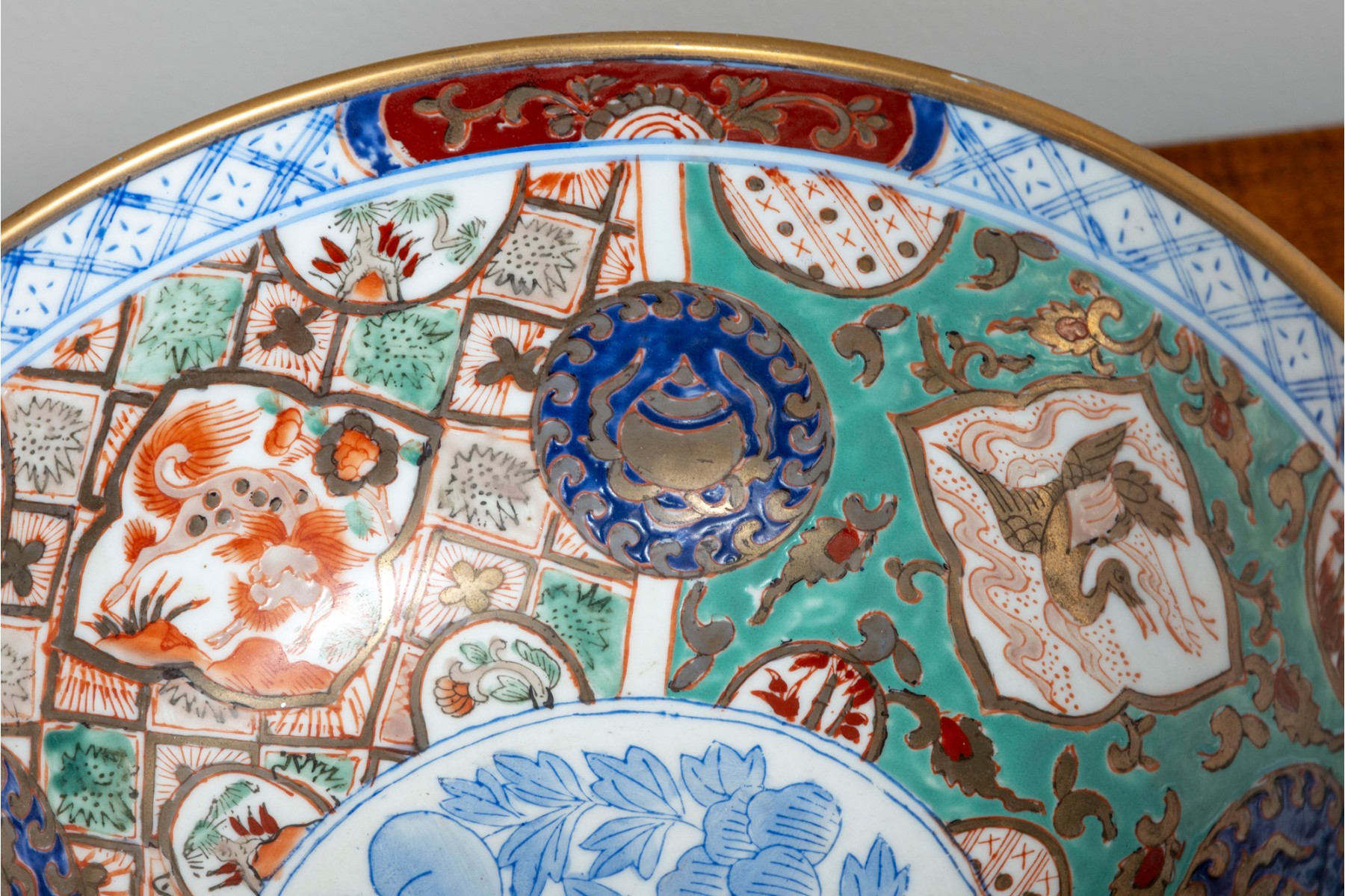 A series of medallions line both the interior and exterior of the bowl depicting a lion and phoenix against an exotic ground of aqua, orange, green, rust, and blue. Circa 1950's, no seal present.