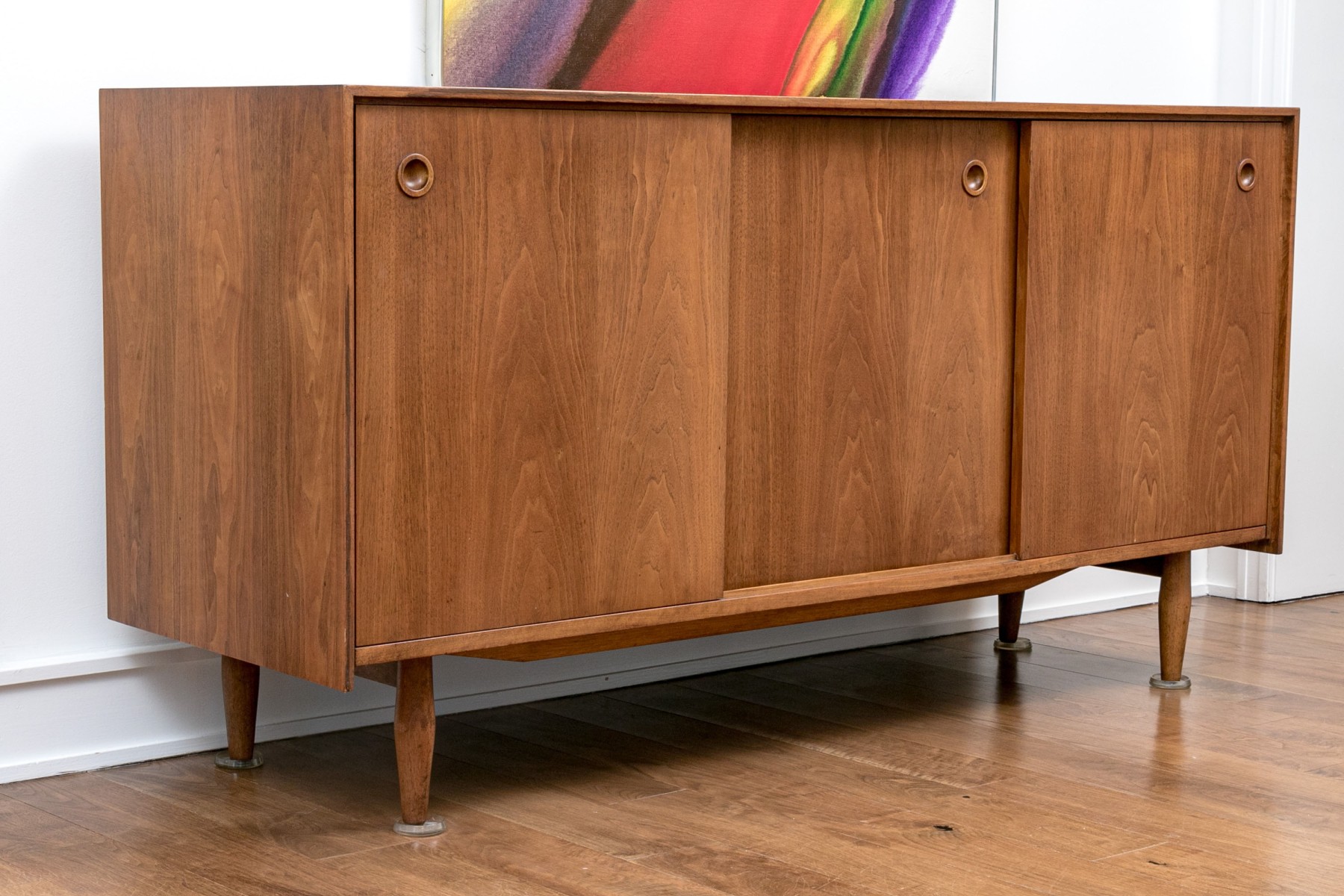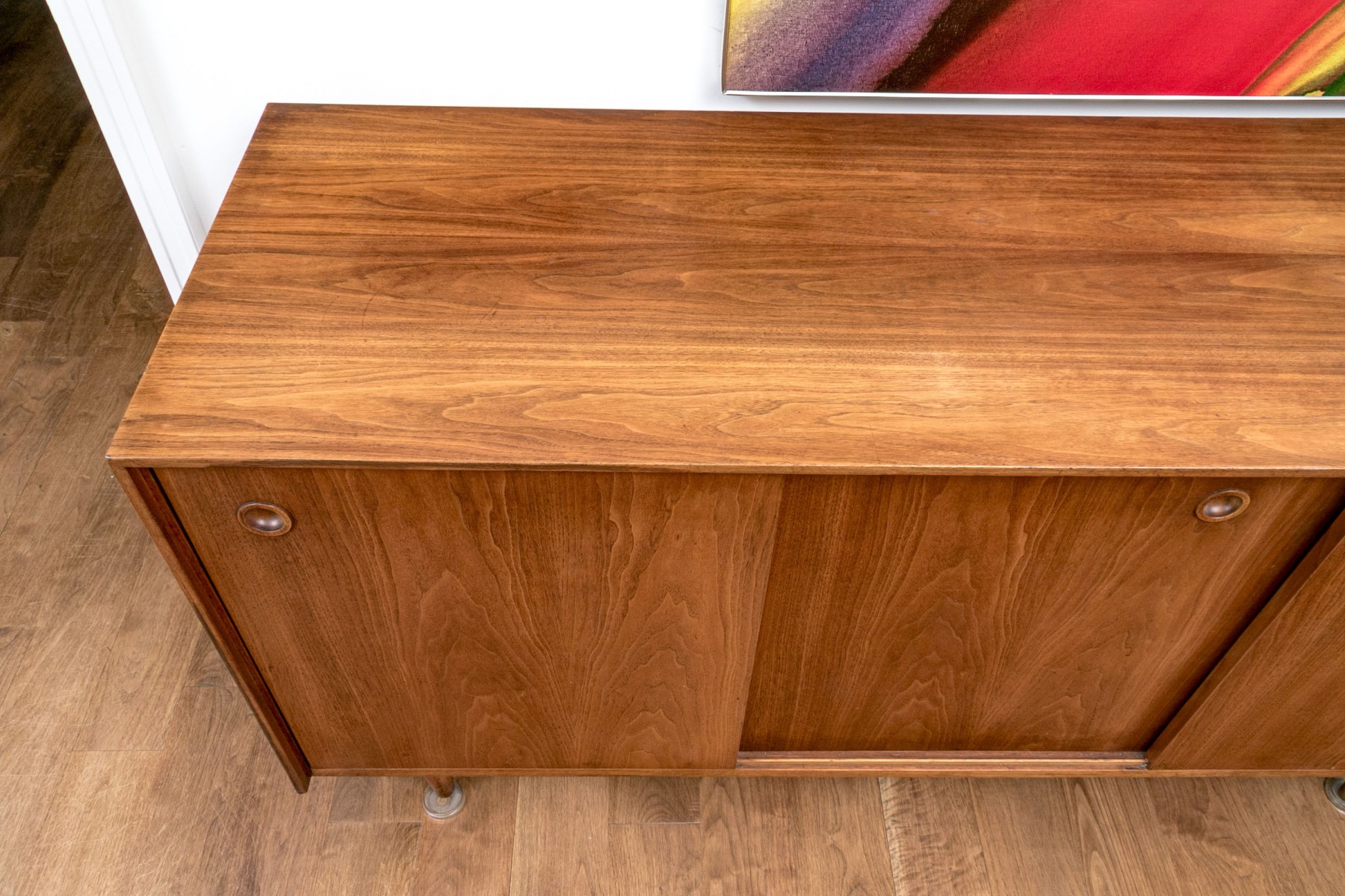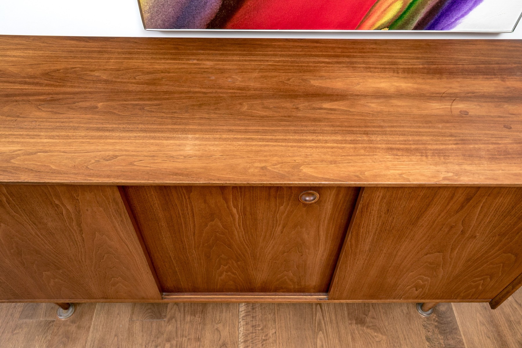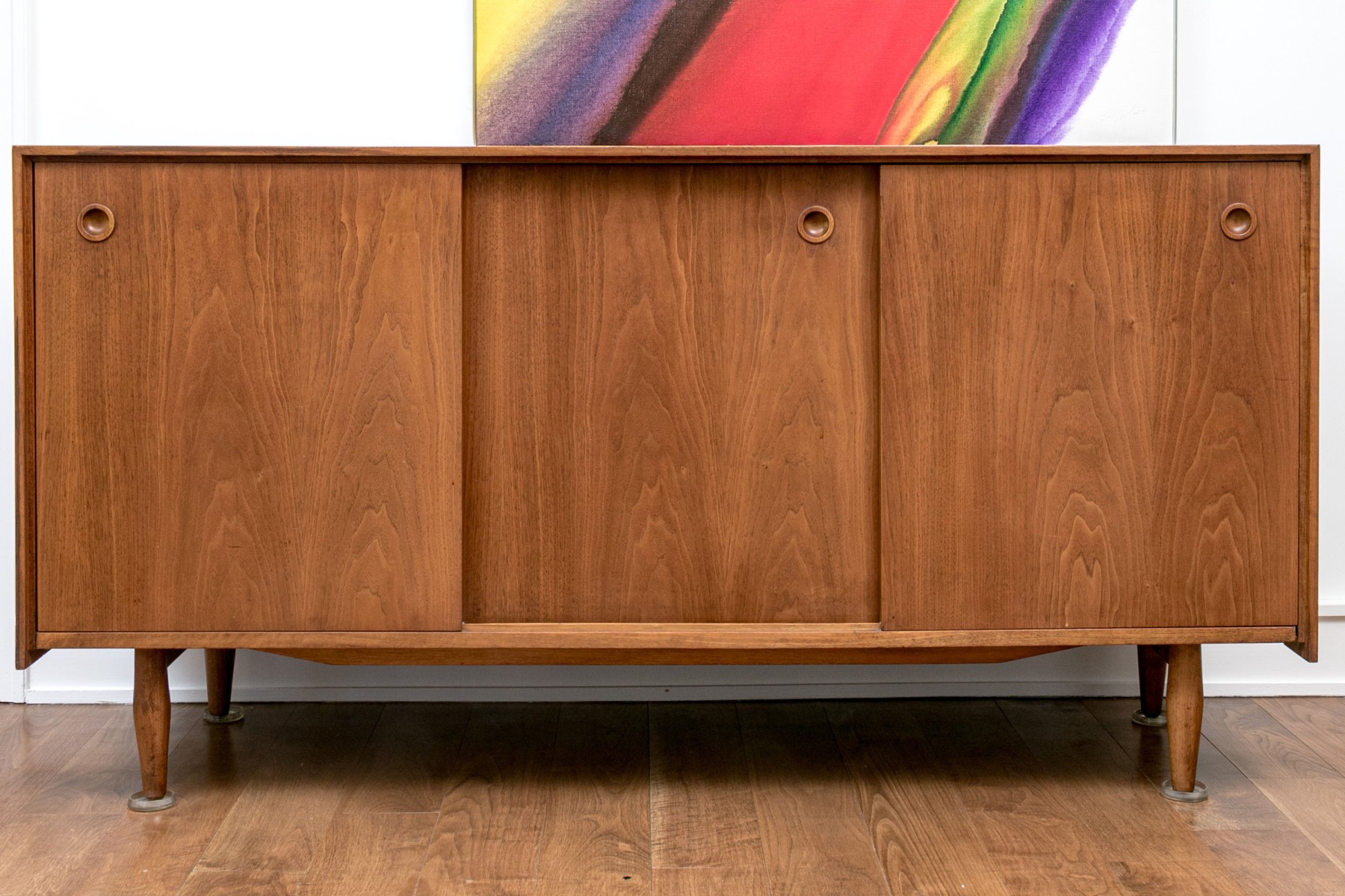 A fine mid century three part credenza with tambour doors and classic circular recessed pulls opening to single shelves. Raised on a base with tapering curved legs.