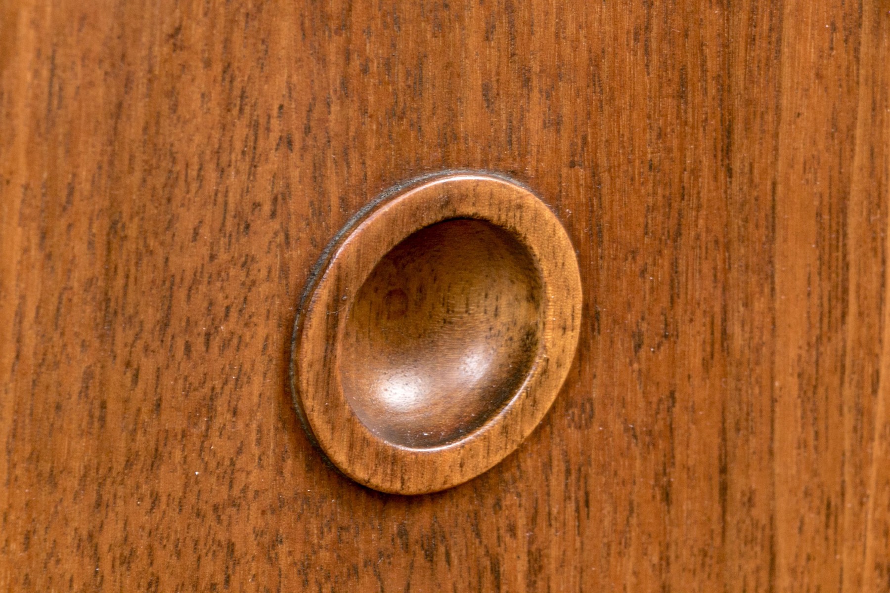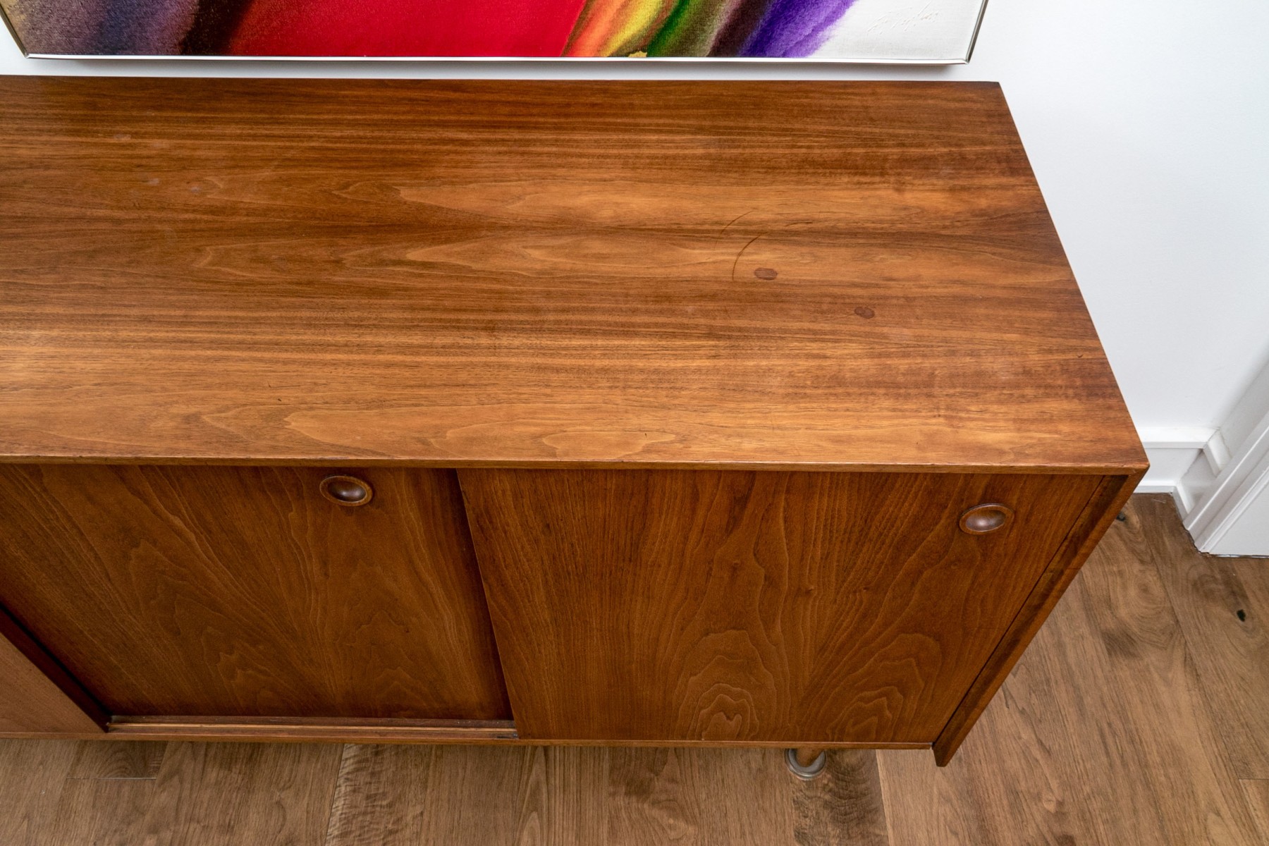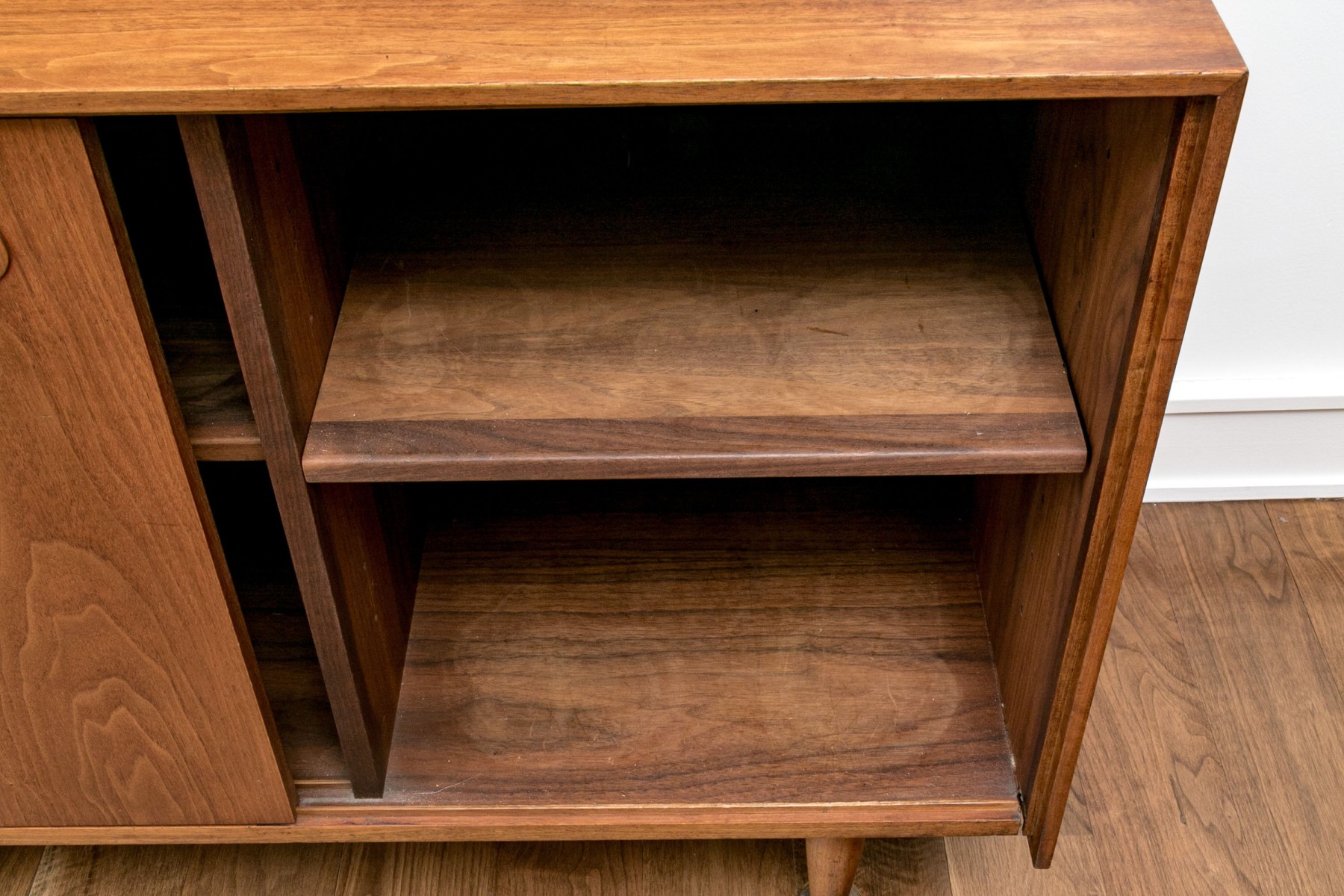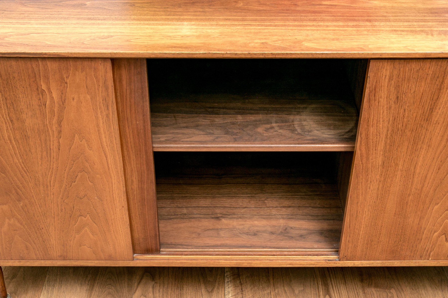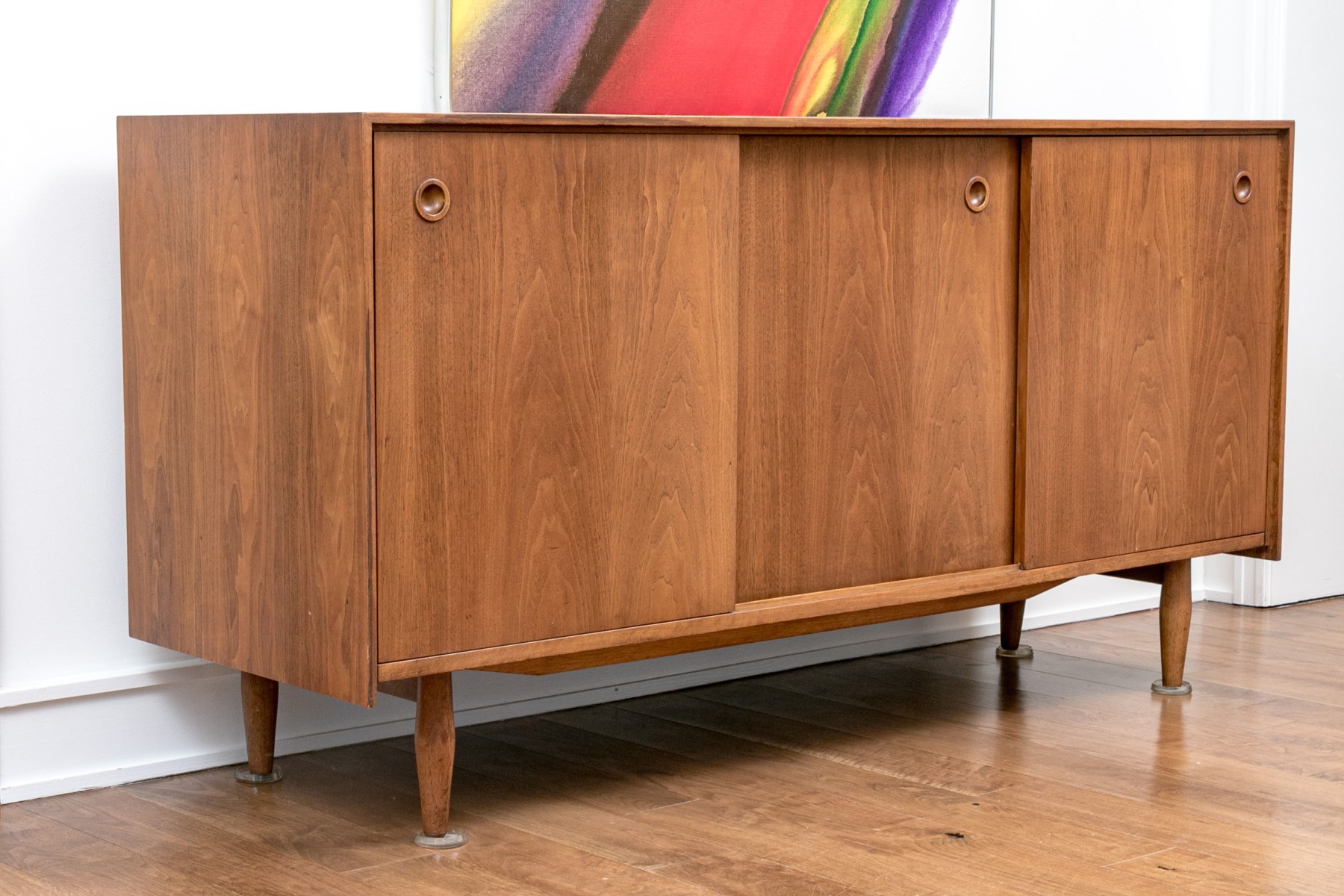 A fine mid century three part credenza with tambour doors and classic circular recessed pulls opening to single shelves. Raised on a base with tapering curved legs.