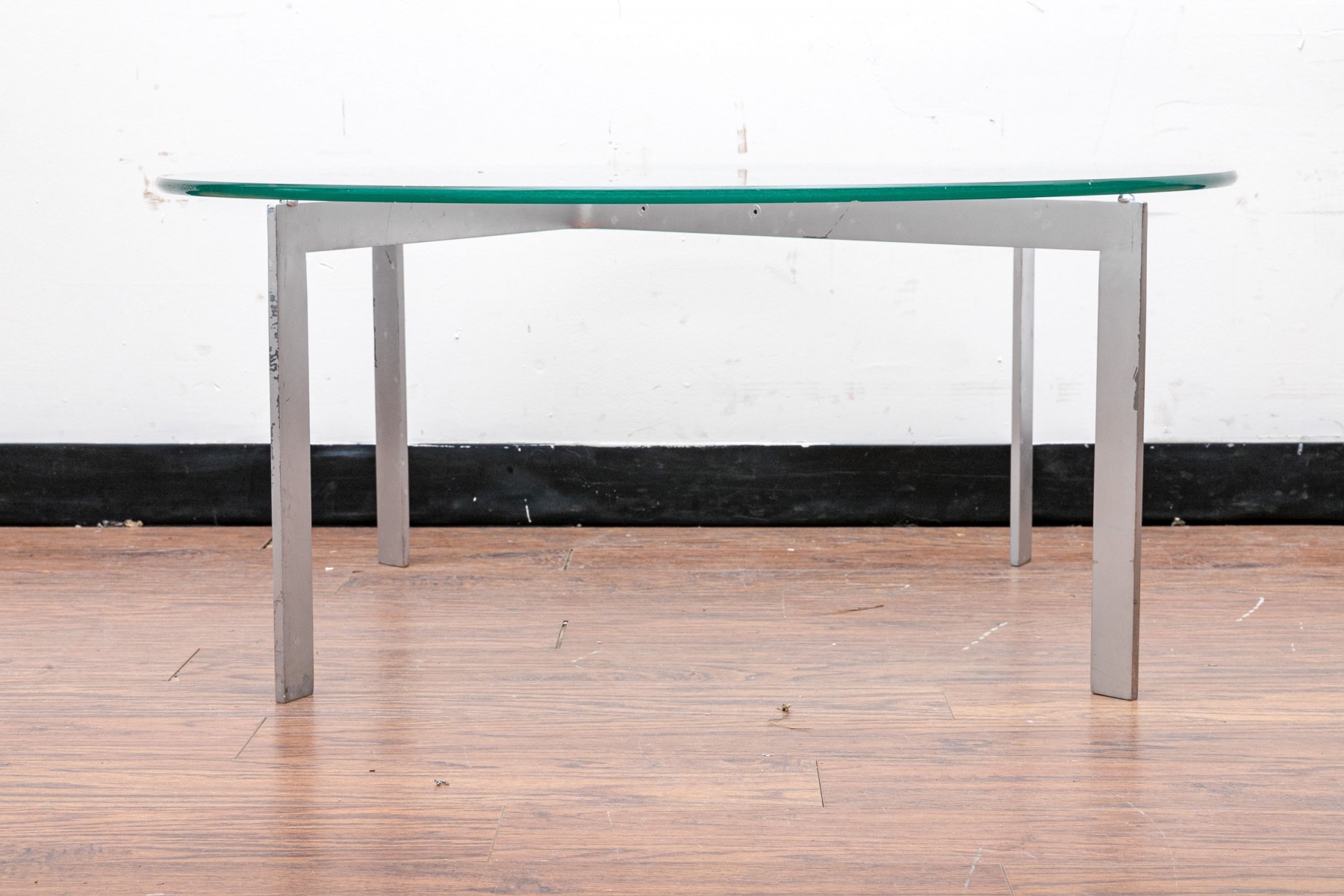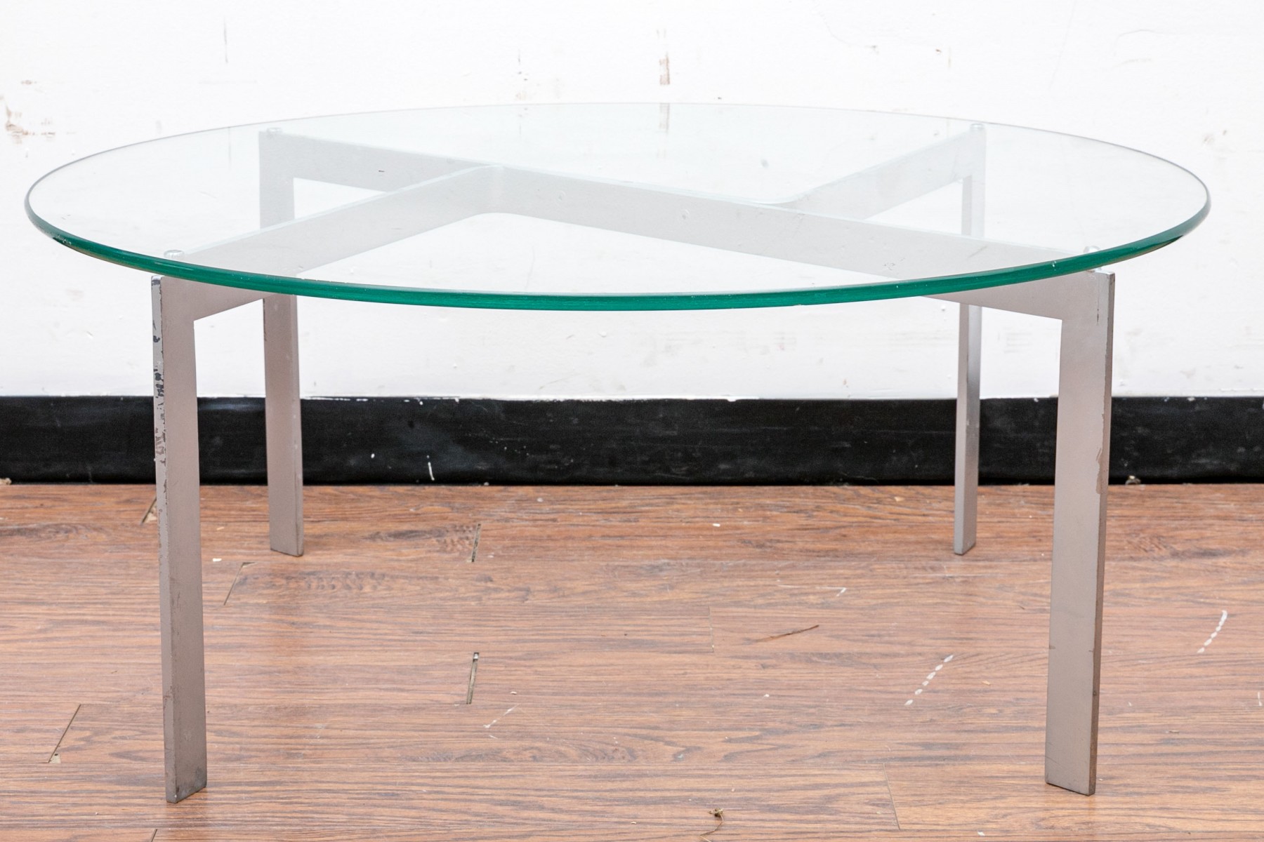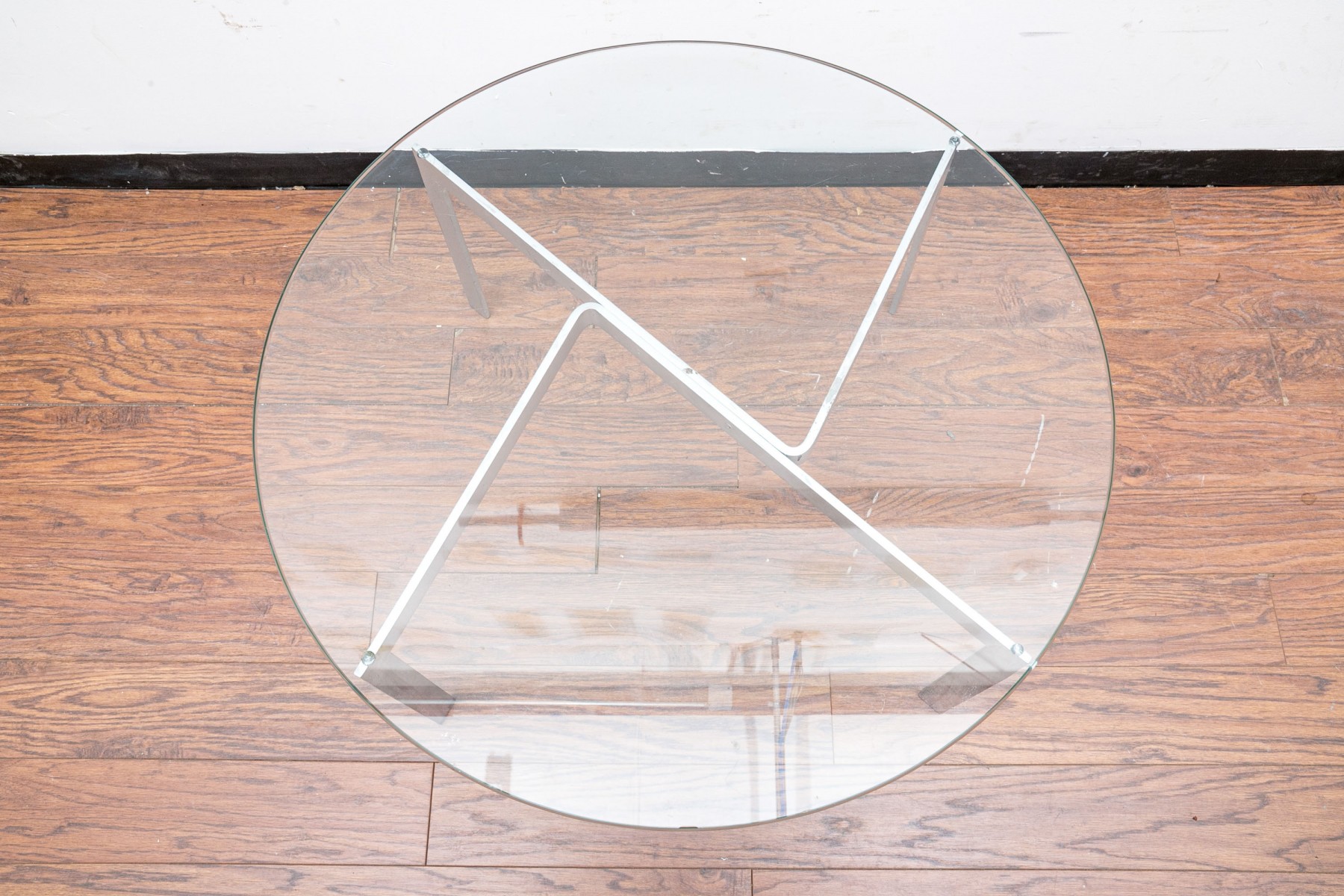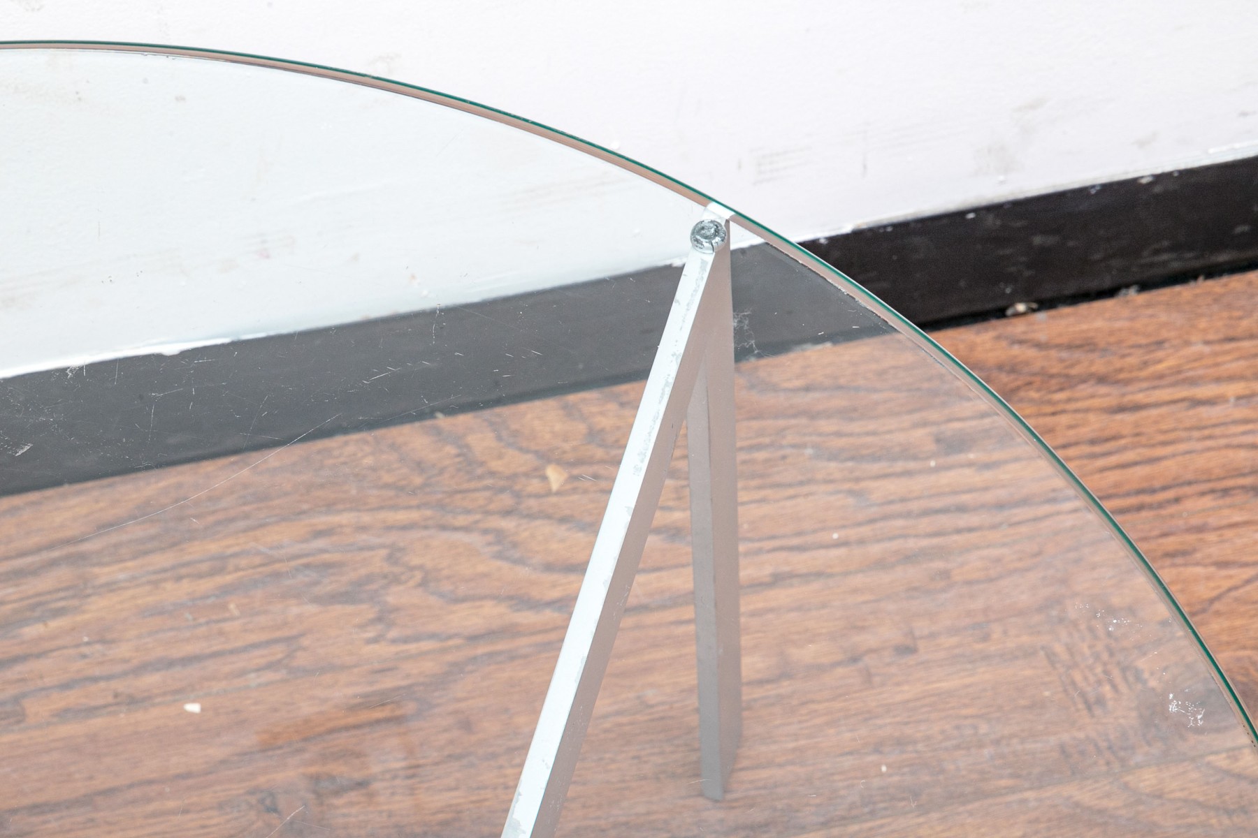 A wonderful mid century coffee table displaying a circular glass top over an angular branching gray metal bracket base.