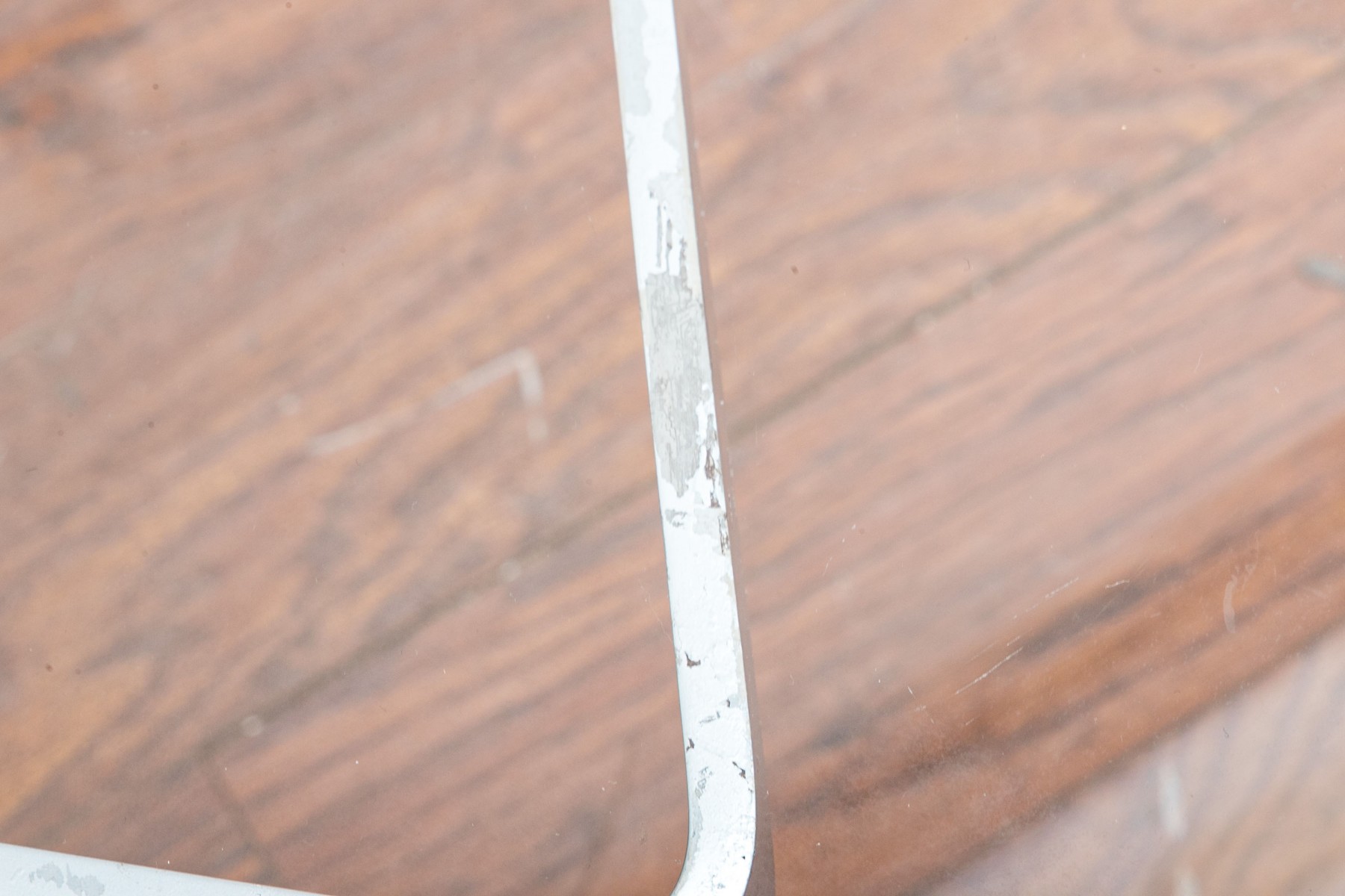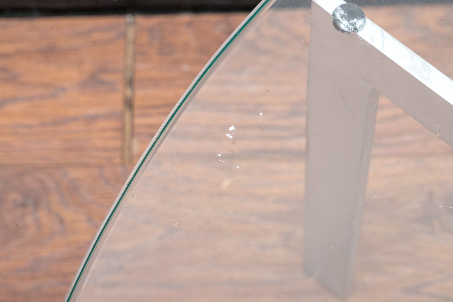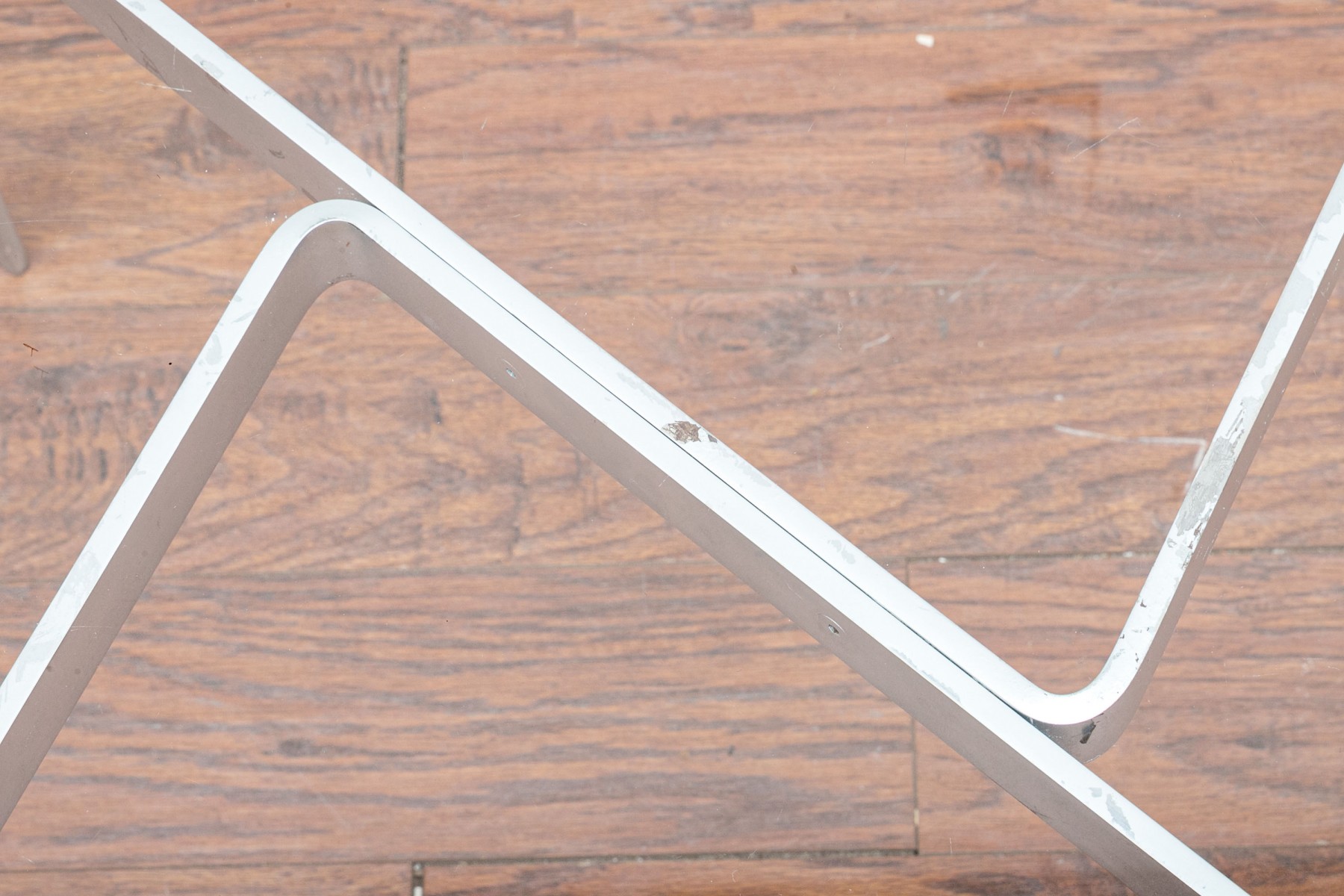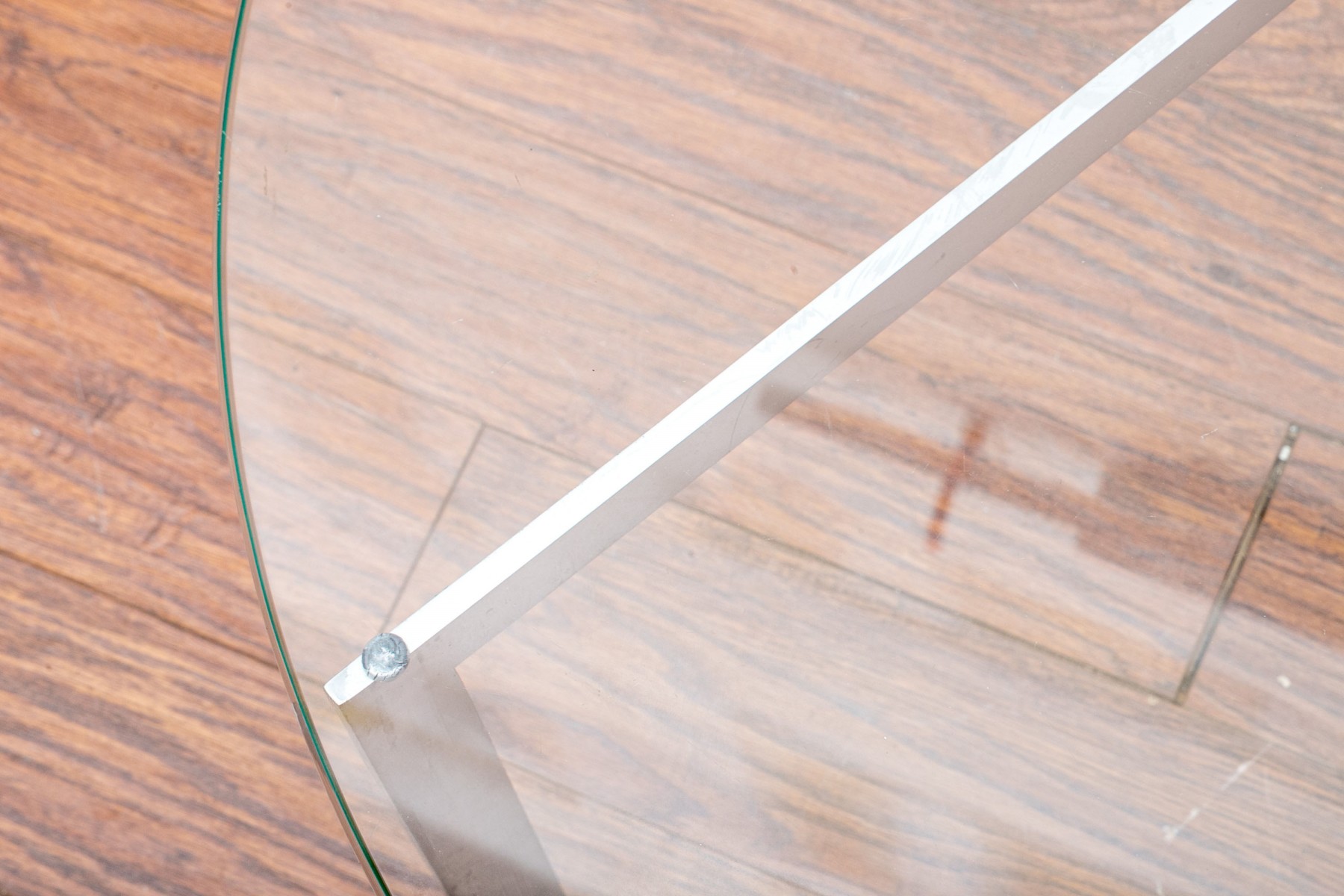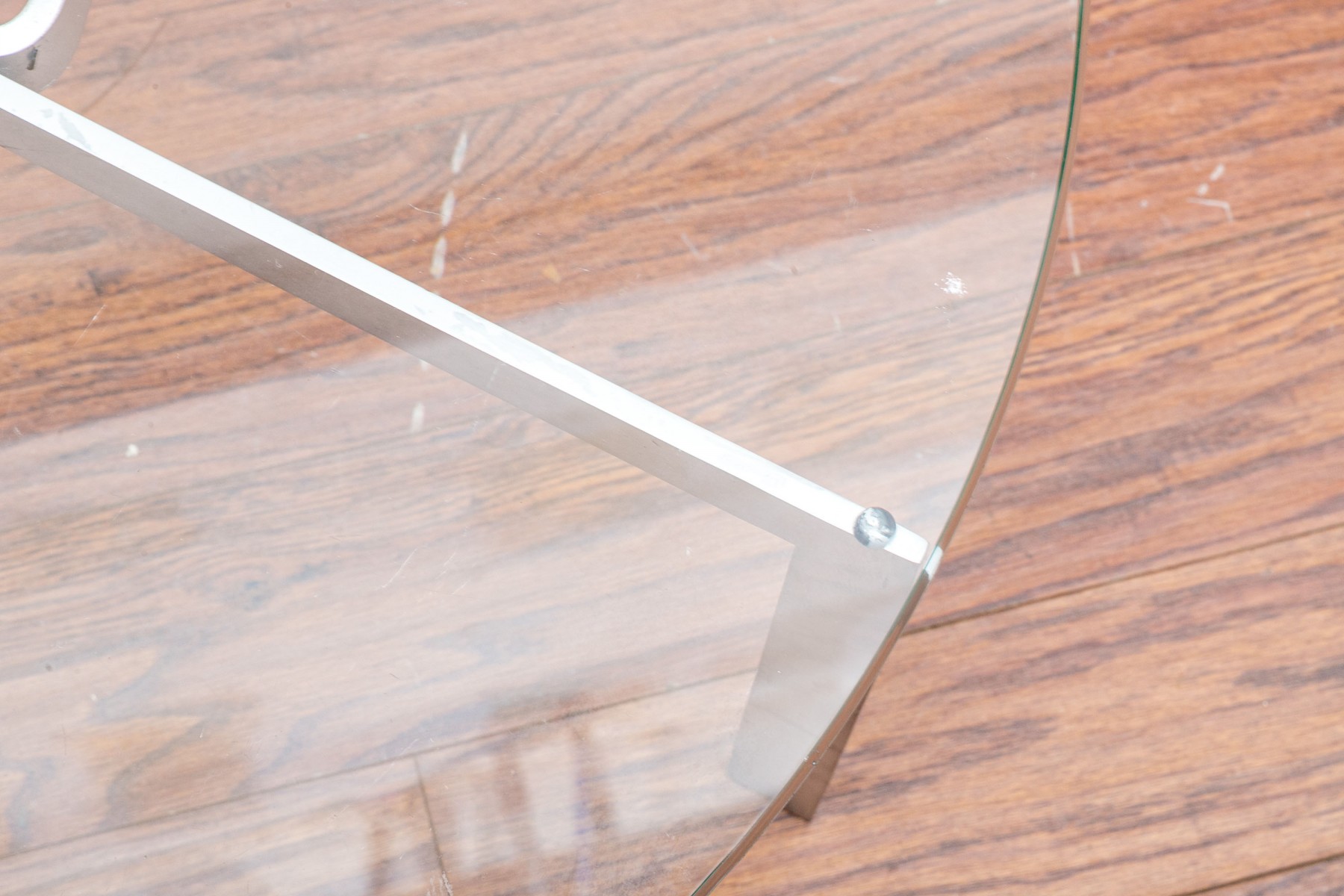 A wonderful mid century coffee table displaying a circular glass top over an angular branching gray metal bracket base.