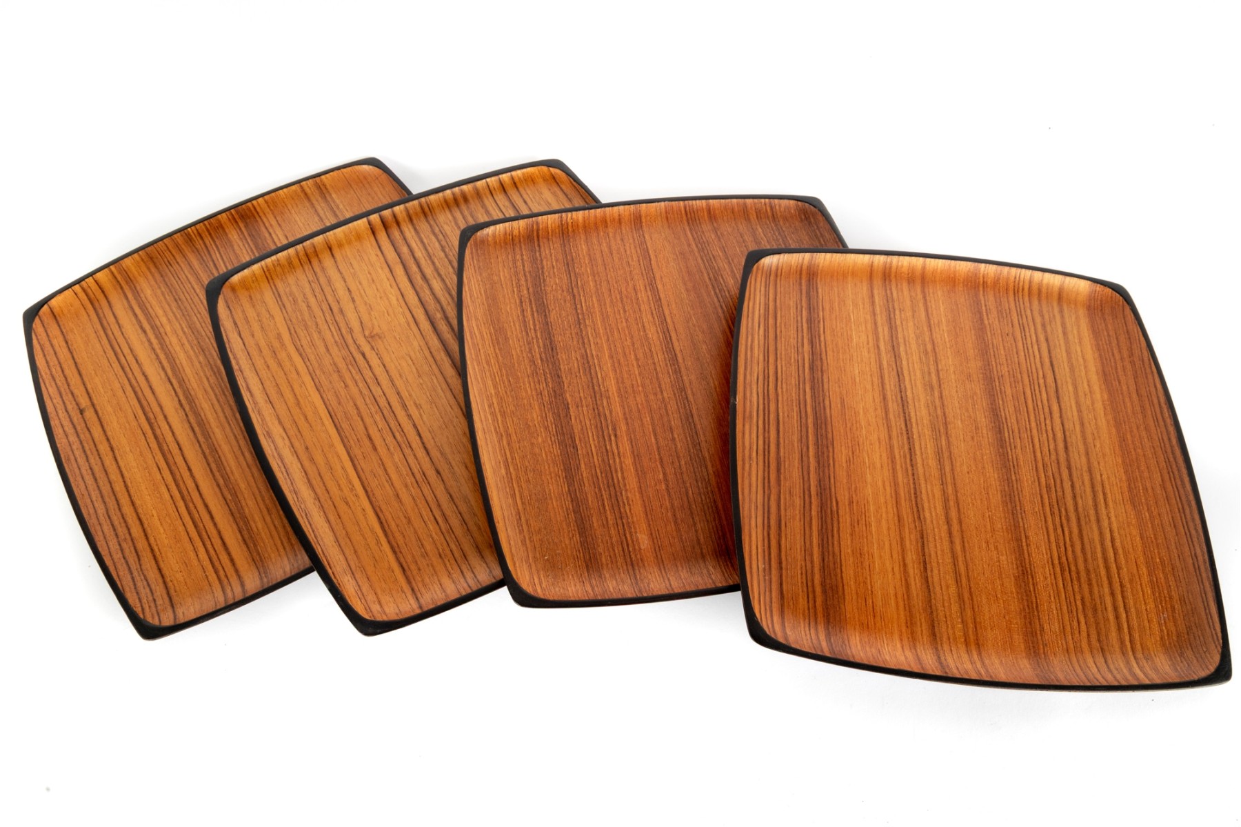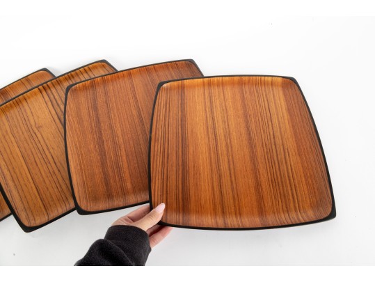 A set of four mid-century Japanese teak trays with black lacquered trim, measuring 12.5" x 12.5".
