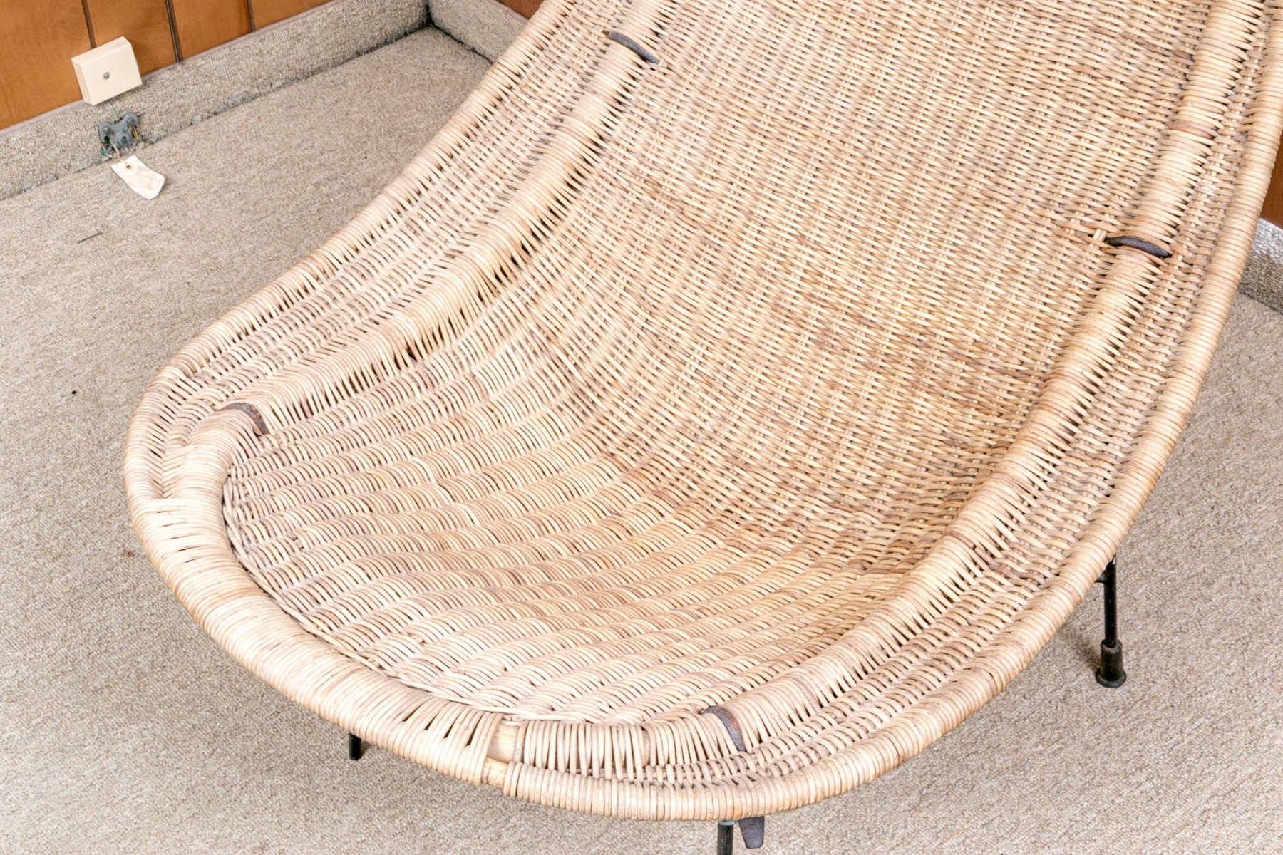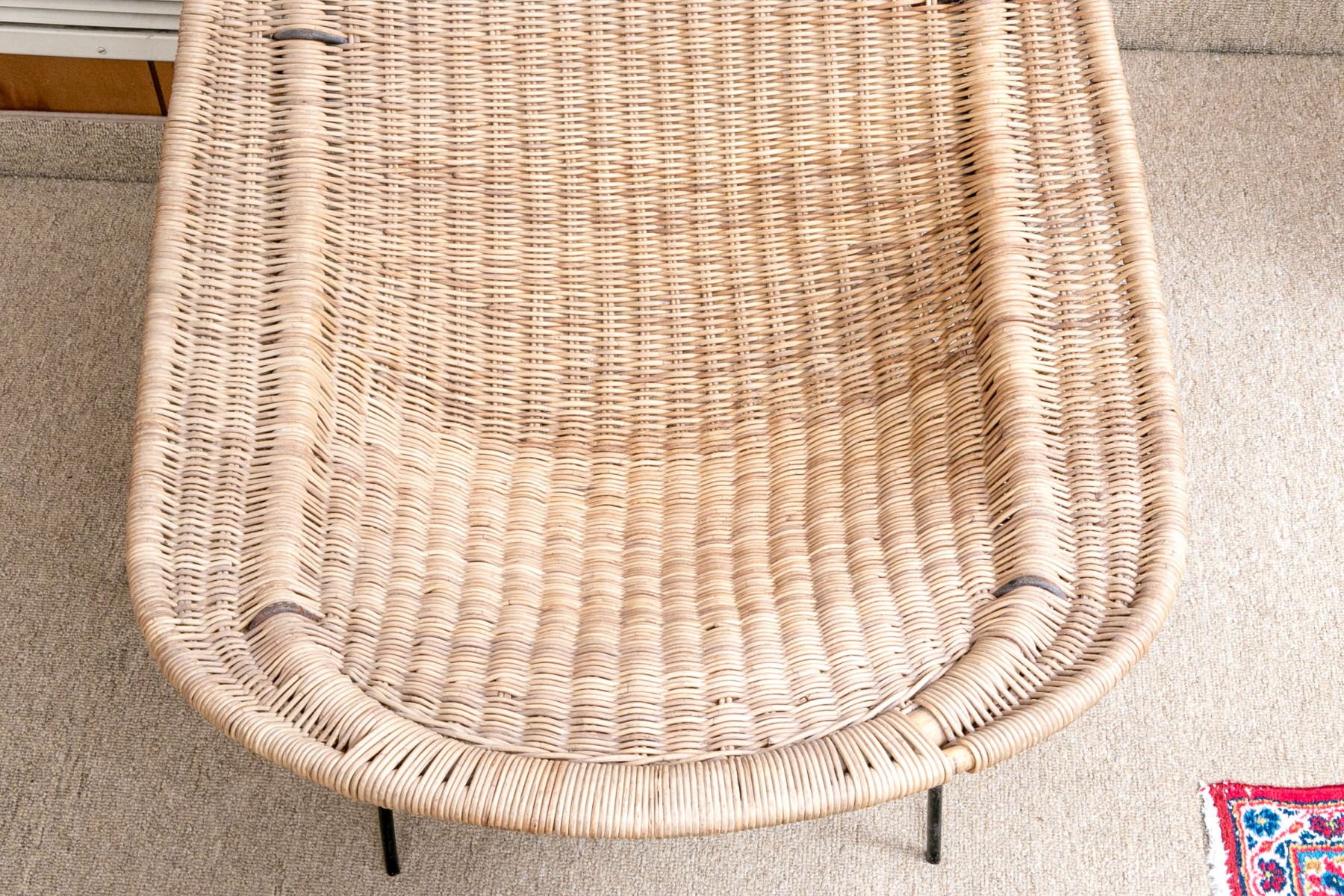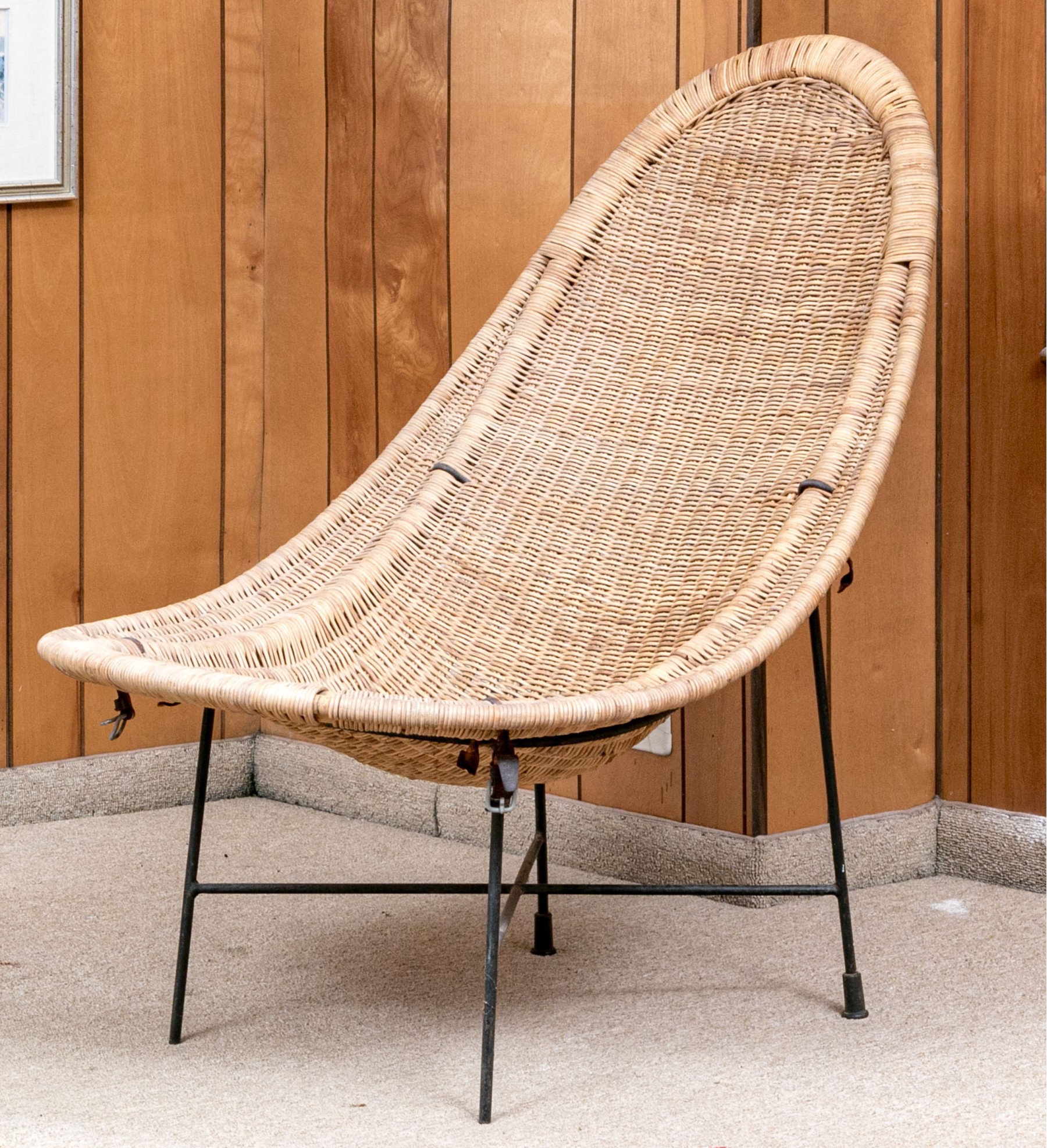 A fabulous mid-century modern Kerstin Hörlin-Holmquist "Stora Kraal" easy chair featuring an eye-catching curved ovoid rattan seat raised on an airy iron frame with gently angled legs around its X-stretcher.