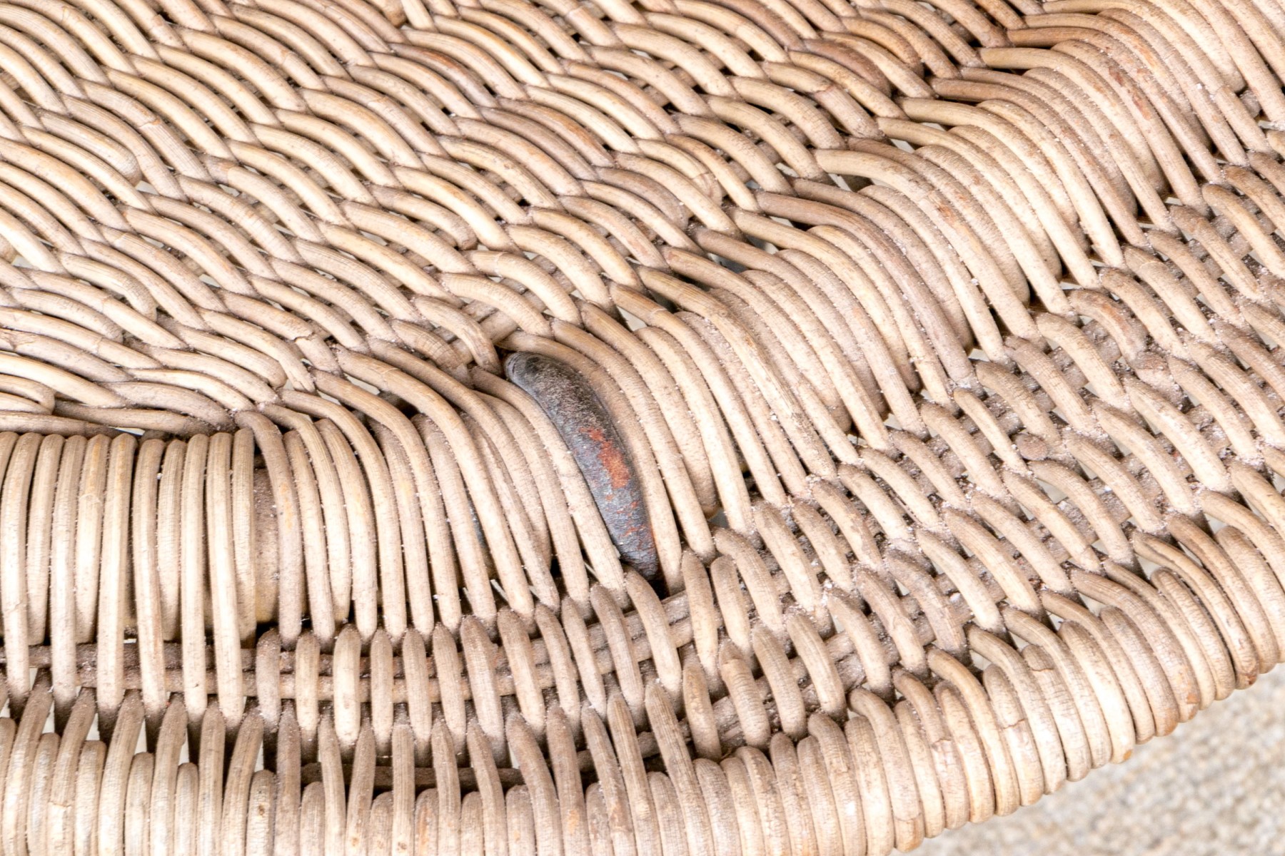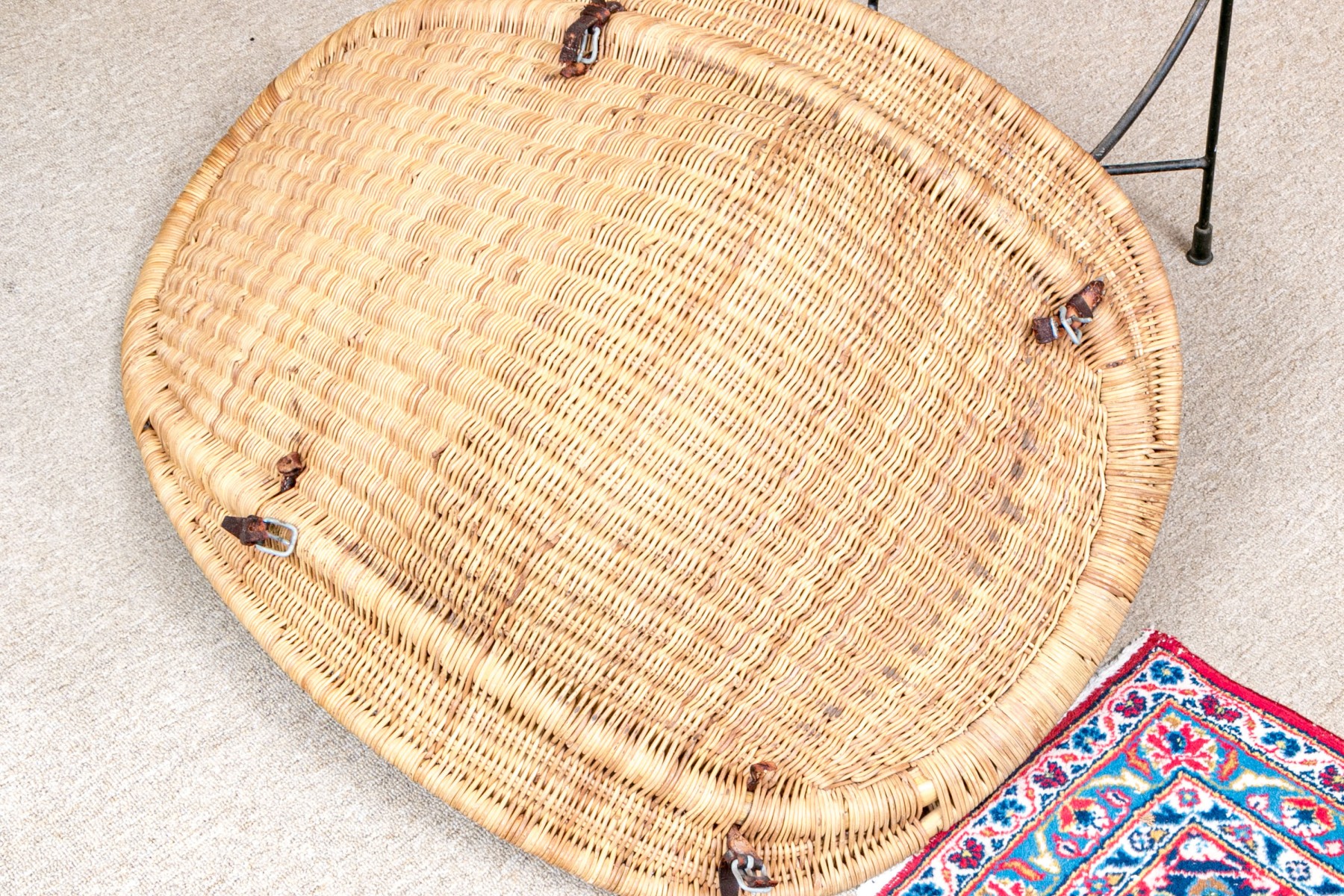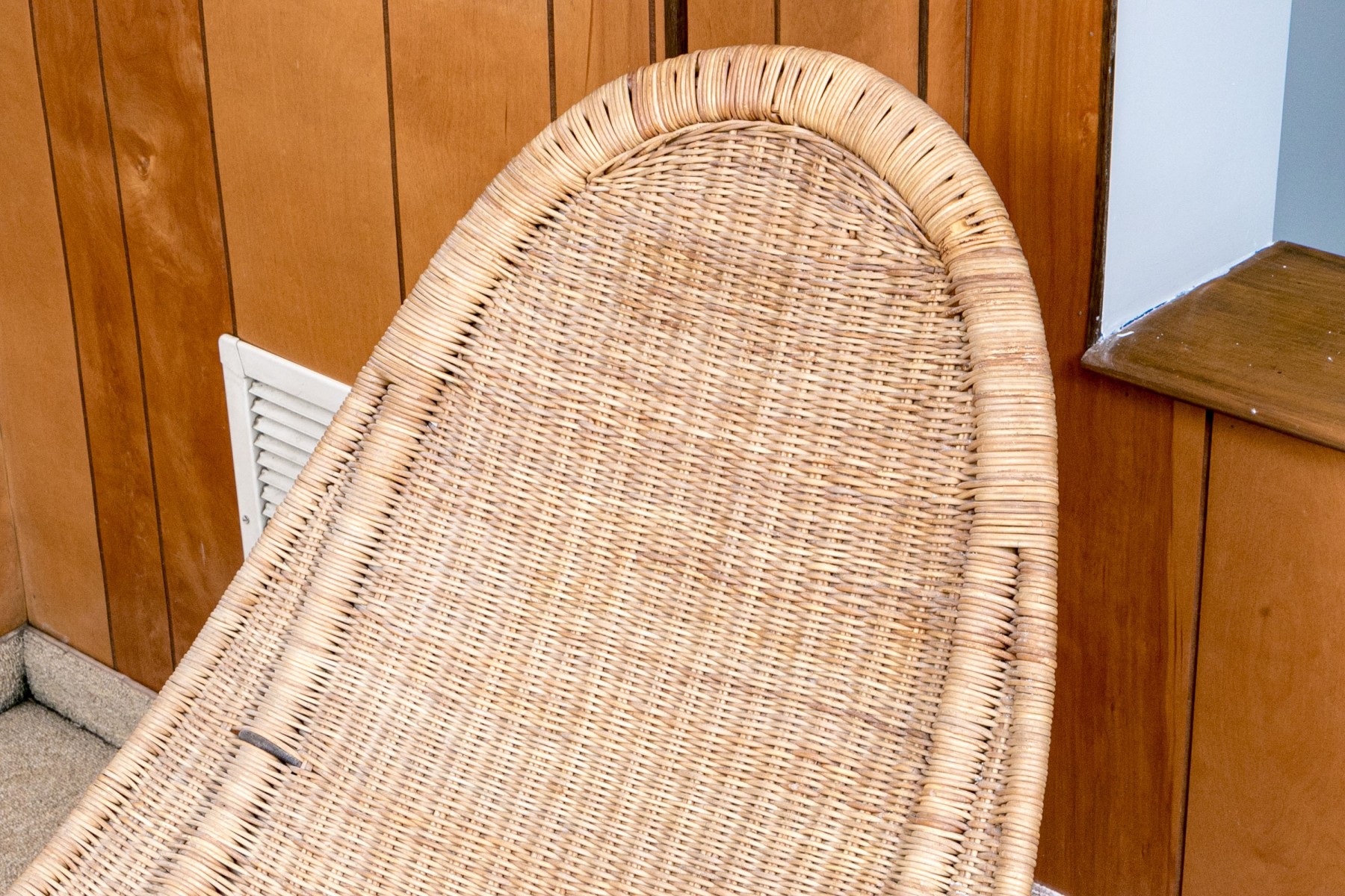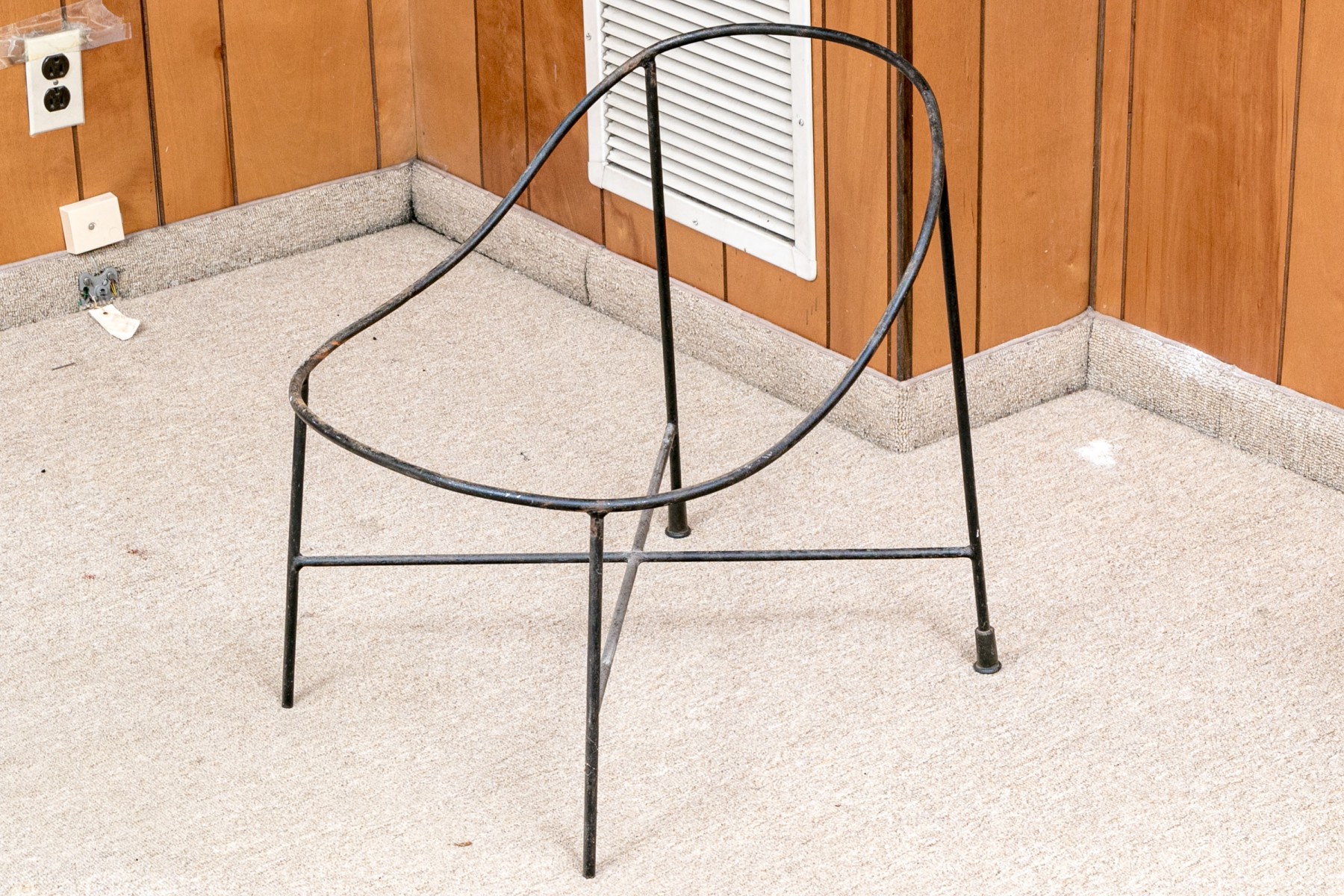 A fabulous mid-century modern Kerstin Hörlin-Holmquist "Stora Kraal" easy chair featuring an eye-catching curved ovoid rattan seat raised on an airy iron frame with gently angled legs around its X-stretcher.