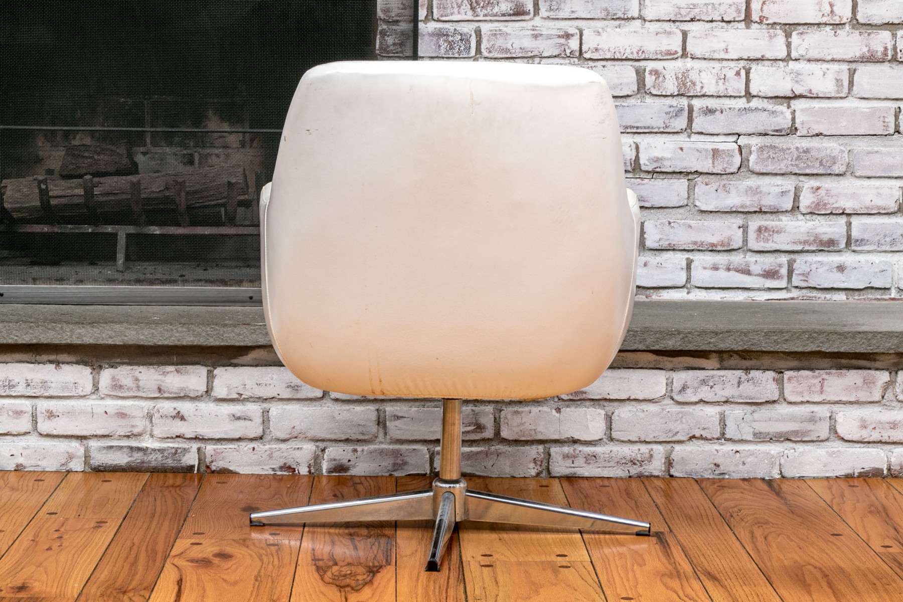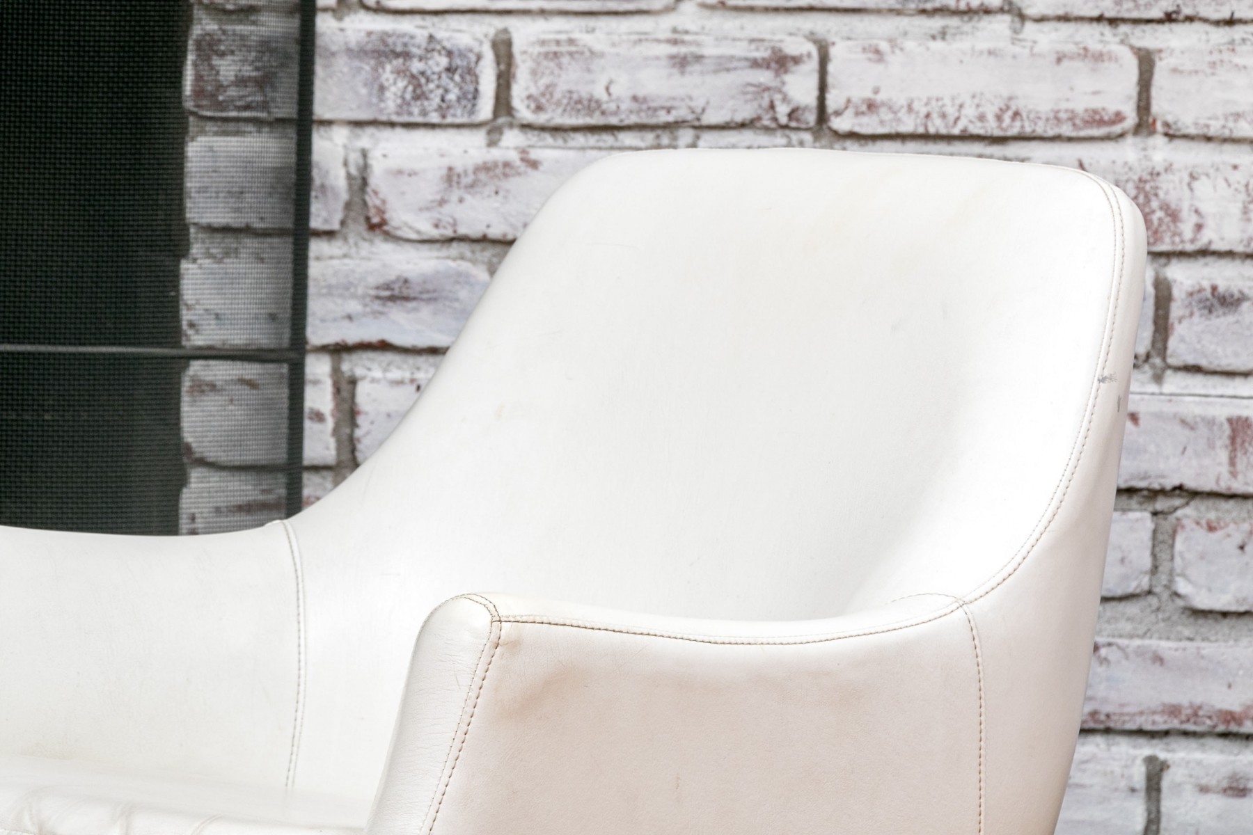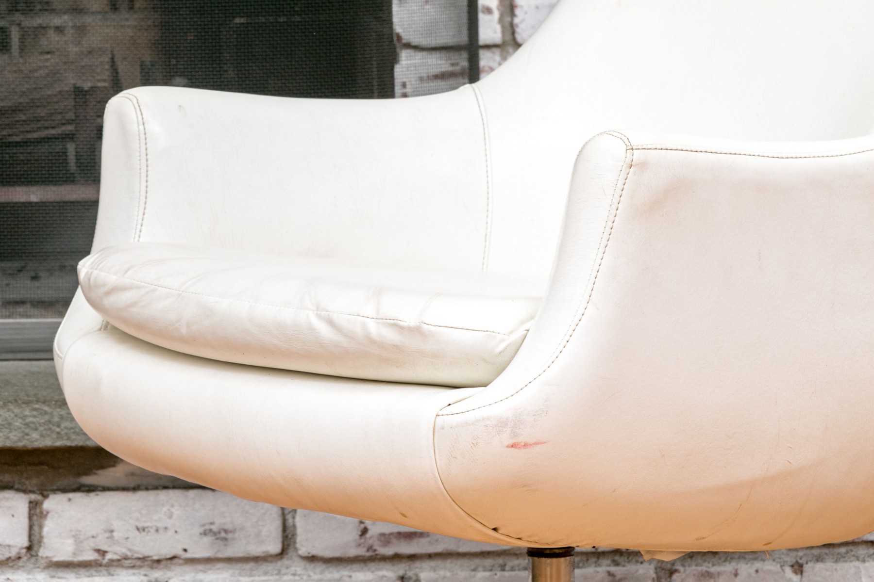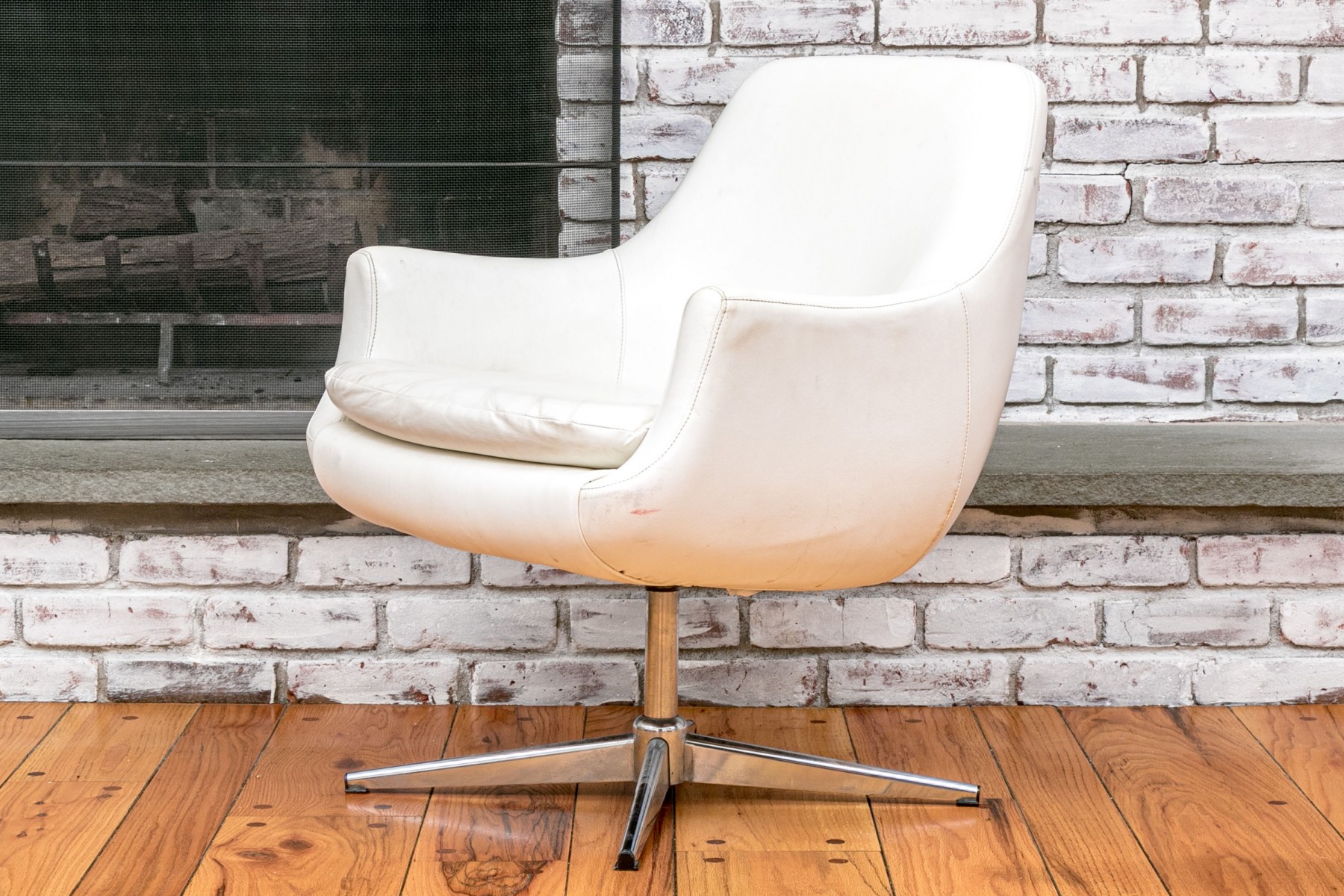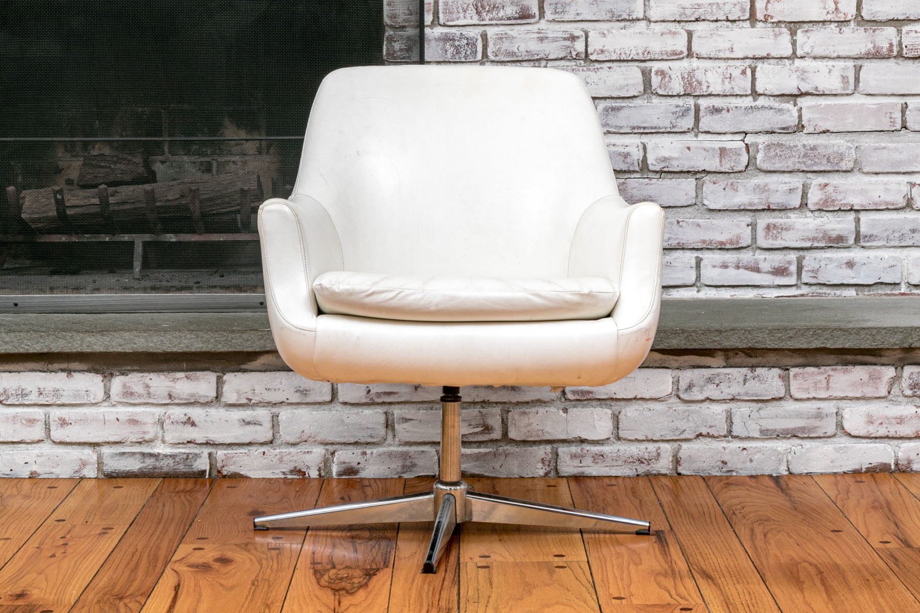 Mid Century Modern rolling tub chair by Burris Industries. Upholstered in a textured white leather, it boasts a deep, curved back and down-swept arms for a cozy feel. The cushioned seat ensures you'll be lounging in style, and the metal base with ball casters allows for easy mobility. This chair still retains its manufacturer's tag, adding to its charm and authenticity.
