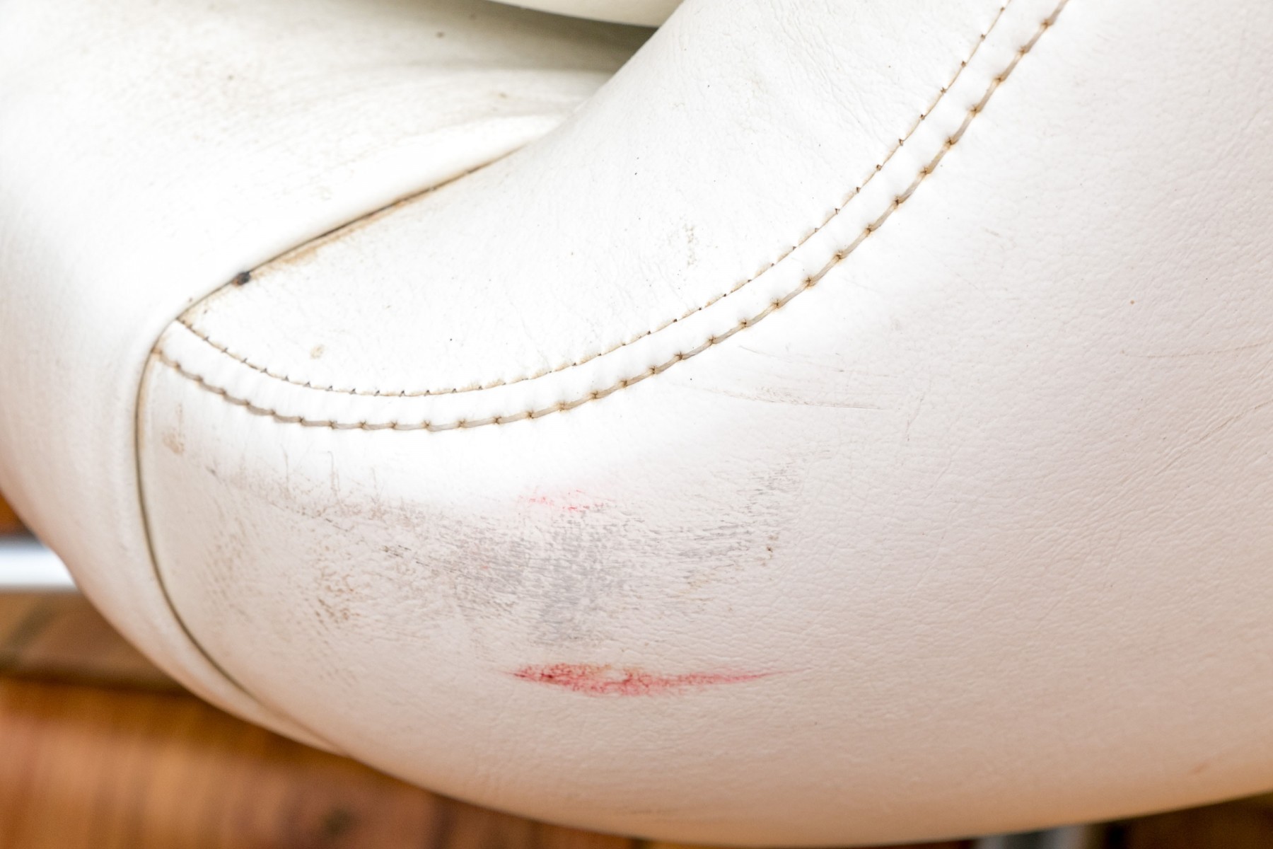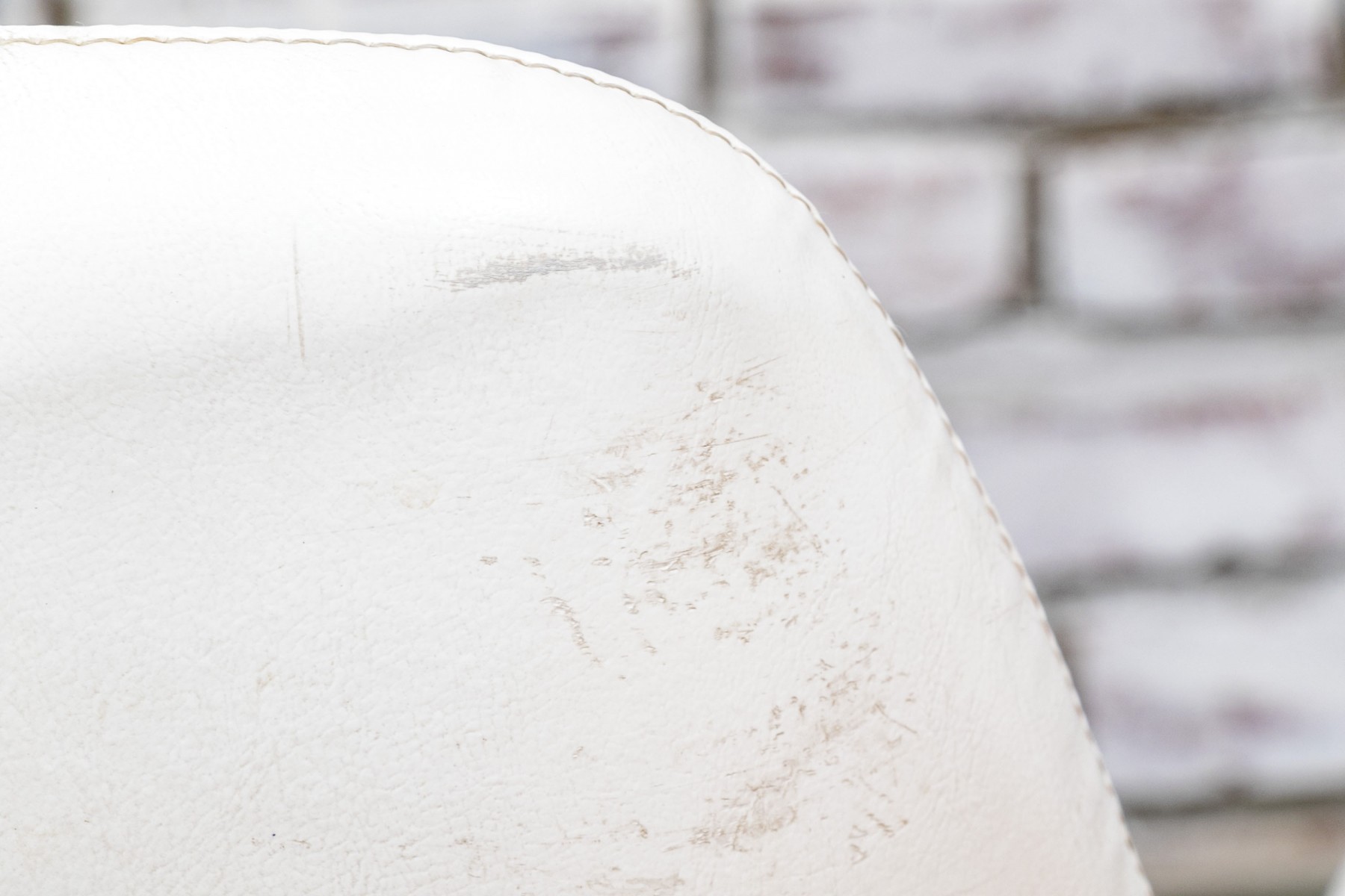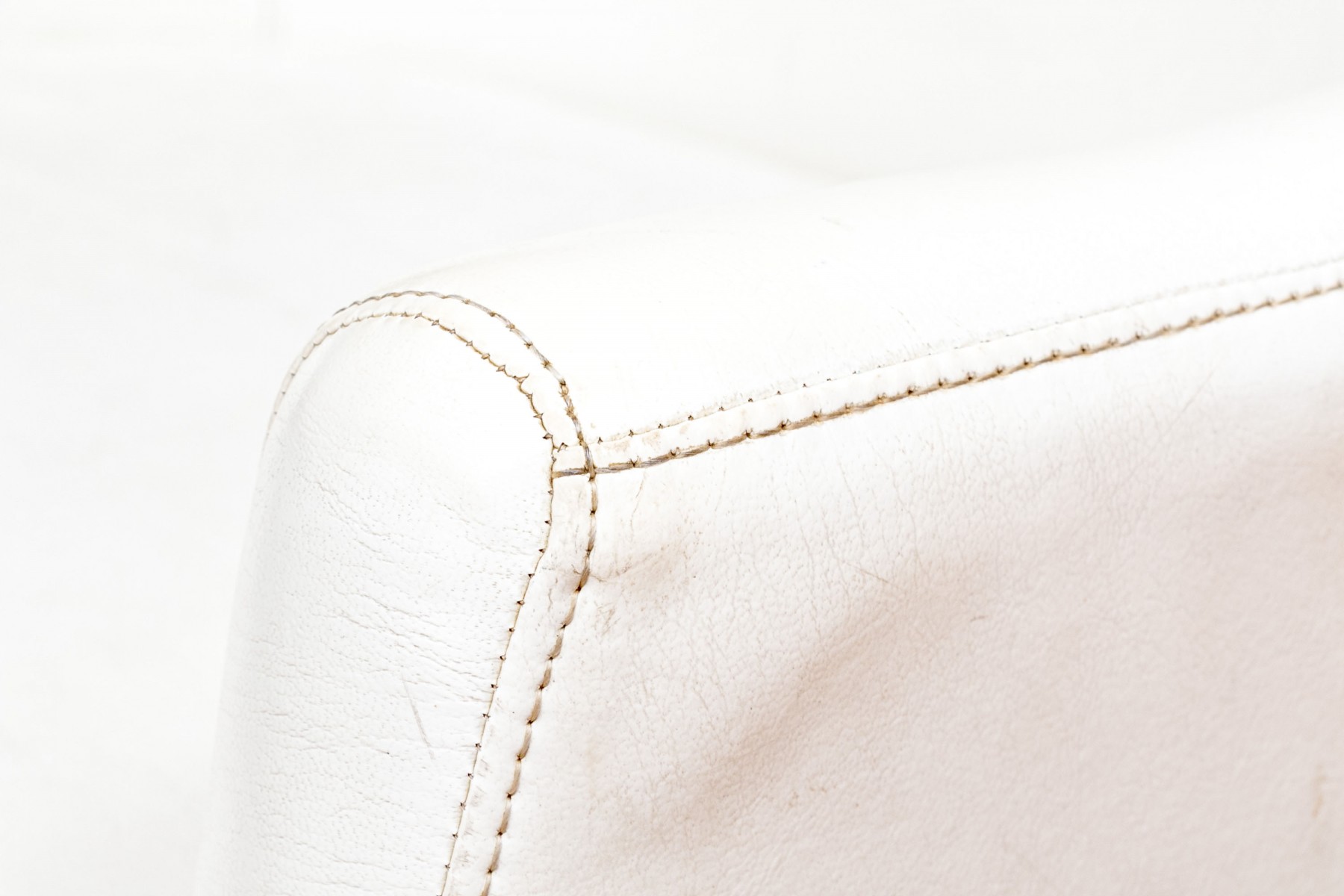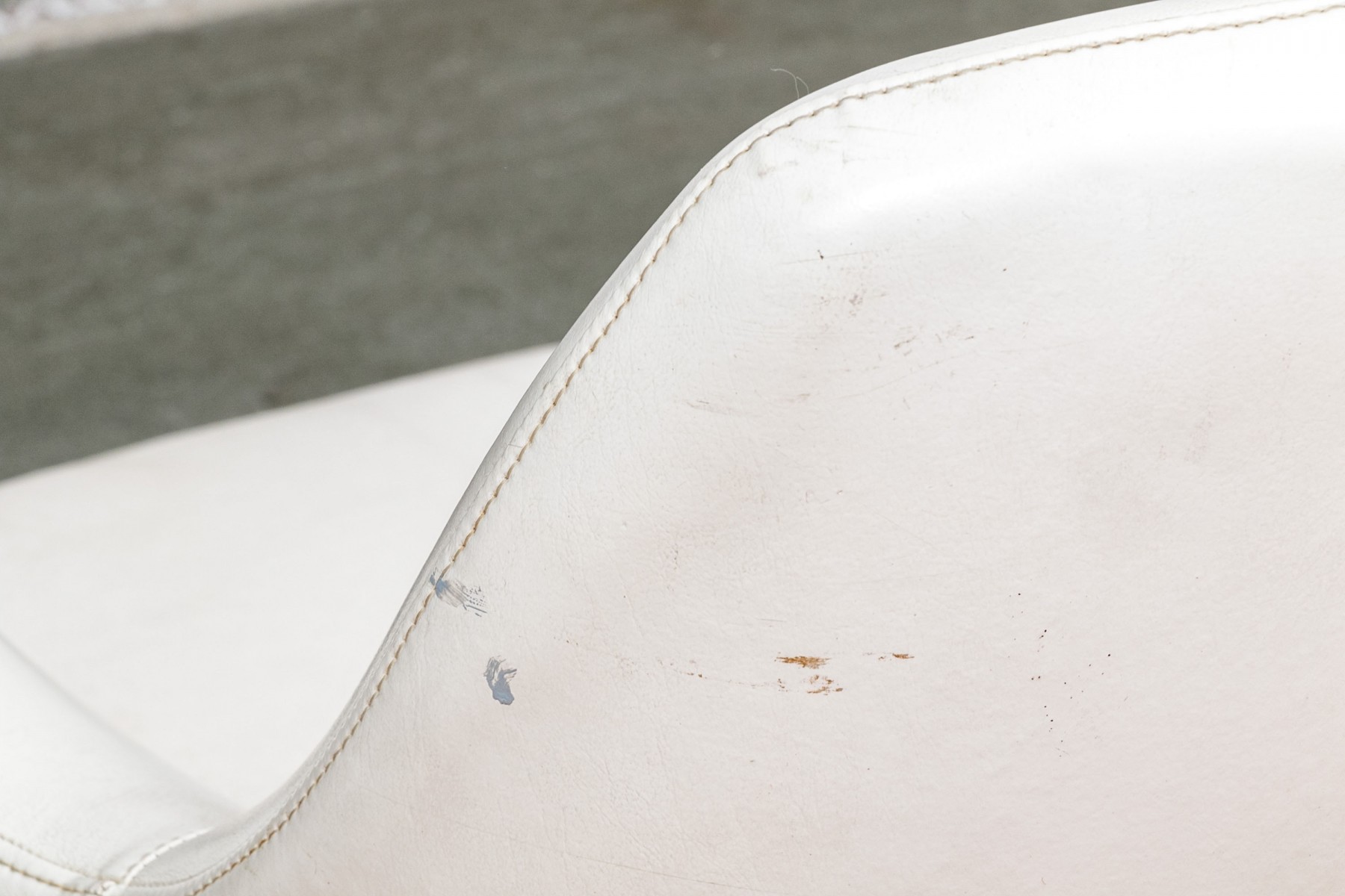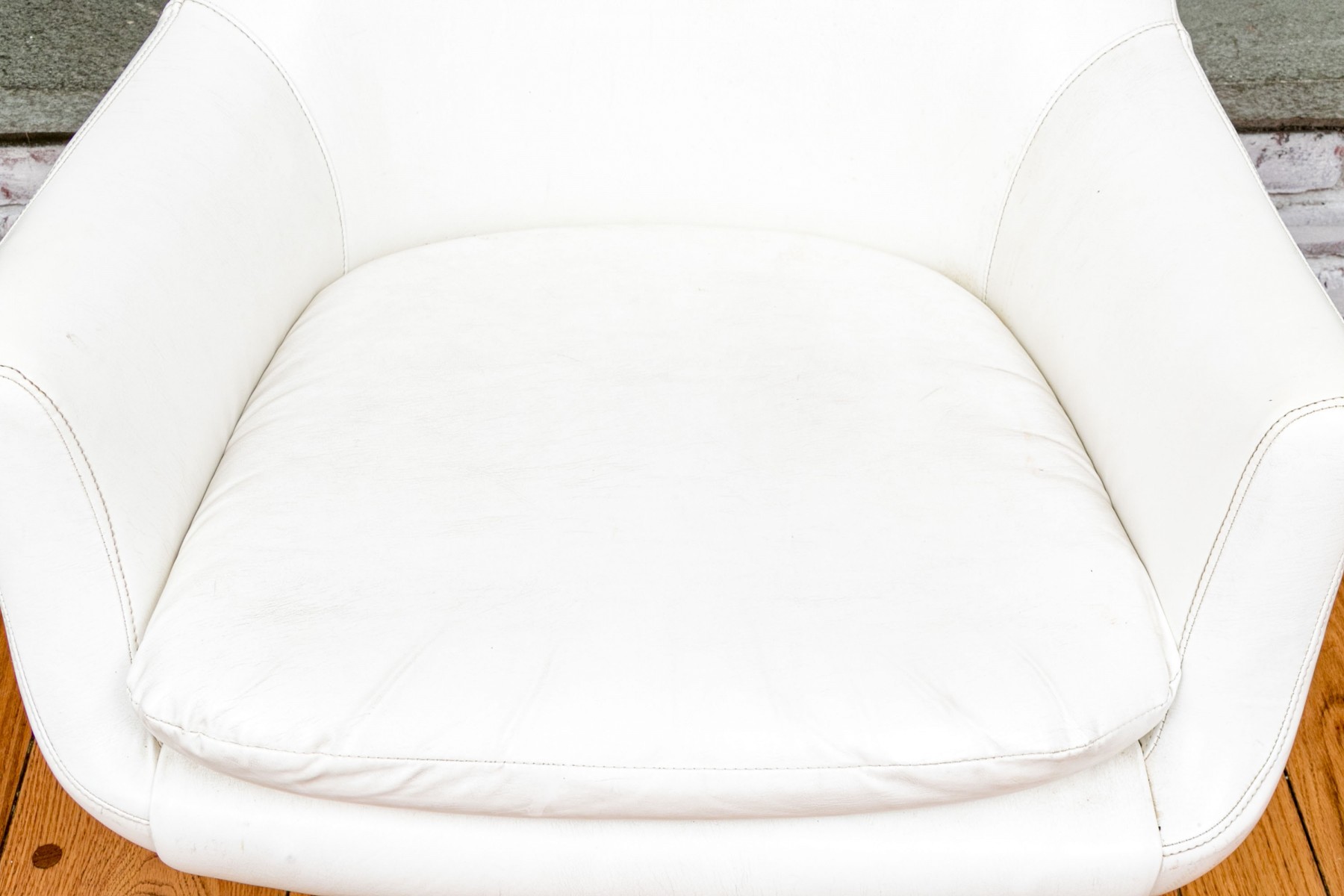 Mid Century Modern rolling tub chair by Burris Industries. Upholstered in a textured white leather, it boasts a deep, curved back and down-swept arms for a cozy feel. The cushioned seat ensures you'll be lounging in style, and the metal base with ball casters allows for easy mobility. This chair still retains its manufacturer's tag, adding to its charm and authenticity.